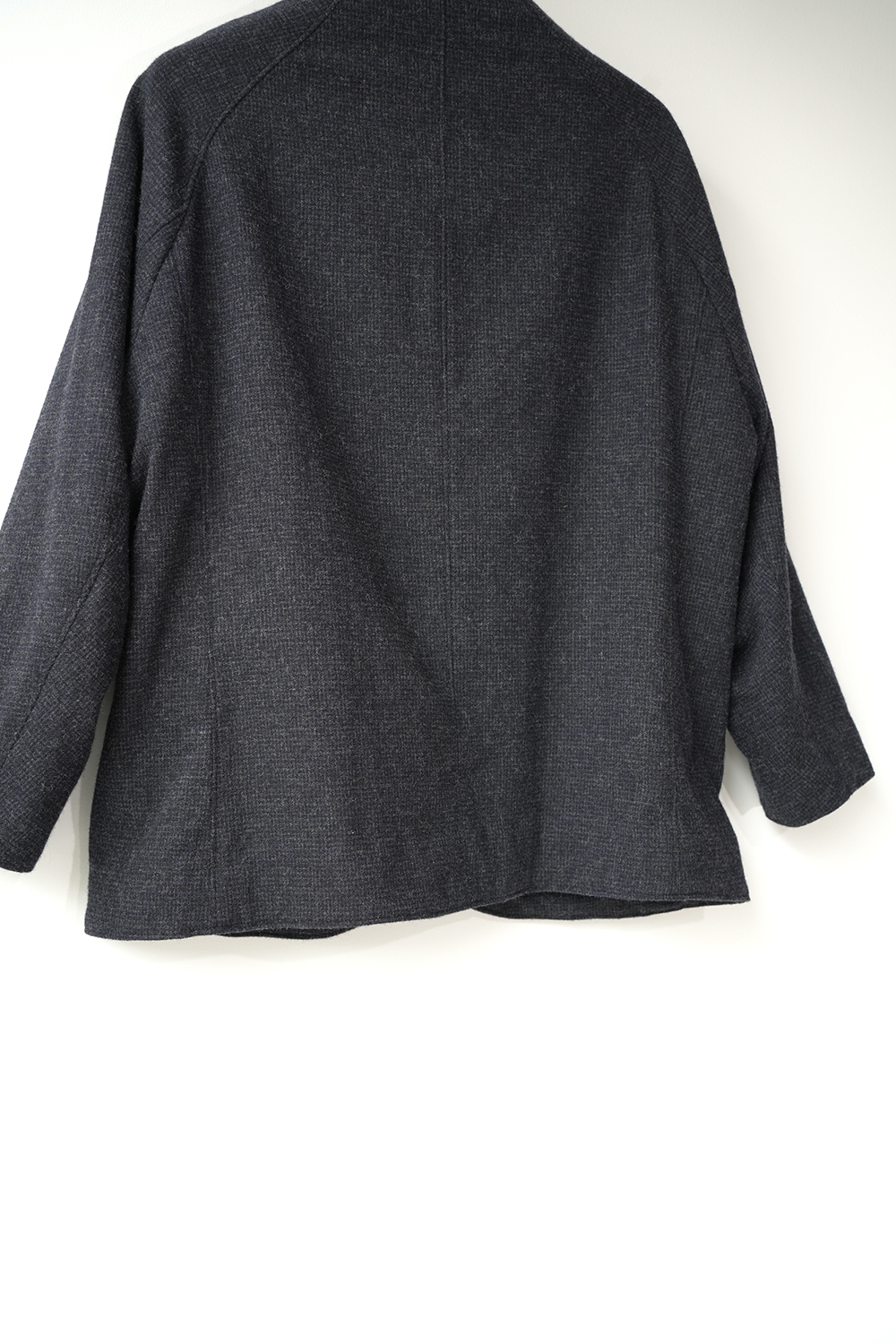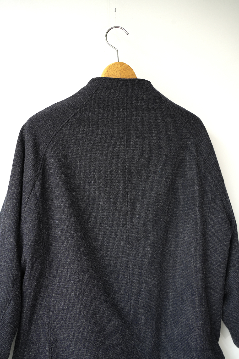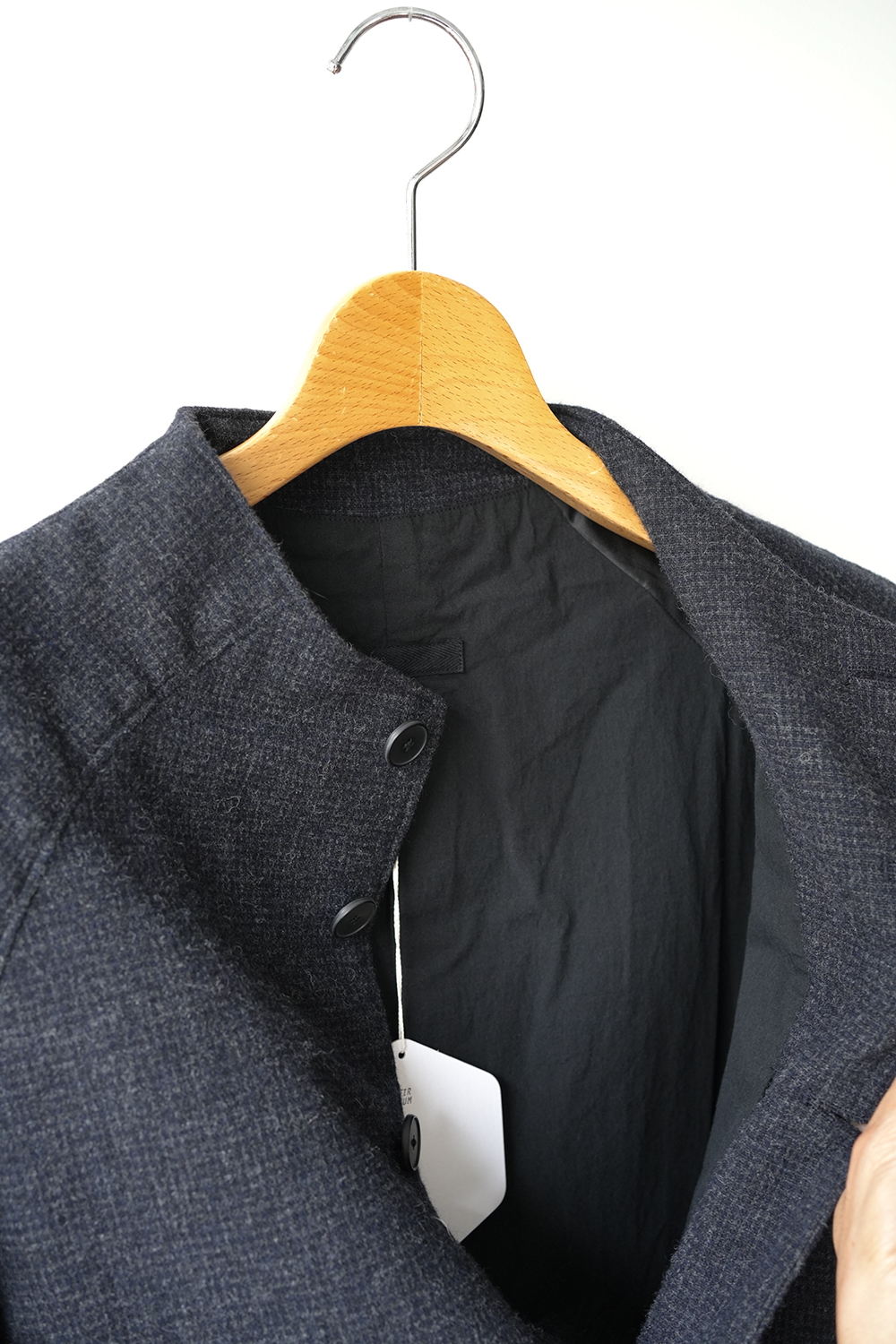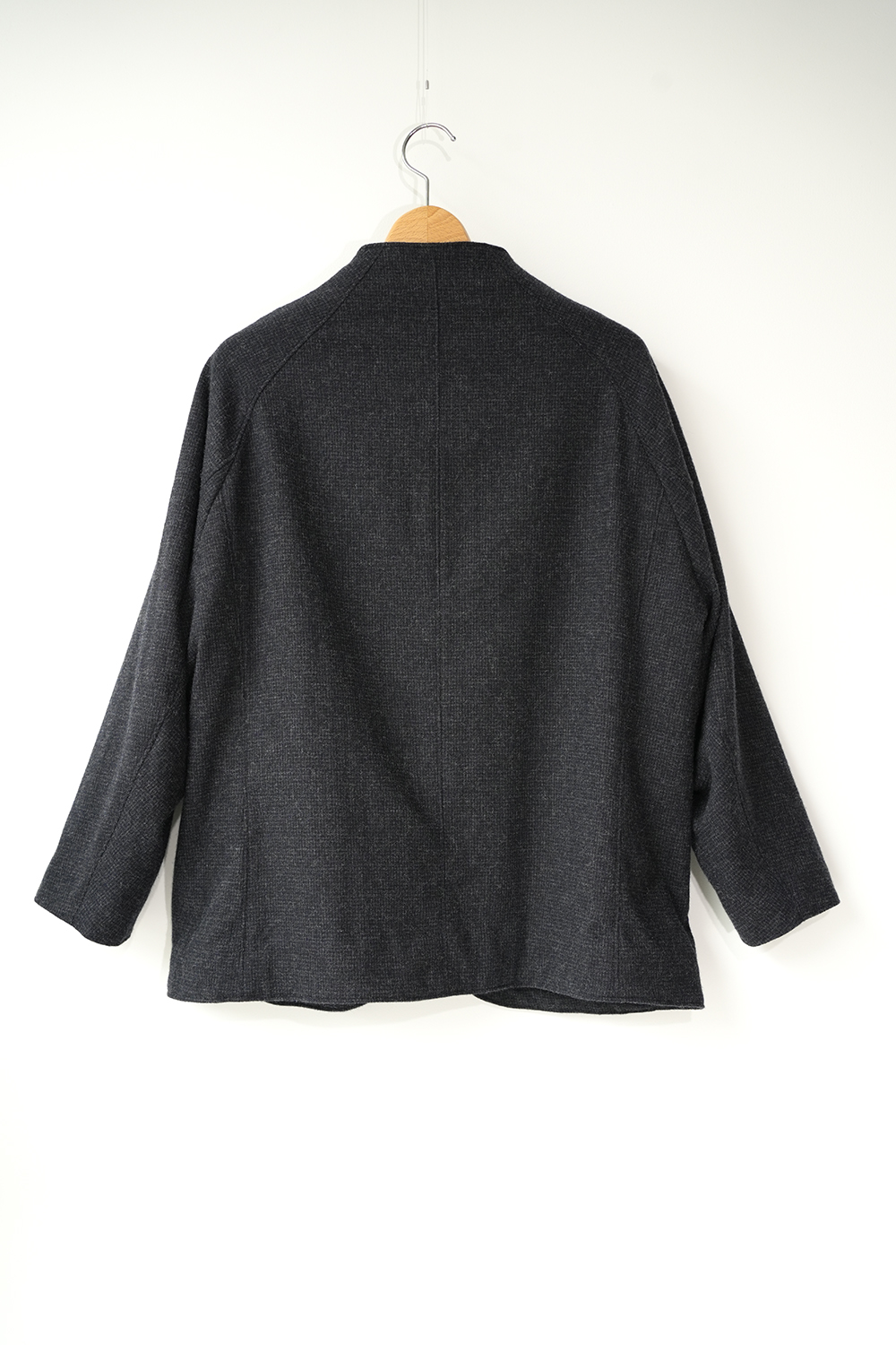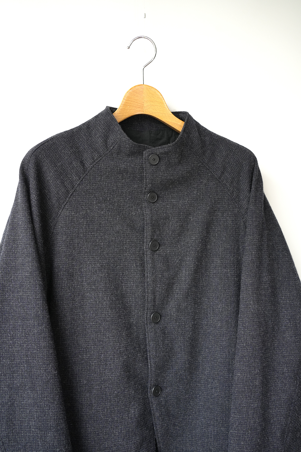 粗くざっくりとした古いウール生地の雰囲気を目指したウール平織千鳥格子平織生地。製品洗いとタンブラー乾燥をし揉み込むことで風合いとストレッチ性が生まれました。ボトルネックジャケット、ラグランスリーブ、脇にシームポケット、総裏仕立て。