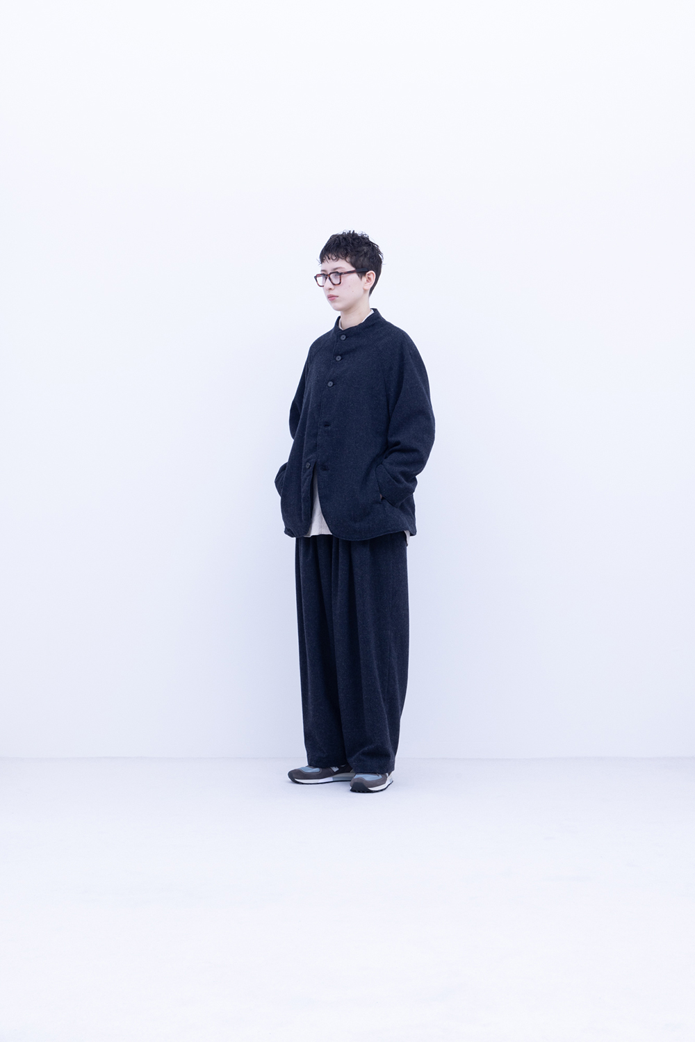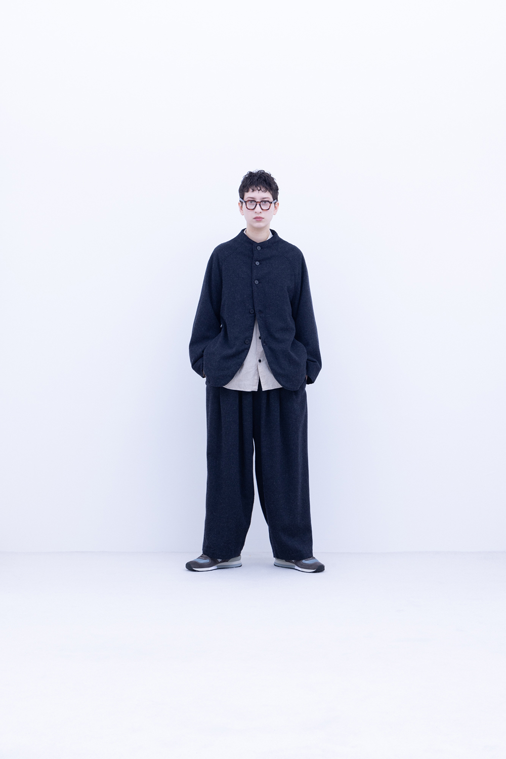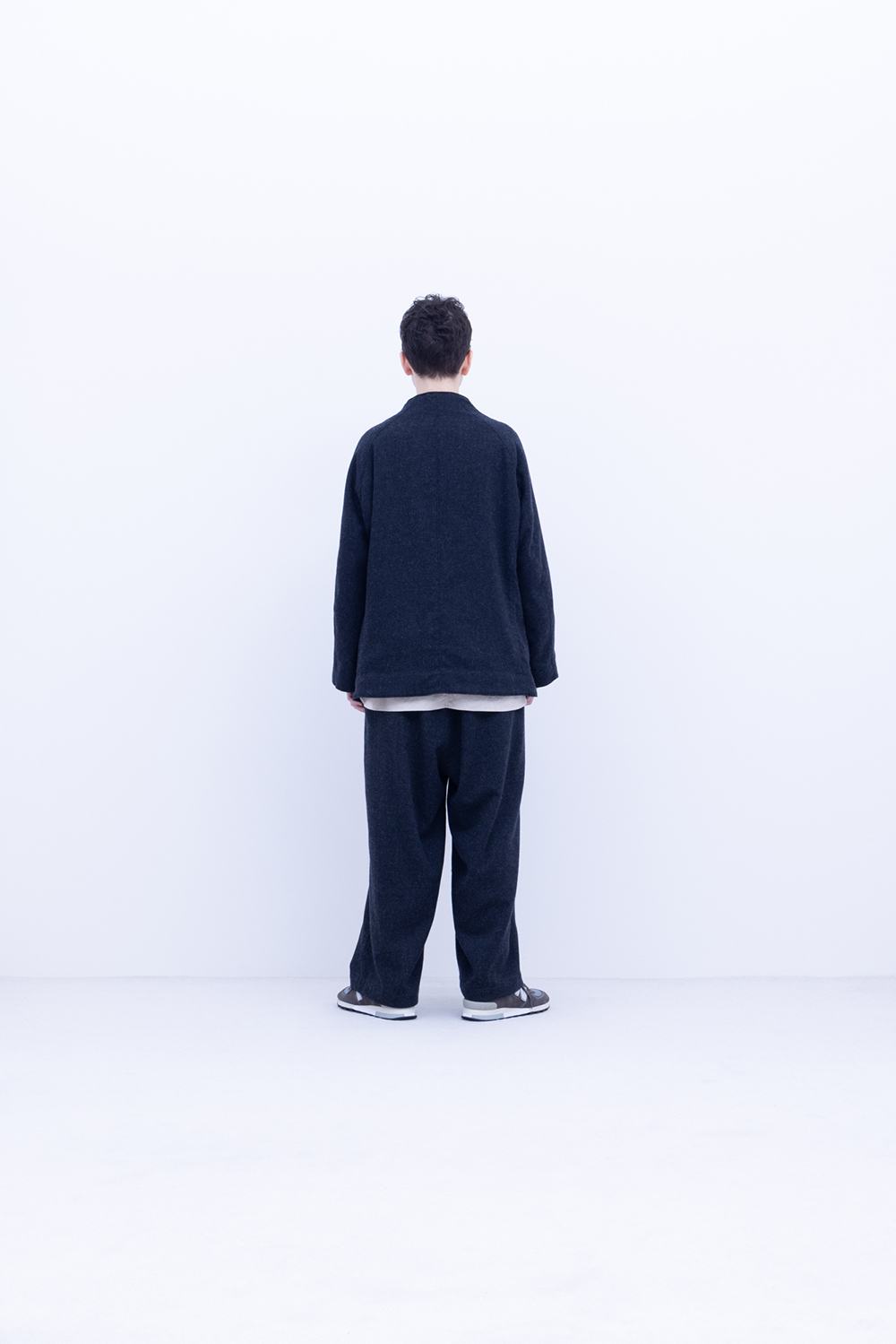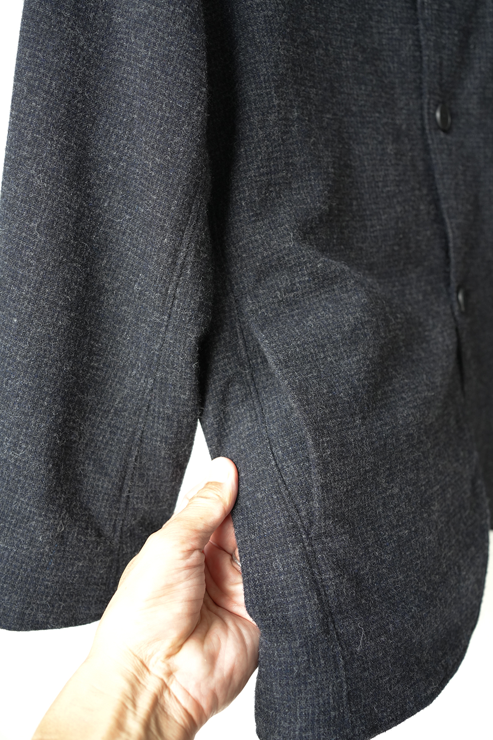 粗くざっくりとした古いウール生地の雰囲気を目指したウール平織千鳥格子平織生地。製品洗いとタンブラー乾燥をし揉み込むことで風合いとストレッチ性が生まれました。ボトルネックジャケット、ラグランスリーブ、脇にシームポケット、総裏仕立て。