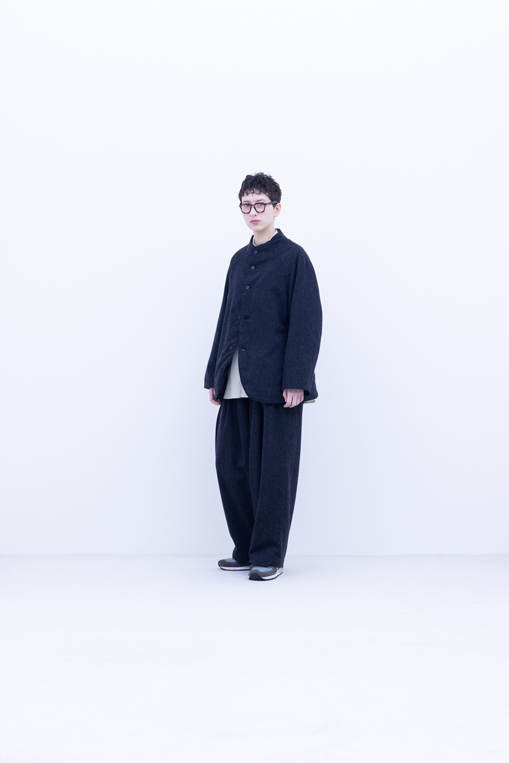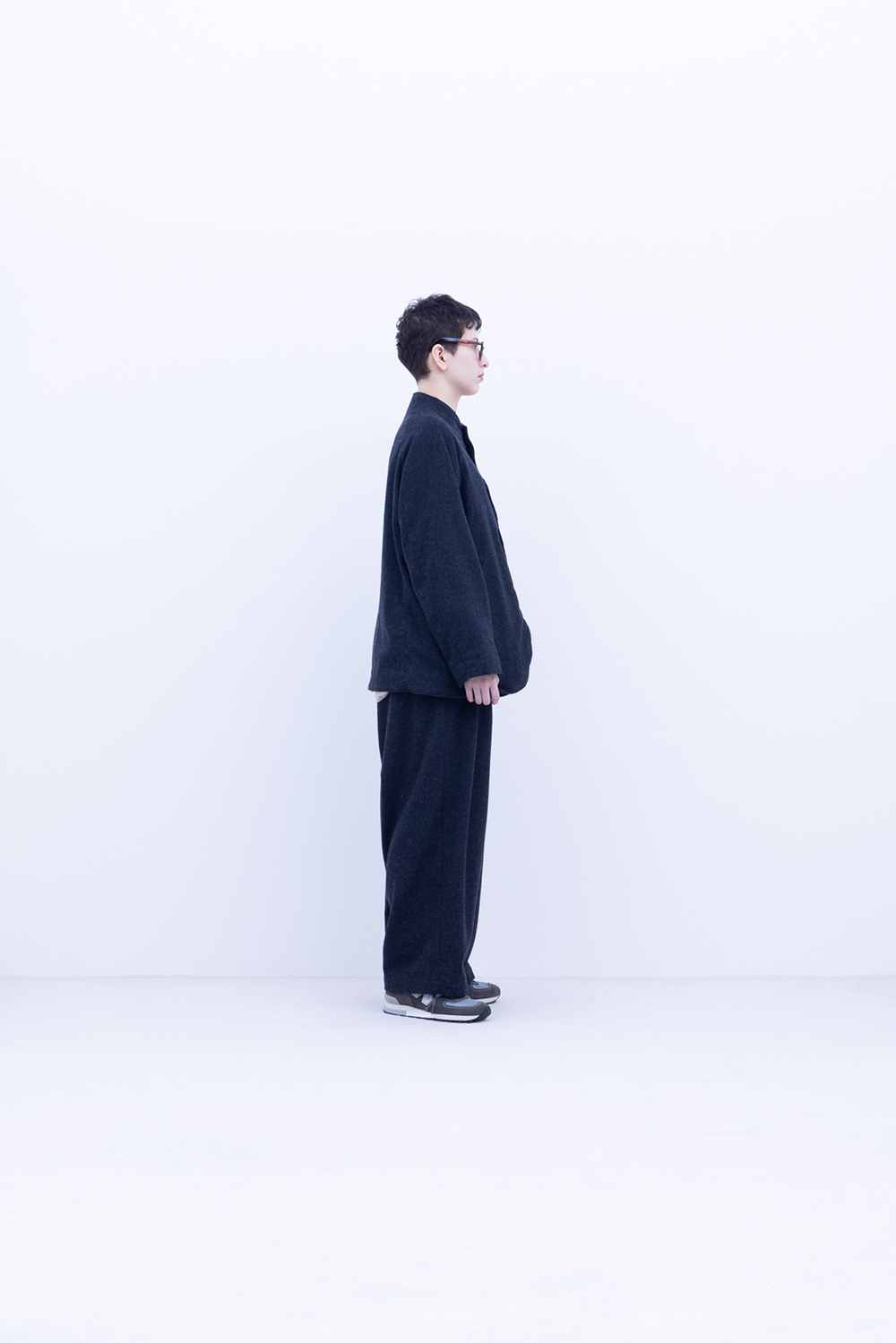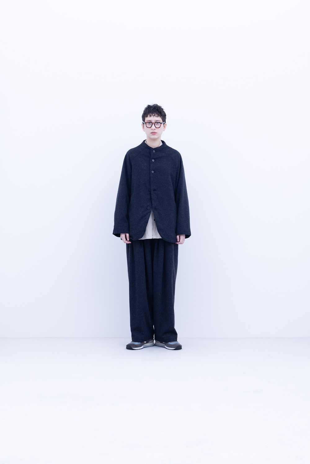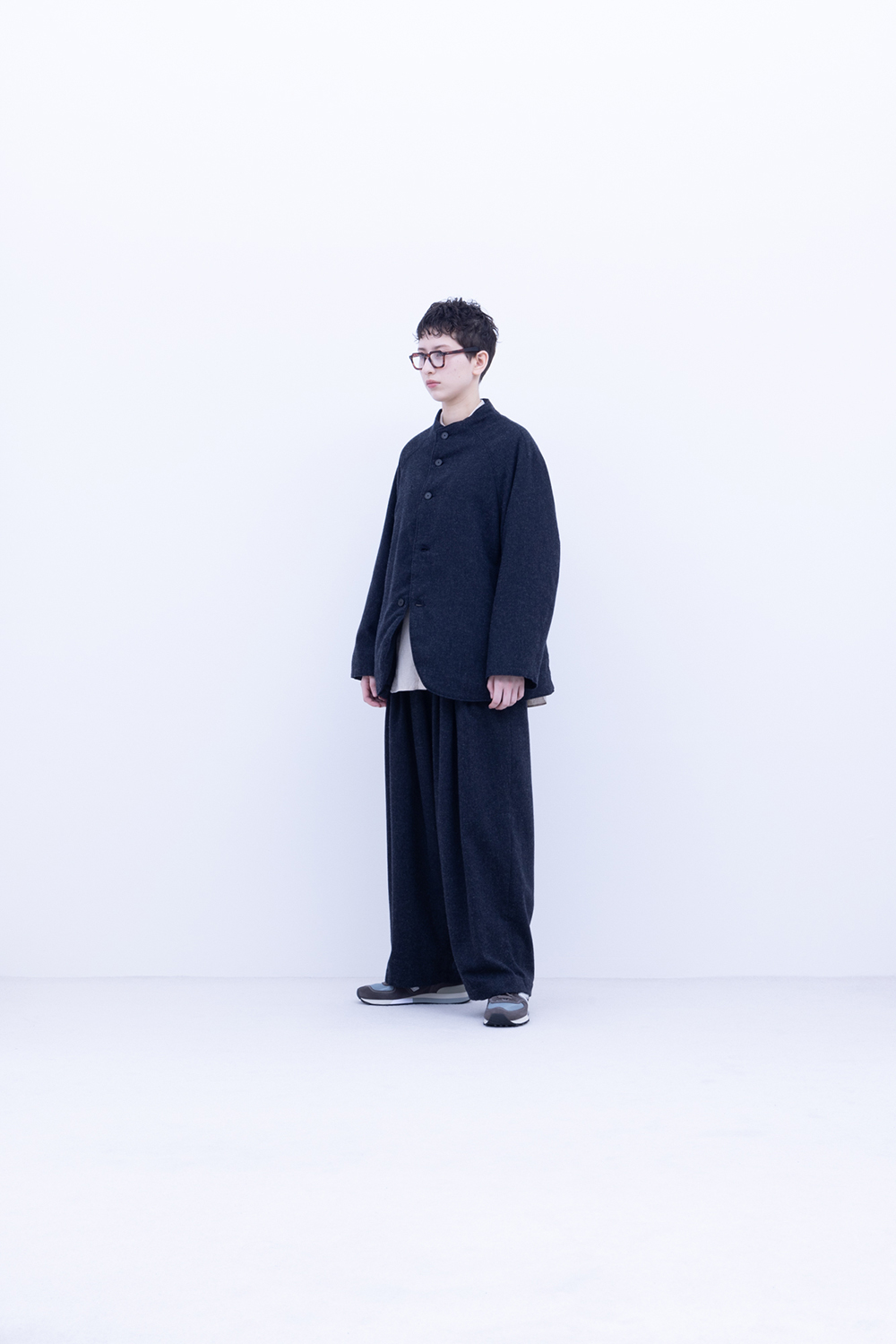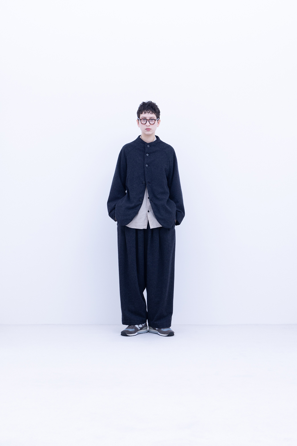 粗くざっくりとした古いウール生地の雰囲気を目指したウール平織千鳥格子平織生地。製品洗いとタンブラー乾燥をし揉み込むことで風合いとストレッチ性が生まれました。ボトルネックジャケット、ラグランスリーブ、脇にシームポケット、総裏仕立て。