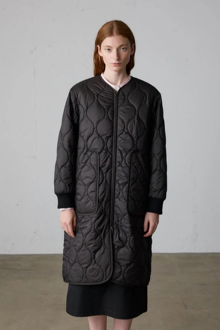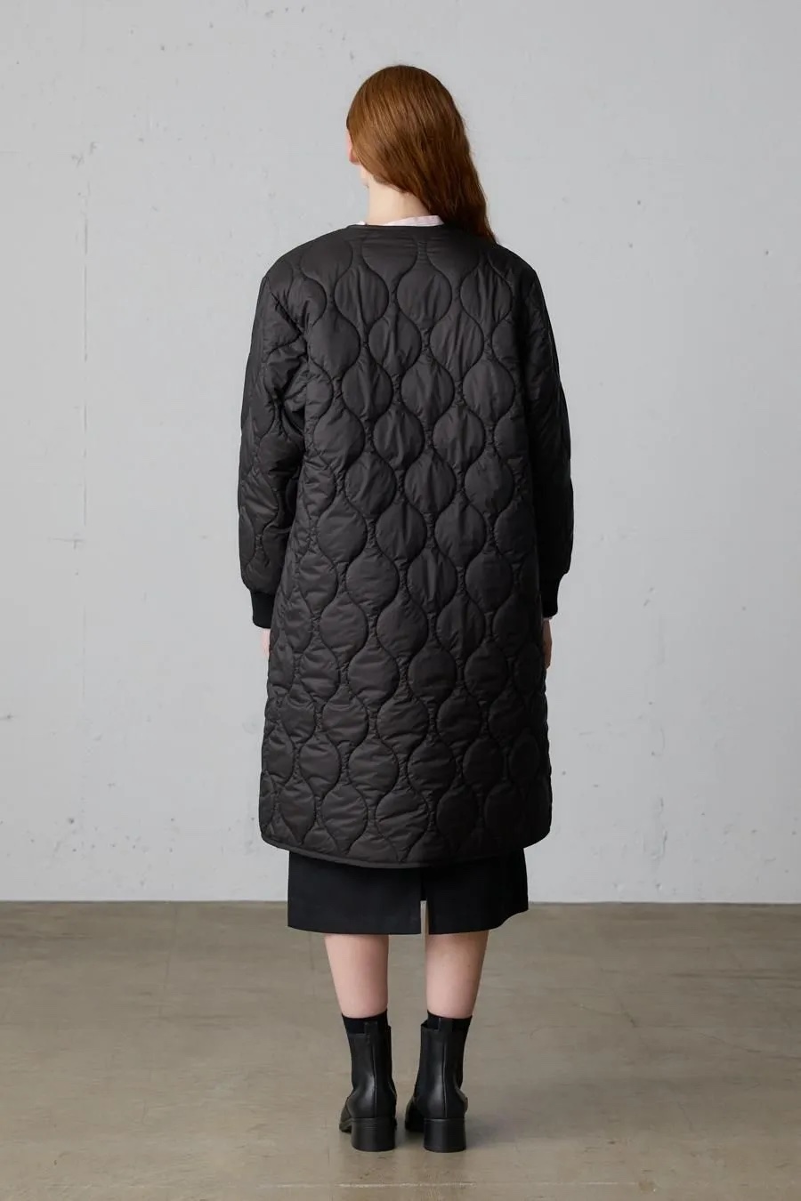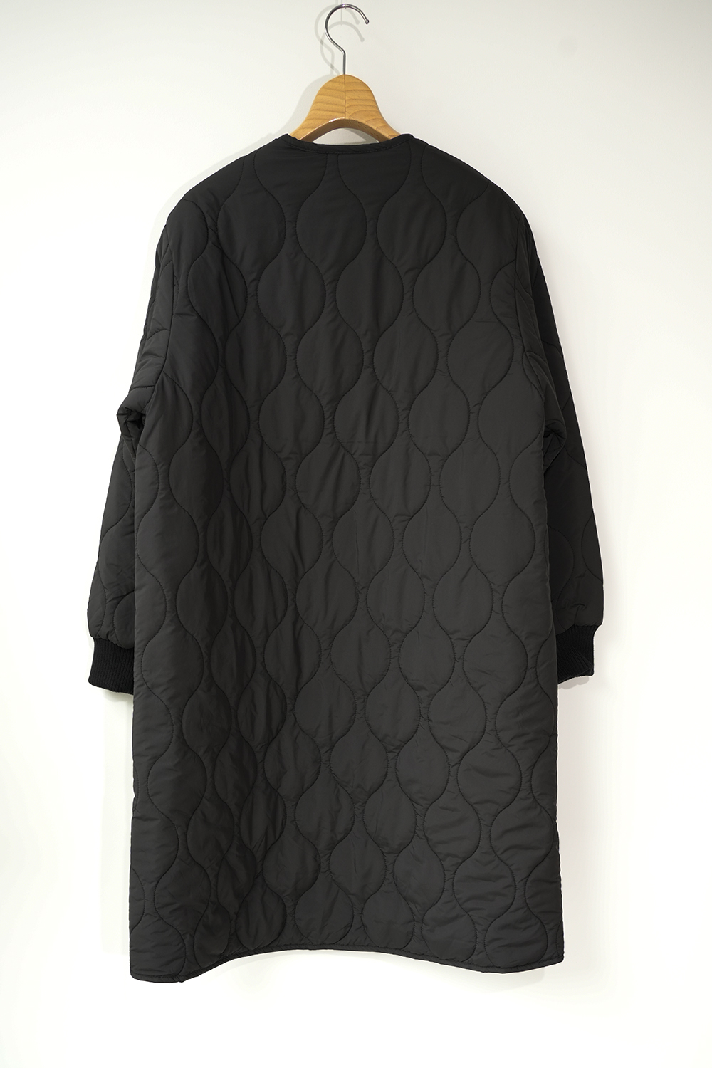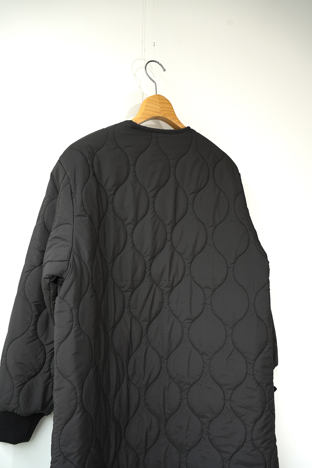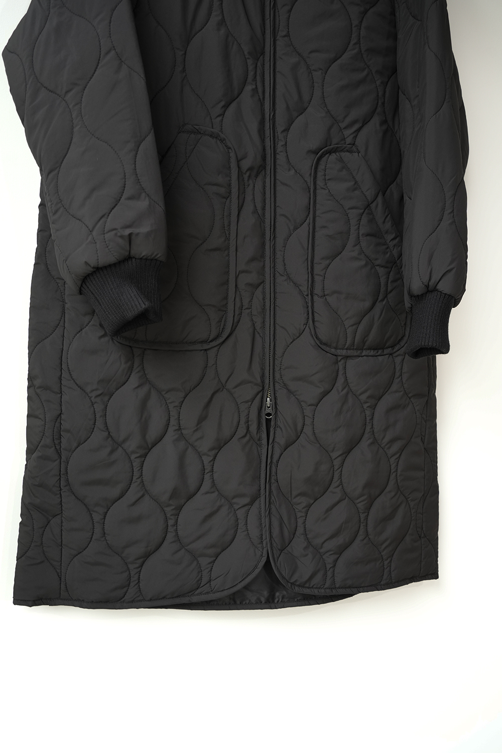 ポリエステルのキルティングコートシリーズ、キルティングロングコートです。MidiUmiの定番アイテムになりつつある、冬のオシャレを楽しんでいただける1枚。昨年人気だった、4-779712/キルティングロングコートをアレンジしました。大きなフロントポケットにデザインを変更しました。中綿量は80g、暖かく軽く仕上げたアウターなので気軽に着用していただけます。袖口は太リブで風通しがないのもポイント。別布パイピング仕様でメリハリのあるデザイン仕上げ。フロントジップに加えすっきり感のある首元はマフラー等の小物使いも魅力的に演出できるのもポイント。膝下のロング丈ですが軽さもあり気軽に着用していただけるアウターです。