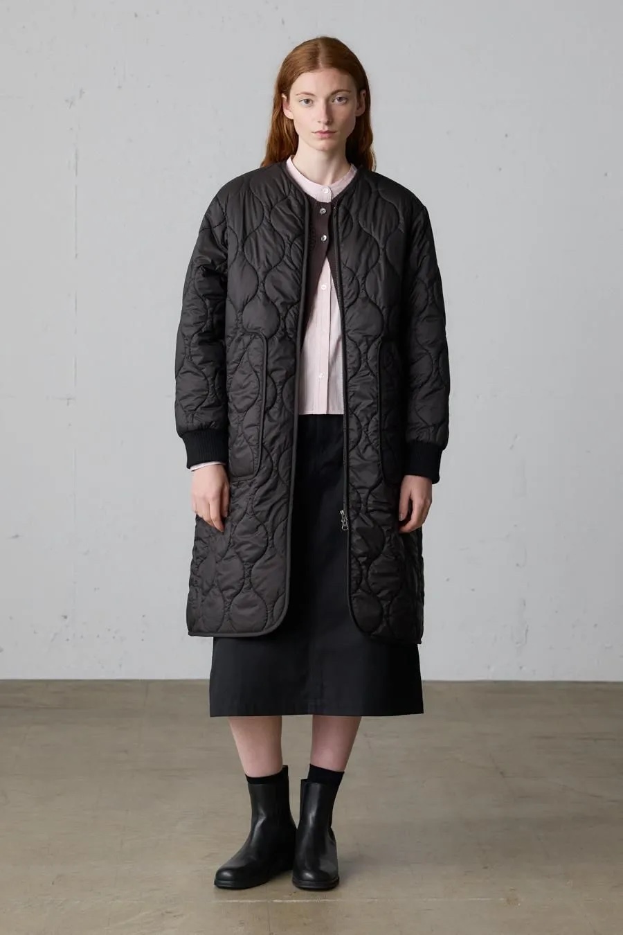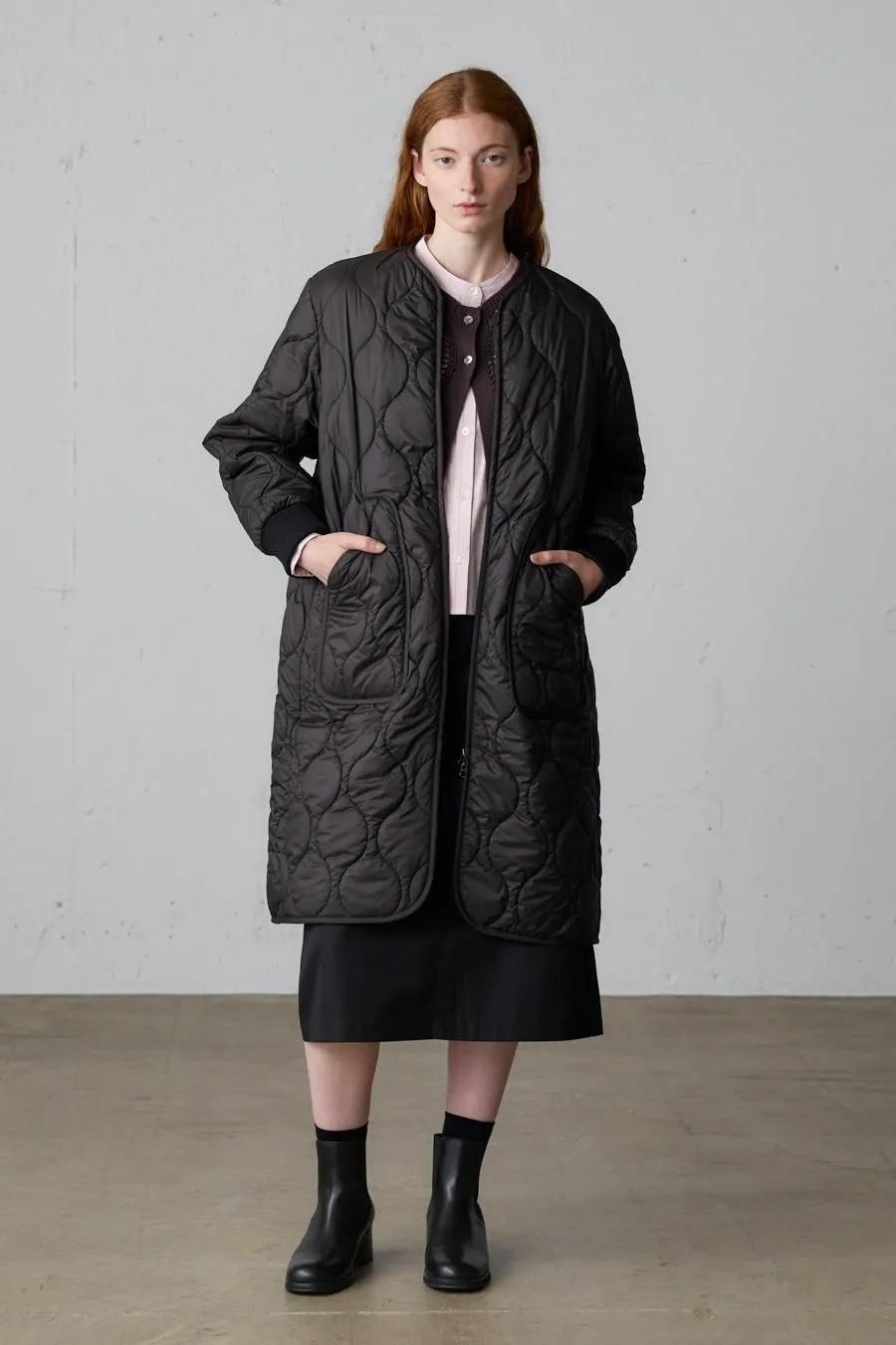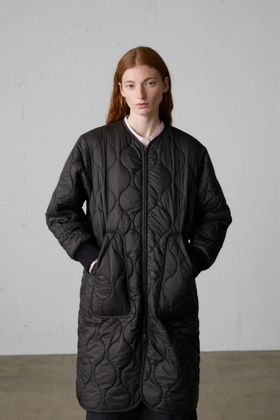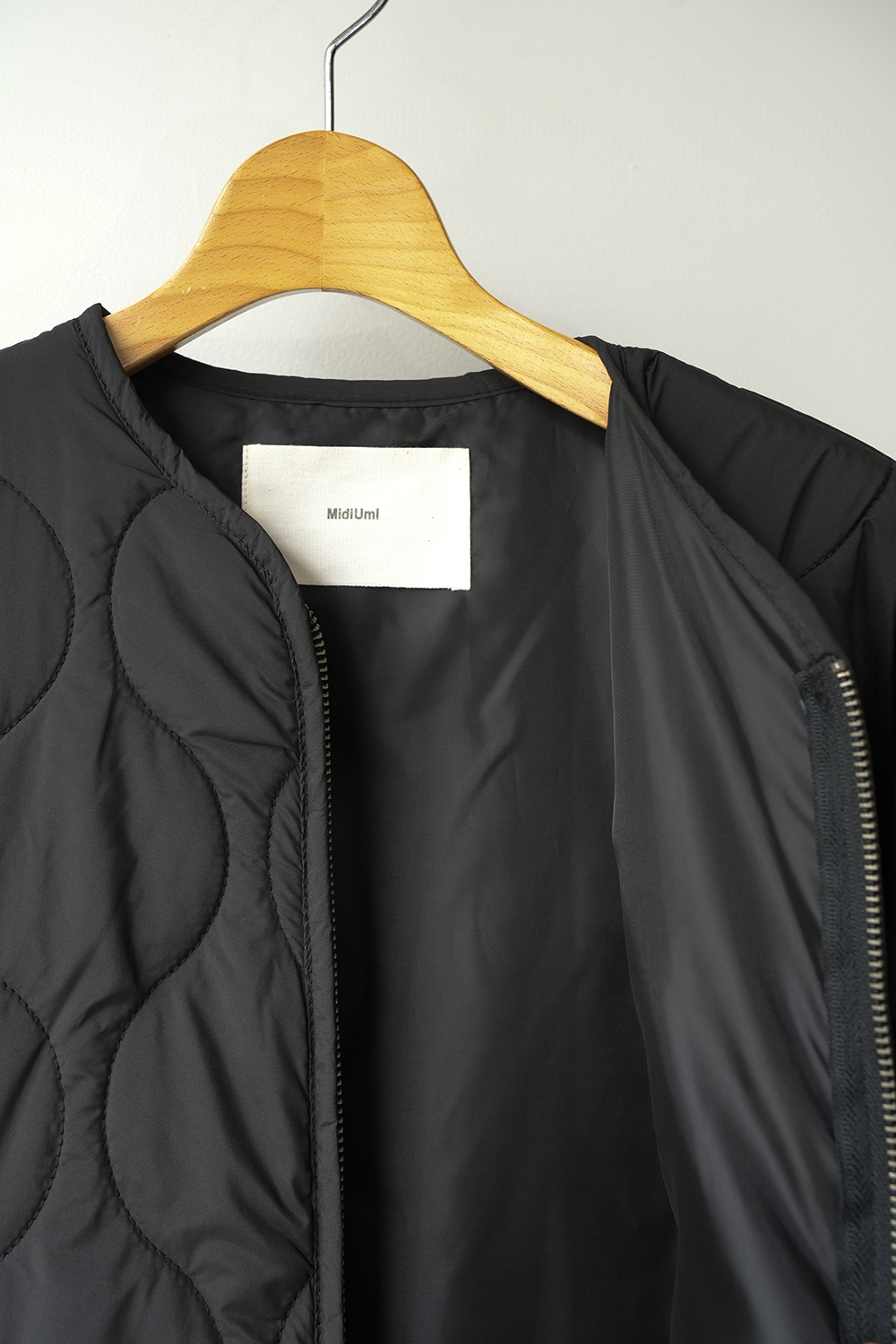 ポリエステルのキルティングコートシリーズ、キルティングロングコートです。MidiUmiの定番アイテムになりつつある、冬のオシャレを楽しんでいただける1枚。昨年人気だった、4-779712/キルティングロングコートをアレンジしました。大きなフロントポケットにデザインを変更しました。中綿量は80g、暖かく軽く仕上げたアウターなので気軽に着用していただけます。袖口は太リブで風通しがないのもポイント。別布パイピング仕様でメリハリのあるデザイン仕上げ。フロントジップに加えすっきり感のある首元はマフラー等の小物使いも魅力的に演出できるのもポイント。膝下のロング丈ですが軽さもあり気軽に着用していただけるアウターです。