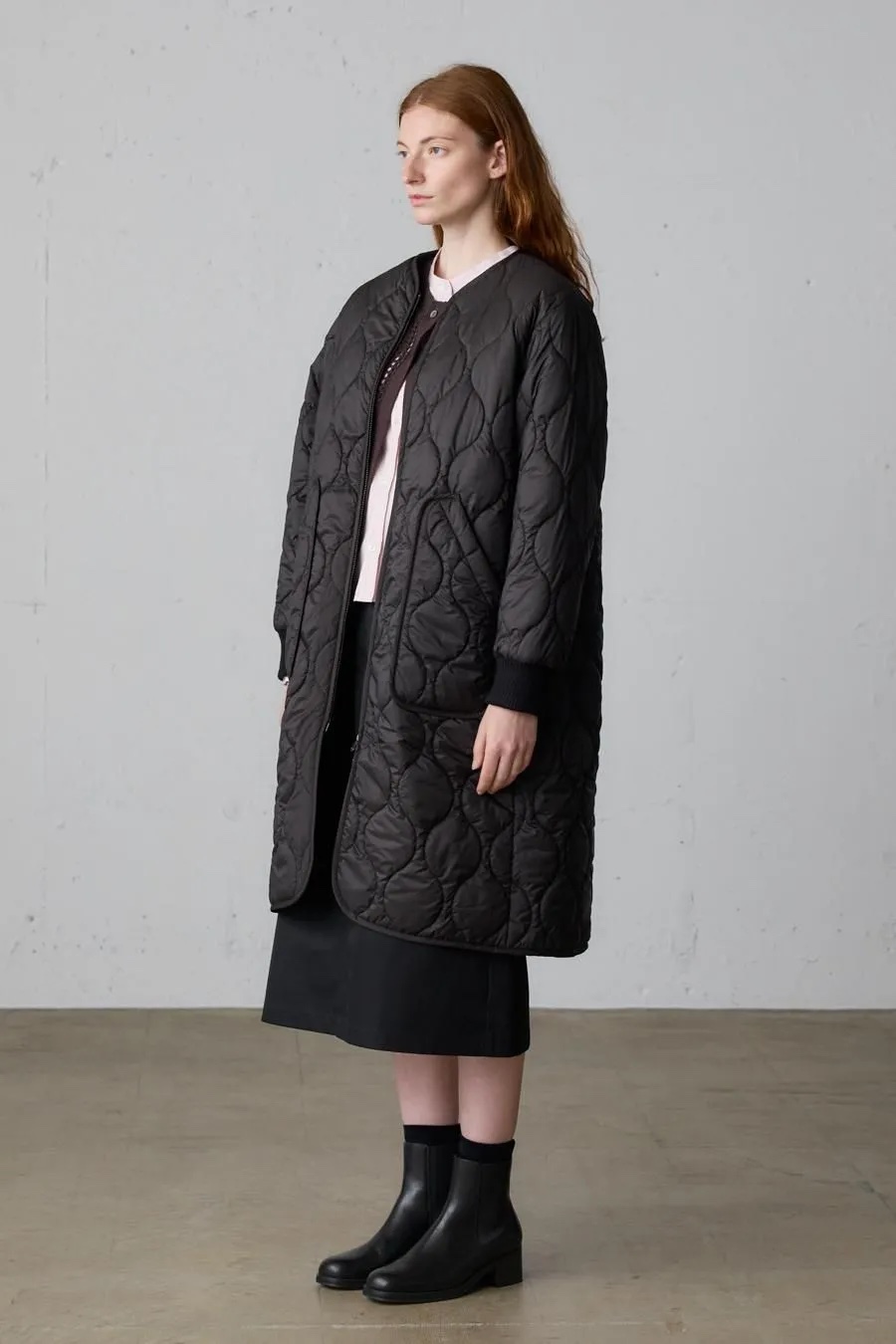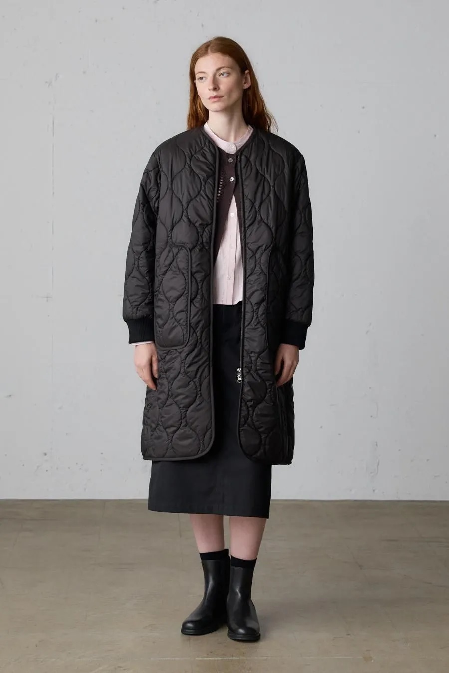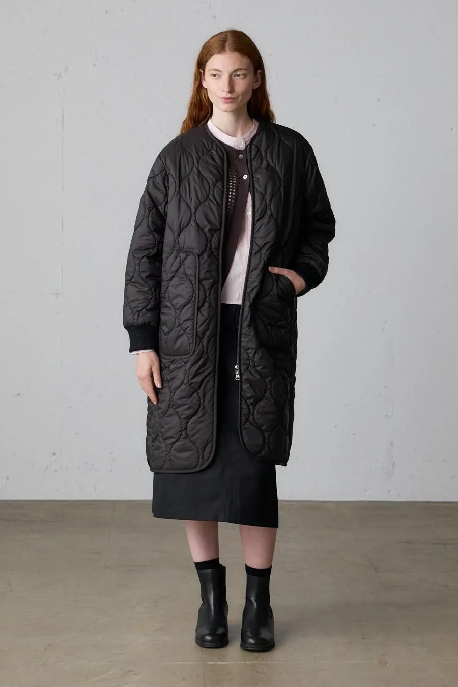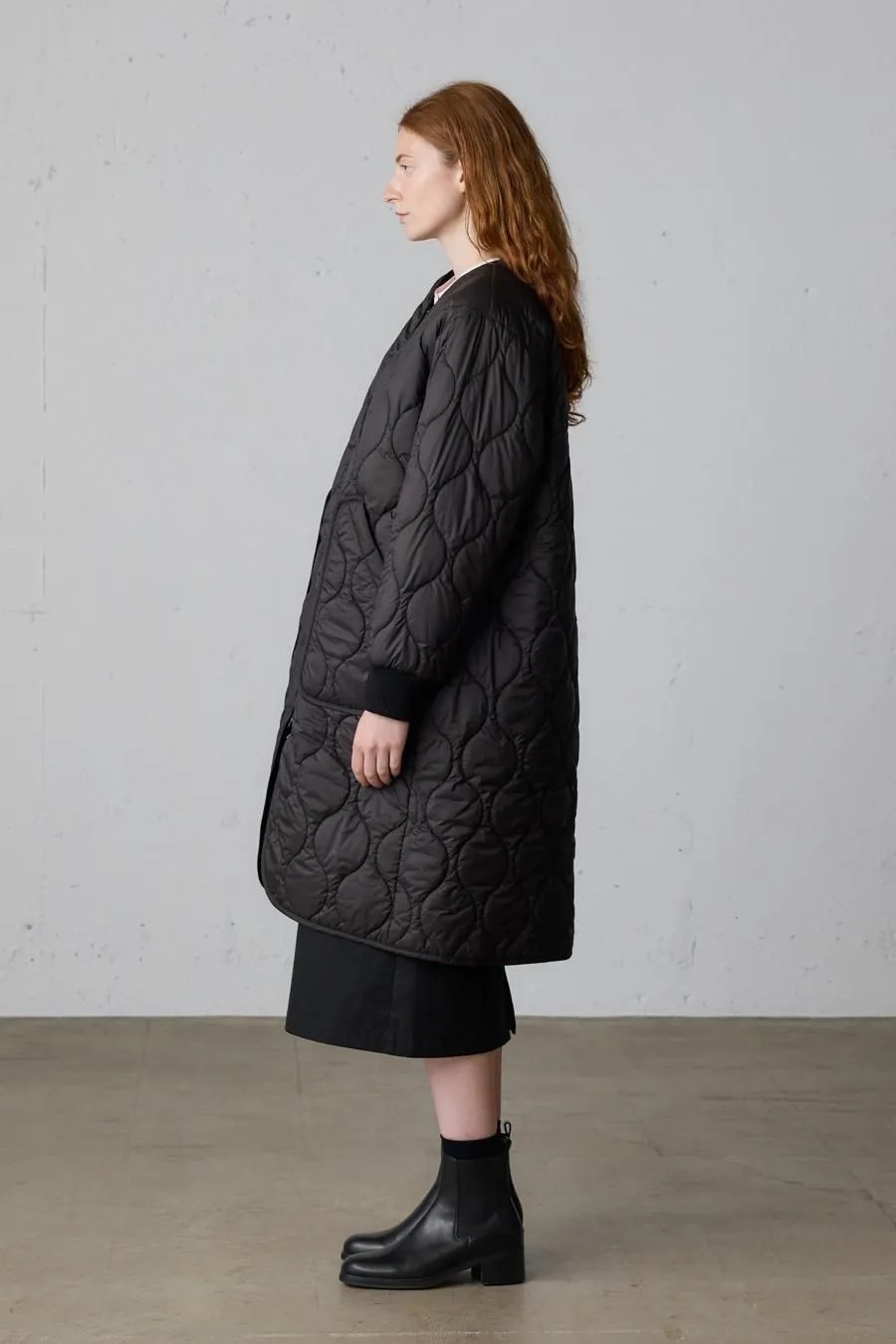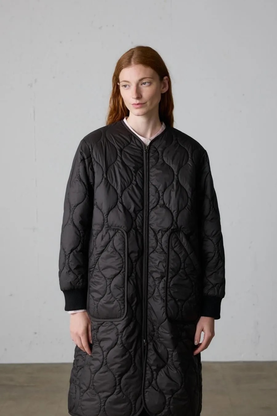 ポリエステルのキルティングコートシリーズ、キルティングロングコートです。MidiUmiの定番アイテムになりつつある、冬のオシャレを楽しんでいただける1枚。昨年人気だった、4-779712/キルティングロングコートをアレンジしました。大きなフロントポケットにデザインを変更しました。中綿量は80g、暖かく軽く仕上げたアウターなので気軽に着用していただけます。袖口は太リブで風通しがないのもポイント。別布パイピング仕様でメリハリのあるデザイン仕上げ。フロントジップに加えすっきり感のある首元はマフラー等の小物使いも魅力的に演出できるのもポイント。膝下のロング丈ですが軽さもあり気軽に着用していただけるアウターです。