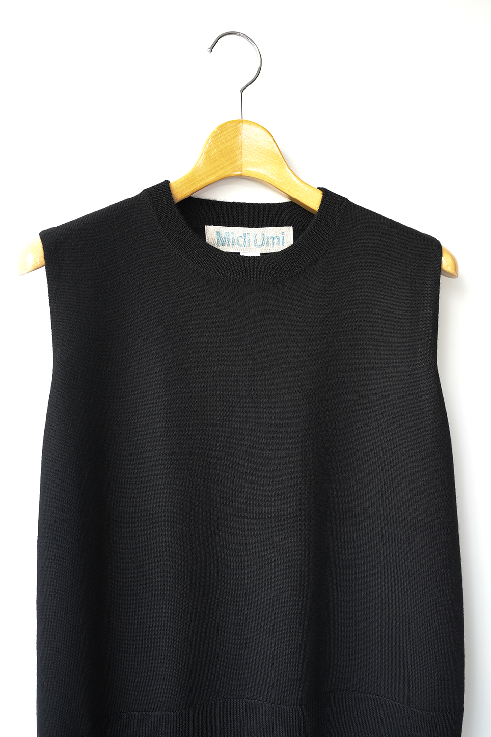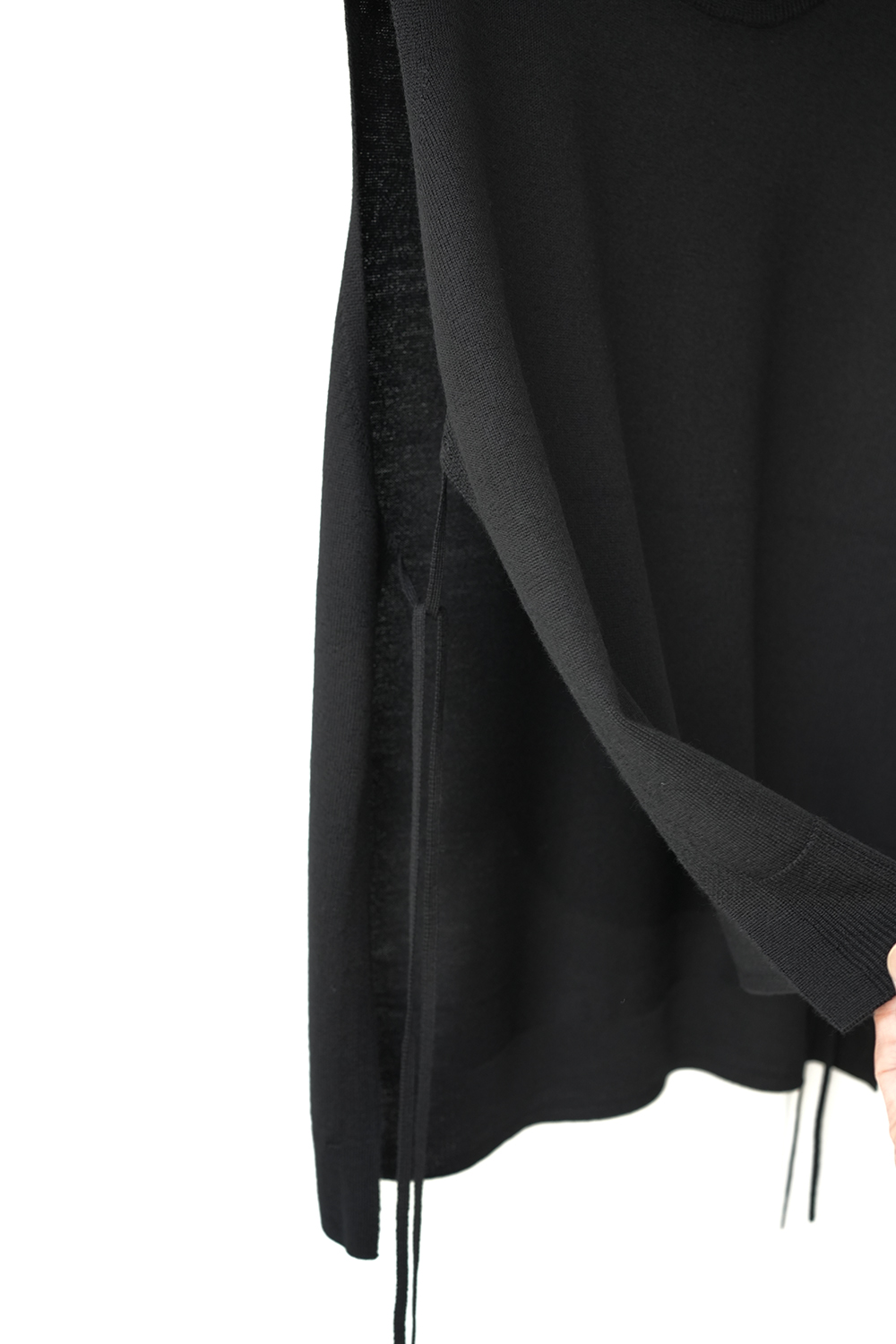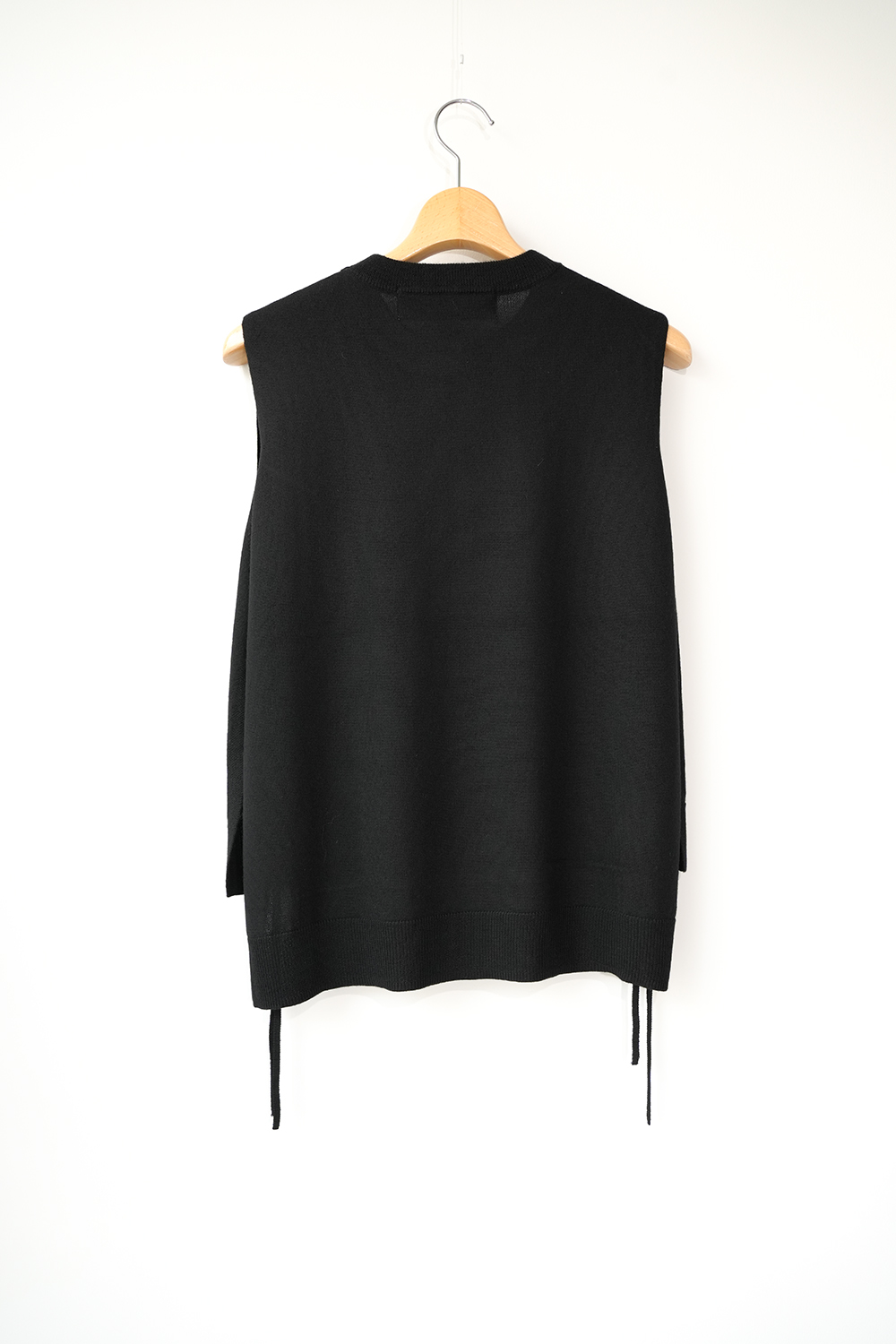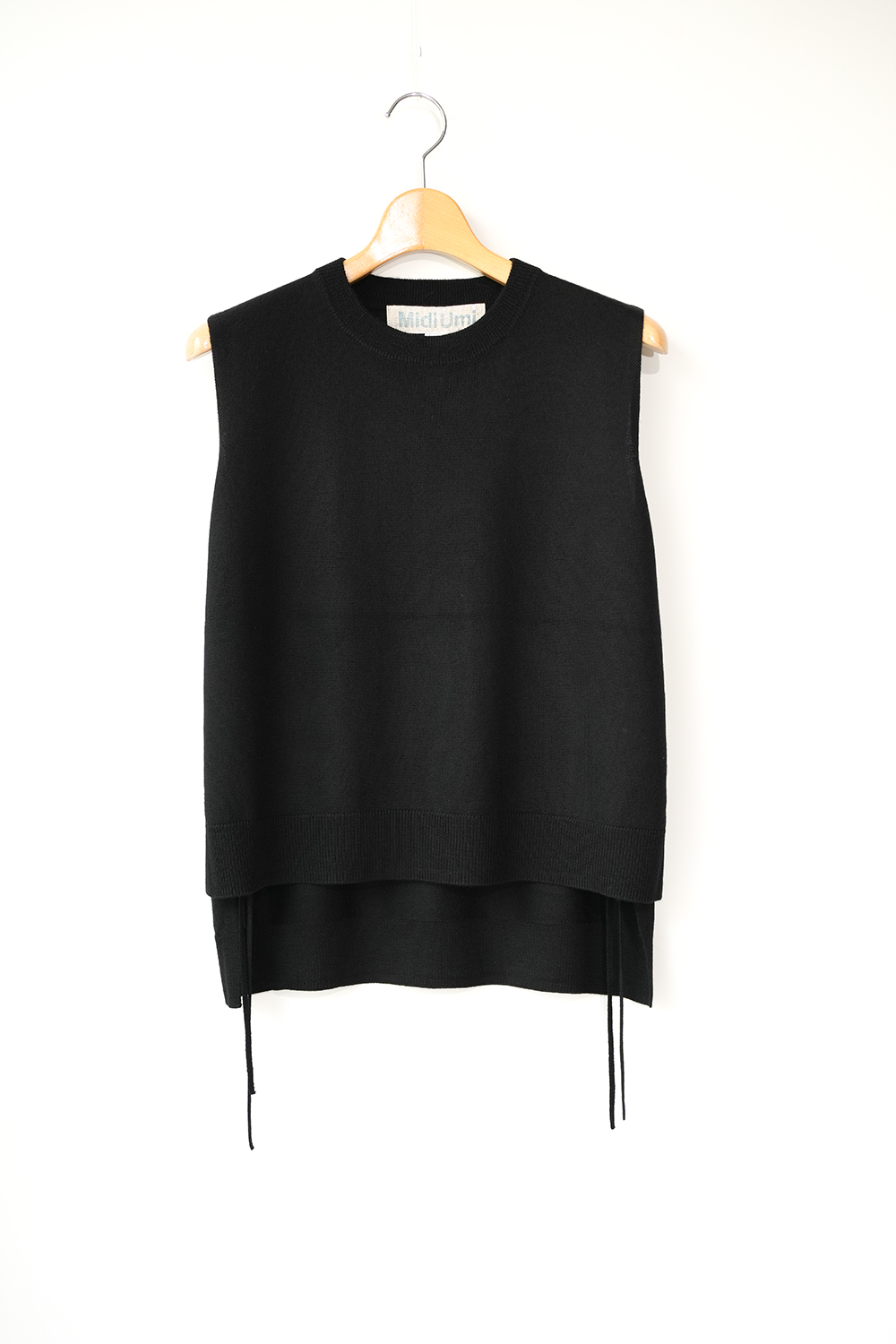 ご自宅でケアが可能なウォッシャブルニットを使用したベスト。ウール素材を使用したハイゲージニットは、薄手でサラッとした肌触り。一見シンプルでベーシックなクルーネックのベストは、サイドのリボンが女性らしいアクセントをプラスします。前と後ろの生地をサイドの紐で結べる仕様になっているので、ボリュームのあるシャツやワンピースにも合わせやすくゆったりと着れるのもポイントです。前後差がありバックが長くヒップにのる丈感。サイドからインナーを見せるデザインがコーディネートをより楽しませてくれます。