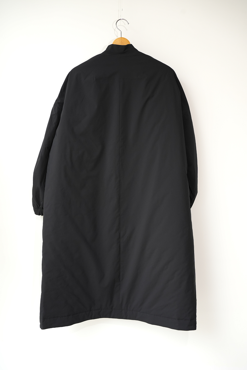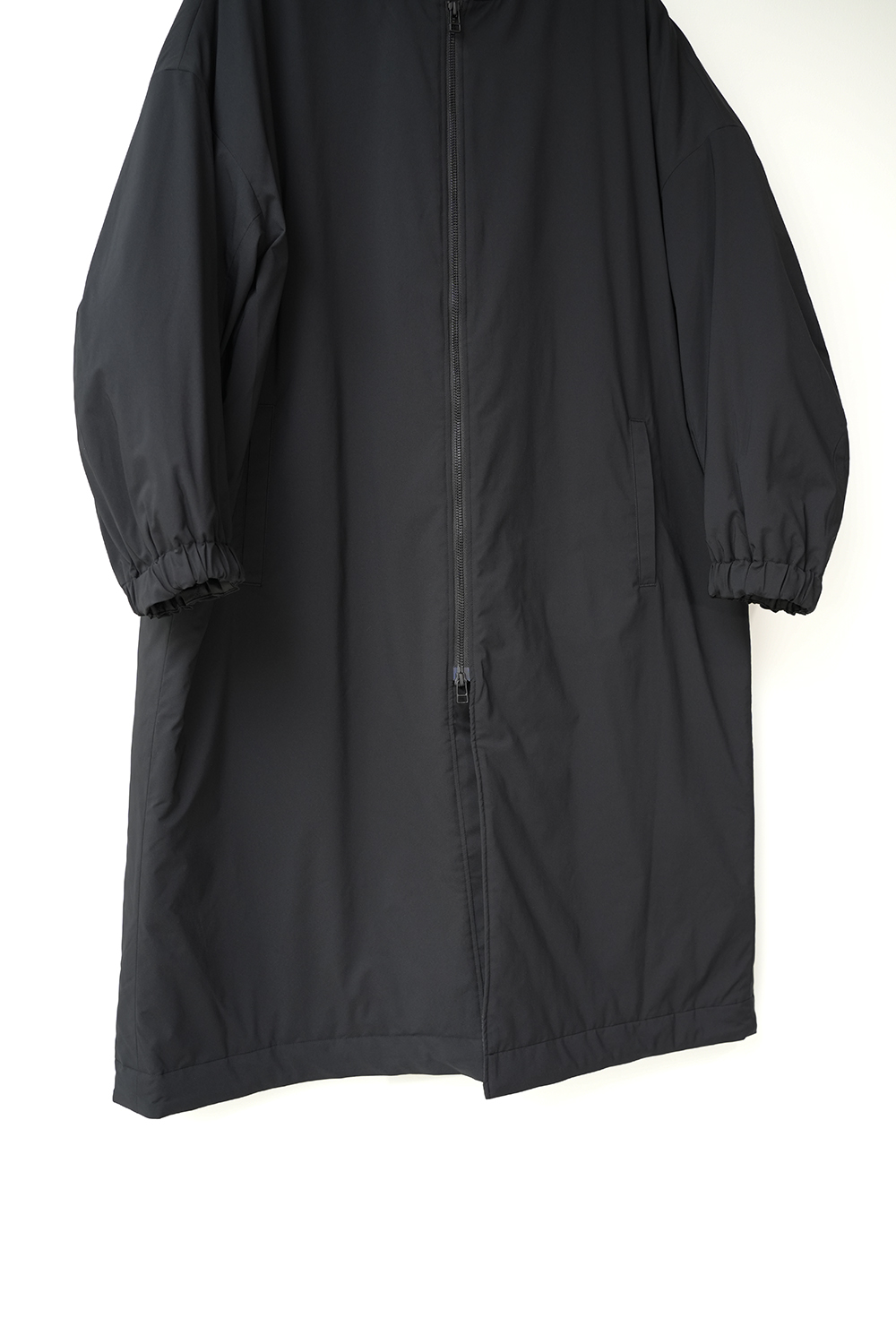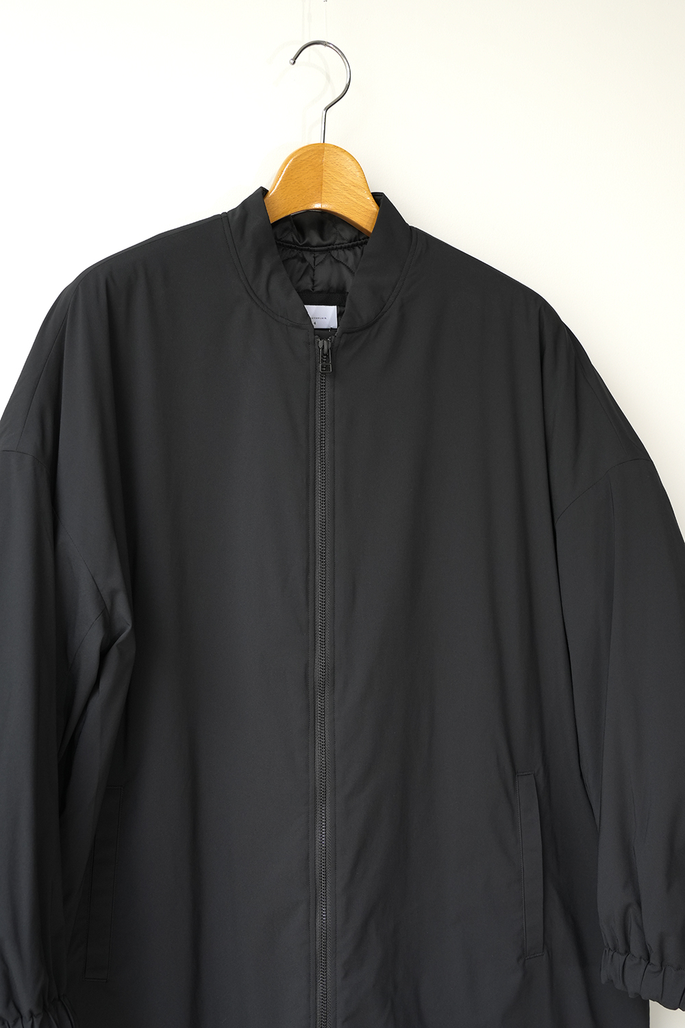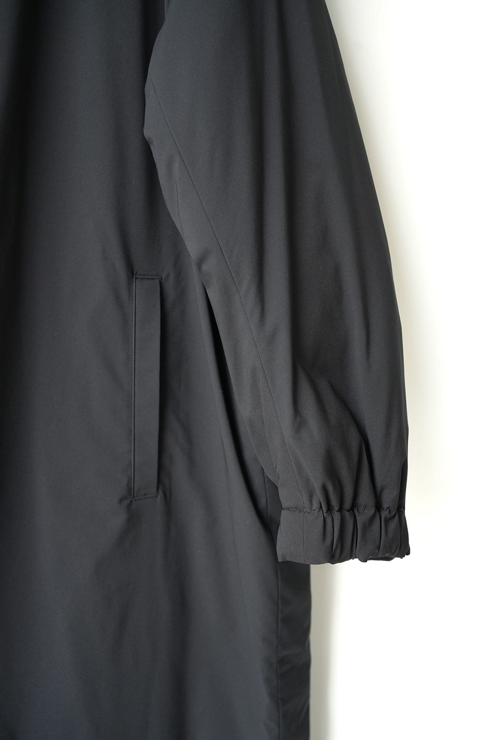 強い撥水性を持ったポリエステル糸を使用したウェザー生地、ストレッチ性があり軽量でとても扱いやすい生地です。中綿は三菱ケミカルのコアブリット。襟を共地にてブルゾンデザインであるリブカラーで仕上げたロングコート、軽くて丈夫、皺になりにくく撥水性があり、暖かい、生地と中綿の特性を活かした気軽にスタリングいただけるロングコートに仕上がっております。