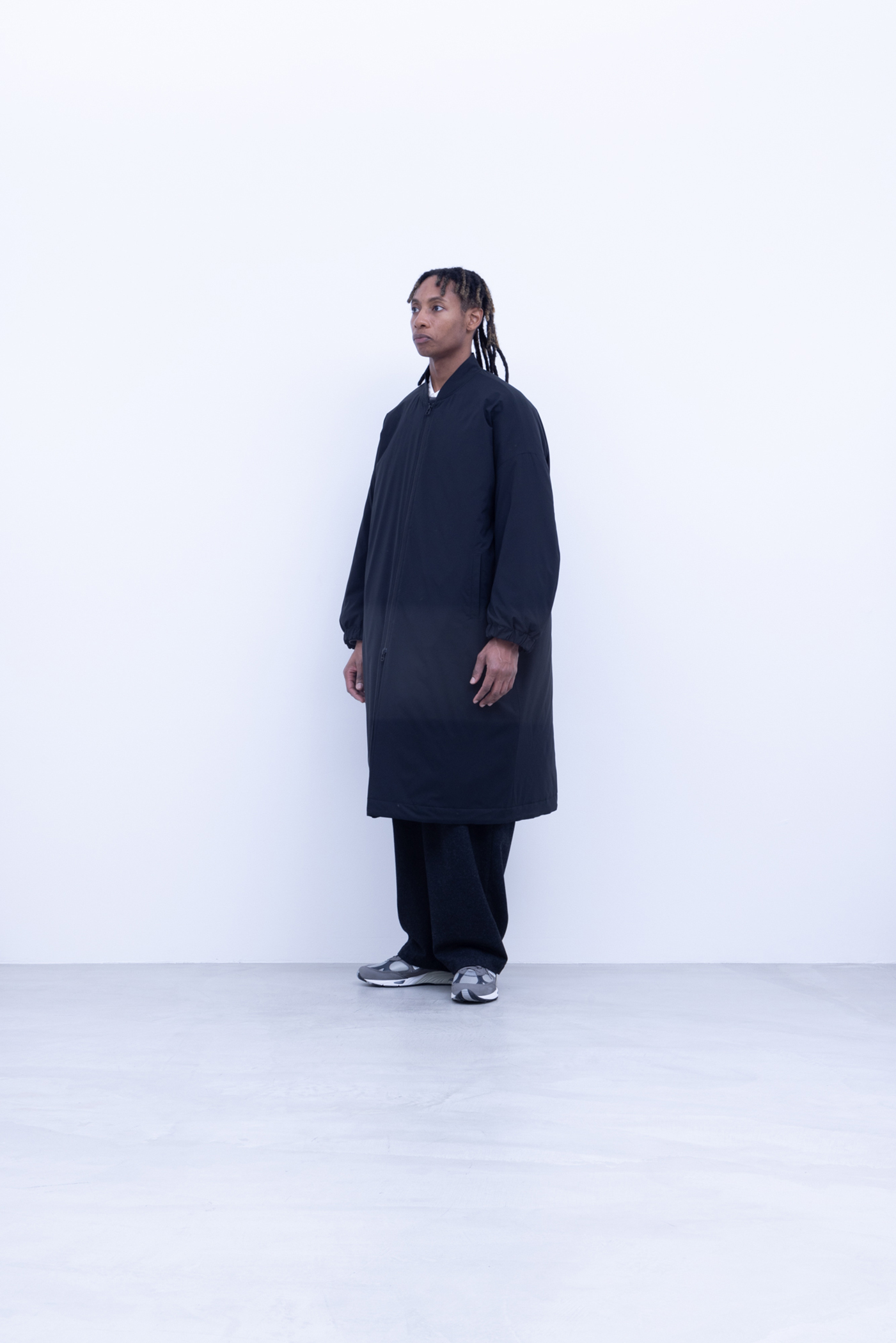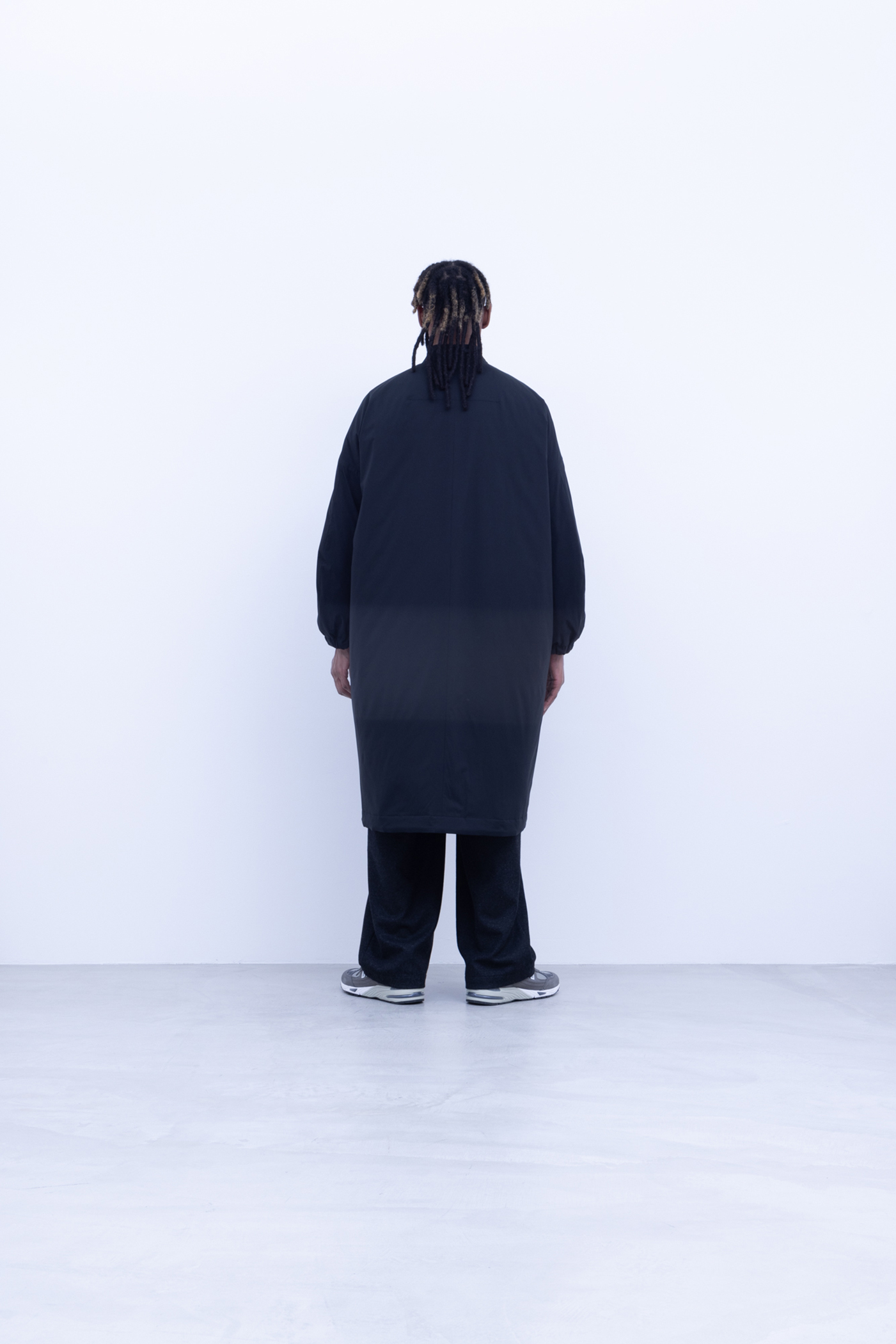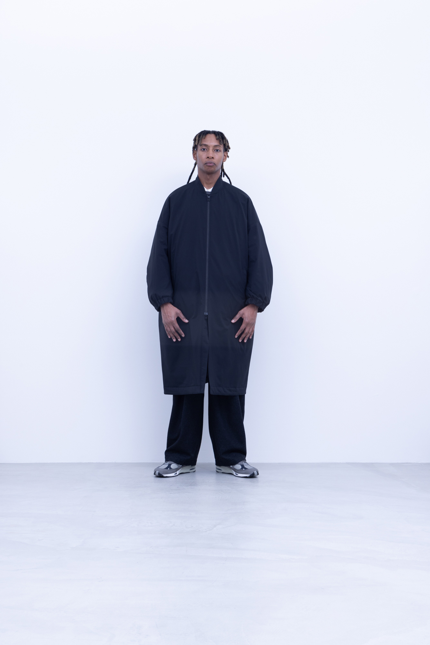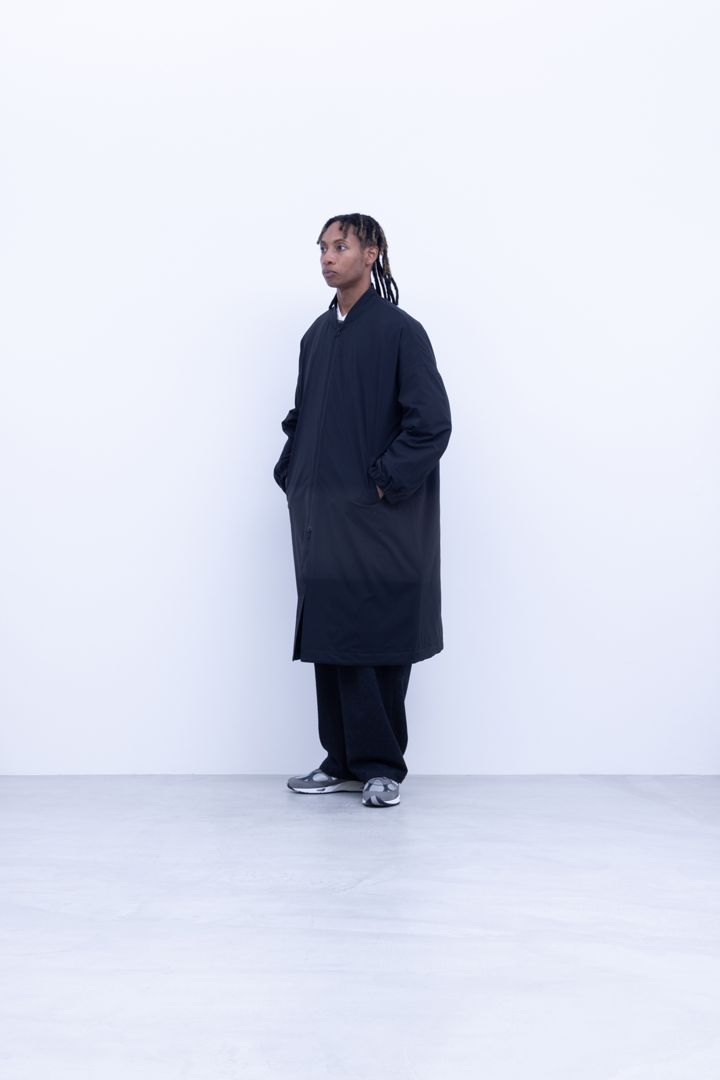 強い撥水性を持ったポリエステル糸を使用したウェザー生地、ストレッチ性があり軽量でとても扱いやすい生地です。中綿は三菱ケミカルのコアブリット。襟を共地にてブルゾンデザインであるリブカラーで仕上げたロングコート、軽くて丈夫、皺になりにくく撥水性があり、暖かい、生地と中綿の特性を活かした気軽にスタリングいただけるロングコートに仕上がっております。