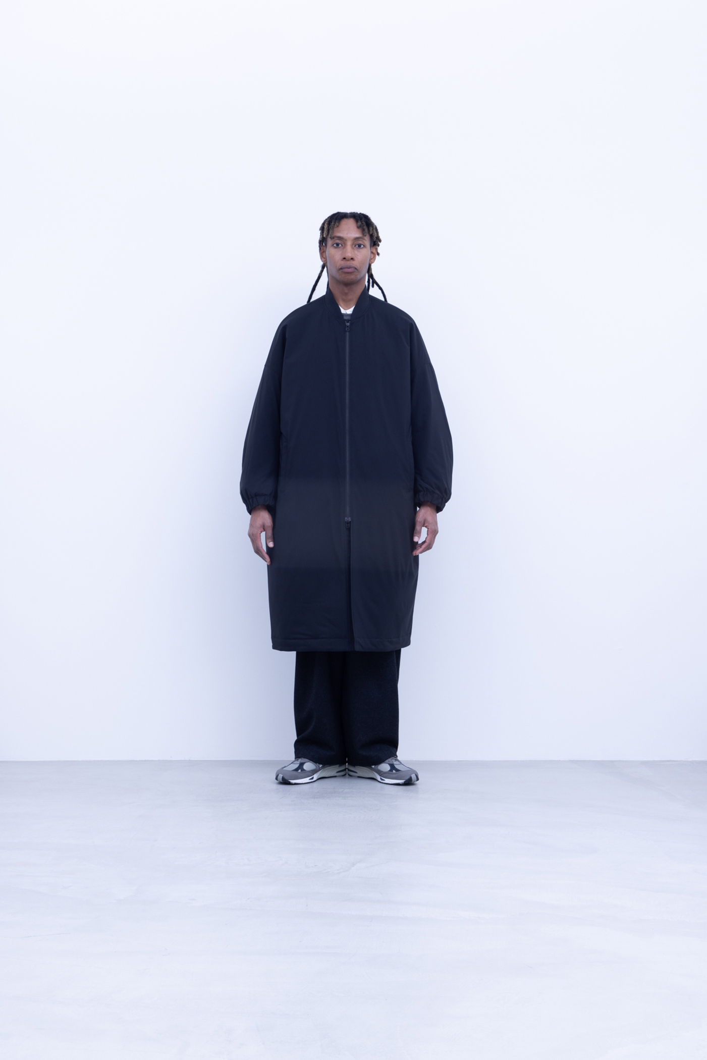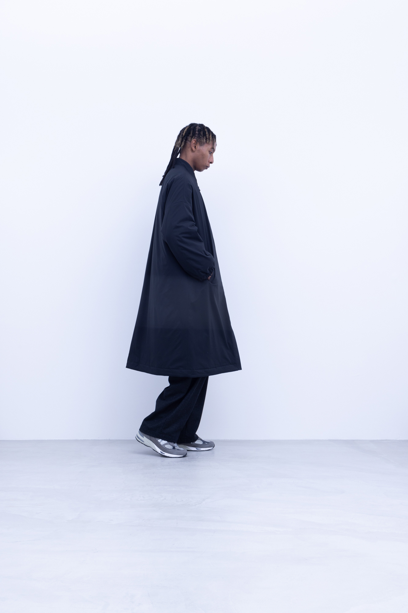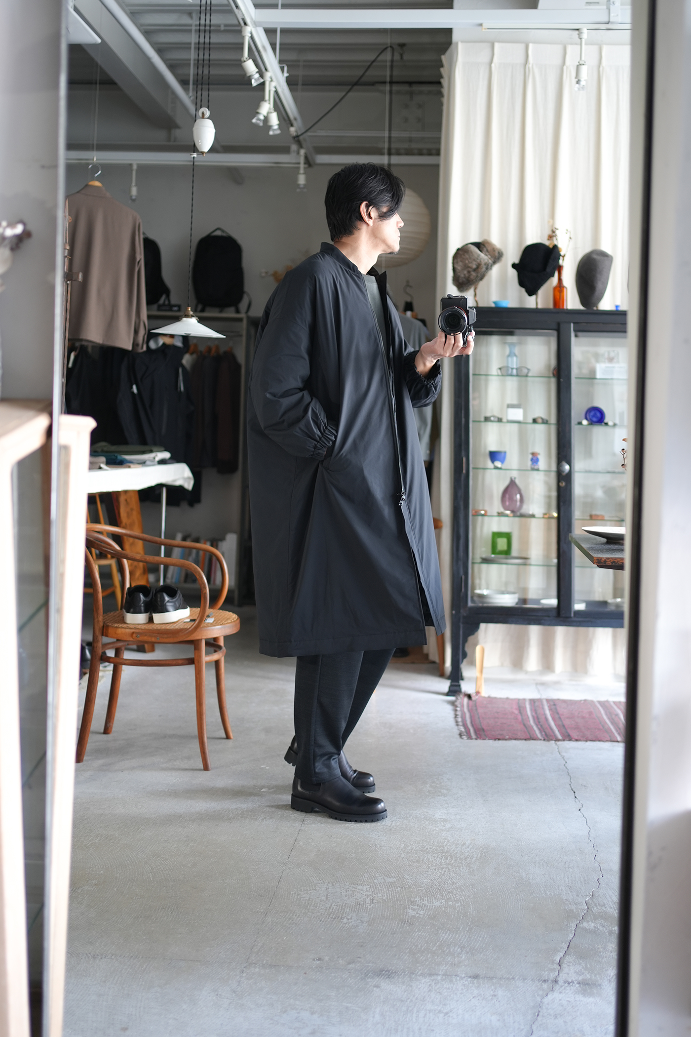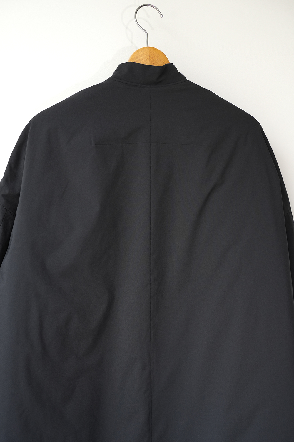 強い撥水性を持ったポリエステル糸を使用したウェザー生地、ストレッチ性があり軽量でとても扱いやすい生地です。中綿は三菱ケミカルのコアブリット。襟を共地にてブルゾンデザインであるリブカラーで仕上げたロングコート、軽くて丈夫、皺になりにくく撥水性があり、暖かい、生地と中綿の特性を活かした気軽にスタリングいただけるロングコートに仕上がっております。
