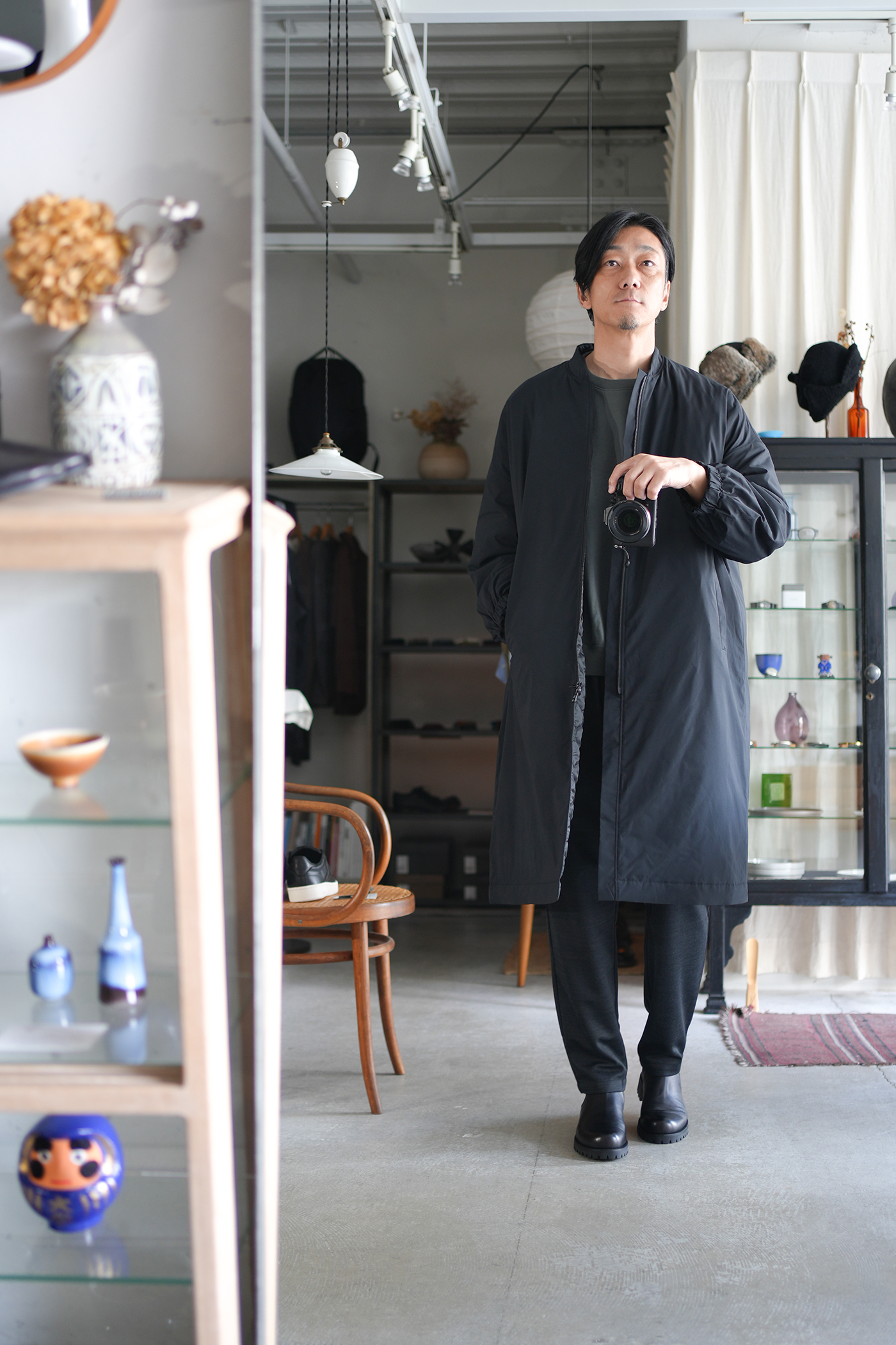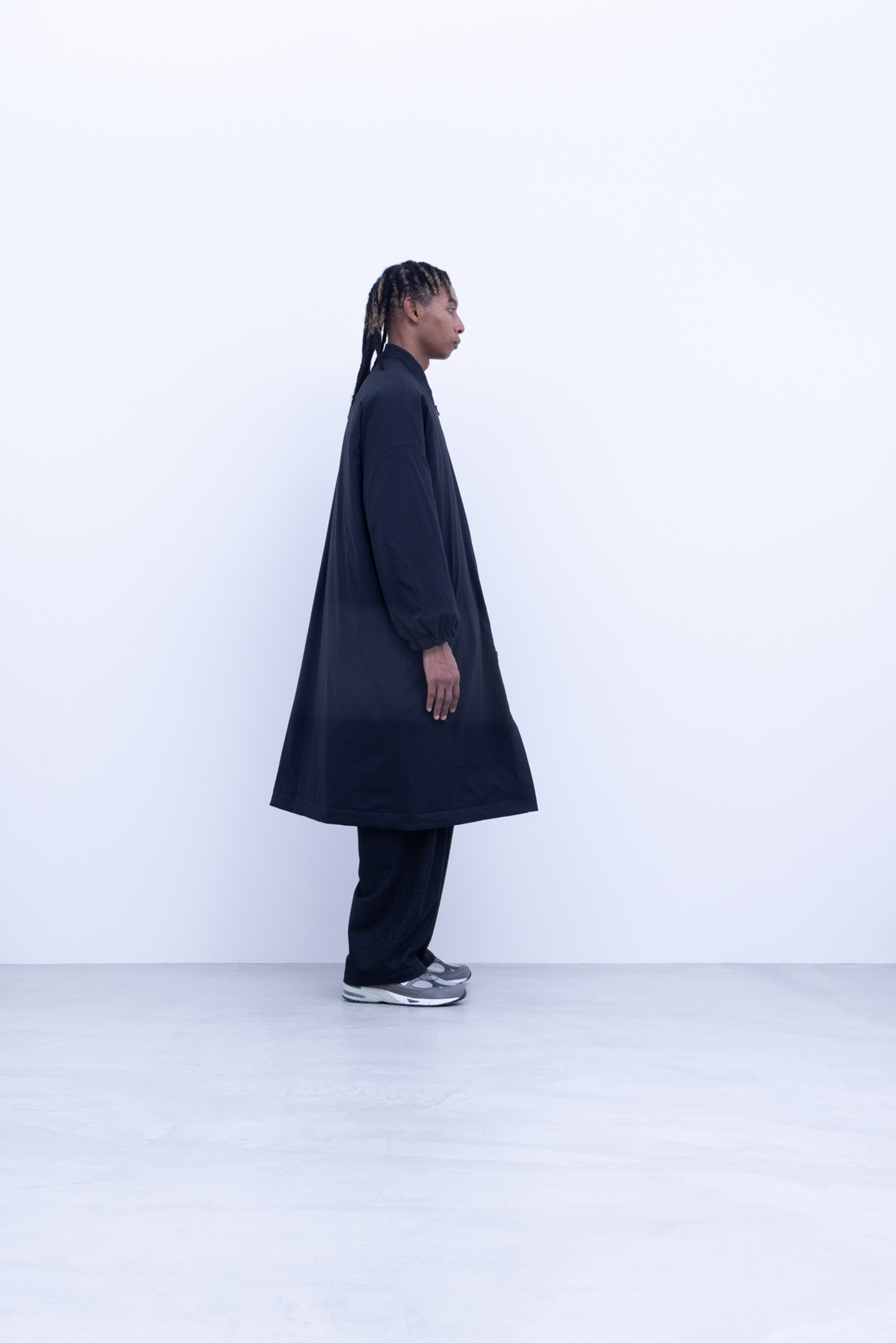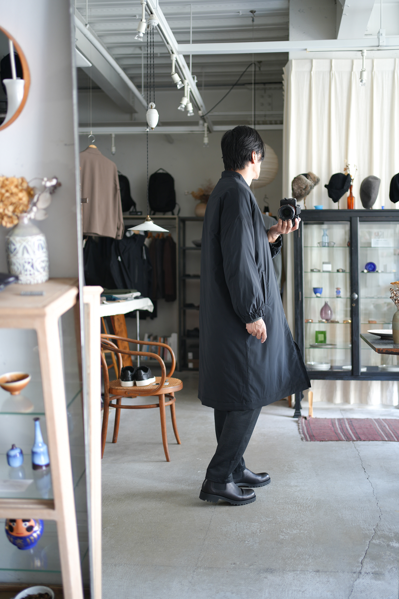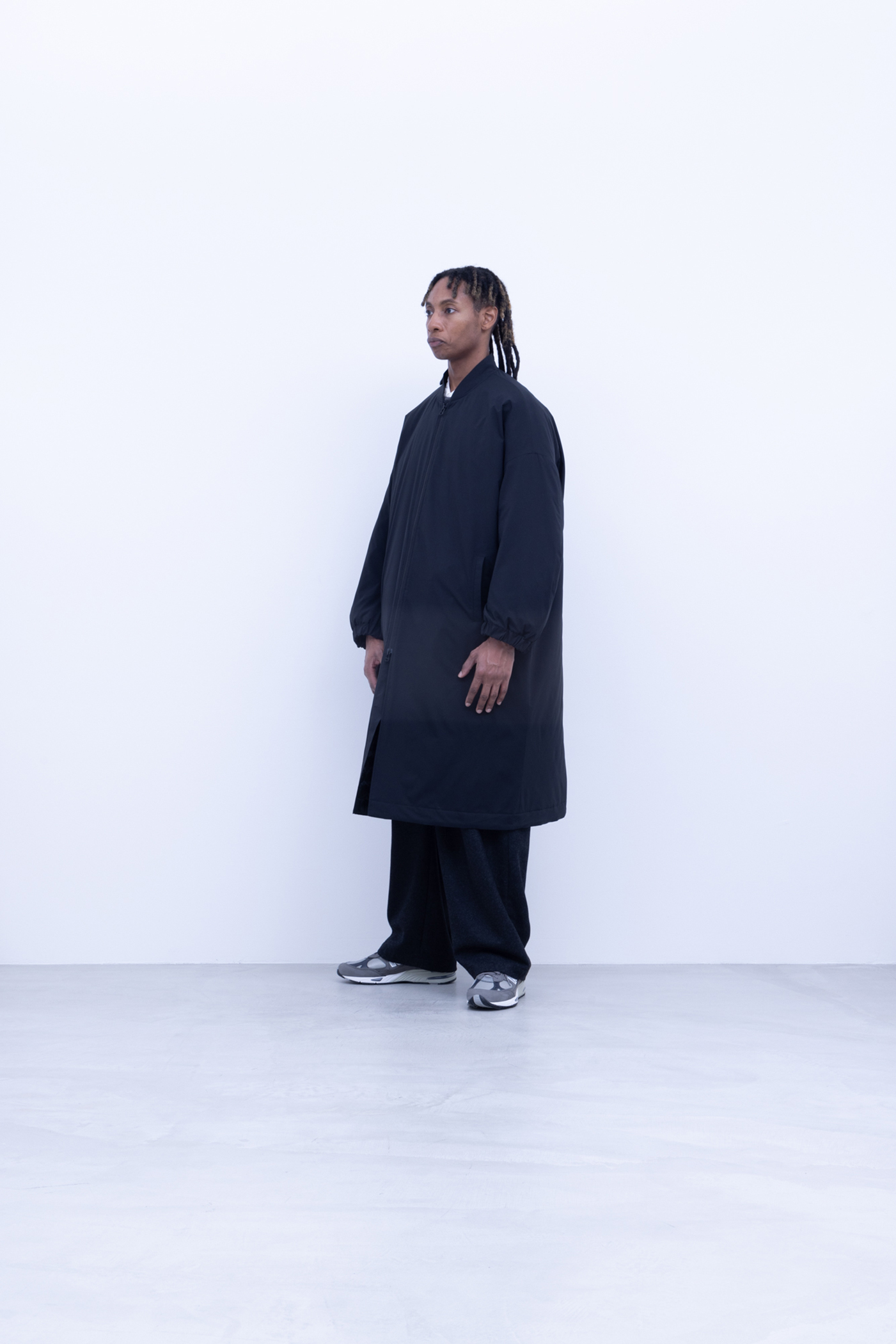 強い撥水性を持ったポリエステル糸を使用したウェザー生地、ストレッチ性があり軽量でとても扱いやすい生地です。中綿は三菱ケミカルのコアブリット。襟を共地にてブルゾンデザインであるリブカラーで仕上げたロングコート、軽くて丈夫、皺になりにくく撥水性があり、暖かい、生地と中綿の特性を活かした気軽にスタリングいただけるロングコートに仕上がっております。