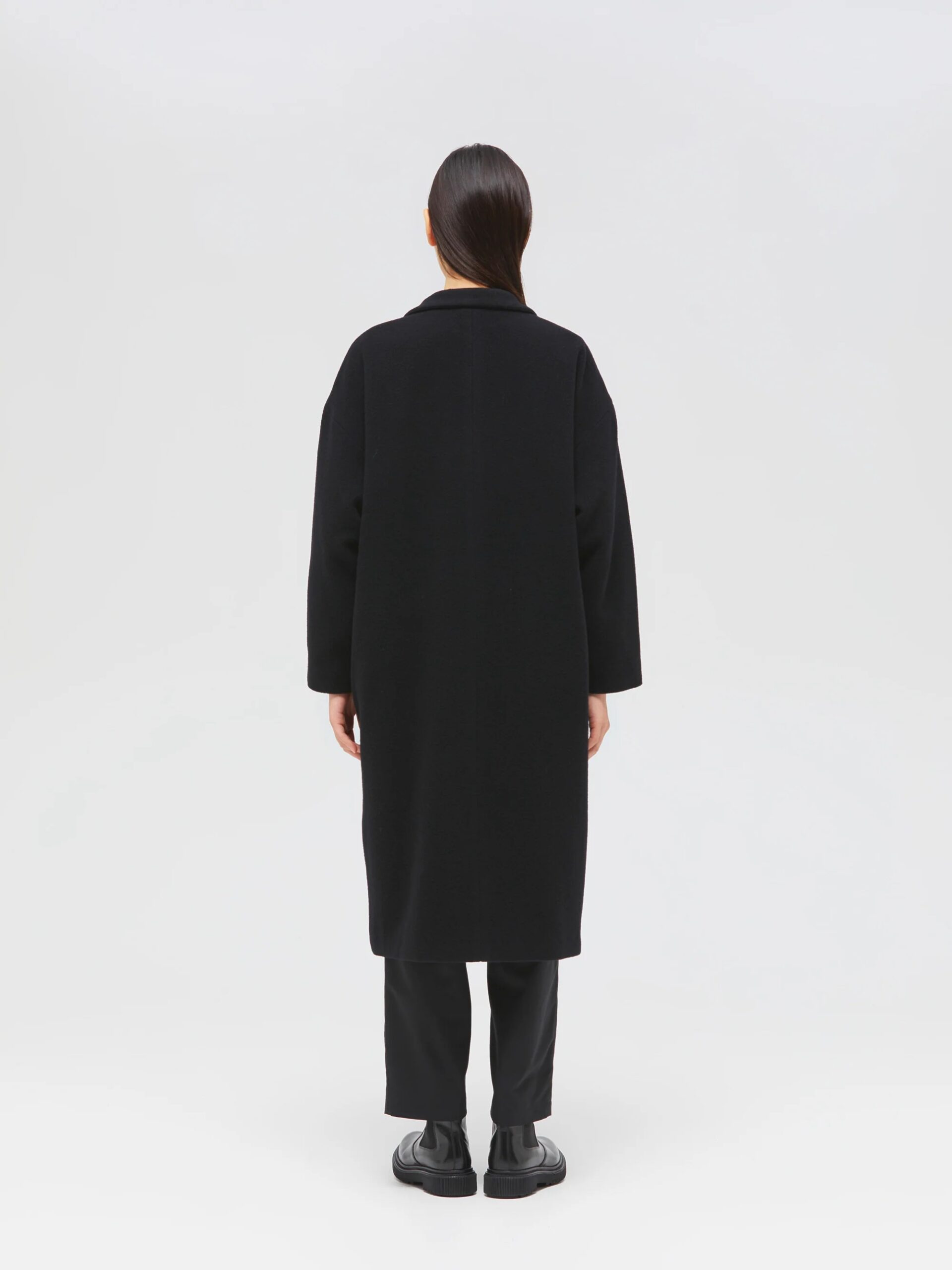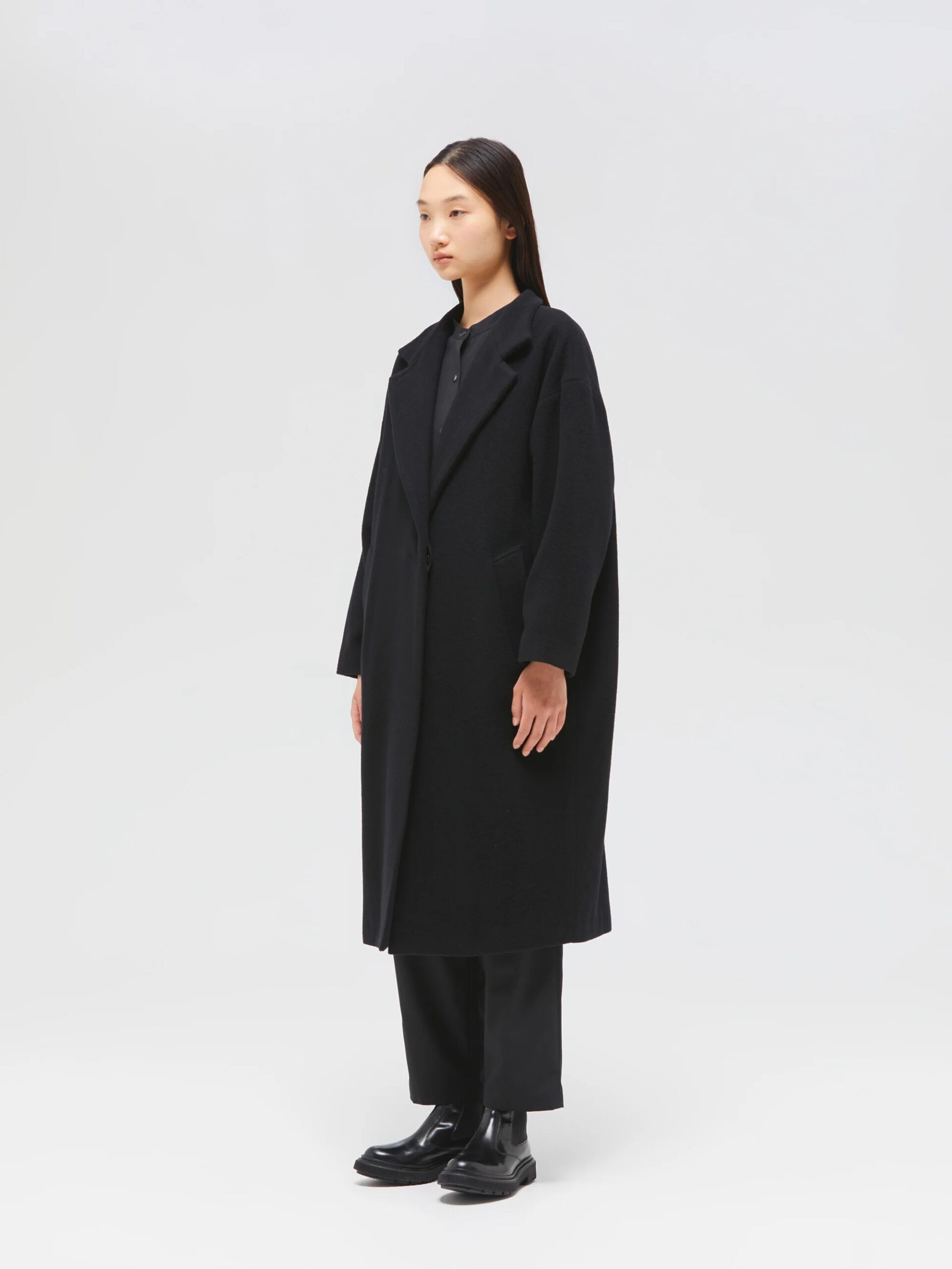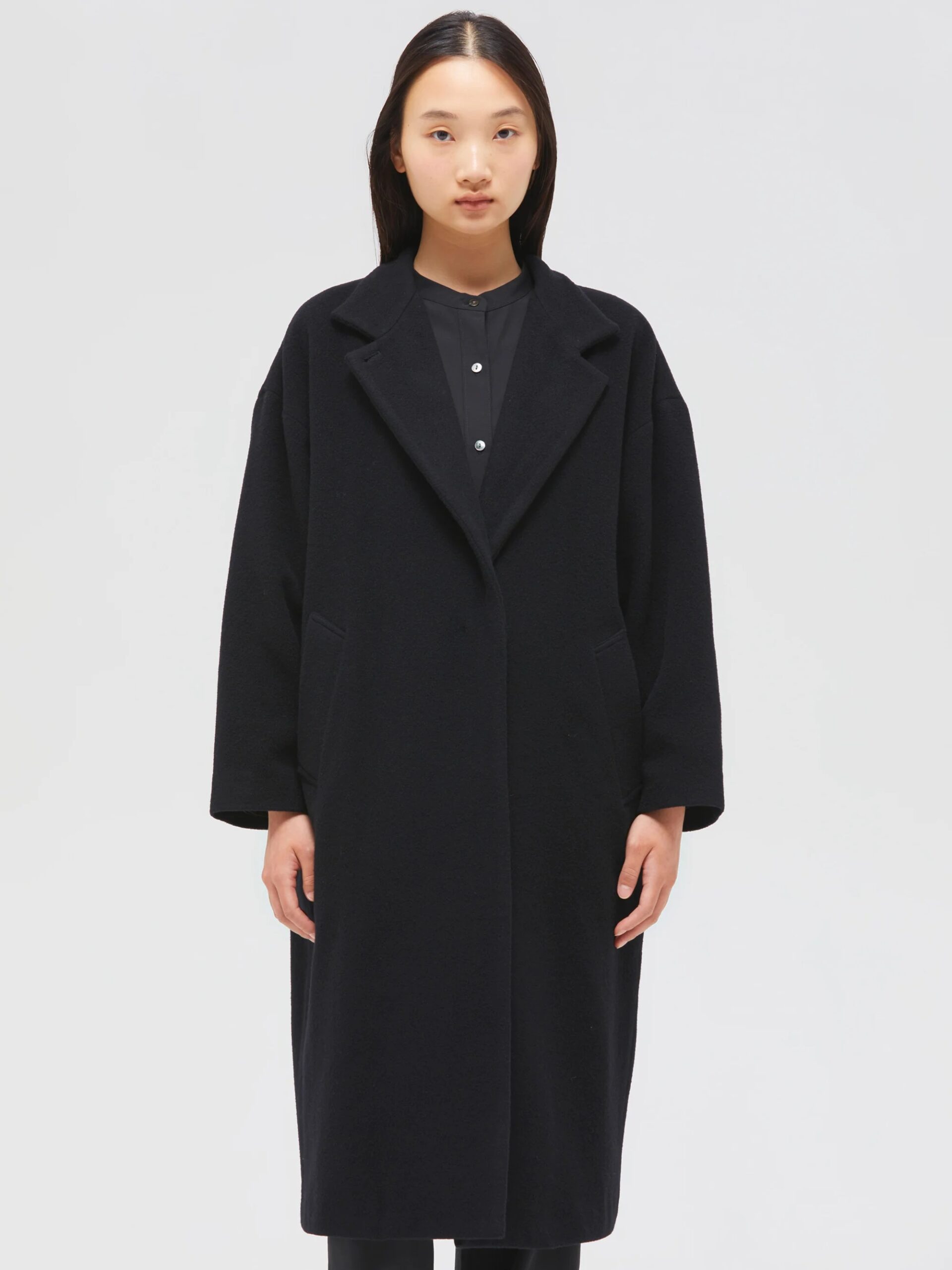 mizuiro indで長く愛され続けている定番のスタンドカラーコート。シンプルながらも洗練されたデザインで、着る人のスタイルを引き立てます。襟を立てればスタイリッシュな印象に、折り返せばテーラード風の上品な雰囲気に。一枚で印象を変えられる、汎用性の高いアウターです。すっきりとしたストレートシルエットに、膝を覆うロング丈。どんなアイテムともバランスが取りやすく、ボトムス問わず合わせやすく毎日活躍します。軽くてあたたかなウールモッサ素材を使用し、冬の装いに軽やかさをプラス。重く見えがちな季節のコーディネートも、軽快で柔らかな雰囲気に仕上がります。ゆとりを持たせたアームホールで、厚手のニットも重ねやすく、裏地付きで動きやすく快適な着心地。シーズンを通してデイリーに活躍する、mizuiro indらしいミニマルな一着です。