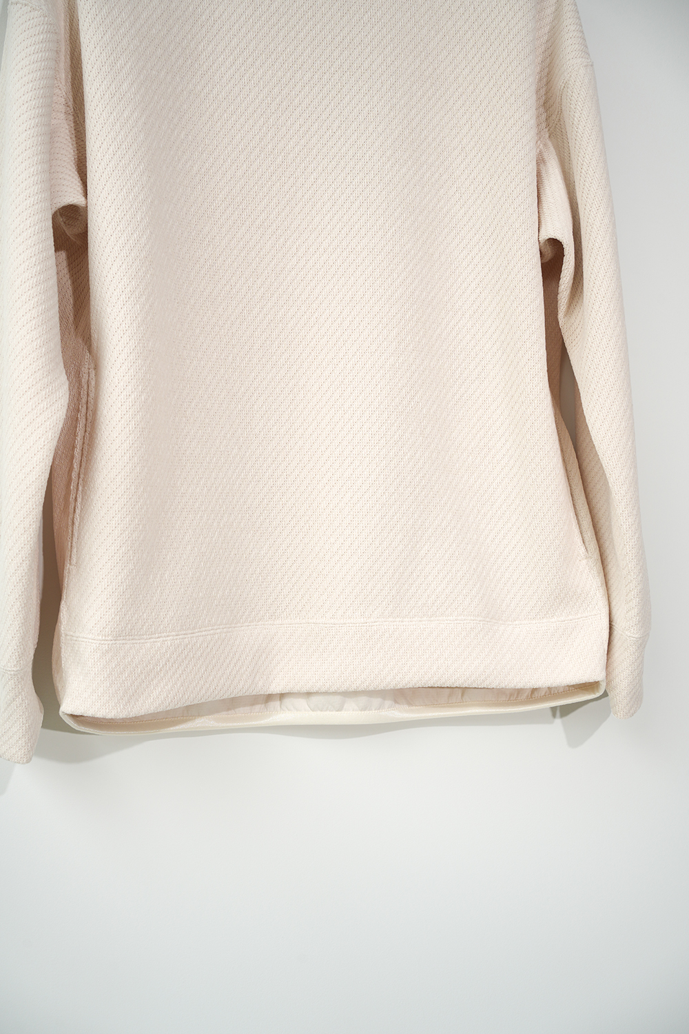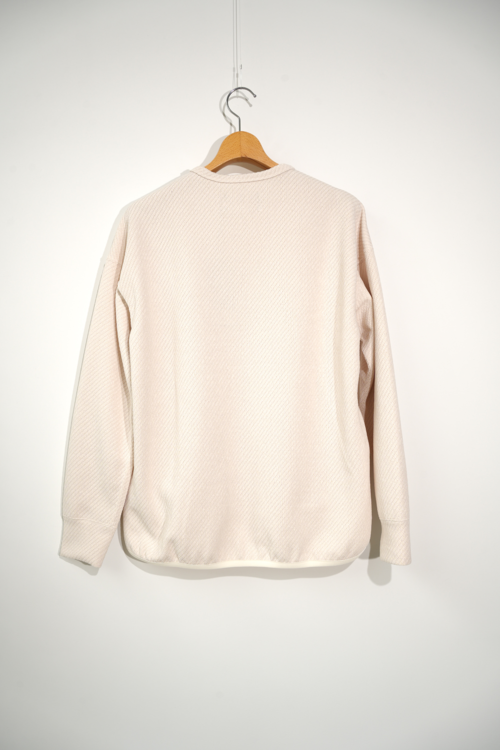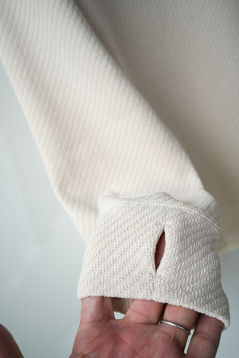 リサイクルポリエステルのモール糸で編み立てた、表と裏の見え方が異なるクウォーターゲージニットを用いたクルーネックプルオーバー。温かみのある肌触りと太めのツイル模様が特徴のダンボールニットは、膨らみがありながらも軽量。表面は暖かく起毛されていますが内側はサラッとしているので、インナーと摩擦することなく滑りが良いので着心地も優れています。全体のシルエットはオーセンティックなバランスですが、後ろ身頃の裾のみストレッチバインダーで丸みを出しています。ウエスト部分にはシームポケット有り。袖口にサムホール付き。