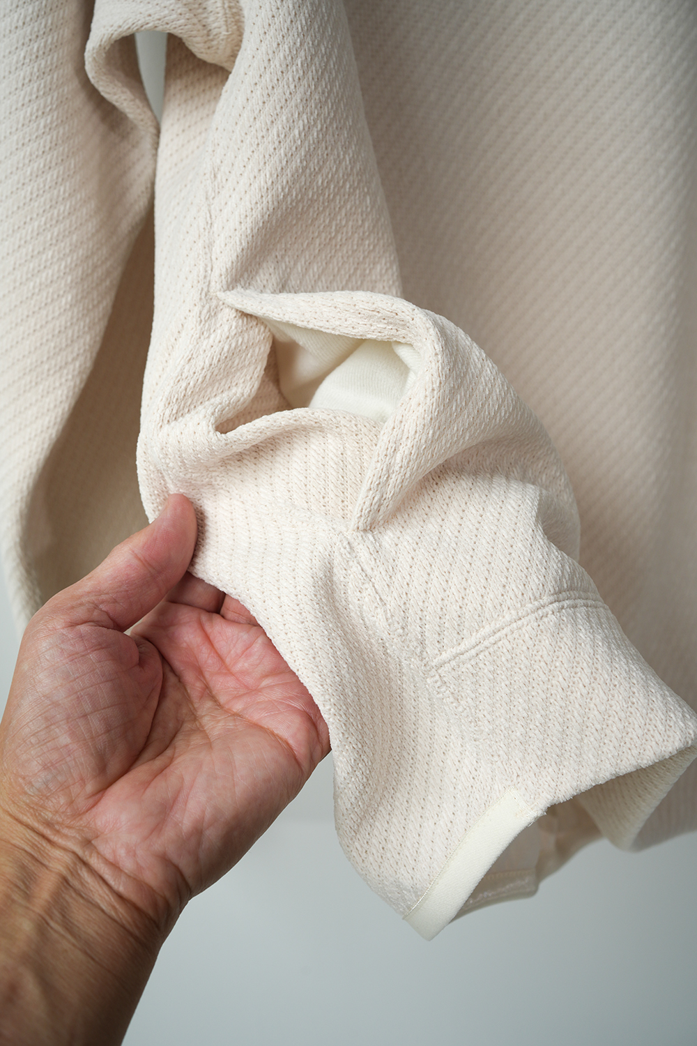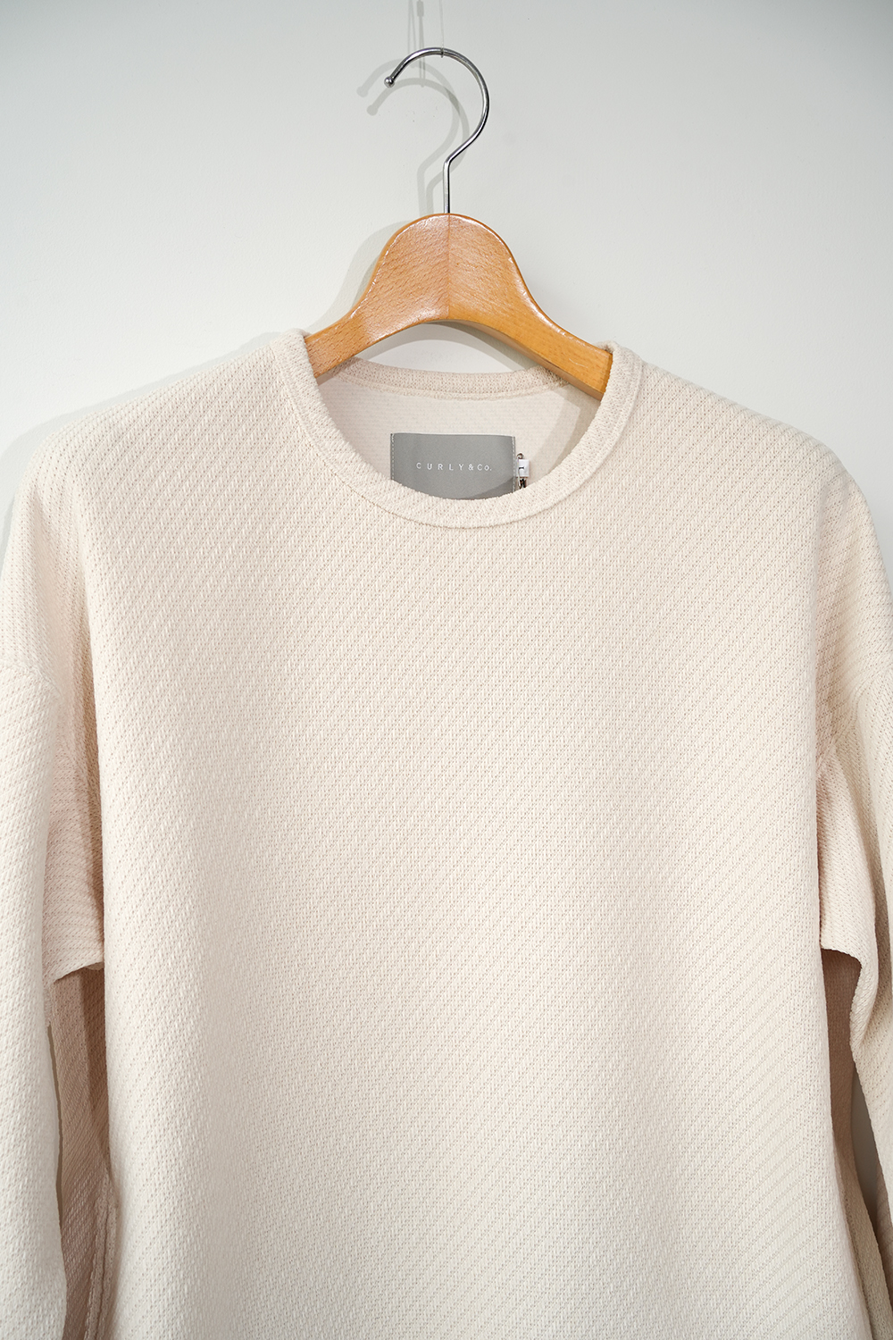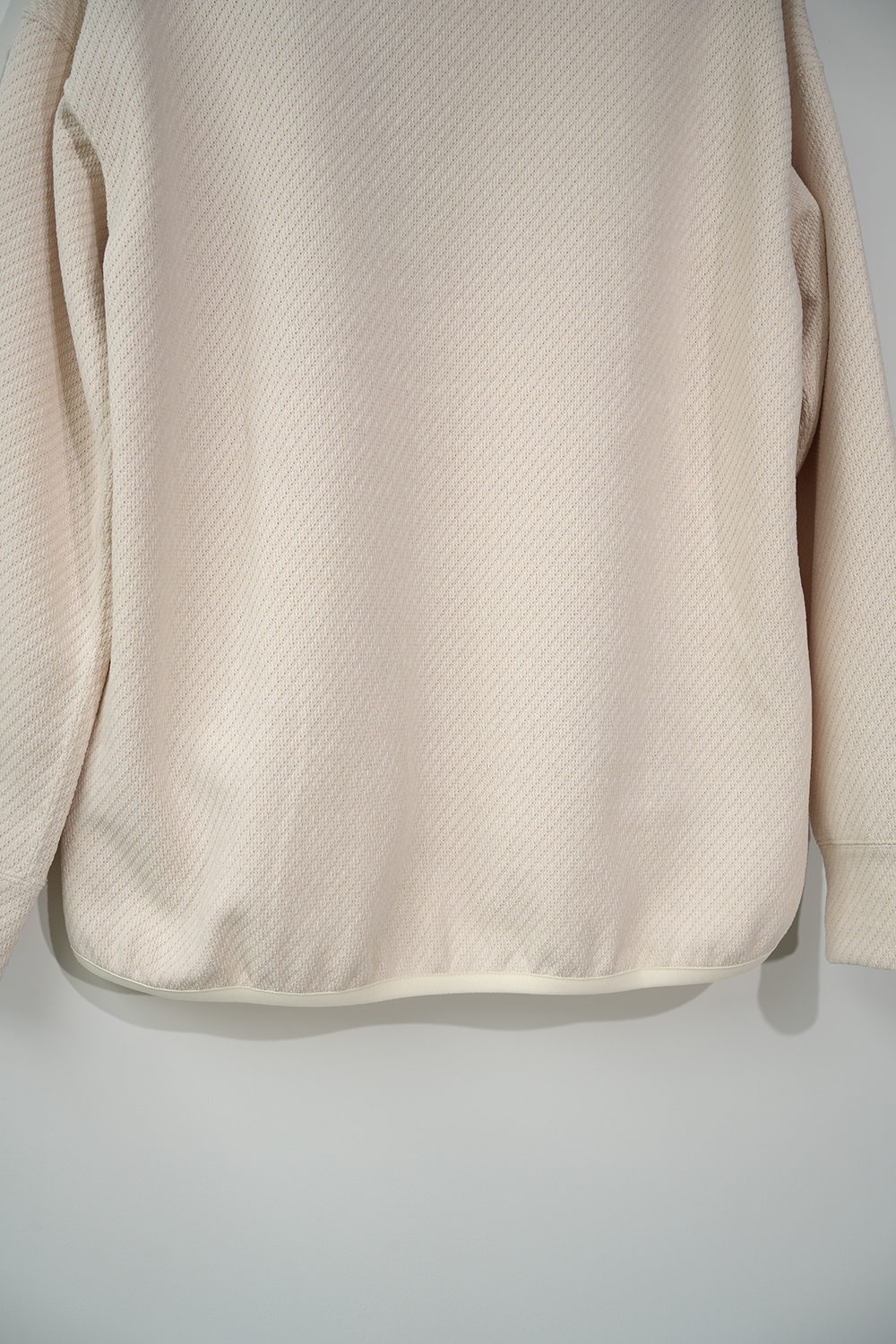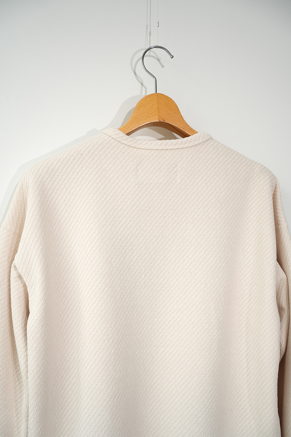 リサイクルポリエステルのモール糸で編み立てた、表と裏の見え方が異なるクウォーターゲージニットを用いたクルーネックプルオーバー。温かみのある肌触りと太めのツイル模様が特徴のダンボールニットは、膨らみがありながらも軽量。表面は暖かく起毛されていますが内側はサラッとしているので、インナーと摩擦することなく滑りが良いので着心地も優れています。全体のシルエットはオーセンティックなバランスですが、後ろ身頃の裾のみストレッチバインダーで丸みを出しています。ウエスト部分にはシームポケット有り。袖口にサムホール付き。