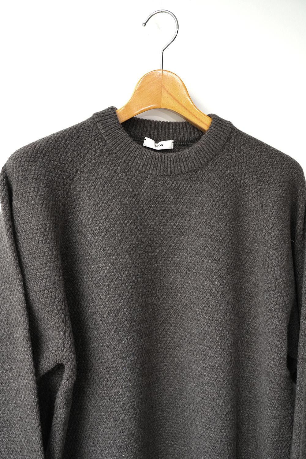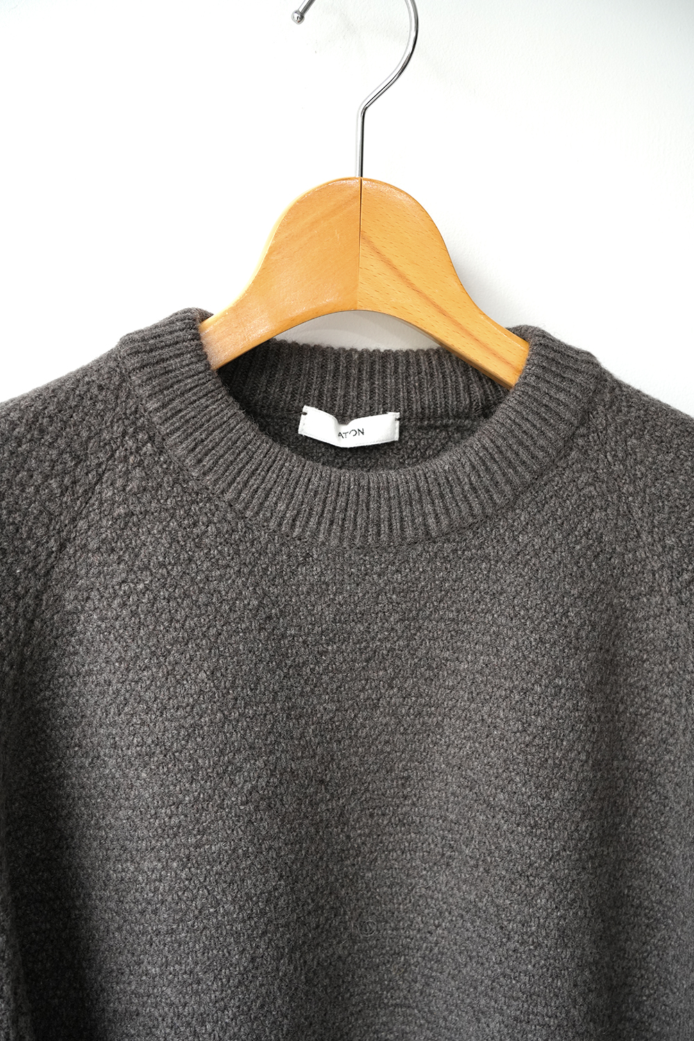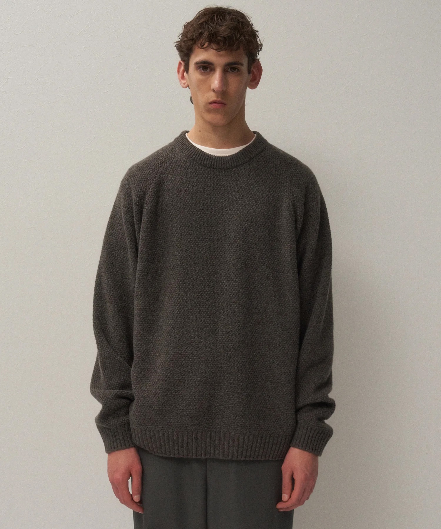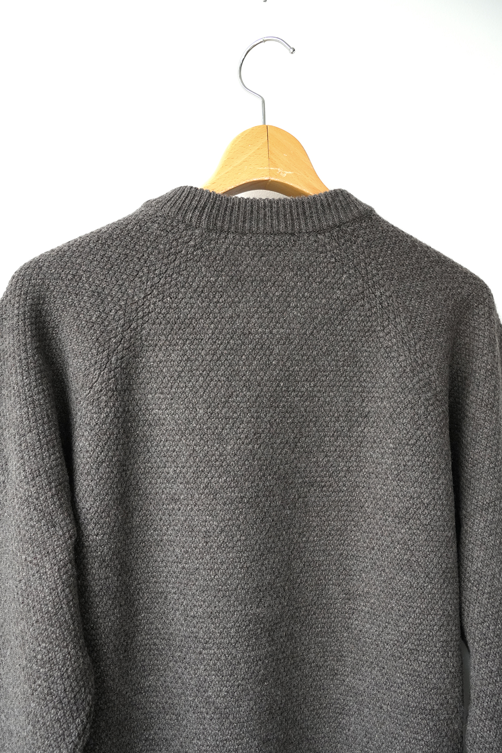 程良いリラックス感が特徴のラグランスリーブのクルーネックセーター。7ゲージを採用し、適正度目で膨らみある着心地に仕上げました。表情ある鹿の子組織が特徴です。衿は、リブダブル付けを採用しています。裾のリブが締まりすぎておらず、カットソーのようなシルエットを採用しています。オーストラリア産の、光沢がありソフトで軽く、嵩高性に富んでいるラムウールを原料とした糸を強撚にしたニット素材です。原料の特性と編地の表情感がマッチした、非常に軽く、ソフトでスポンジッシュな素材です。