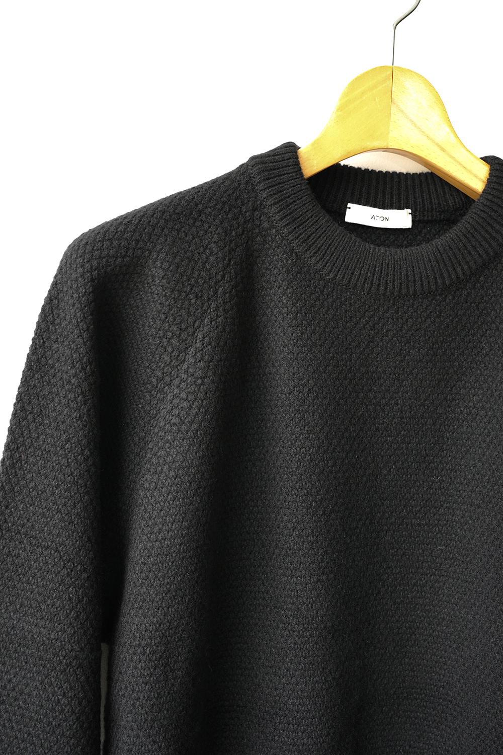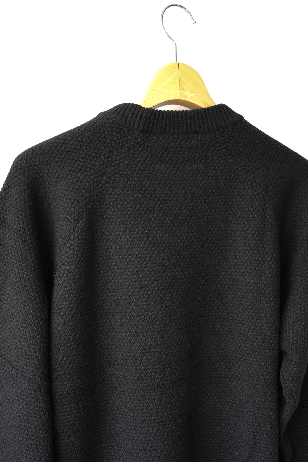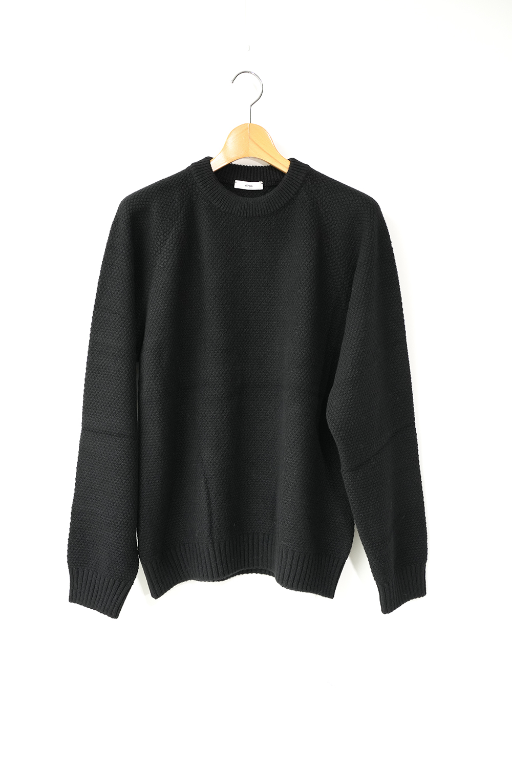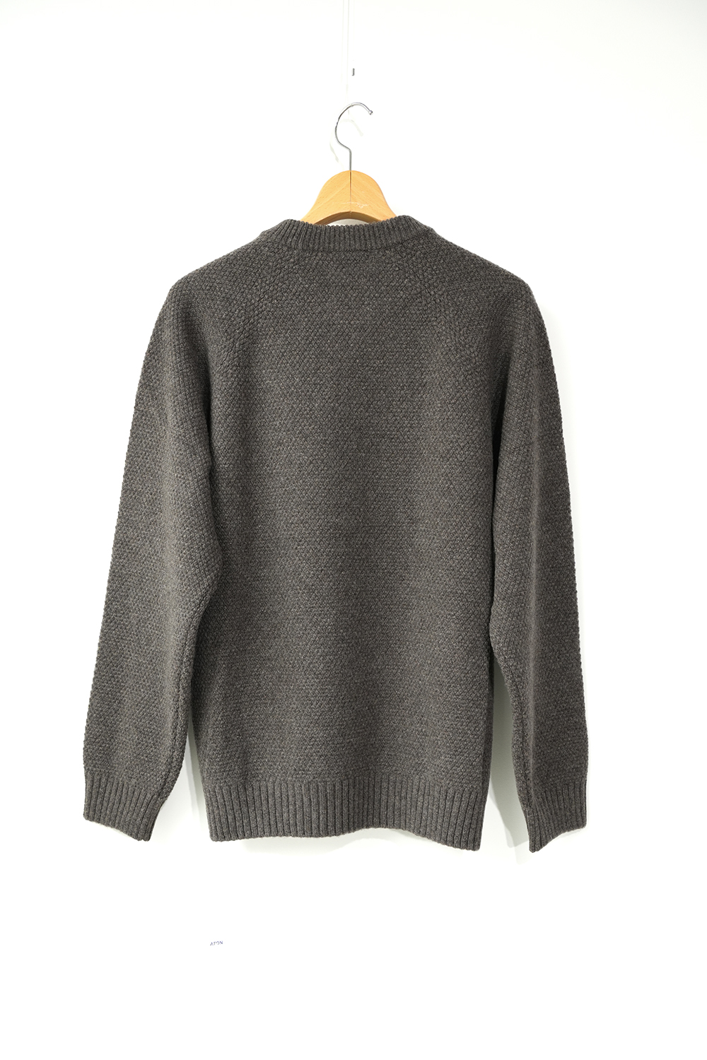程良いリラックス感が特徴のラグランスリーブのクルーネックセーター。7ゲージを採用し、適正度目で膨らみある着心地に仕上げました。表情ある鹿の子組織が特徴です。衿は、リブダブル付けを採用しています。裾のリブが締まりすぎておらず、カットソーのようなシルエットを採用しています。オーストラリア産の、光沢がありソフトで軽く、嵩高性に富んでいるラムウールを原料とした糸を強撚にしたニット素材です。原料の特性と編地の表情感がマッチした、非常に軽く、ソフトでスポンジッシュな素材です。