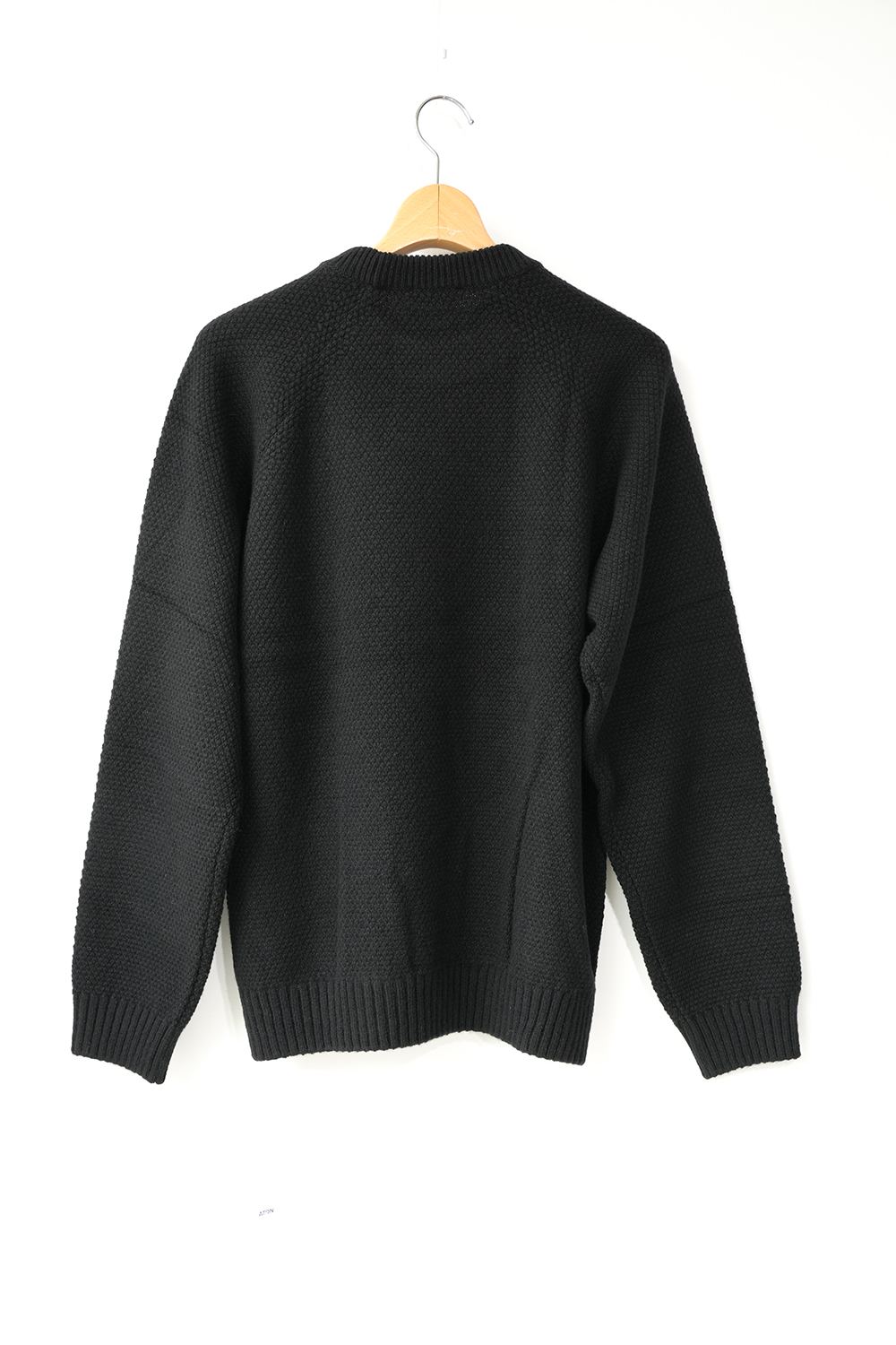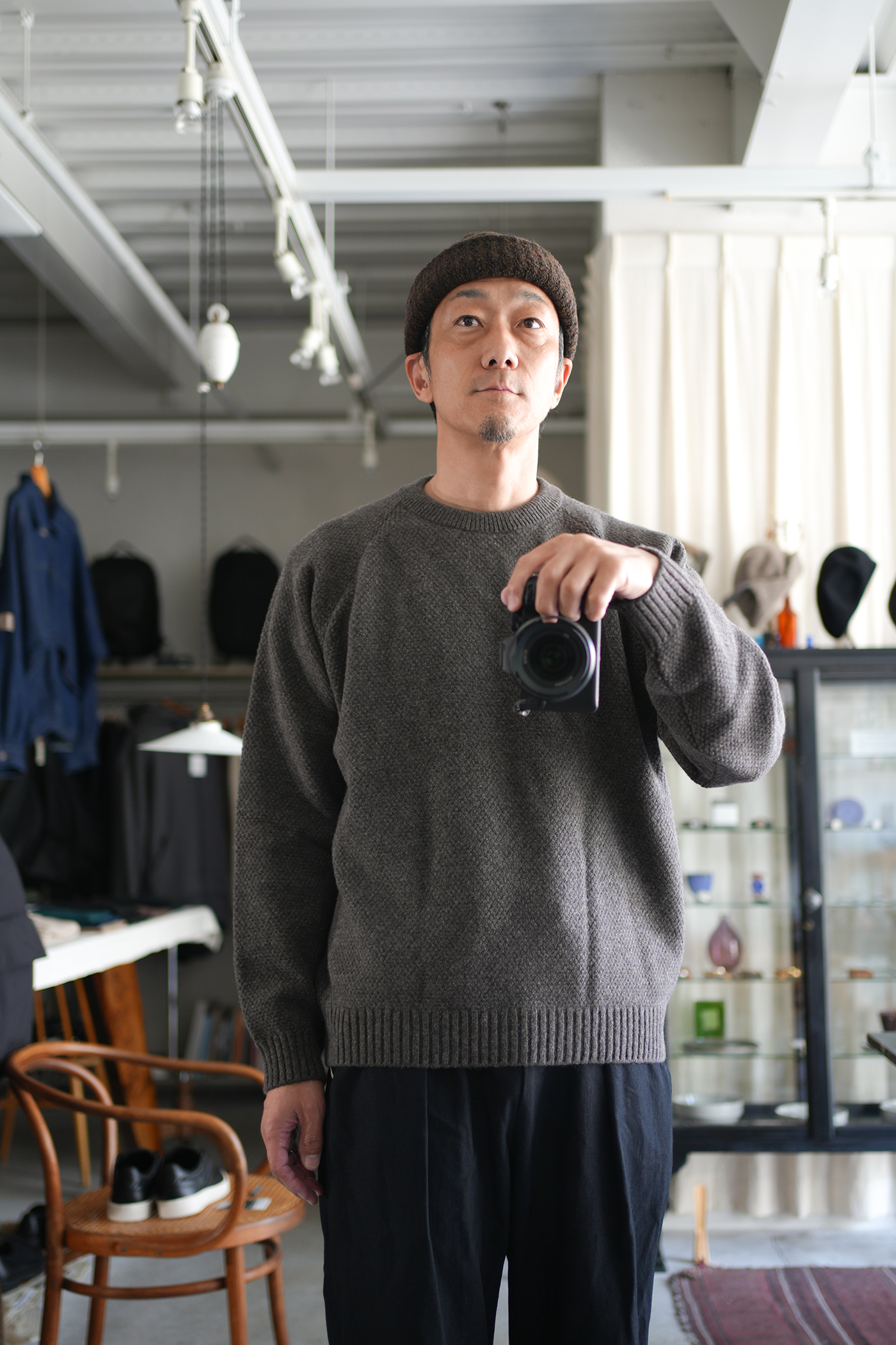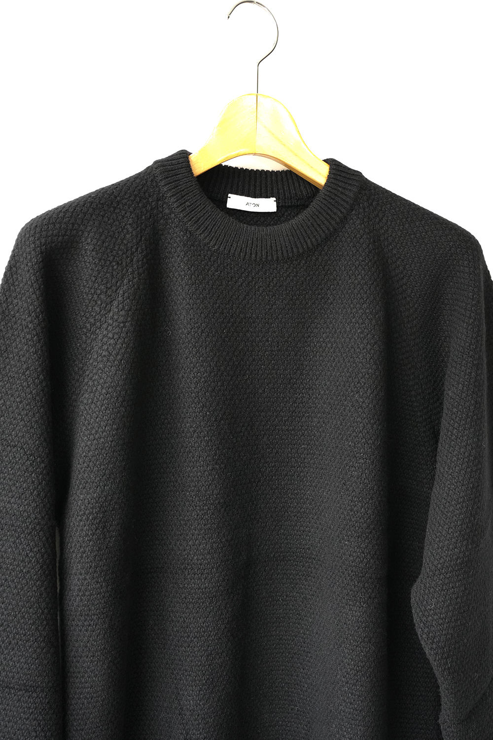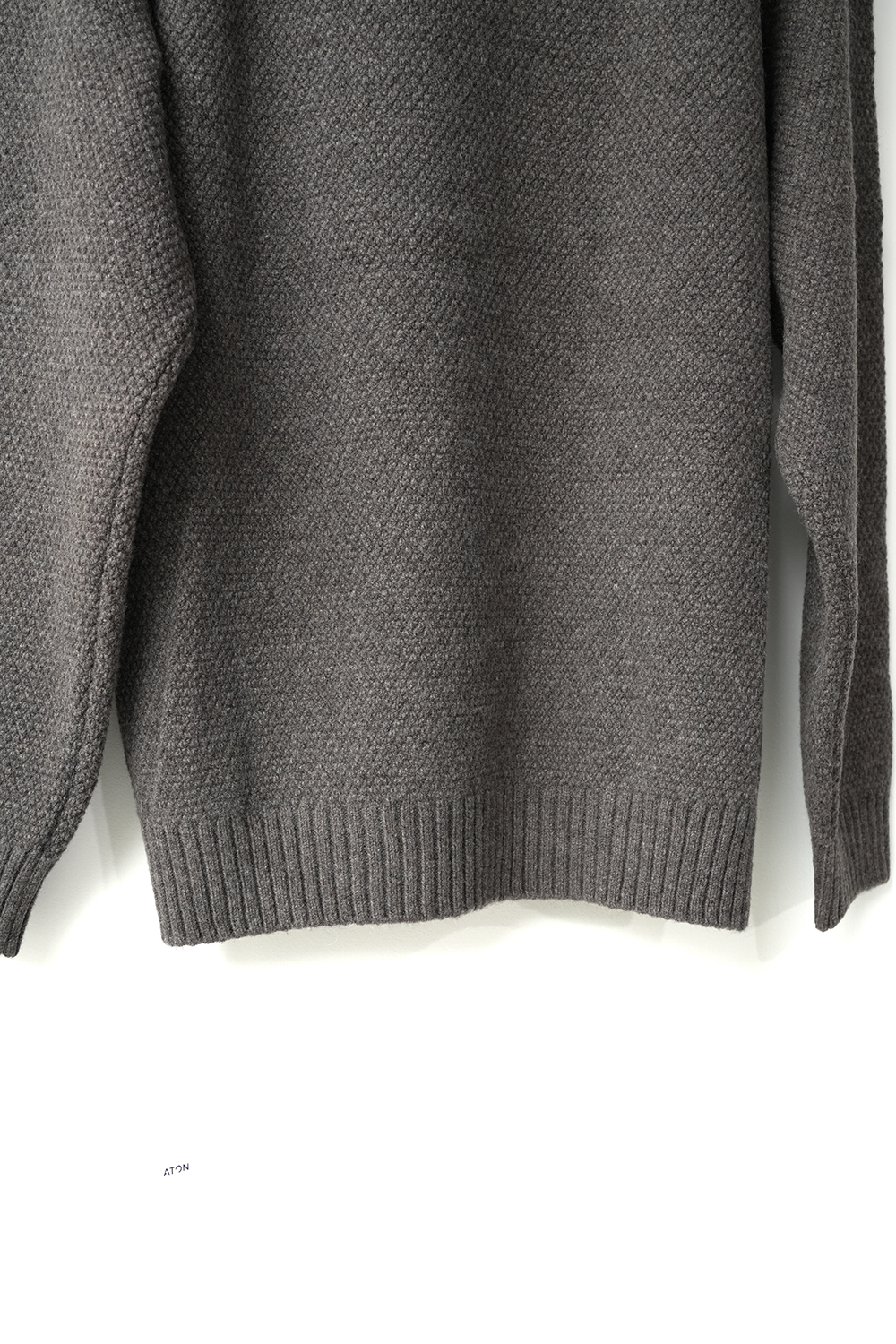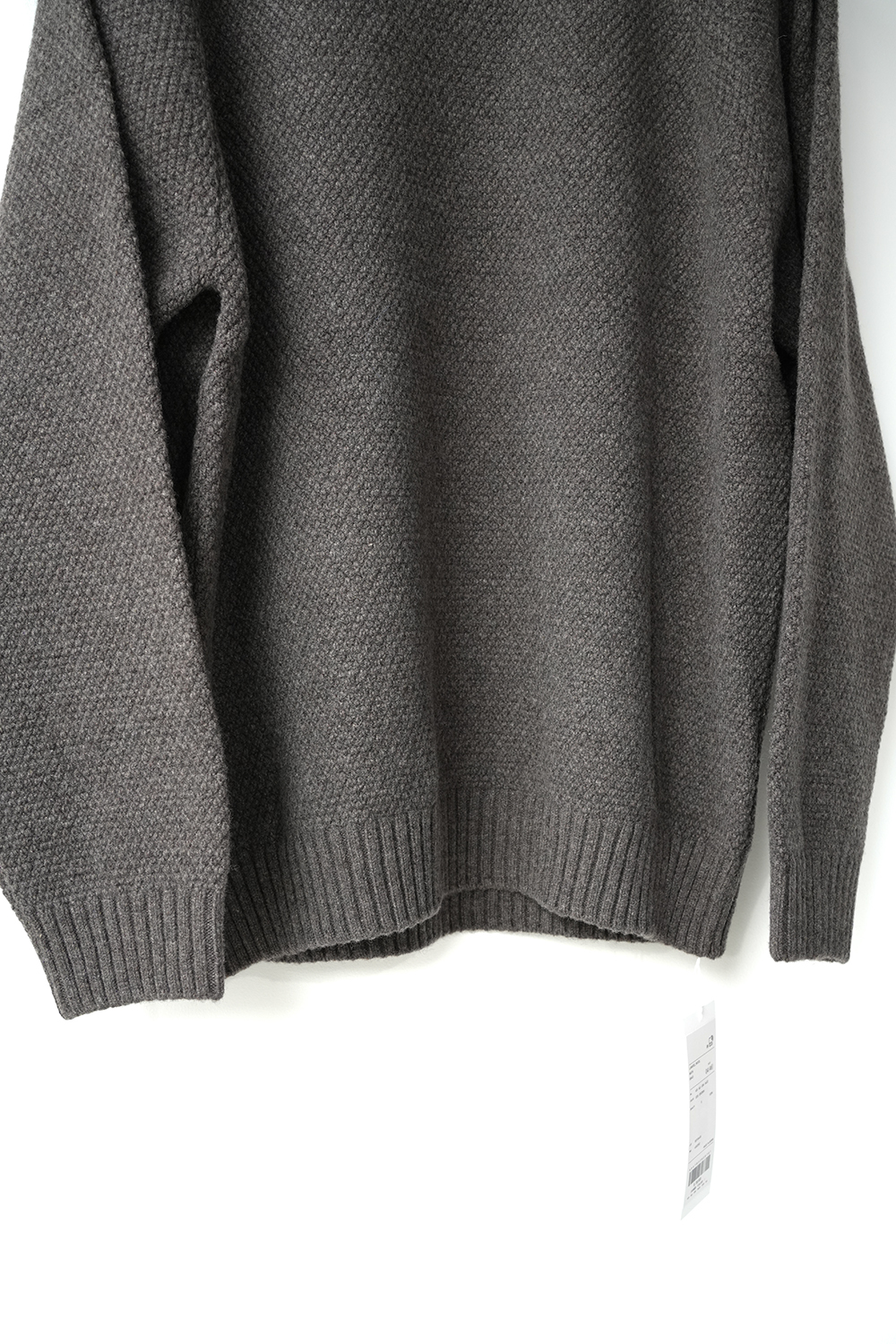 程良いリラックス感が特徴のラグランスリーブのクルーネックセーター。7ゲージを採用し、適正度目で膨らみある着心地に仕上げました。表情ある鹿の子組織が特徴です。衿は、リブダブル付けを採用しています。裾のリブが締まりすぎておらず、カットソーのようなシルエットを採用しています。オーストラリア産の、光沢がありソフトで軽く、嵩高性に富んでいるラムウールを原料とした糸を強撚にしたニット素材です。原料の特性と編地の表情感がマッチした、非常に軽く、ソフトでスポンジッシュな素材です。