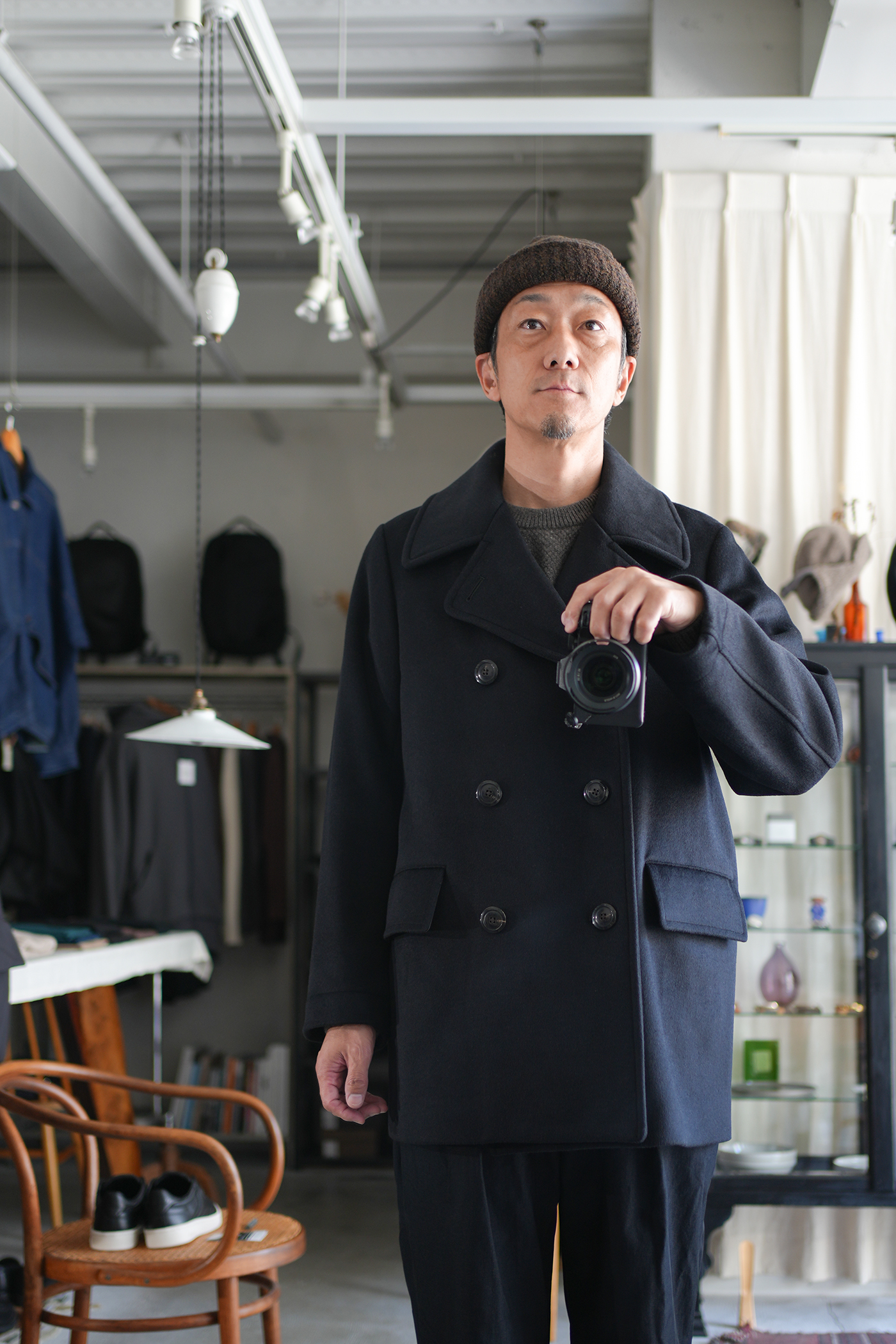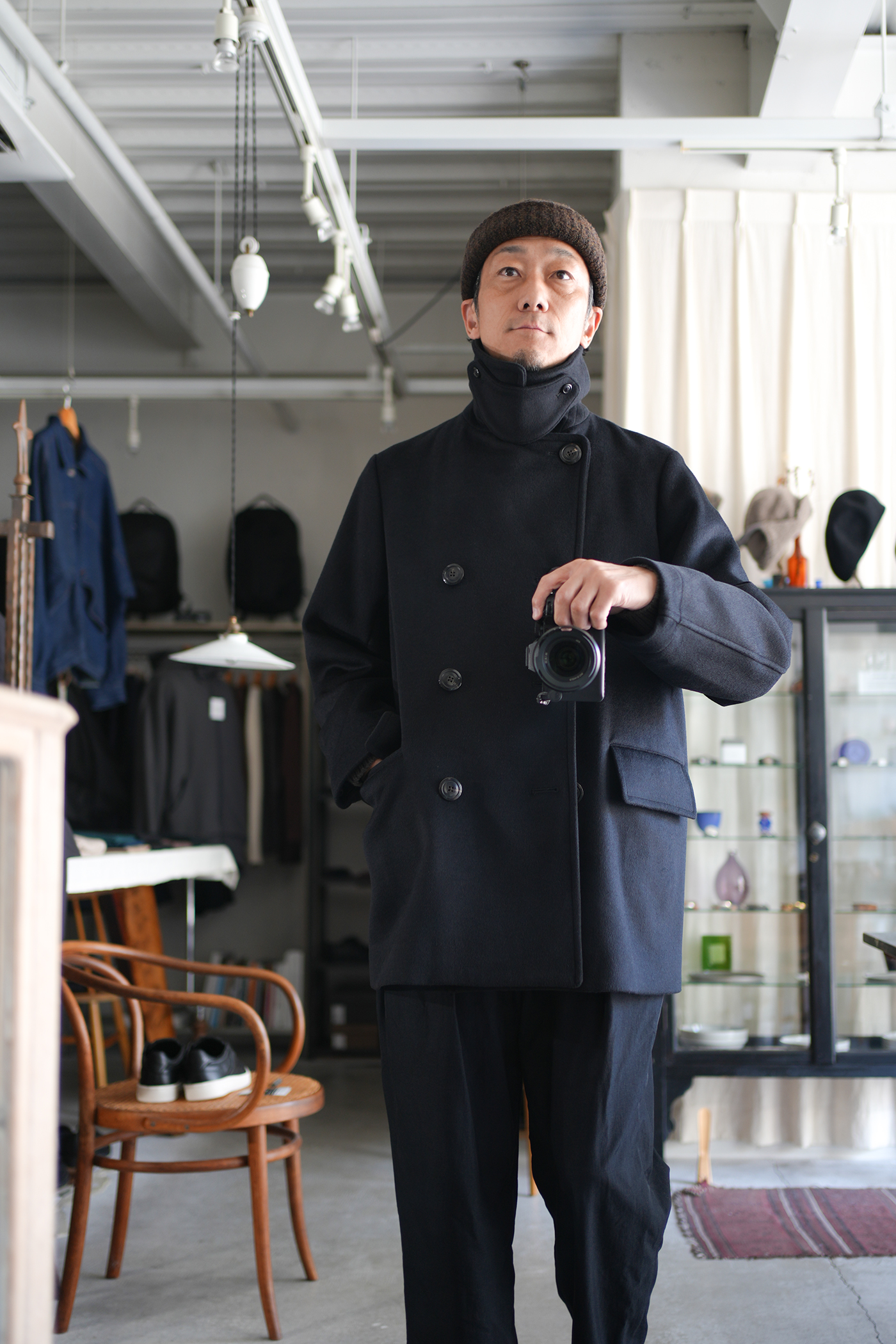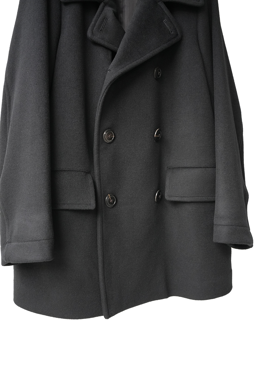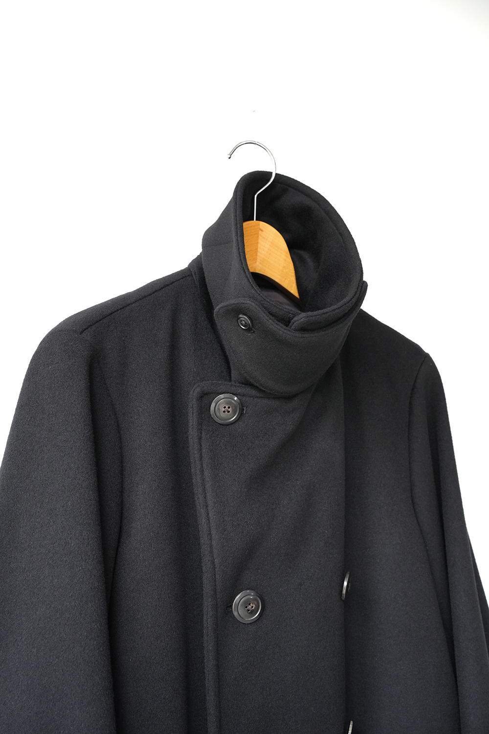 素材の良さを重視し、シンプルに作り上げた「Bridge Coat」。大ぶりな襟に合わせた大きめの本水牛ボタンを採用し、ゆったりとしたシルエットに映えるディテールを施しています。肩幅はレギュラーフィットに設定しつつ、身幅を広くとることでリラックス感と端正な印象を両立。見返し裏のチンストラップで襟を立てた着こなしも可能です。総裏にはキュプラサテンを用い、防寒性を高めるとともに快適な着心地を実現。襟には芯地を入れることで強度と立ち上がりの美しさを確保しています。上質な素材の魅力を存分に味わえる、シンプルかつ洗練されたコート。ゆったりとしたシルエットながらも端正な雰囲気を保ち、オン・オフを問わず活躍します。襟を立てたスタイルやフロントを開けた着こなしなど、シーンに合わせて表情を変えられるのも魅力。防寒性とデザイン性を兼ね備えた、永く愛用できる一着です。ウール・シルク・カシミヤの三種を絶妙に組み合わせ、繊細な起毛を施したビーバー生地。光を受けるたび、上品な艶が浮かび上がり、指先に伝わるしっとりとしたヌメリ感は、厳選された高級原料の証です。着る人の存在感を引き立て、長く愛される一着へと仕上がります。肌触りなめらか、着心地軽やか、ふんわりと一度袖を通して体験していただきたい暖かく素晴らしい素材です。