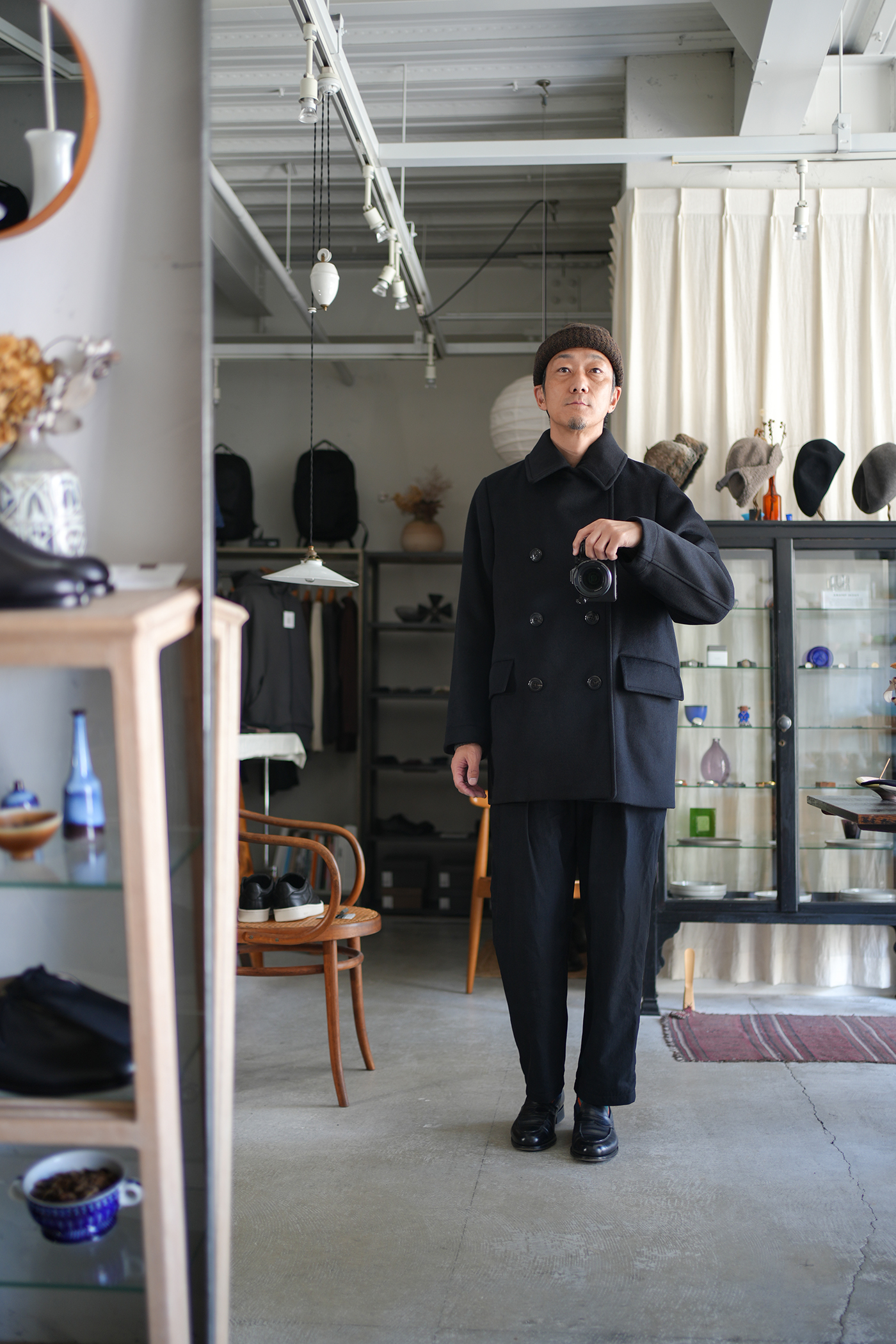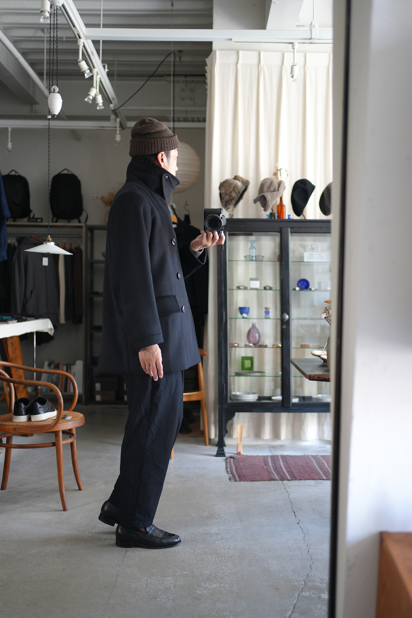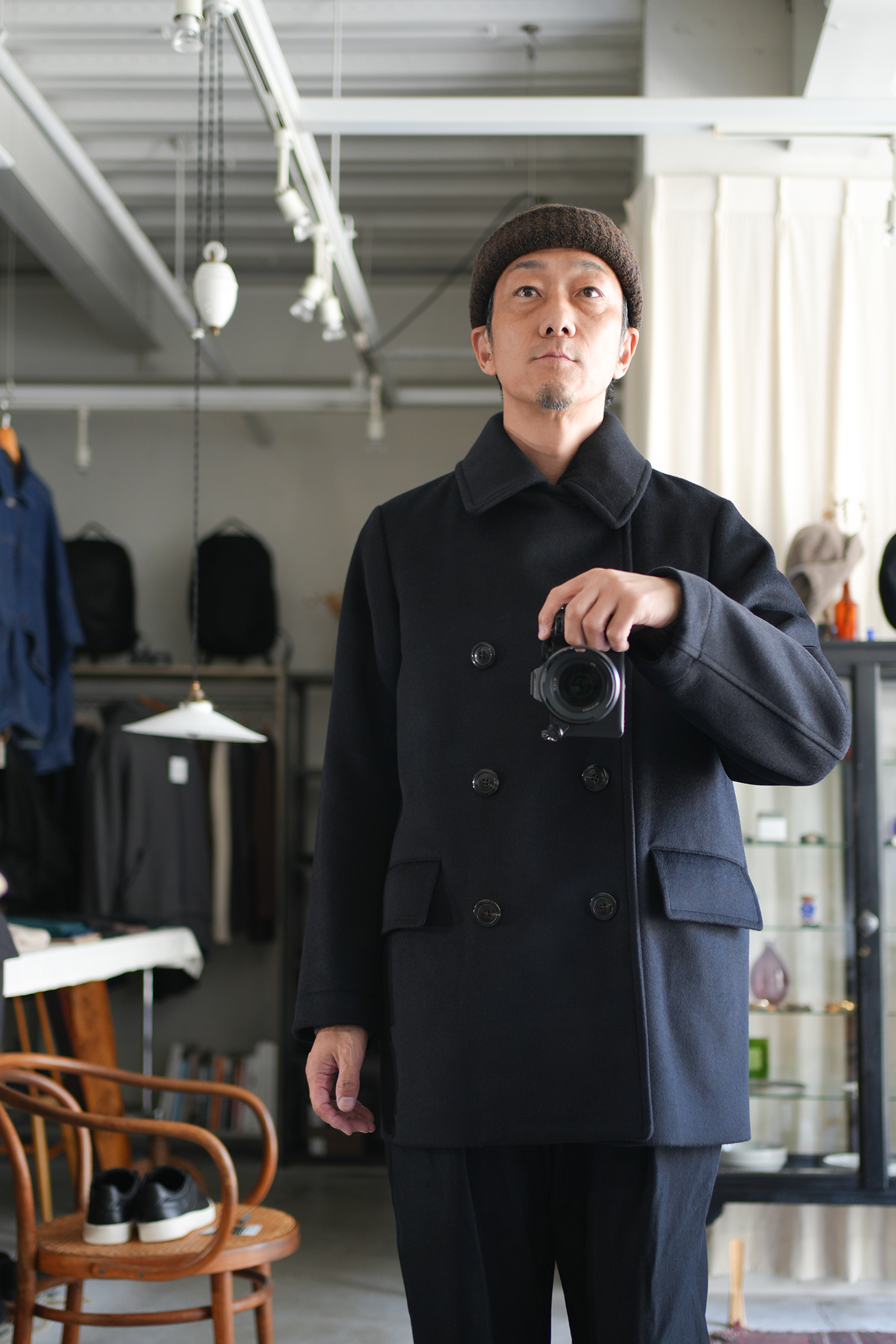 素材の良さを重視し、シンプルに作り上げた「Bridge Coat」。大ぶりな襟に合わせた大きめの本水牛ボタンを採用し、ゆったりとしたシルエットに映えるディテールを施しています。肩幅はレギュラーフィットに設定しつつ、身幅を広くとることでリラックス感と端正な印象を両立。見返し裏のチンストラップで襟を立てた着こなしも可能です。総裏にはキュプラサテンを用い、防寒性を高めるとともに快適な着心地を実現。襟には芯地を入れることで強度と立ち上がりの美しさを確保しています。上質な素材の魅力を存分に味わえる、シンプルかつ洗練されたコート。ゆったりとしたシルエットながらも端正な雰囲気を保ち、オン・オフを問わず活躍します。襟を立てたスタイルやフロントを開けた着こなしなど、シーンに合わせて表情を変えられるのも魅力。防寒性とデザイン性を兼ね備えた、永く愛用できる一着です。ウール・シルク・カシミヤの三種を絶妙に組み合わせ、繊細な起毛を施したビーバー生地。光を受けるたび、上品な艶が浮かび上がり、指先に伝わるしっとりとしたヌメリ感は、厳選された高級原料の証です。着る人の存在感を引き立て、長く愛される一着へと仕上がります。肌触りなめらか、着心地軽やか、ふんわりと一度袖を通して体験していただきたい暖かく素晴らしい素材です。