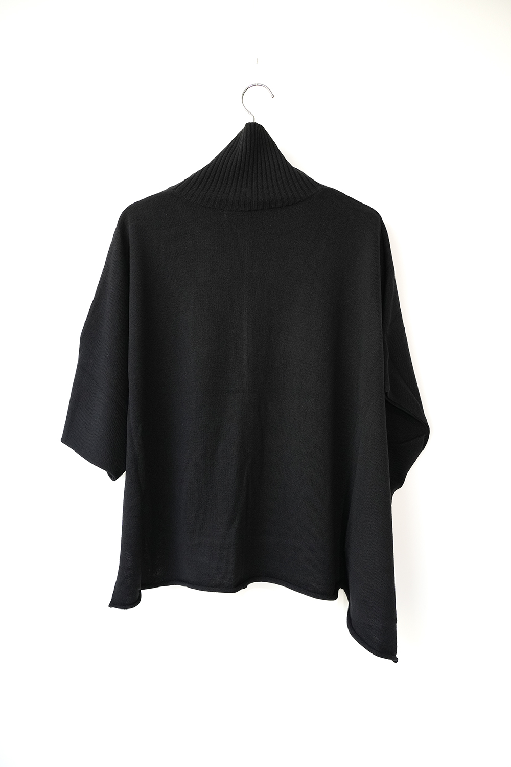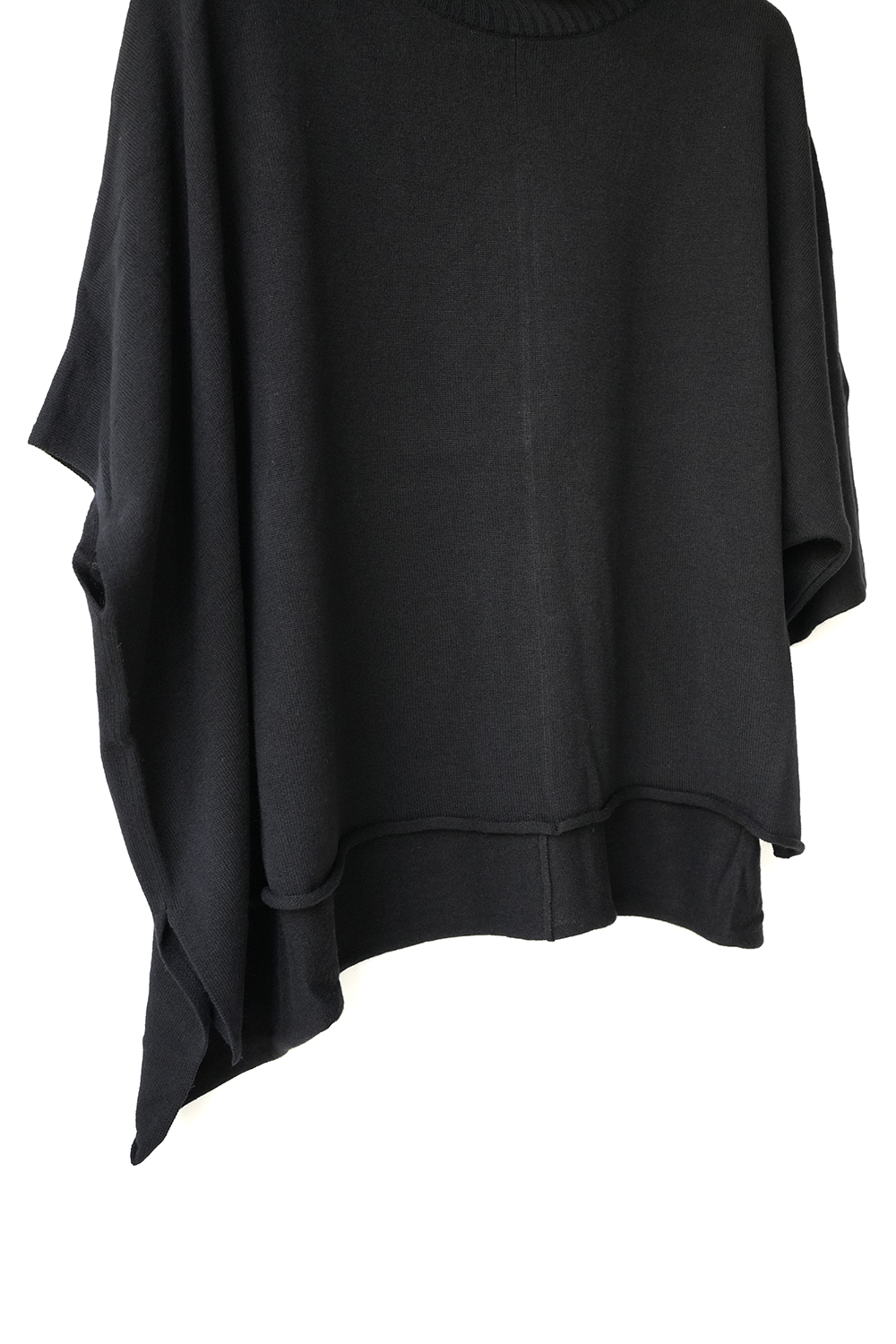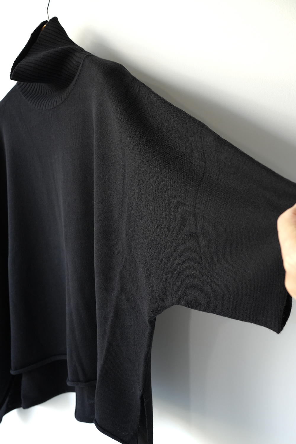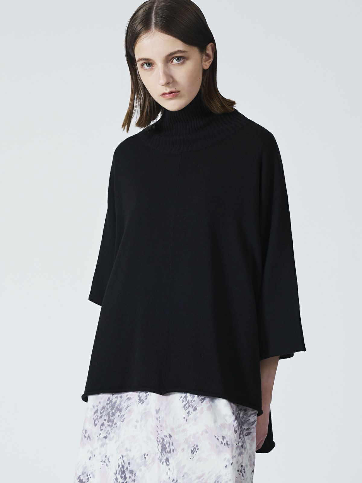 ポンチョライクなハイネックプルオーバー。左右の袖デザインの違いでモード感ある表情が生まれます。