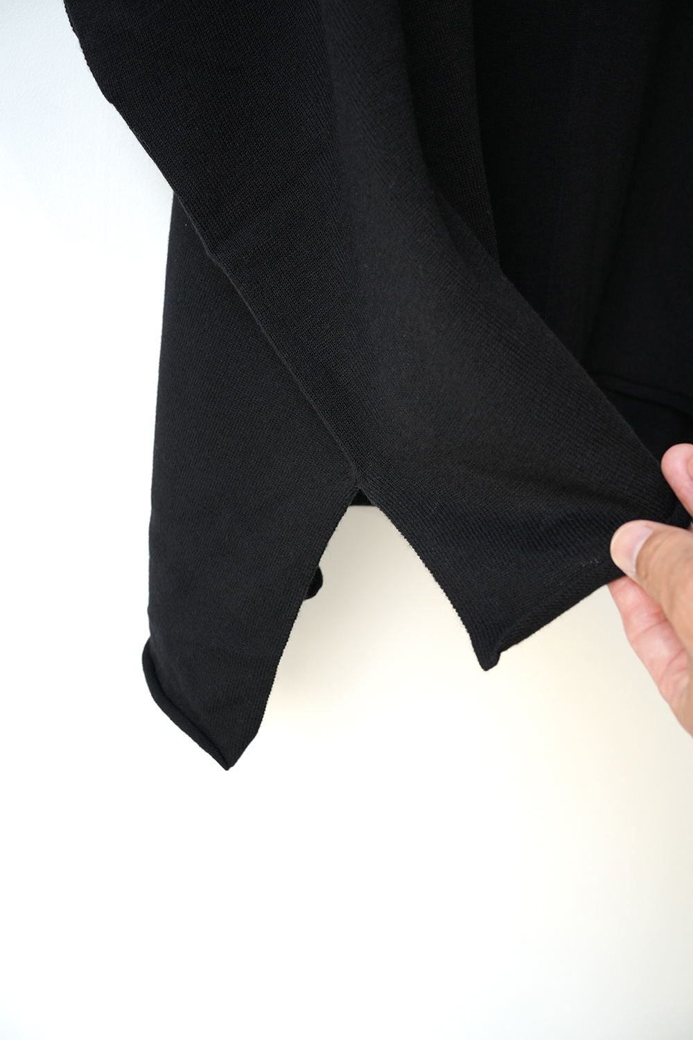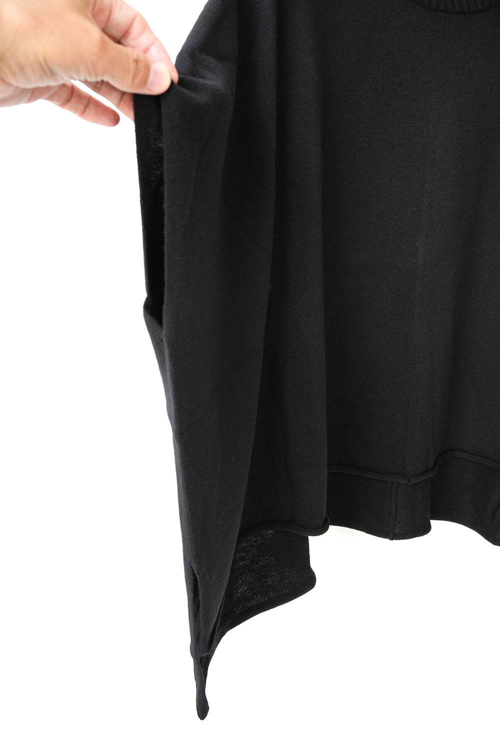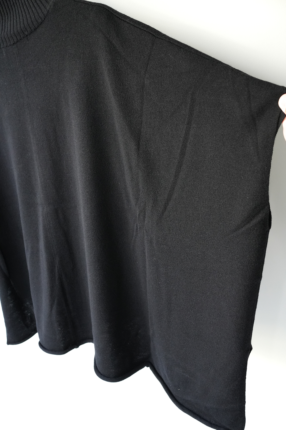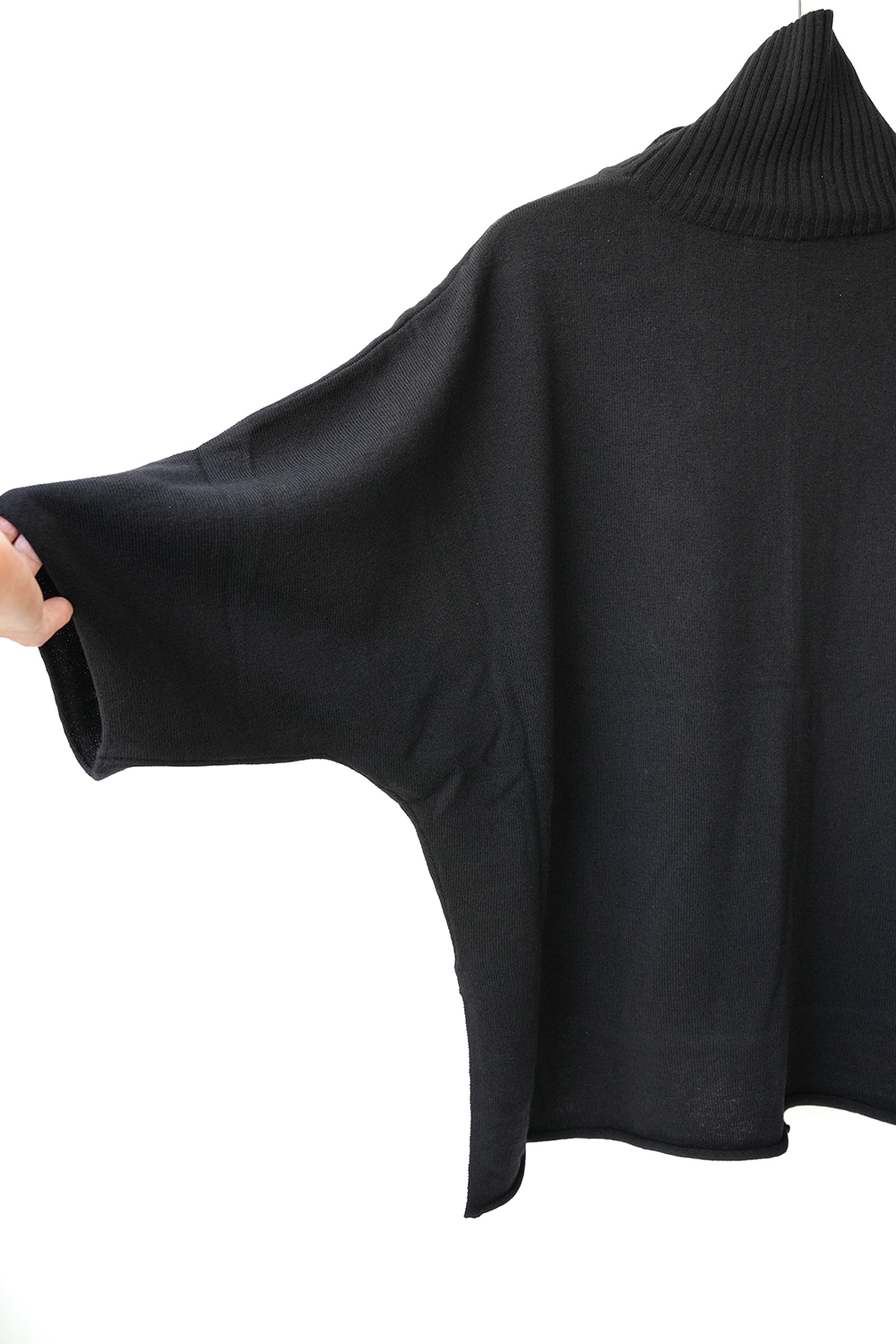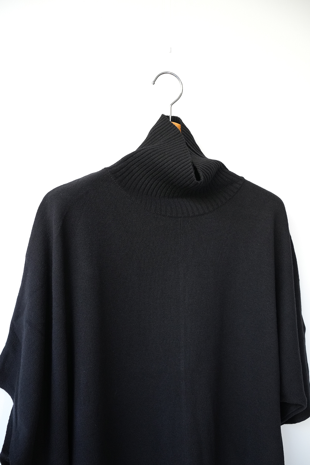 ポンチョライクなハイネックプルオーバー。左右の袖デザインの違いでモード感ある表情が生まれます。