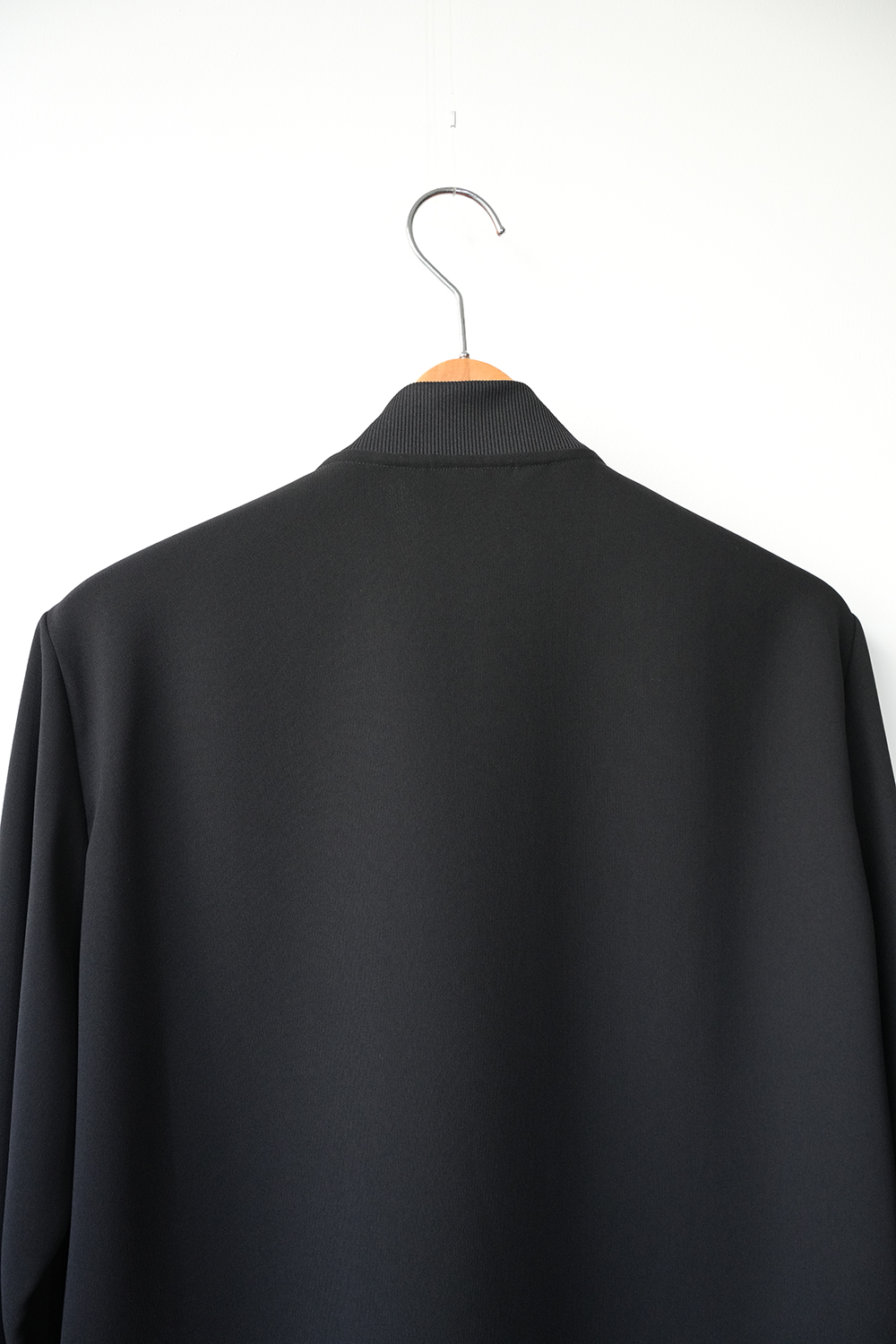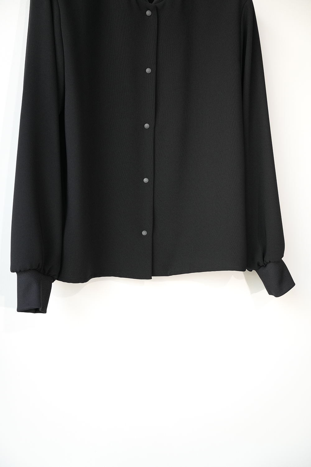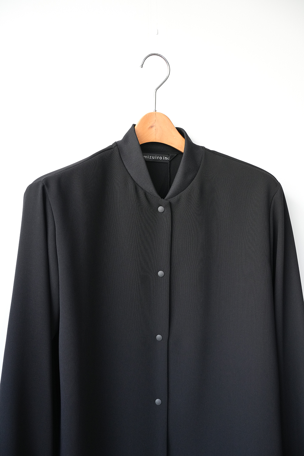 スタジアムジャンパーをベースに、カーディガンのように気軽に羽織れるデザインのブルゾンライクなシャツです。ほどよくゆとりのあるサイズ感でありながら、シルエットはすっきりと整えられ、モードな印象を引き立てます。カジュアルな要素を取り入れつつも、上品で落ち着いた雰囲気を纏う一着です。フロントはスナップボタン仕様で、開け閉めがしやすく、軽やかな印象に。トップスインもしやすい丈感で、シャツとしてはもちろん、羽織りとしてもコーディネートの幅が広がります。素材には、ふくらみと程よいハリ感を併せ持つダブルクロスを使用。しなやかで上品な質感が特徴で、防シワ性に優れ、ストレッチ性もあるため動きやすく快適な着心地です。ほどよい落ち感があり、身体のラインを美しく見せるドレープ感も魅力。シンプルながら存在感のあるデザインで、日常のスタイリングをモダンにアップデートしてくれるアイテムです。