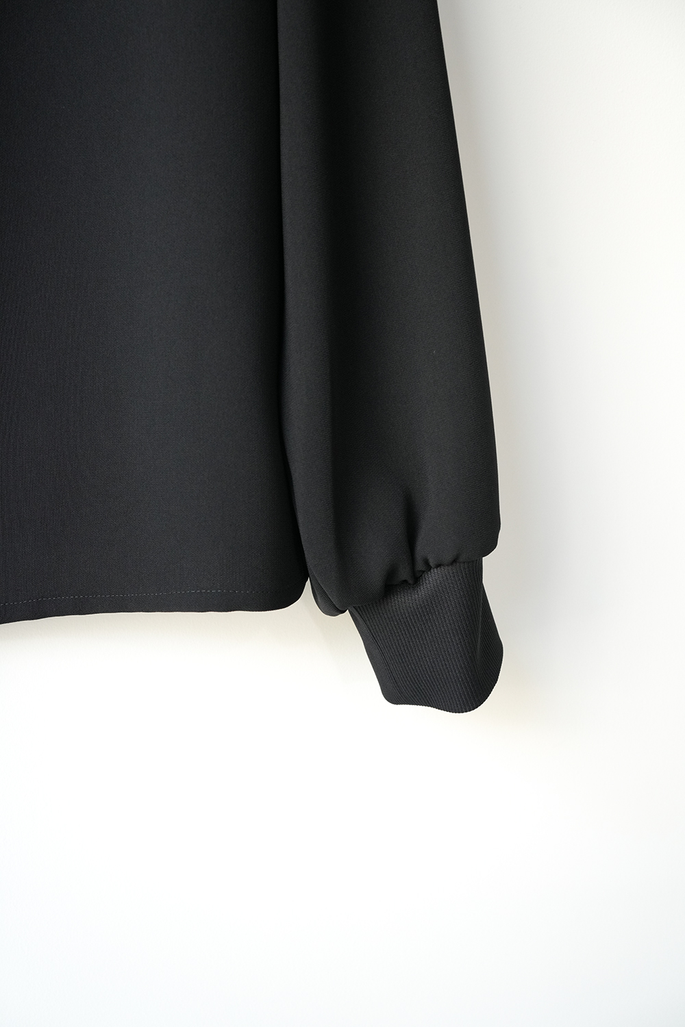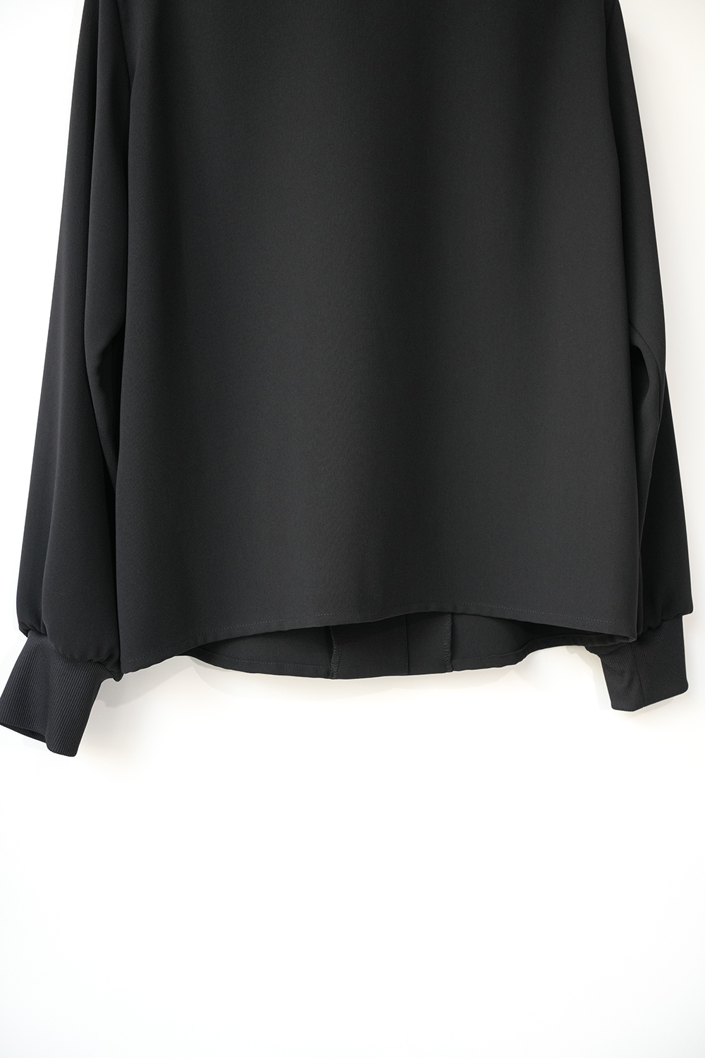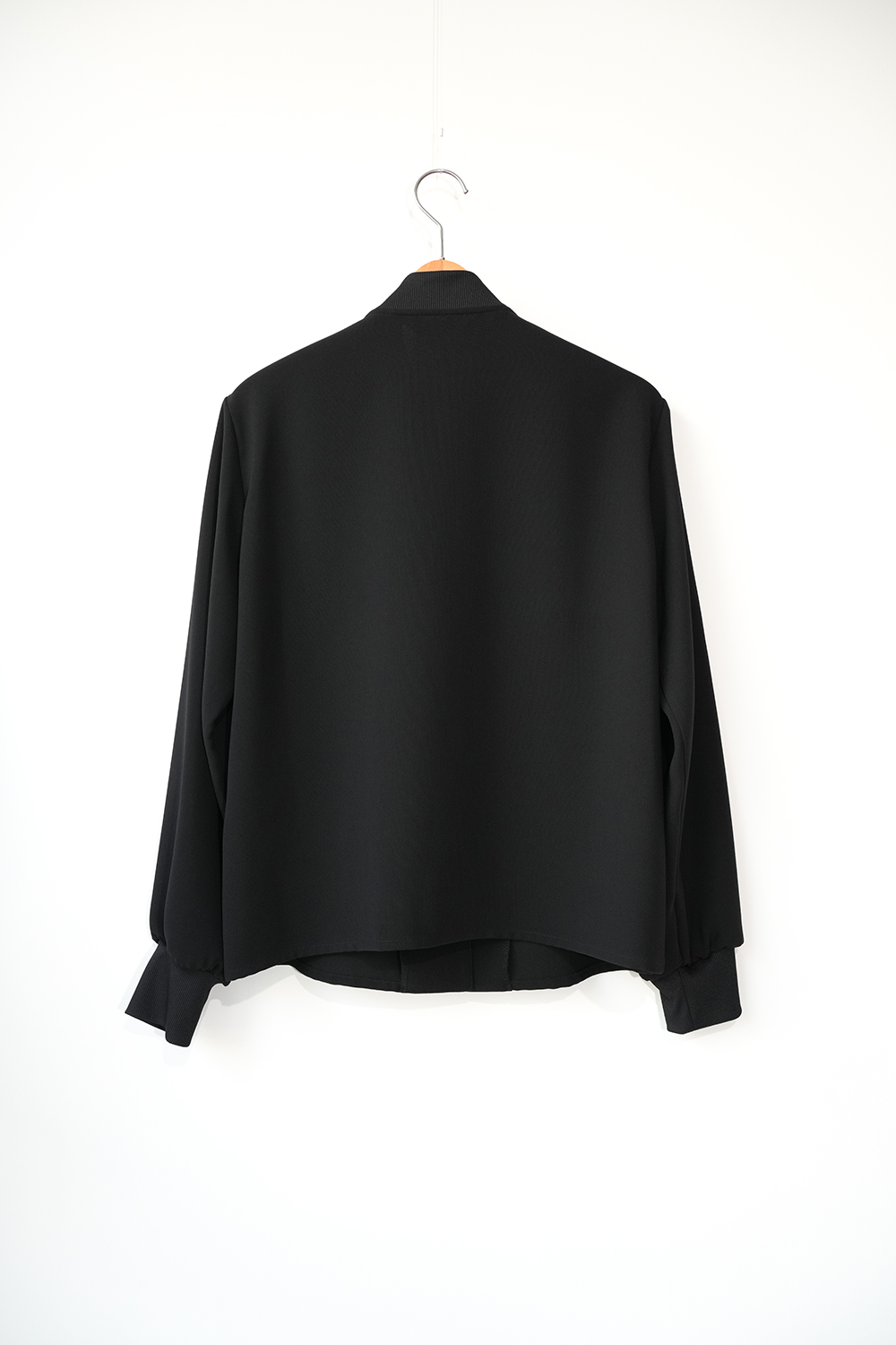 スタジアムジャンパーをベースに、カーディガンのように気軽に羽織れるデザインのブルゾンライクなシャツです。ほどよくゆとりのあるサイズ感でありながら、シルエットはすっきりと整えられ、モードな印象を引き立てます。カジュアルな要素を取り入れつつも、上品で落ち着いた雰囲気を纏う一着です。フロントはスナップボタン仕様で、開け閉めがしやすく、軽やかな印象に。トップスインもしやすい丈感で、シャツとしてはもちろん、羽織りとしてもコーディネートの幅が広がります。素材には、ふくらみと程よいハリ感を併せ持つダブルクロスを使用。しなやかで上品な質感が特徴で、防シワ性に優れ、ストレッチ性もあるため動きやすく快適な着心地です。ほどよい落ち感があり、身体のラインを美しく見せるドレープ感も魅力。シンプルながら存在感のあるデザインで、日常のスタイリングをモダンにアップデートしてくれるアイテムです。
