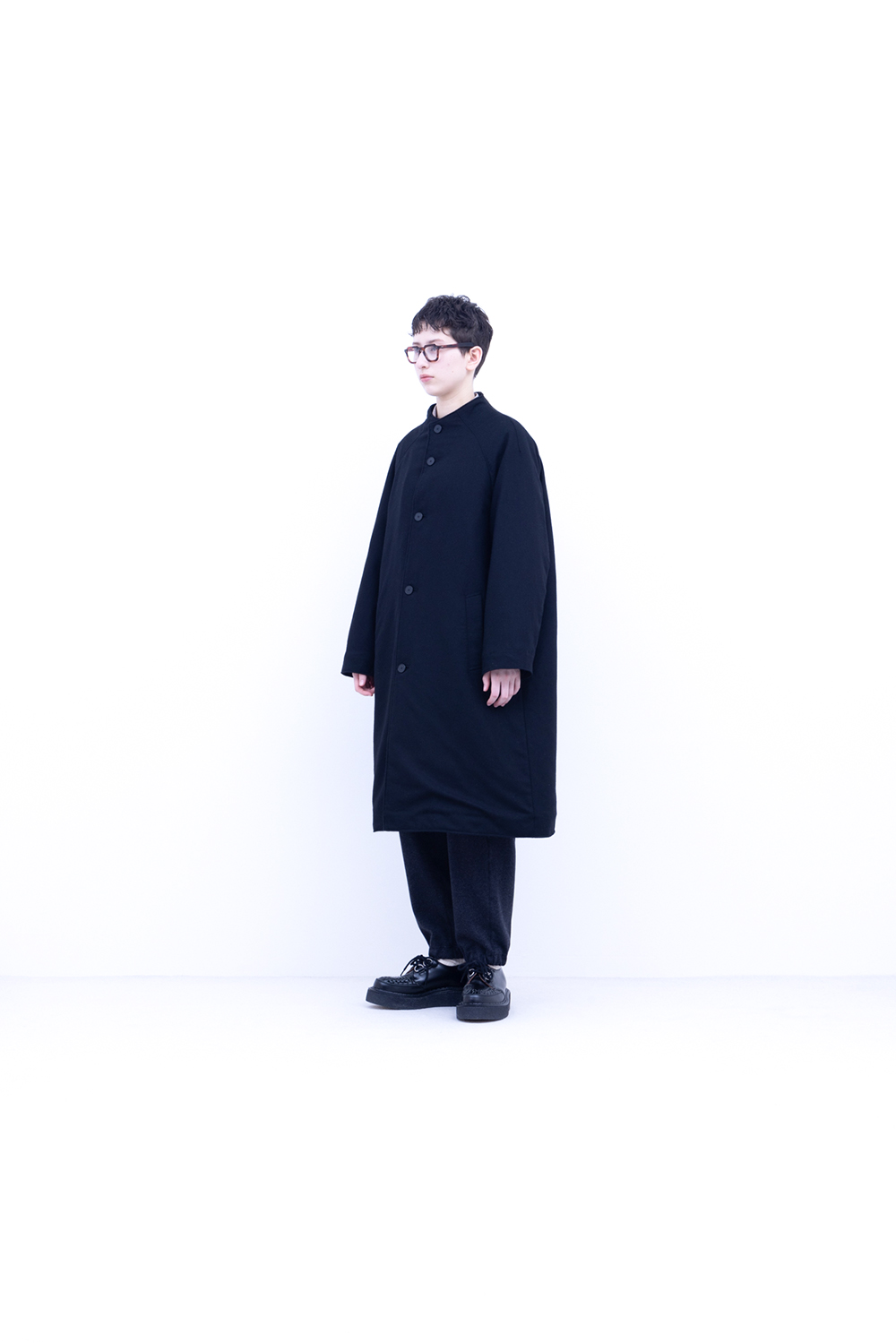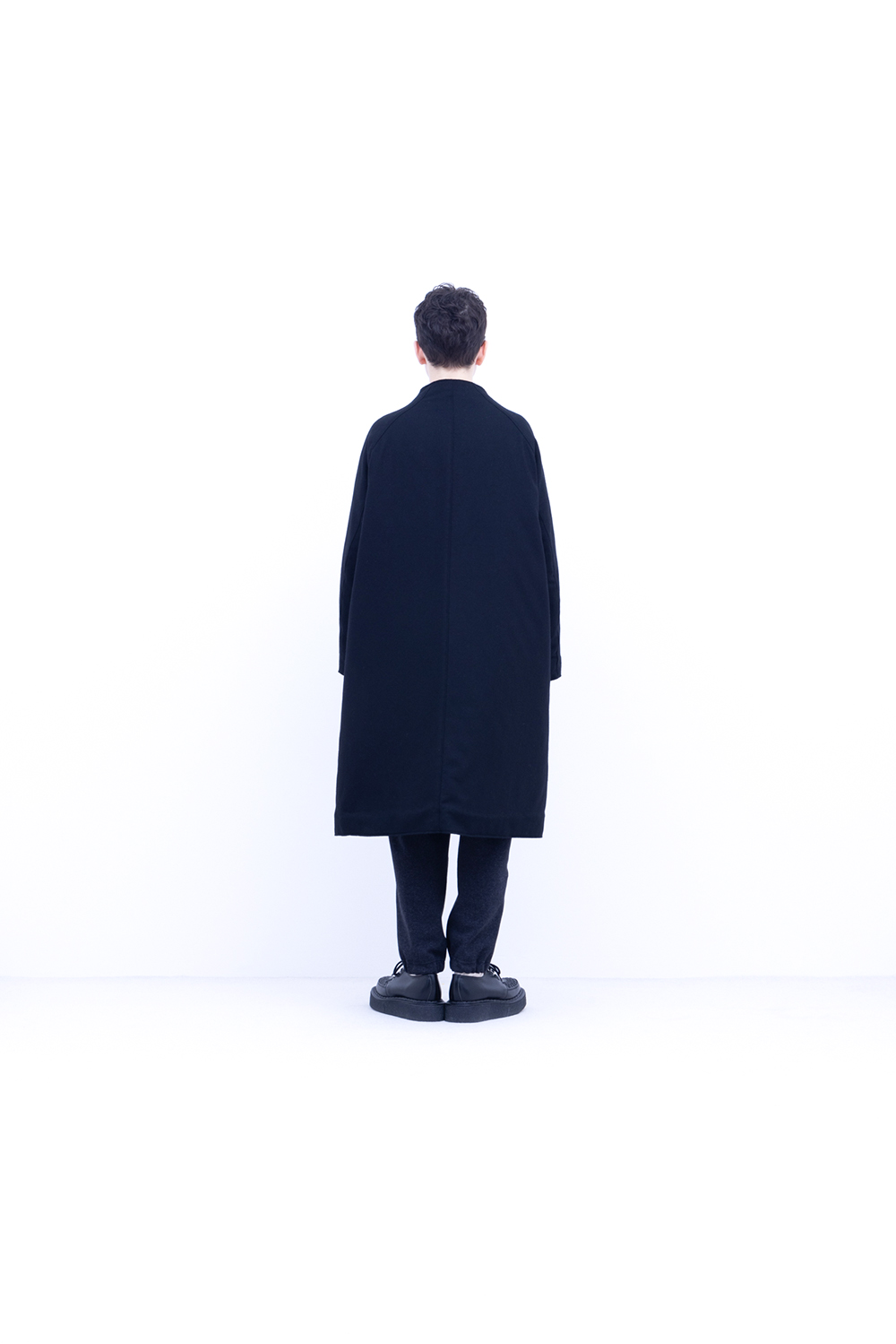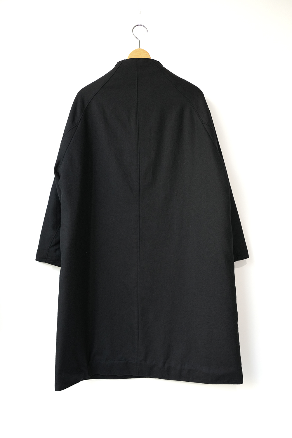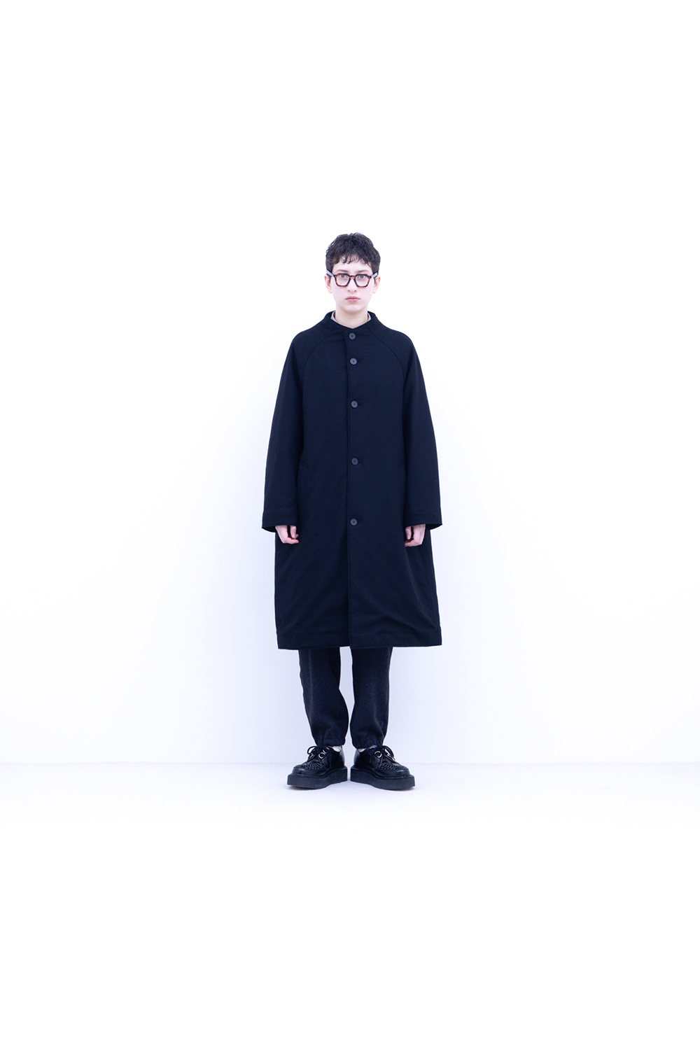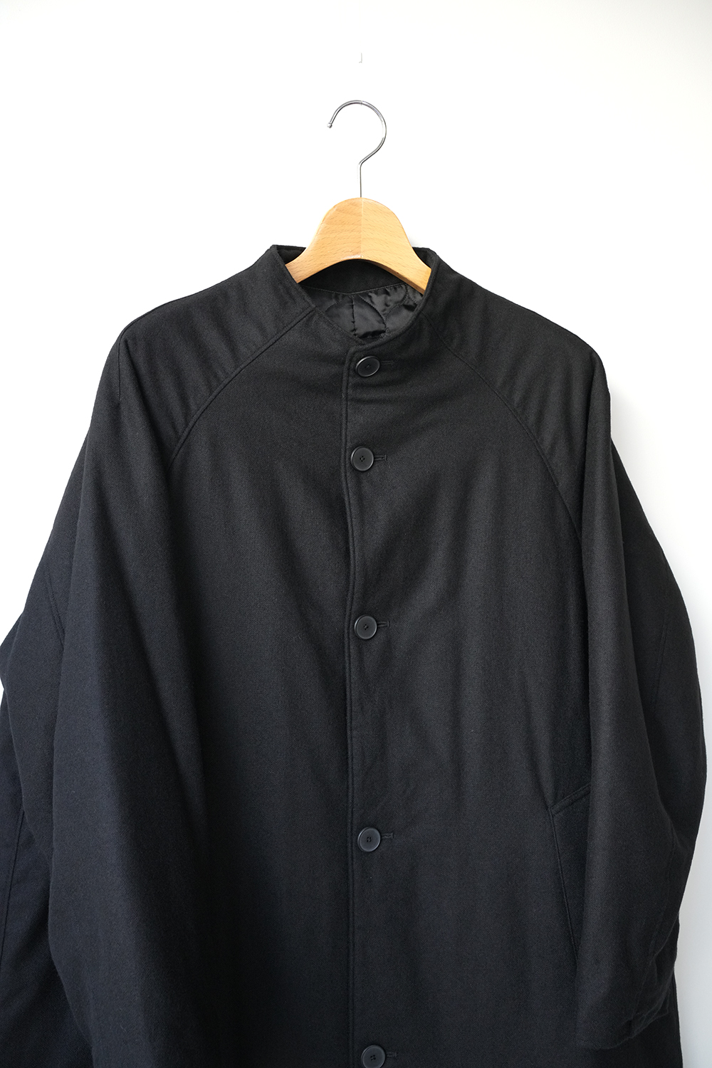 綿のシーチングの様なイメージで織られたウールの平織生地、ざっくりと織り上げた風合いが特徴。ボトルネック、ラグランスリーブ。内側はキルティング仕様の総裏で、中綿に三菱ケミカルコアブリットを使用、軽くて暖かいコートに仕上がっております。