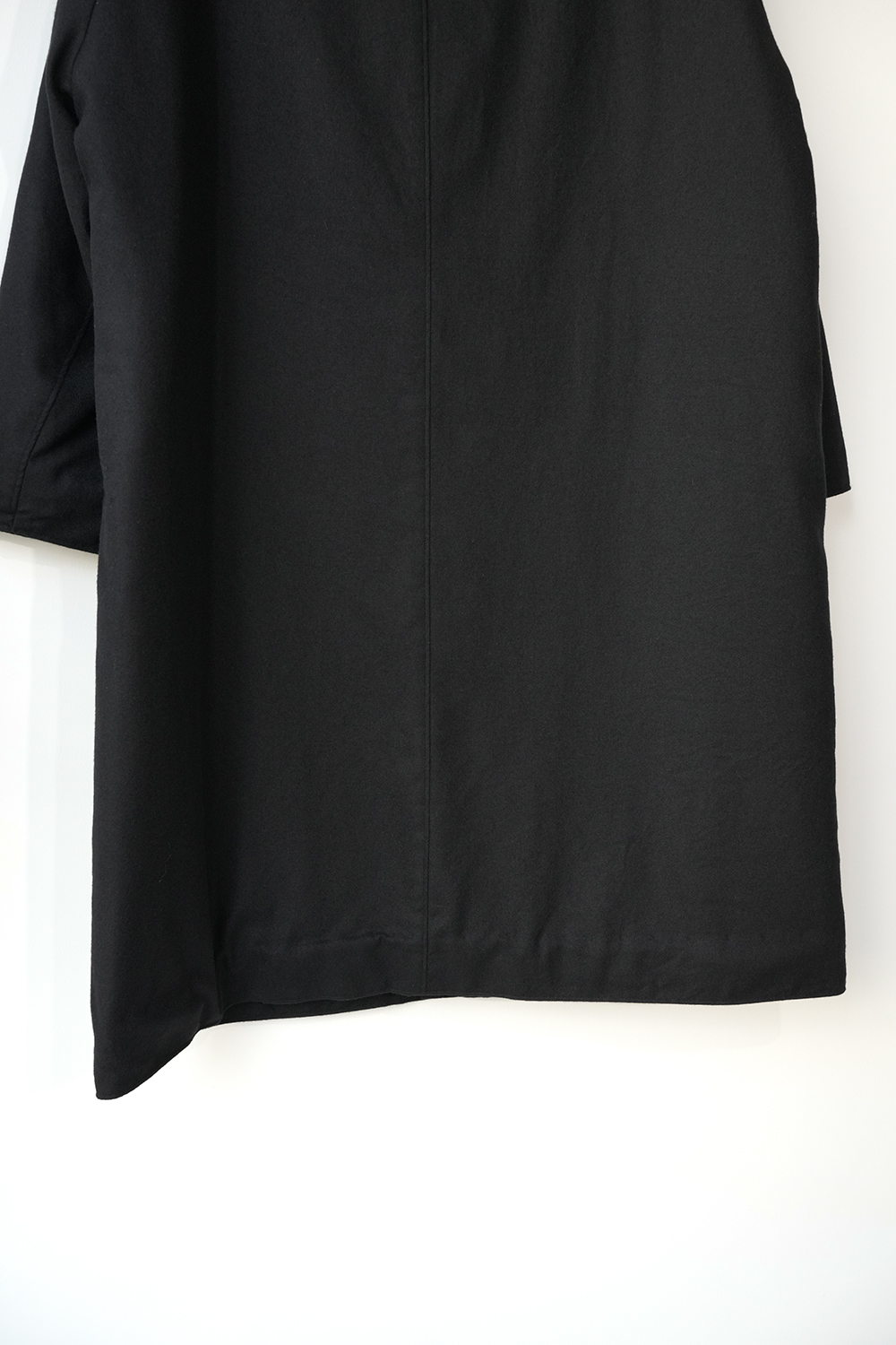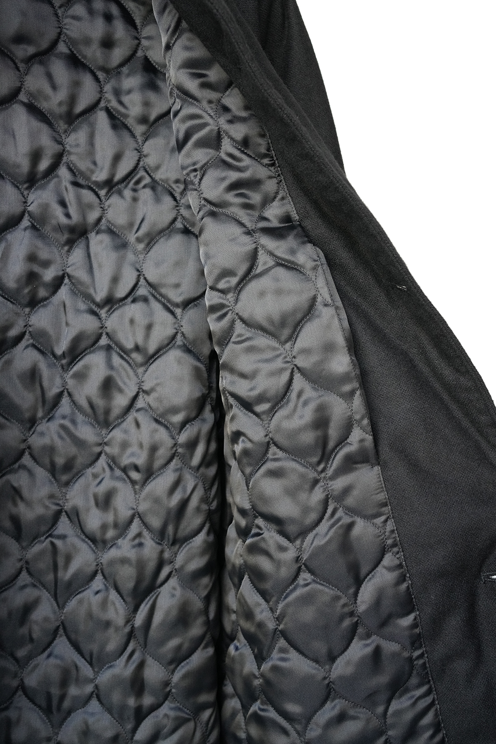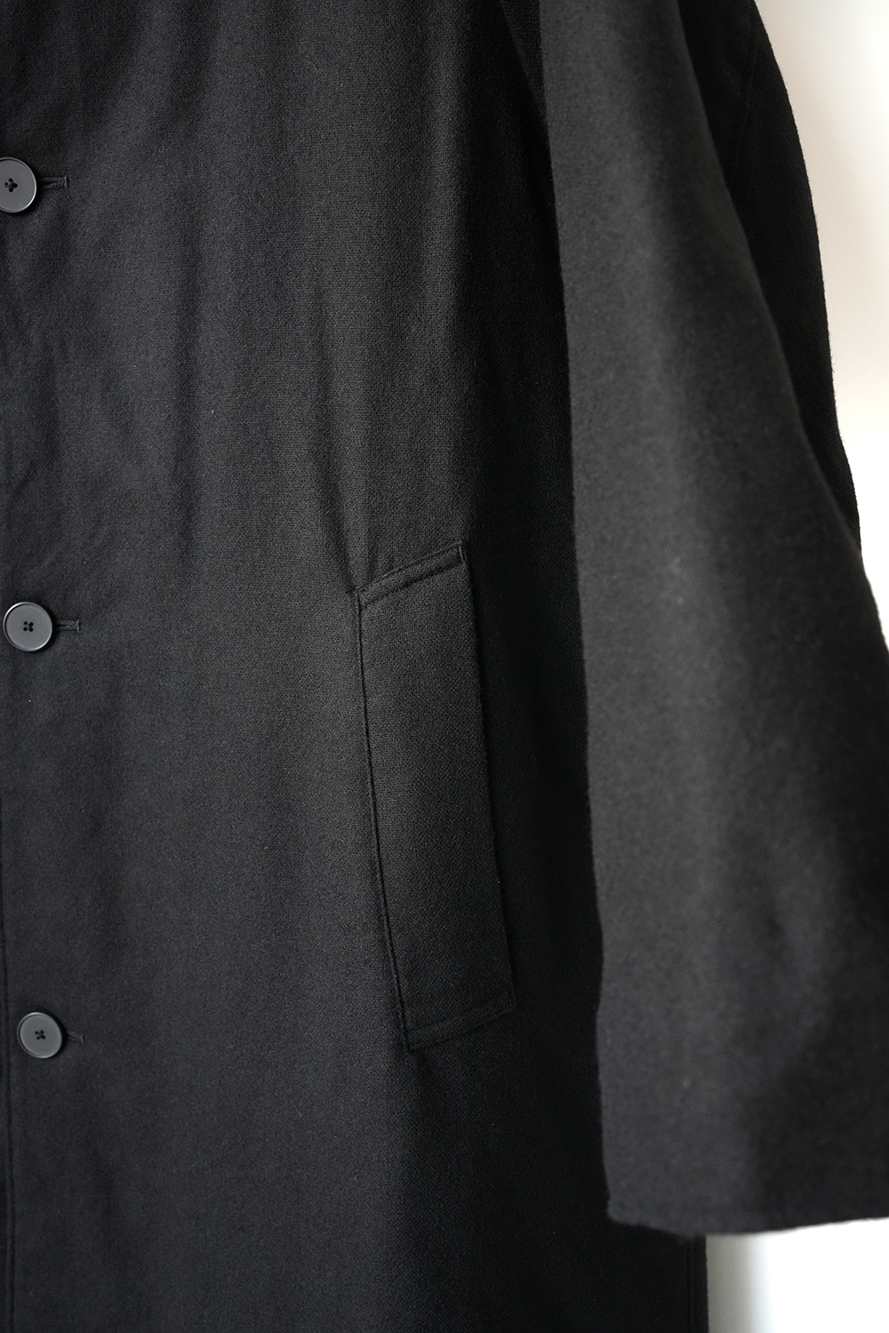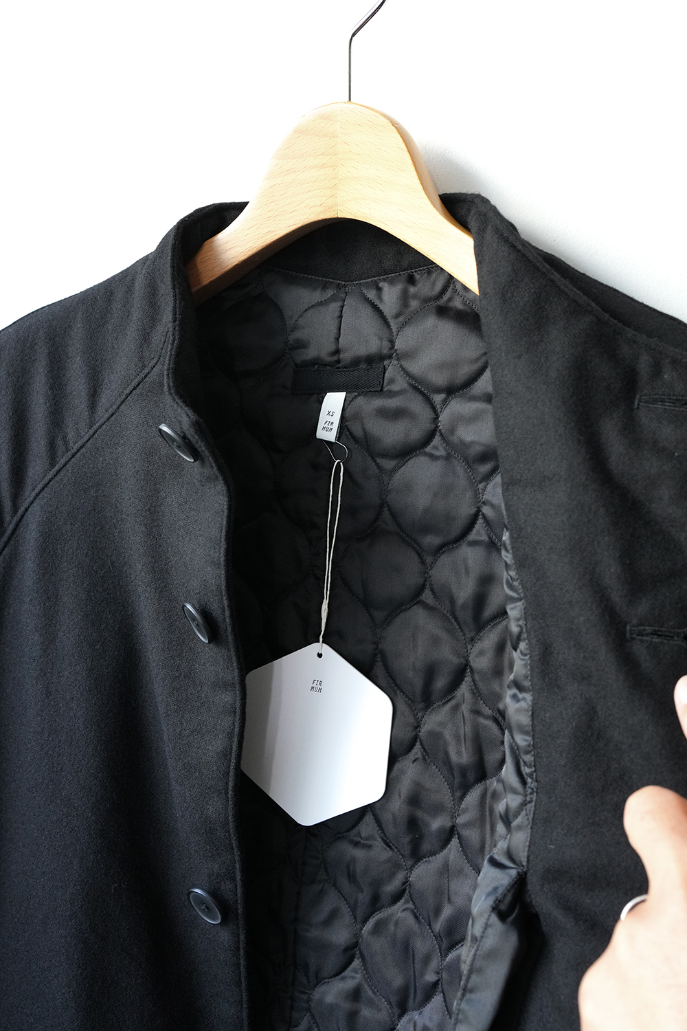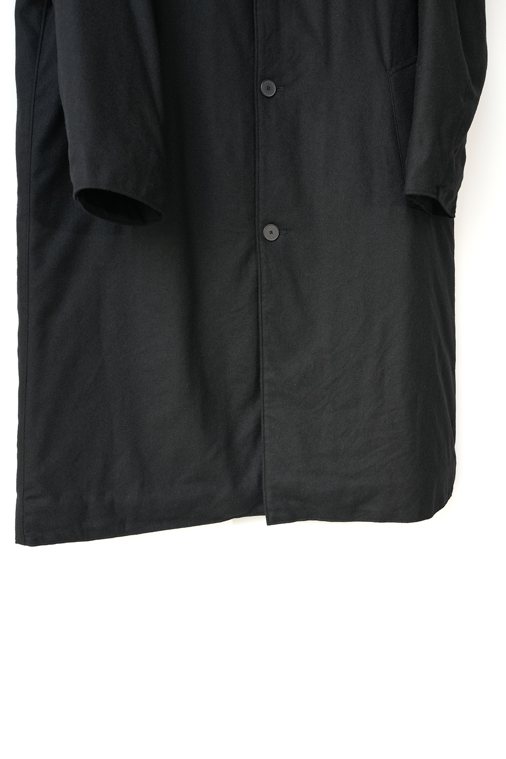 綿のシーチングの様なイメージで織られたウールの平織生地、ざっくりと織り上げた風合いが特徴。ボトルネック、ラグランスリーブ。内側はキルティング仕様の総裏で、中綿に三菱ケミカルコアブリットを使用、軽くて暖かいコートに仕上がっております。