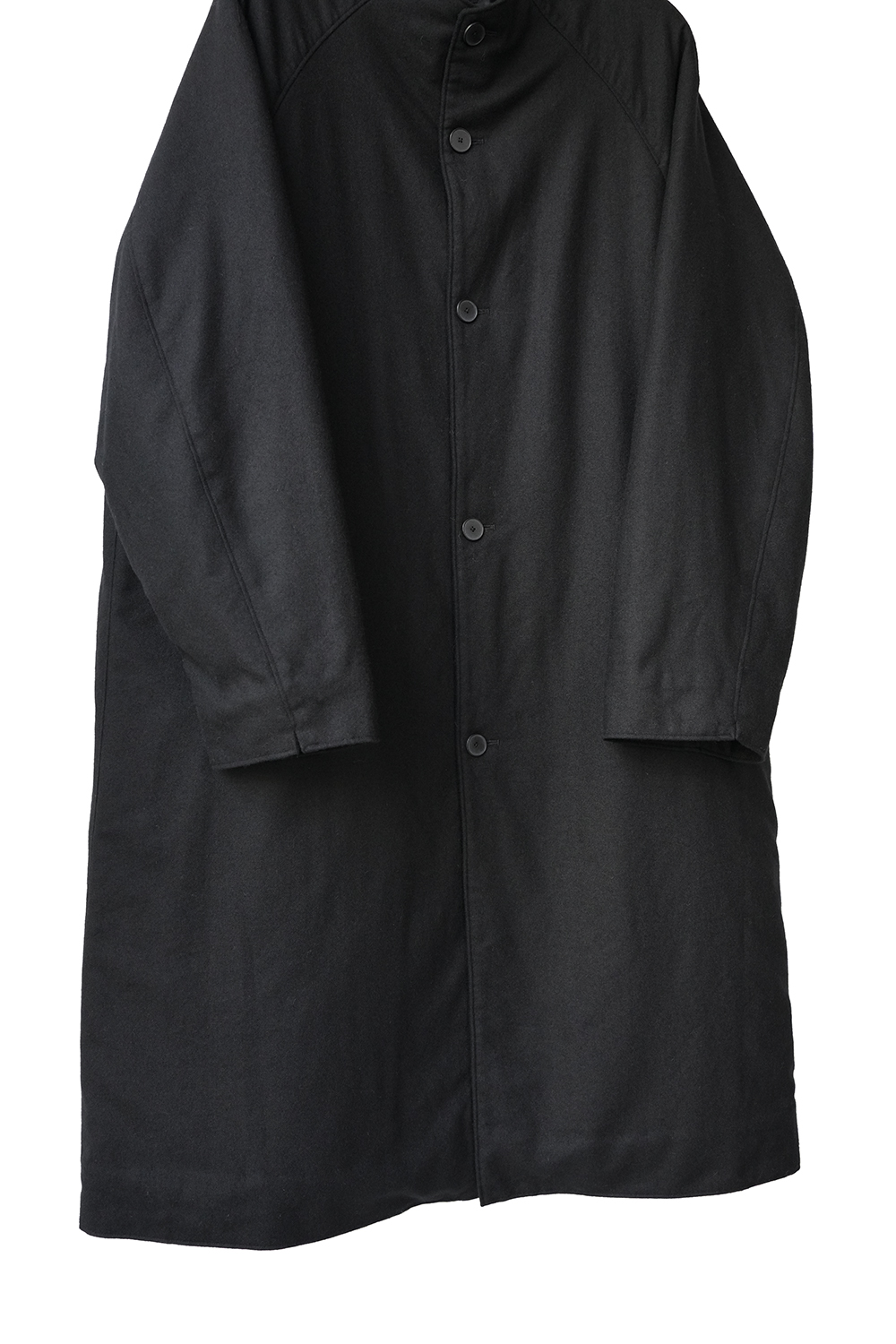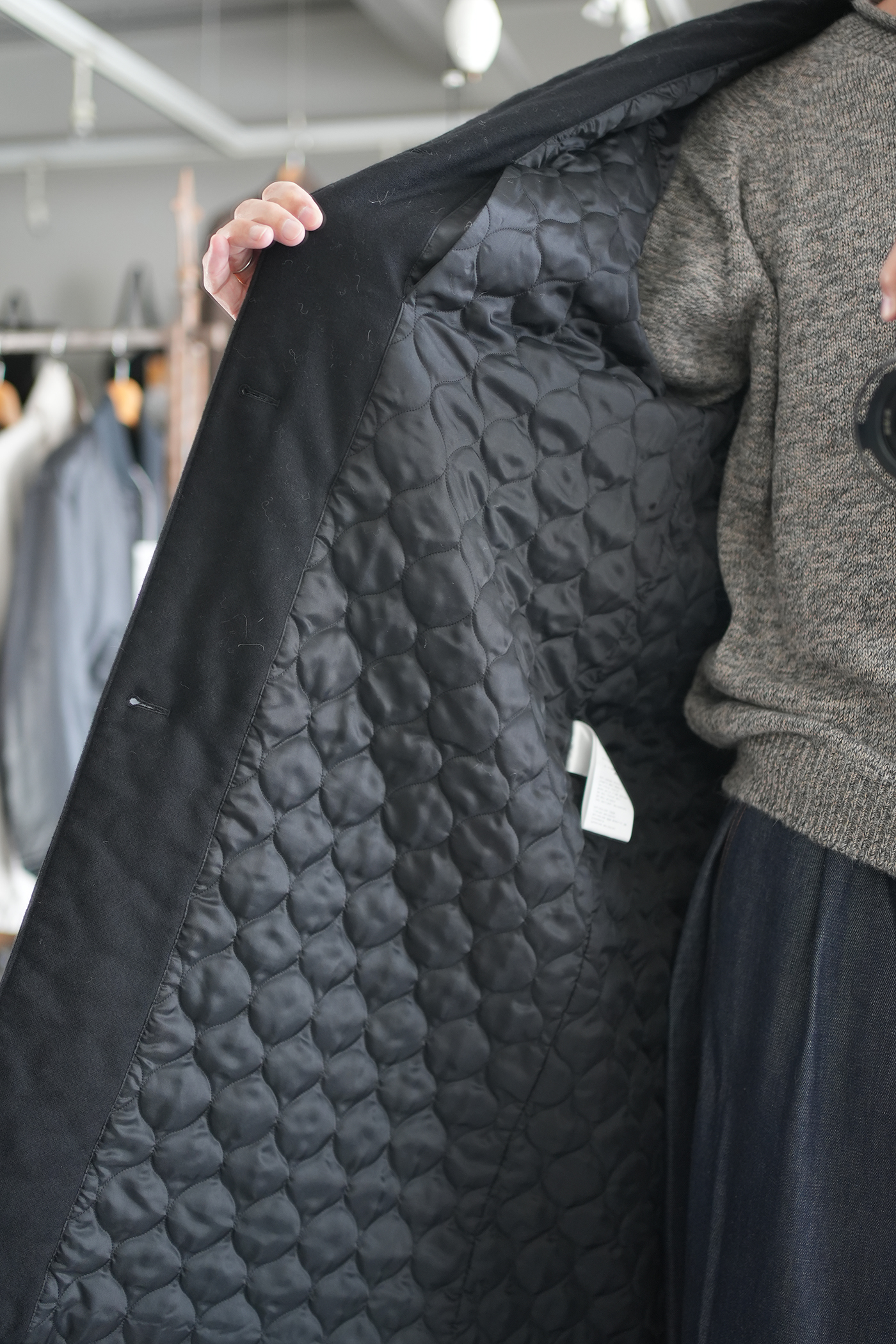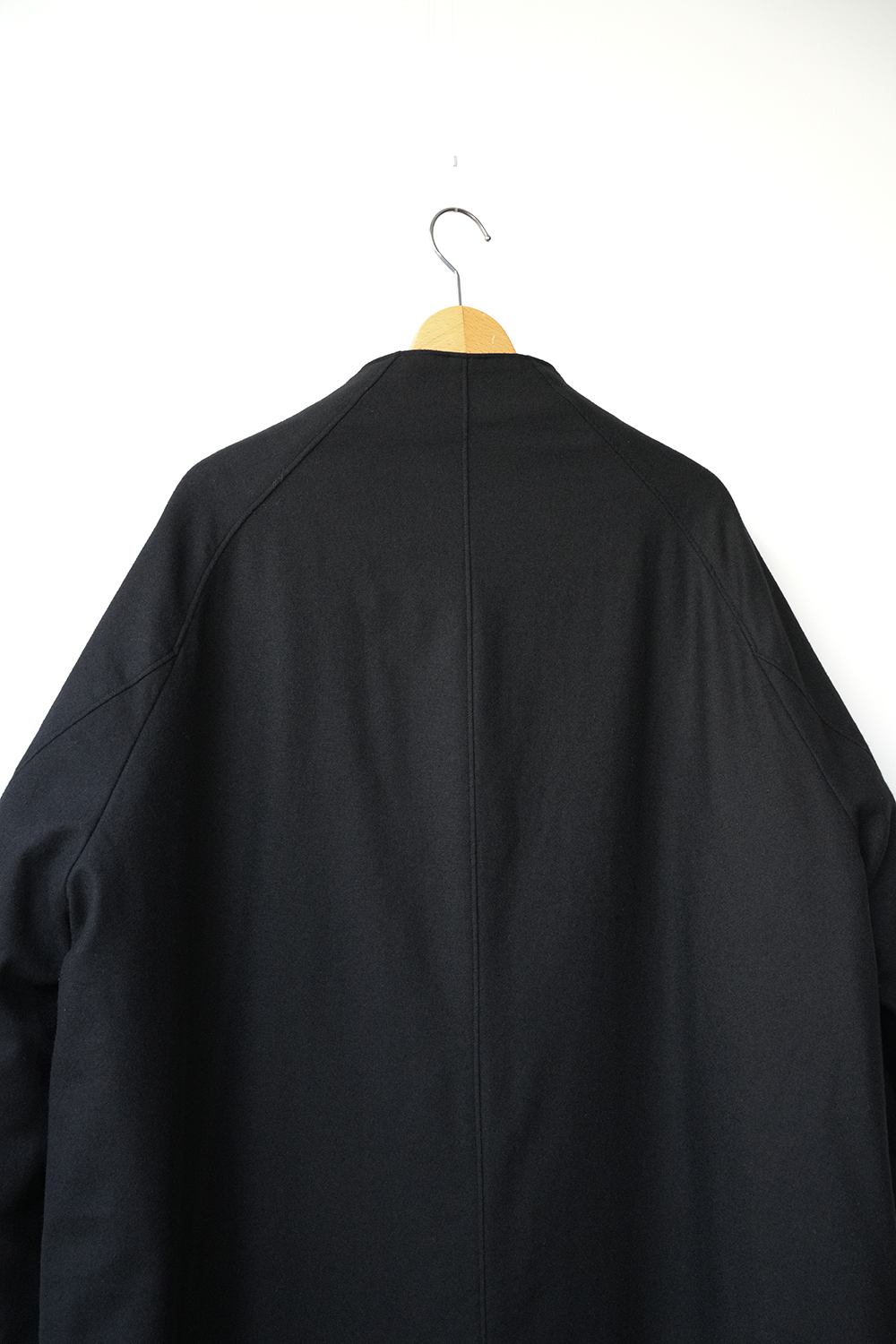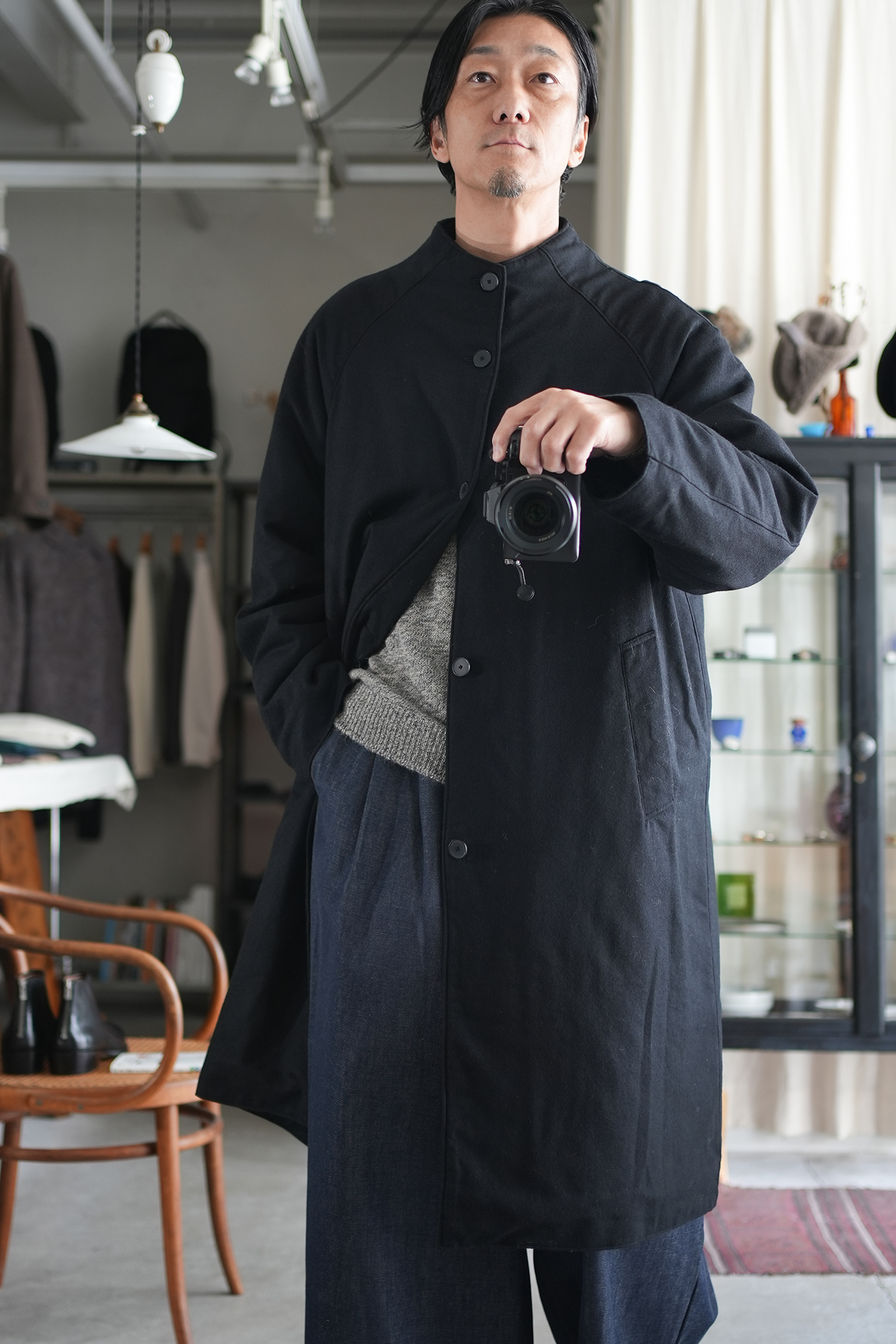 綿のシーチングの様なイメージで織られたウールの平織生地、ざっくりと織り上げた風合いが特徴。ボトルネック、ラグランスリーブ。内側はキルティング仕様の総裏で、中綿に三菱ケミカルコアブリットを使用、軽くて暖かいコートに仕上がっております。