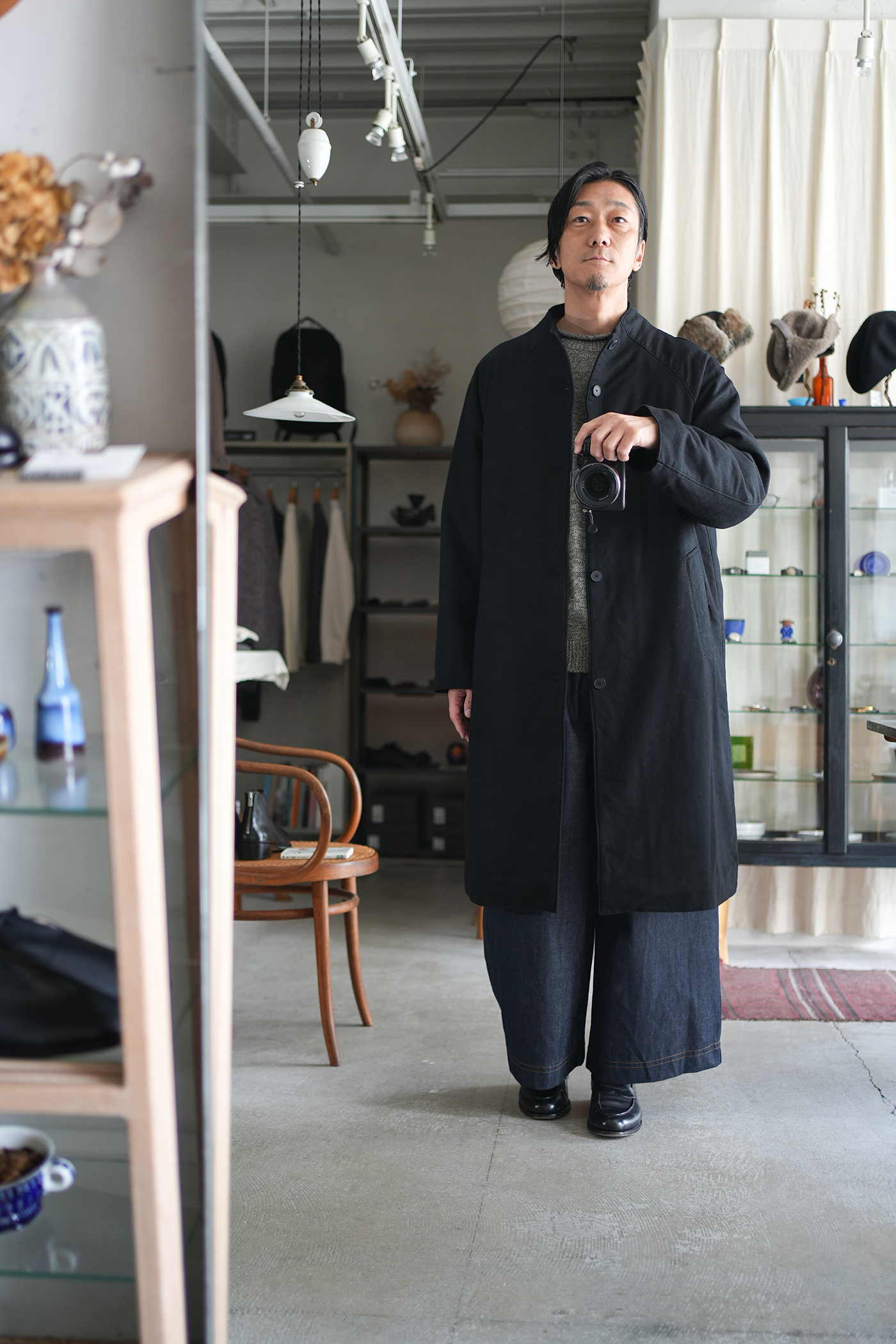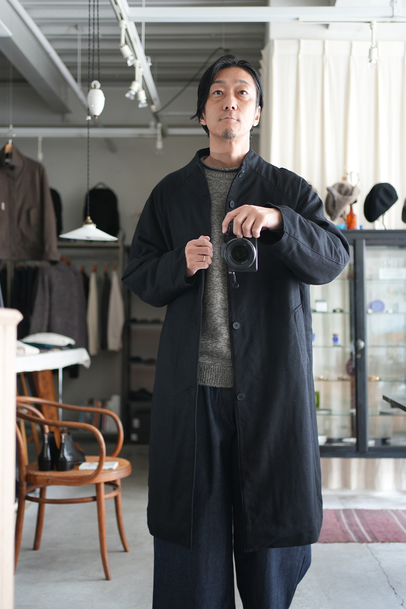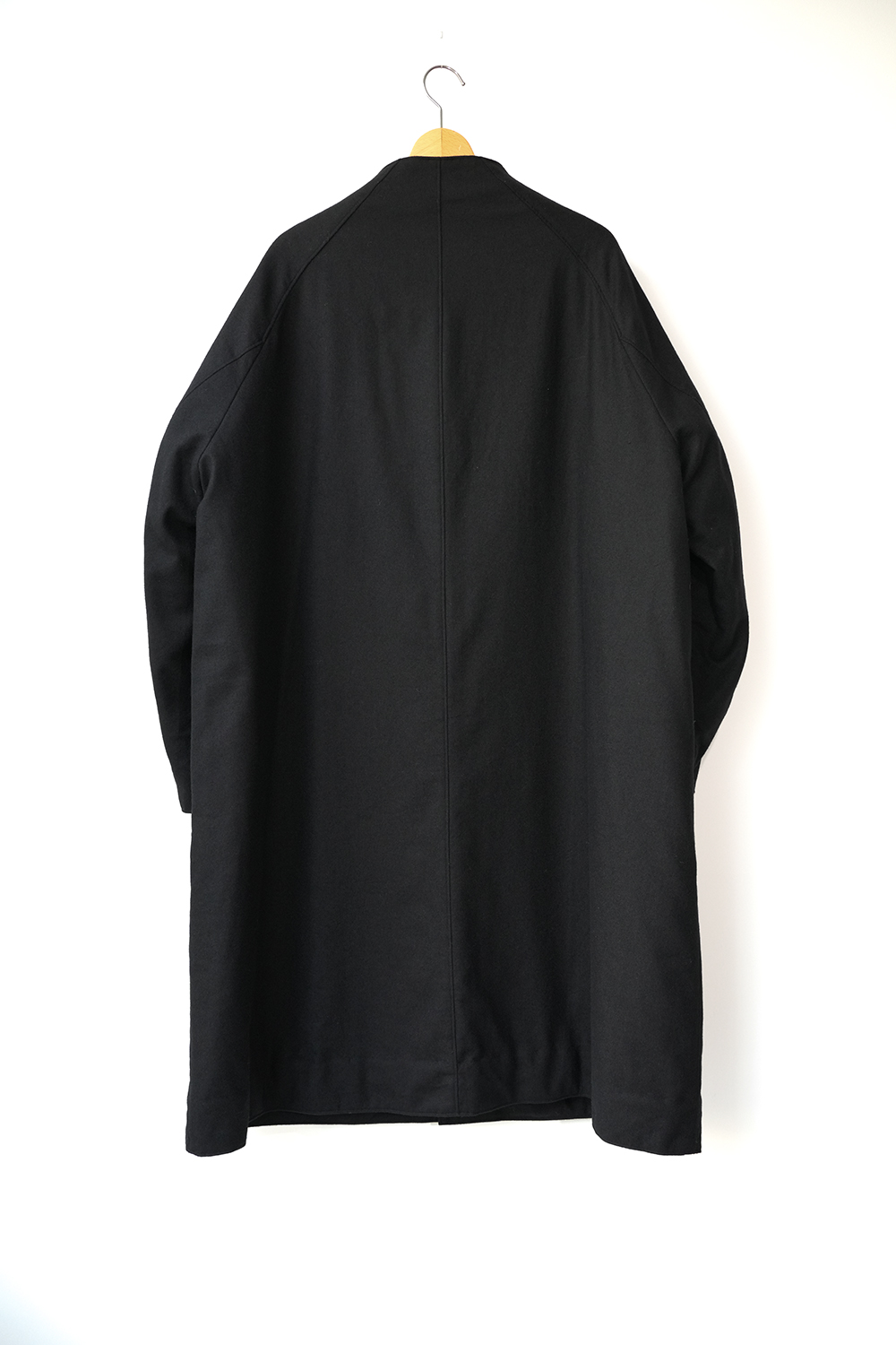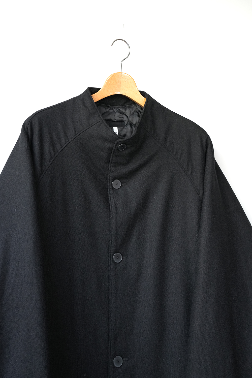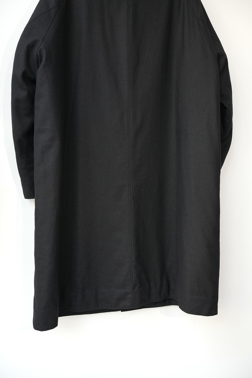 綿のシーチングの様なイメージで織られたウールの平織生地、ざっくりと織り上げた風合いが特徴。ボトルネック、ラグランスリーブ。内側はキルティング仕様の総裏で、中綿に三菱ケミカルコアブリットを使用、軽くて暖かいコートに仕上がっております。