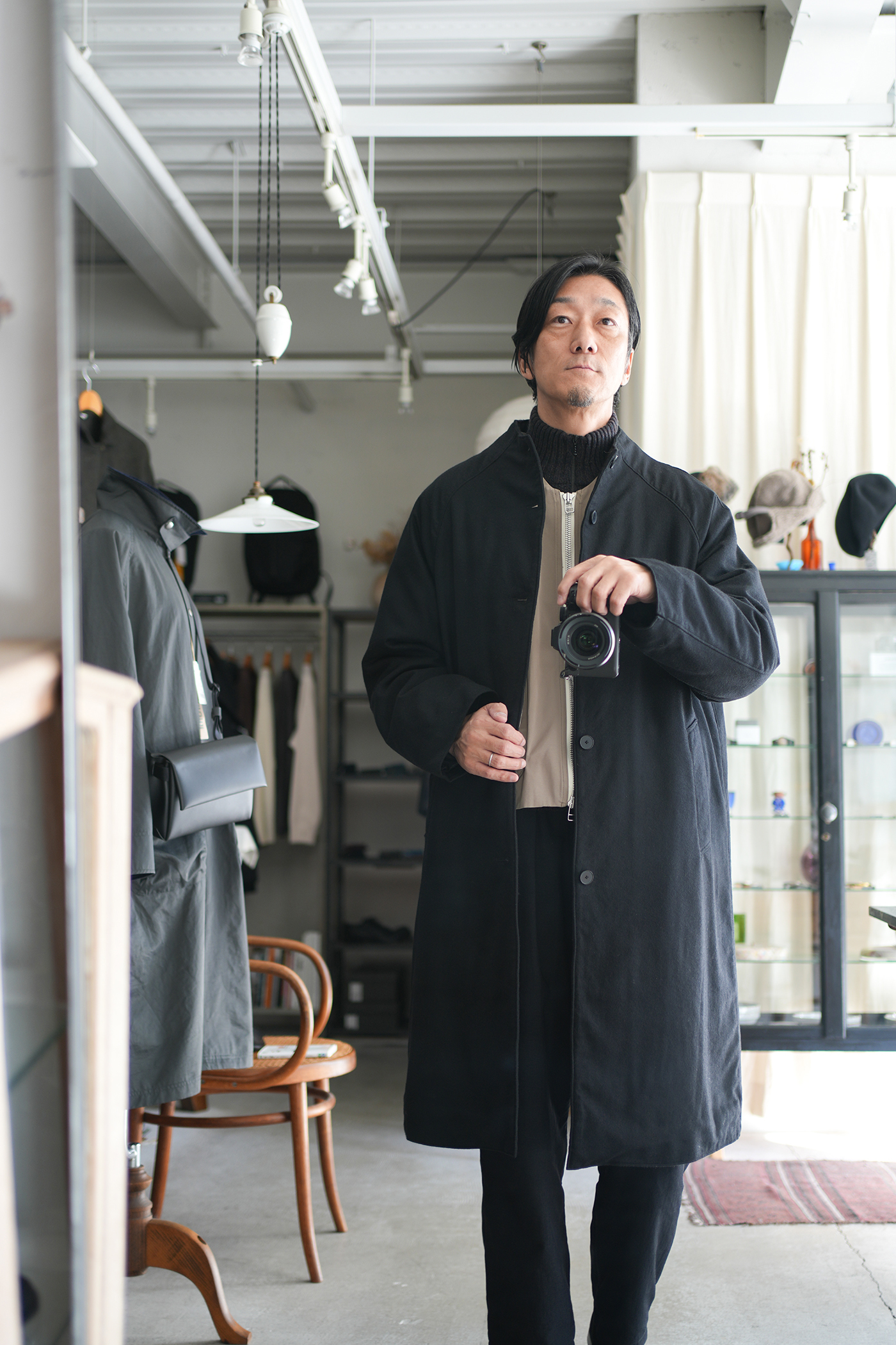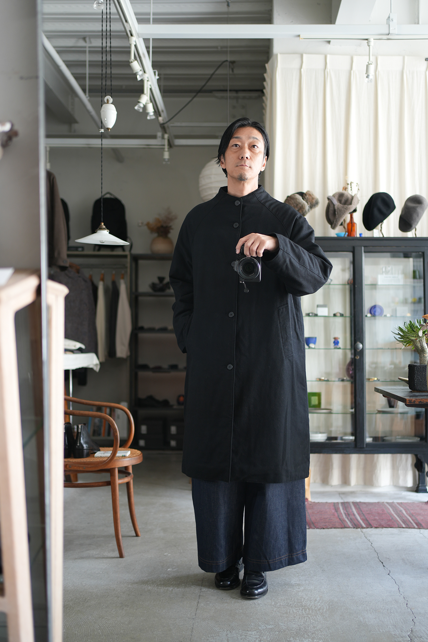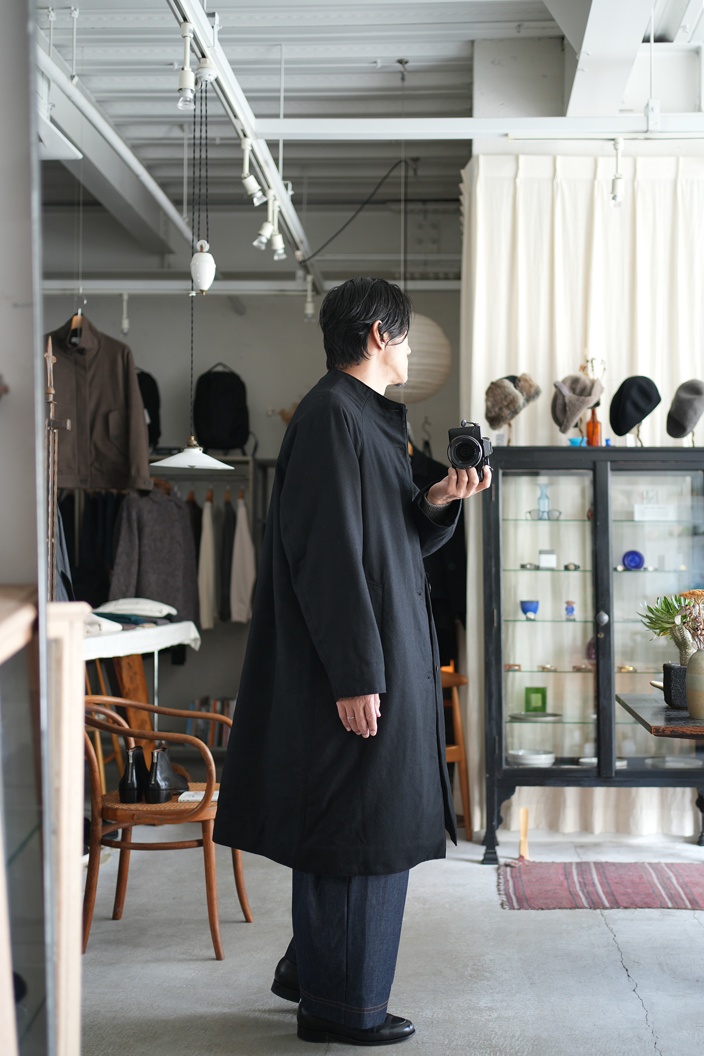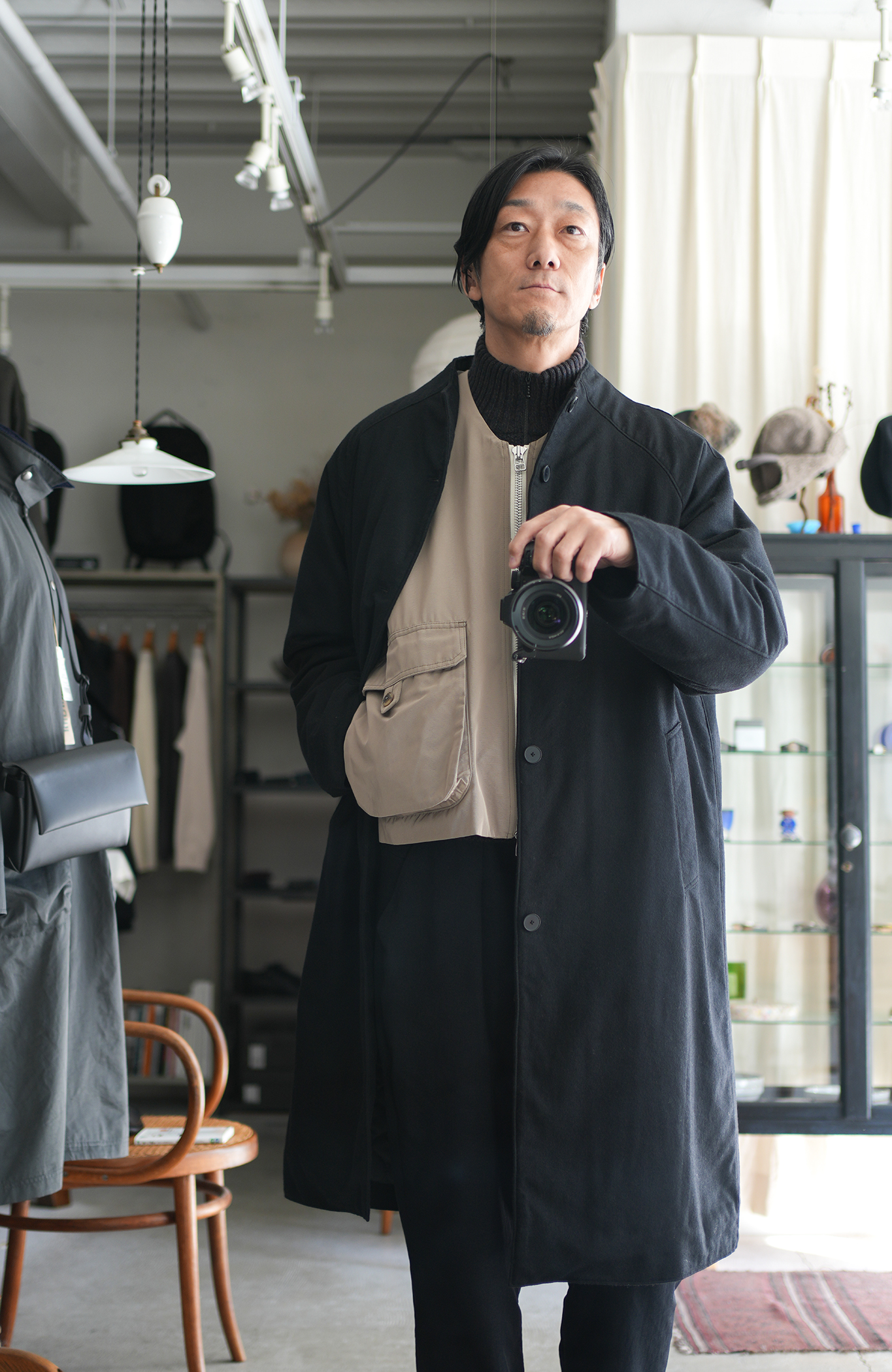 綿のシーチングの様なイメージで織られたウールの平織生地、ざっくりと織り上げた風合いが特徴。ボトルネック、ラグランスリーブ。内側はキルティング仕様の総裏で、中綿に三菱ケミカルコアブリットを使用、軽くて暖かいコートに仕上がっております。