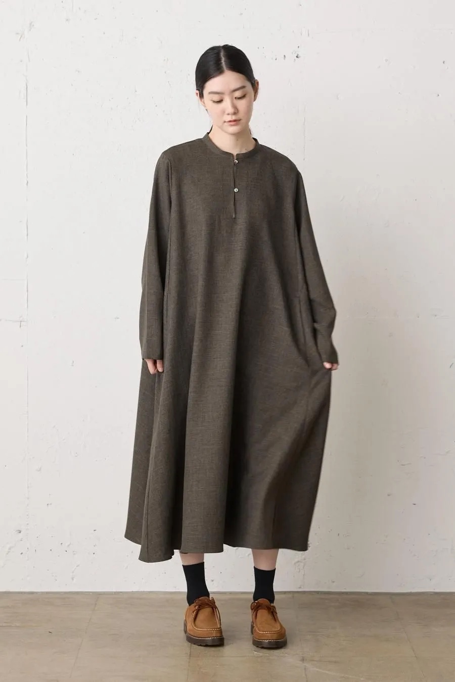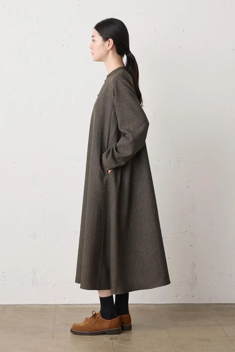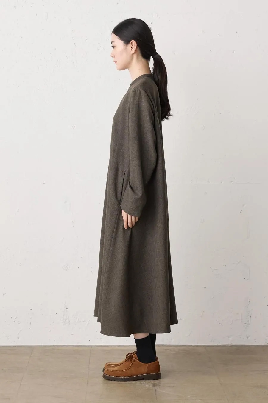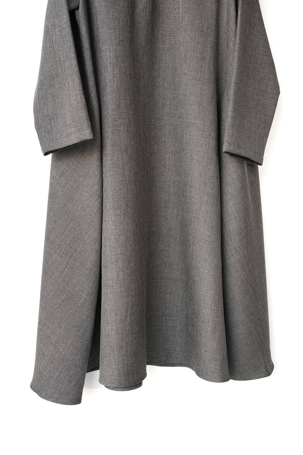 ウールツイードのような上品な表情を持つポリエステル素材を使用したスキッパーワンピース。程よい厚みと美しい落ち感が特徴で、キレイ目に着用いただけます。昨年ご好評いただいたシルエットをベースに、今季は襟元をスタンドカラーにマイナーチェンジ。首まわりがすっきりと見え、より洗練された印象にアップデートされています。シンプルながらも存在感があり、一枚でサマになる大人のワンピース。デイリーにはもちろん、少しきちんとしたシーンにも対応できる、汎用性の高いアイテムです。