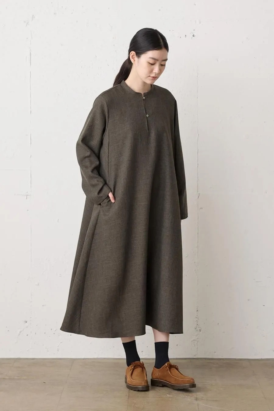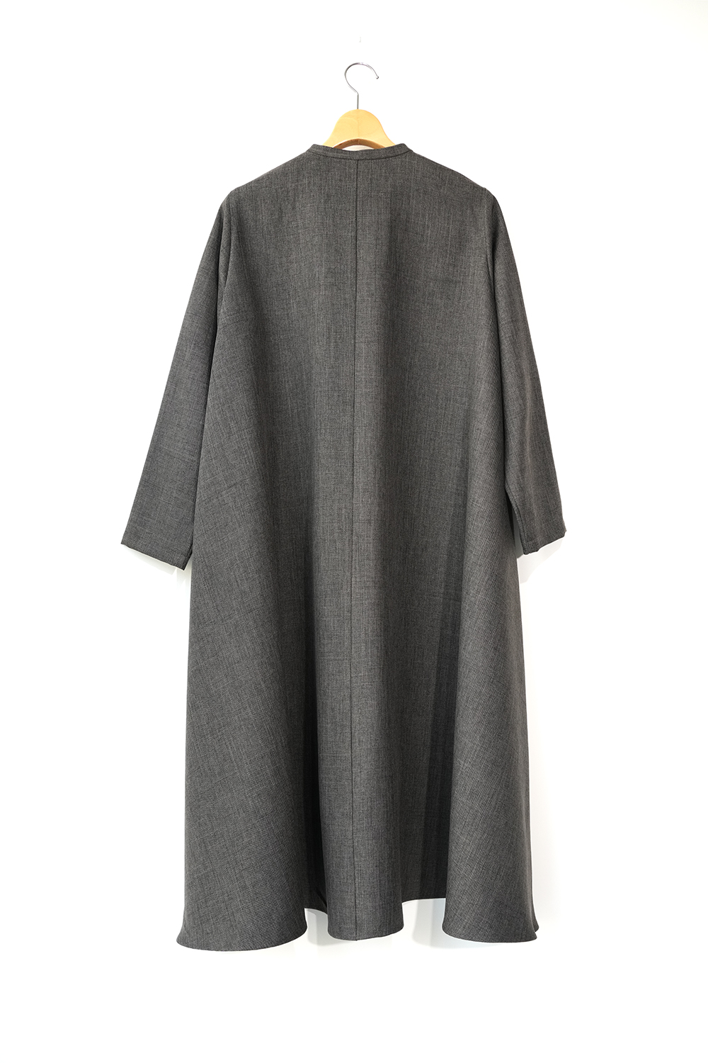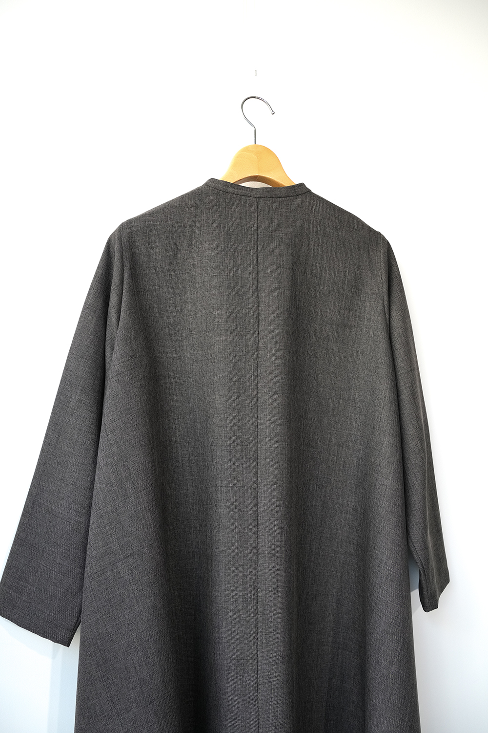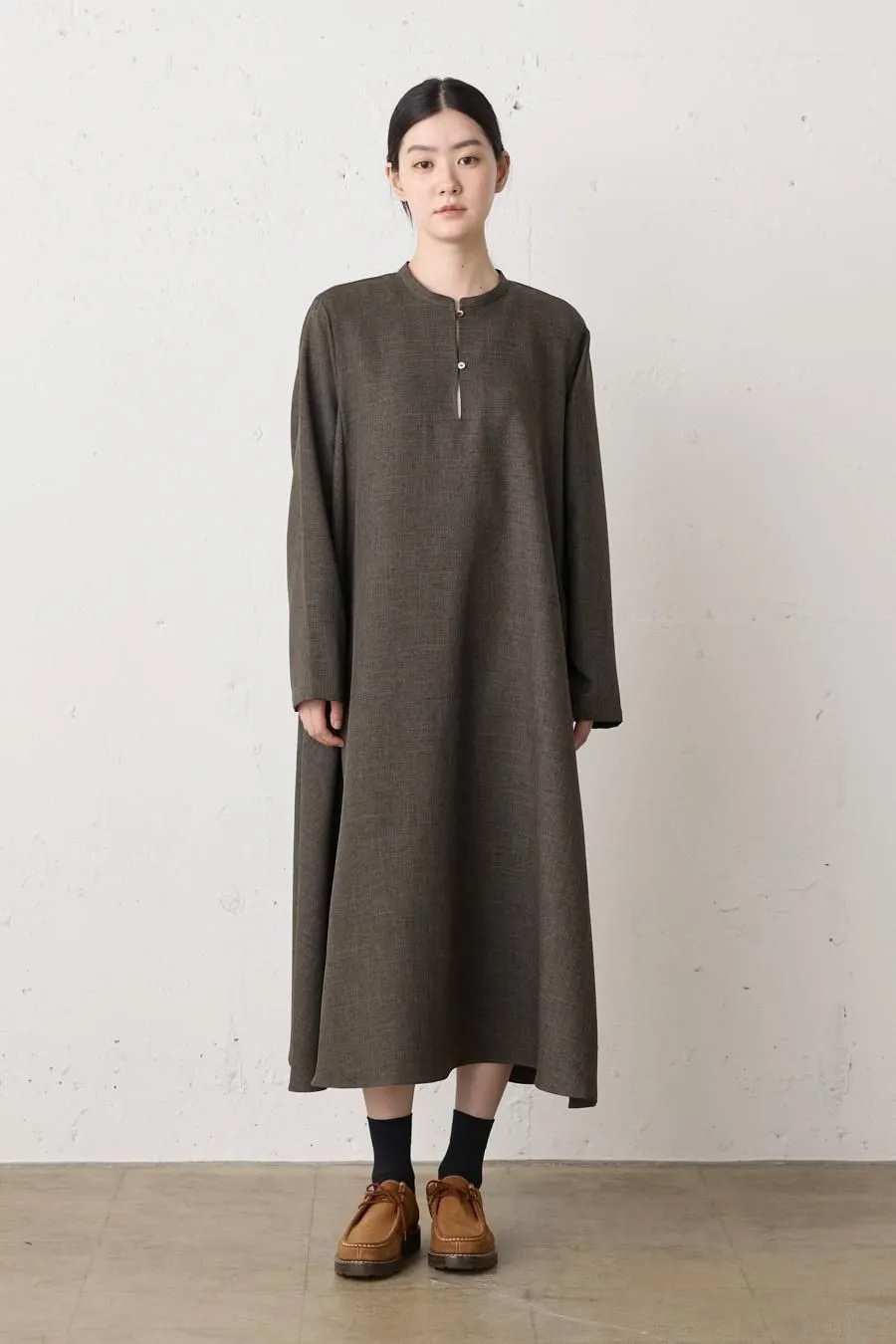 ウールツイードのような上品な表情を持つポリエステル素材を使用したスキッパーワンピース。程よい厚みと美しい落ち感が特徴で、キレイ目に着用いただけます。昨年ご好評いただいたシルエットをベースに、今季は襟元をスタンドカラーにマイナーチェンジ。首まわりがすっきりと見え、より洗練された印象にアップデートされています。シンプルながらも存在感があり、一枚でサマになる大人のワンピース。デイリーにはもちろん、少しきちんとしたシーンにも対応できる、汎用性の高いアイテムです。