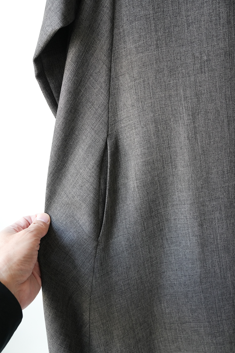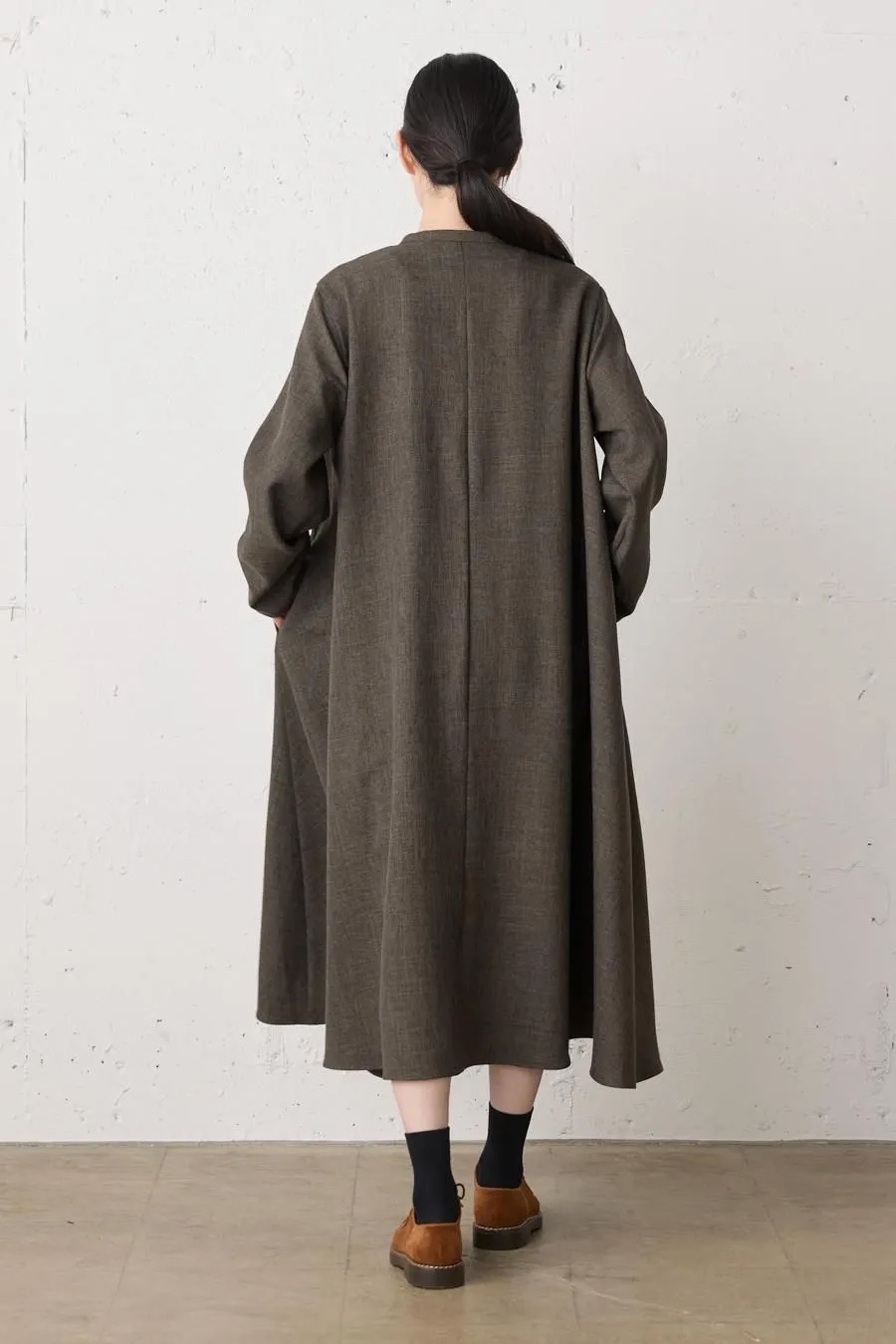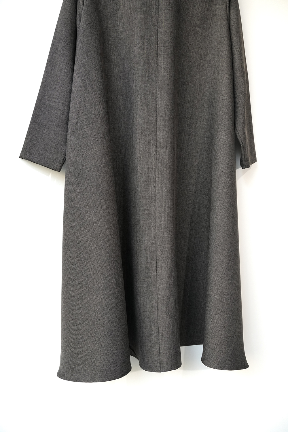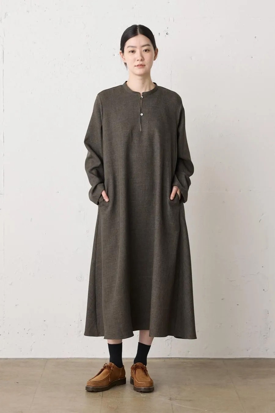 ウールツイードのような上品な表情を持つポリエステル素材を使用したスキッパーワンピース。程よい厚みと美しい落ち感が特徴で、キレイ目に着用いただけます。昨年ご好評いただいたシルエットをベースに、今季は襟元をスタンドカラーにマイナーチェンジ。首まわりがすっきりと見え、より洗練された印象にアップデートされています。シンプルながらも存在感があり、一枚でサマになる大人のワンピース。デイリーにはもちろん、少しきちんとしたシーンにも対応できる、汎用性の高いアイテムです。