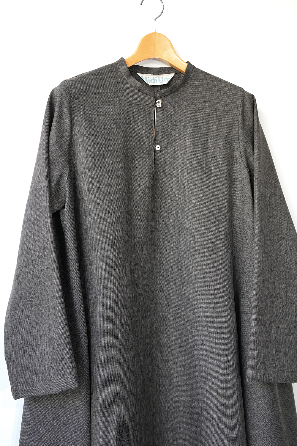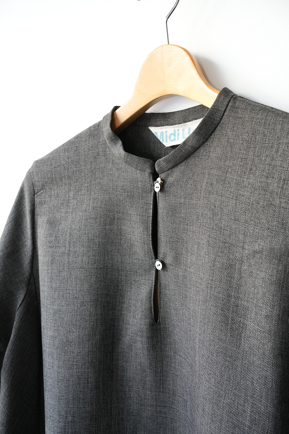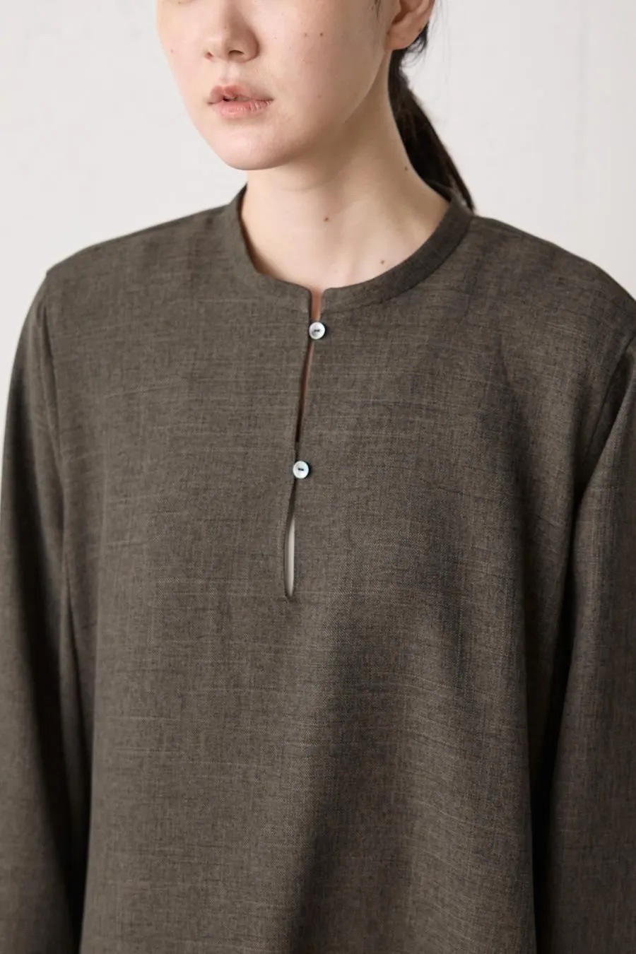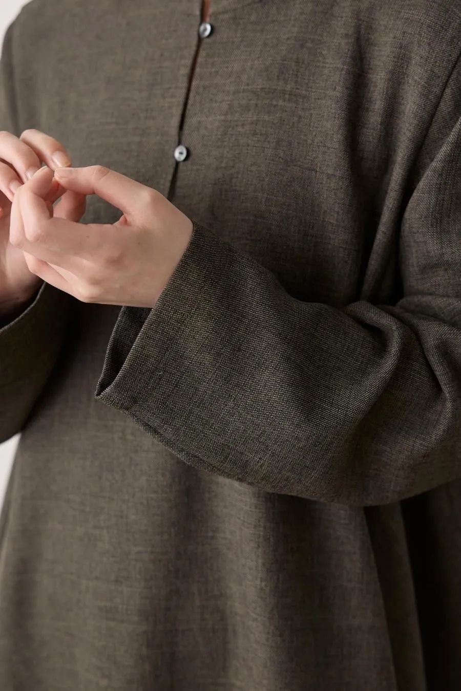 ウールツイードのような上品な表情を持つポリエステル素材を使用したスキッパーワンピース。程よい厚みと美しい落ち感が特徴で、キレイ目に着用いただけます。昨年ご好評いただいたシルエットをベースに、今季は襟元をスタンドカラーにマイナーチェンジ。首まわりがすっきりと見え、より洗練された印象にアップデートされています。シンプルながらも存在感があり、一枚でサマになる大人のワンピース。デイリーにはもちろん、少しきちんとしたシーンにも対応できる、汎用性の高いアイテムです。