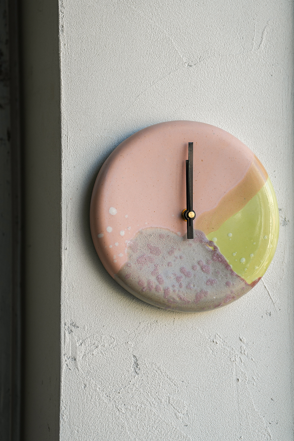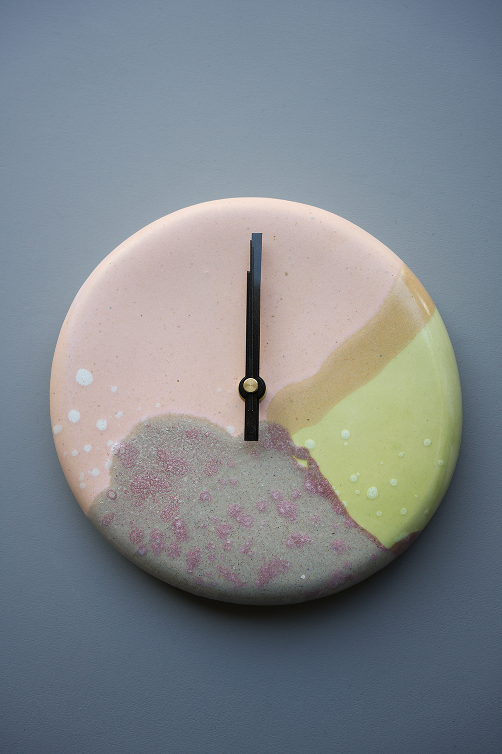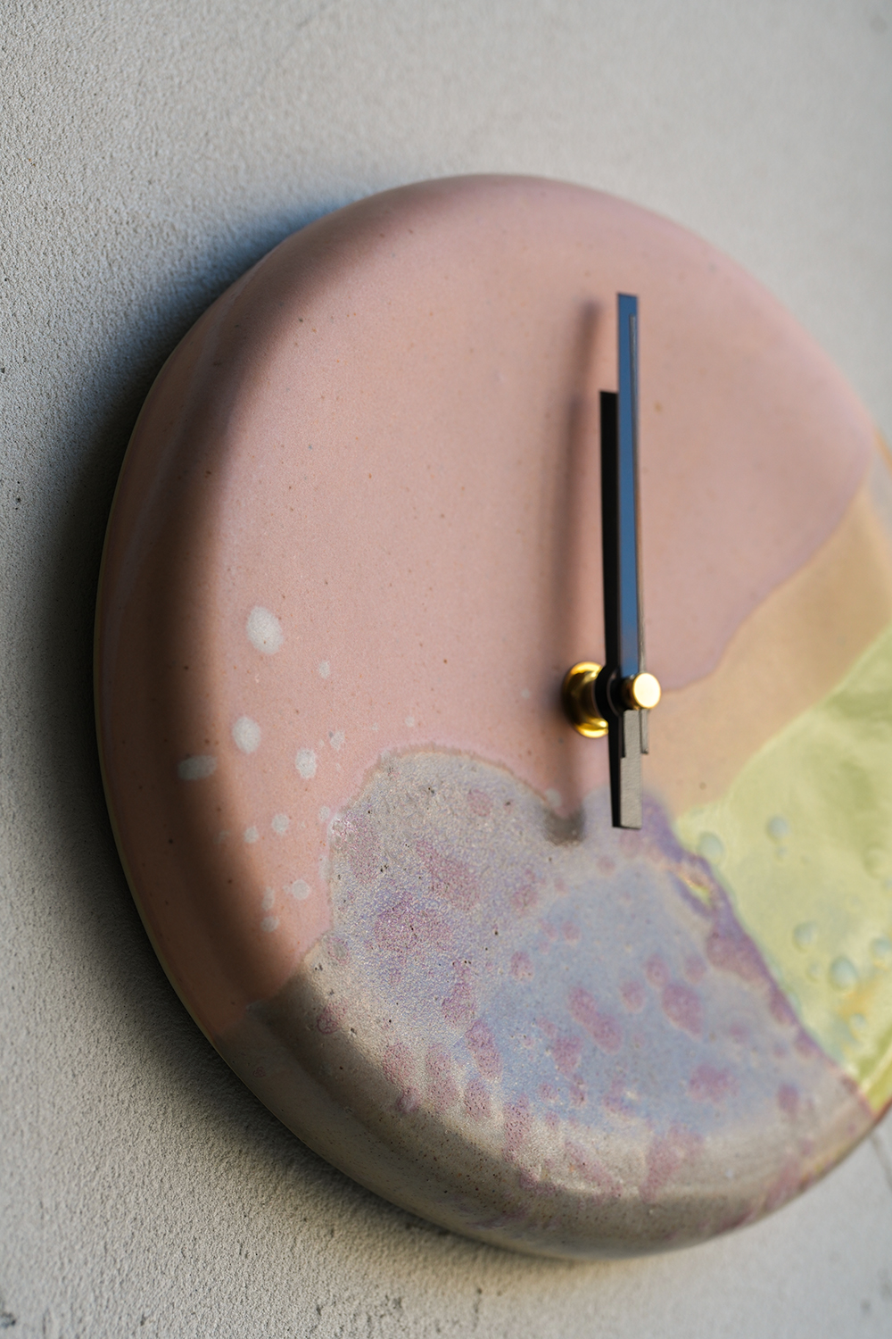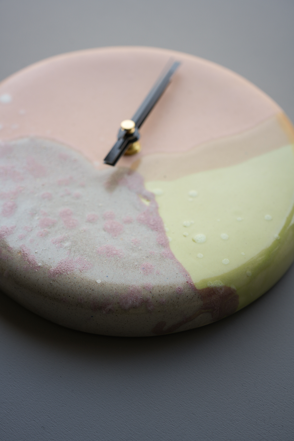 丸みのあるもっちりしたフォルムの掛け時計。竹村さんらしい釉薬の色彩美しい数字文字のないデザイン。ムーブメントクウォーツ・単三電池(付属いたしません、ご用意ください)