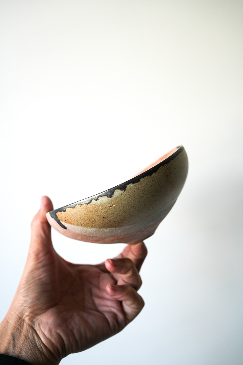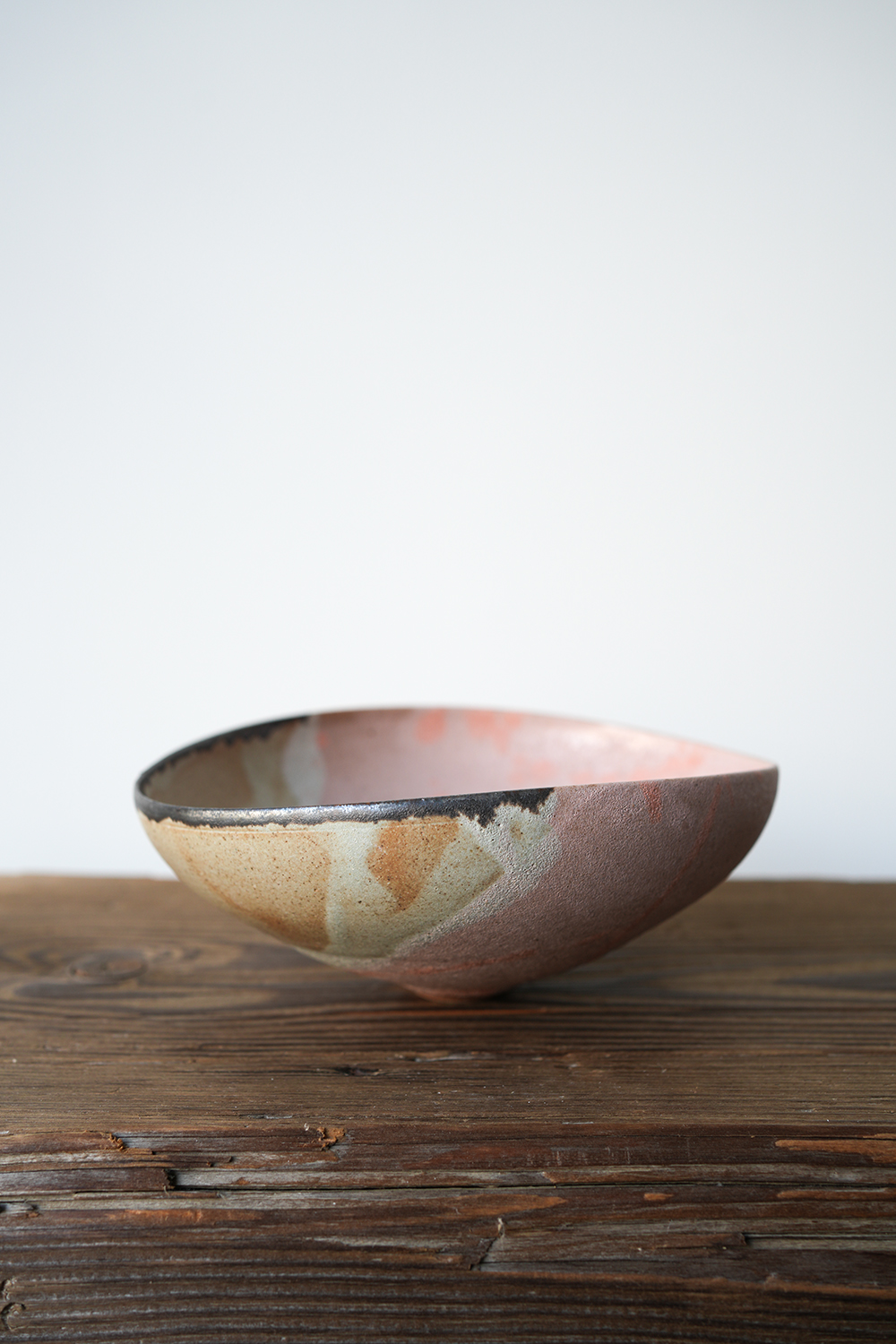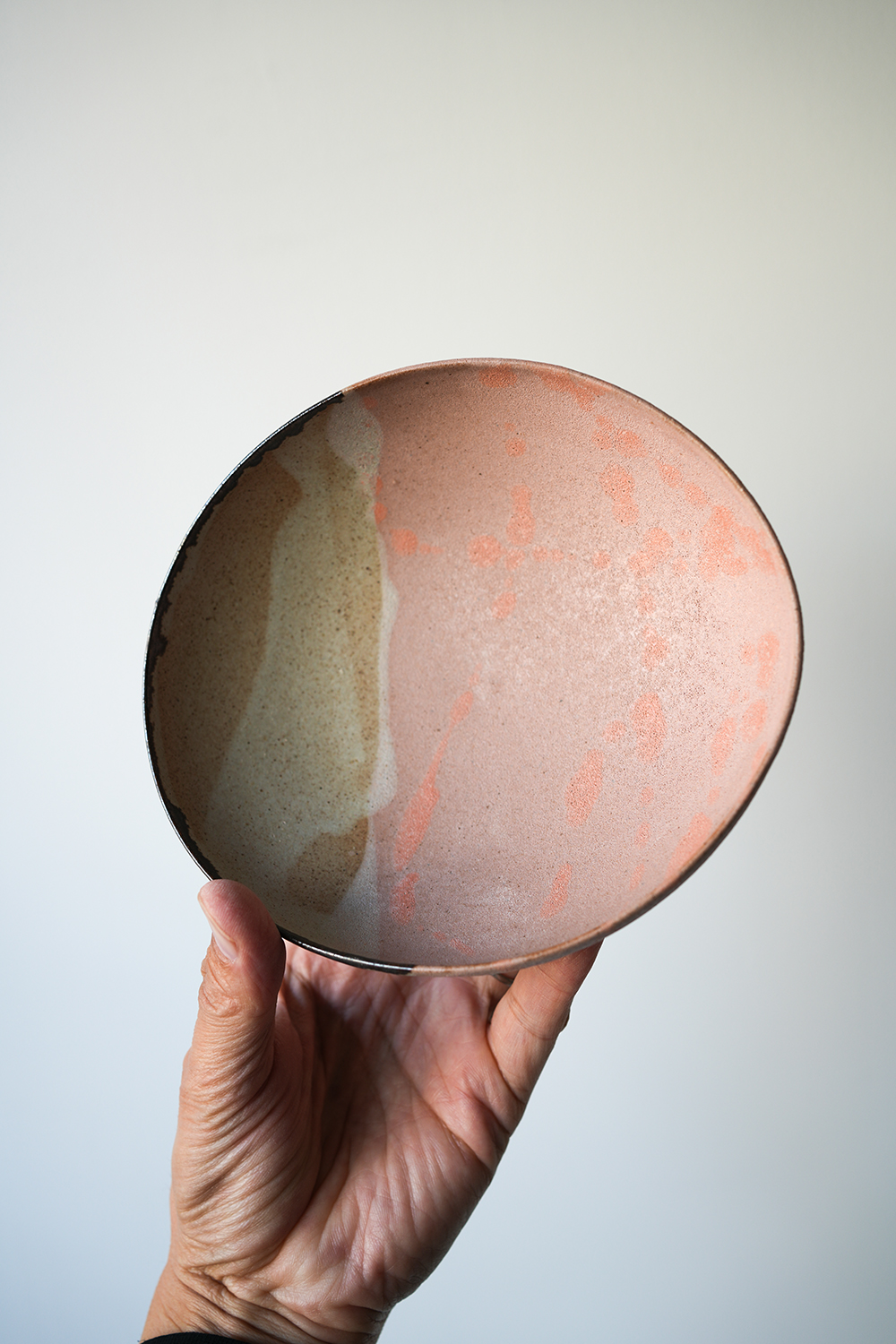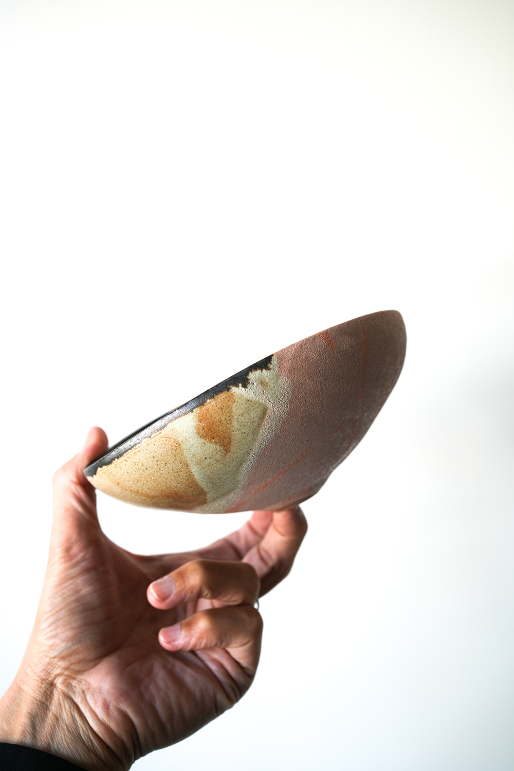 高台から滑らかに立ち上がり穏やかにたわむ碗と皿、お料理を包む様に盛り付けられる器です。フォルムと釉薬の美しさから空間を飾るアートピースとしても楽しめる作品です。