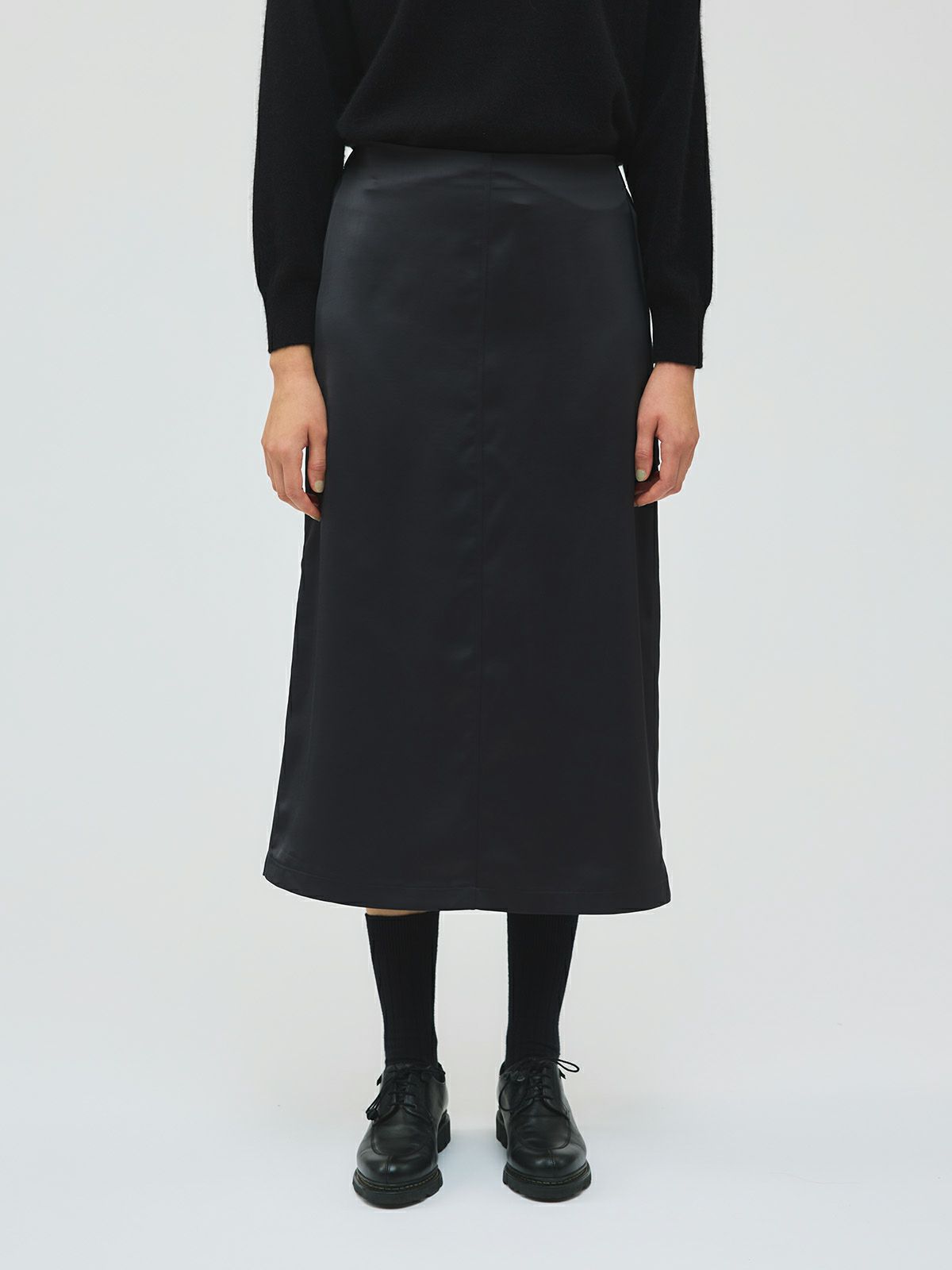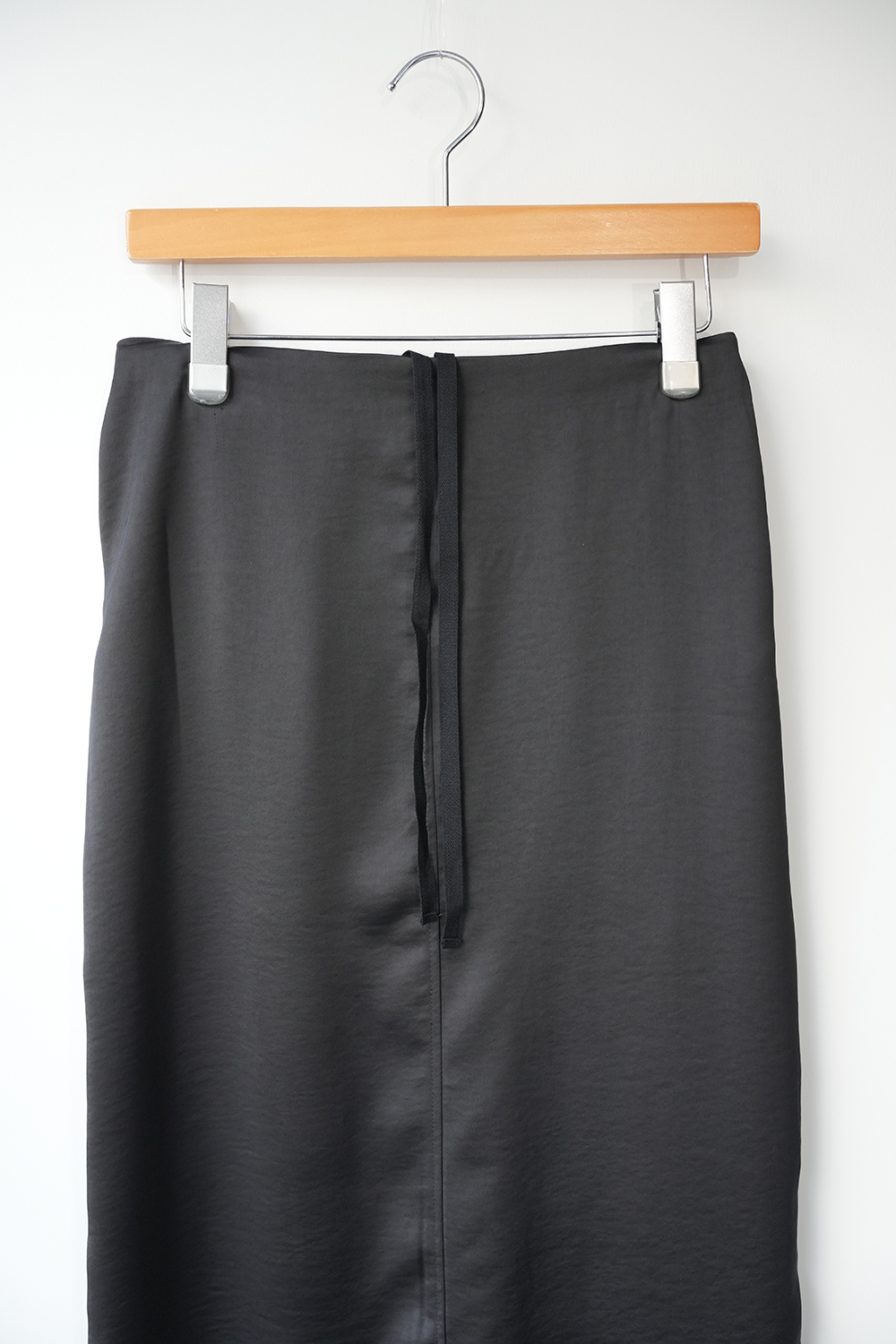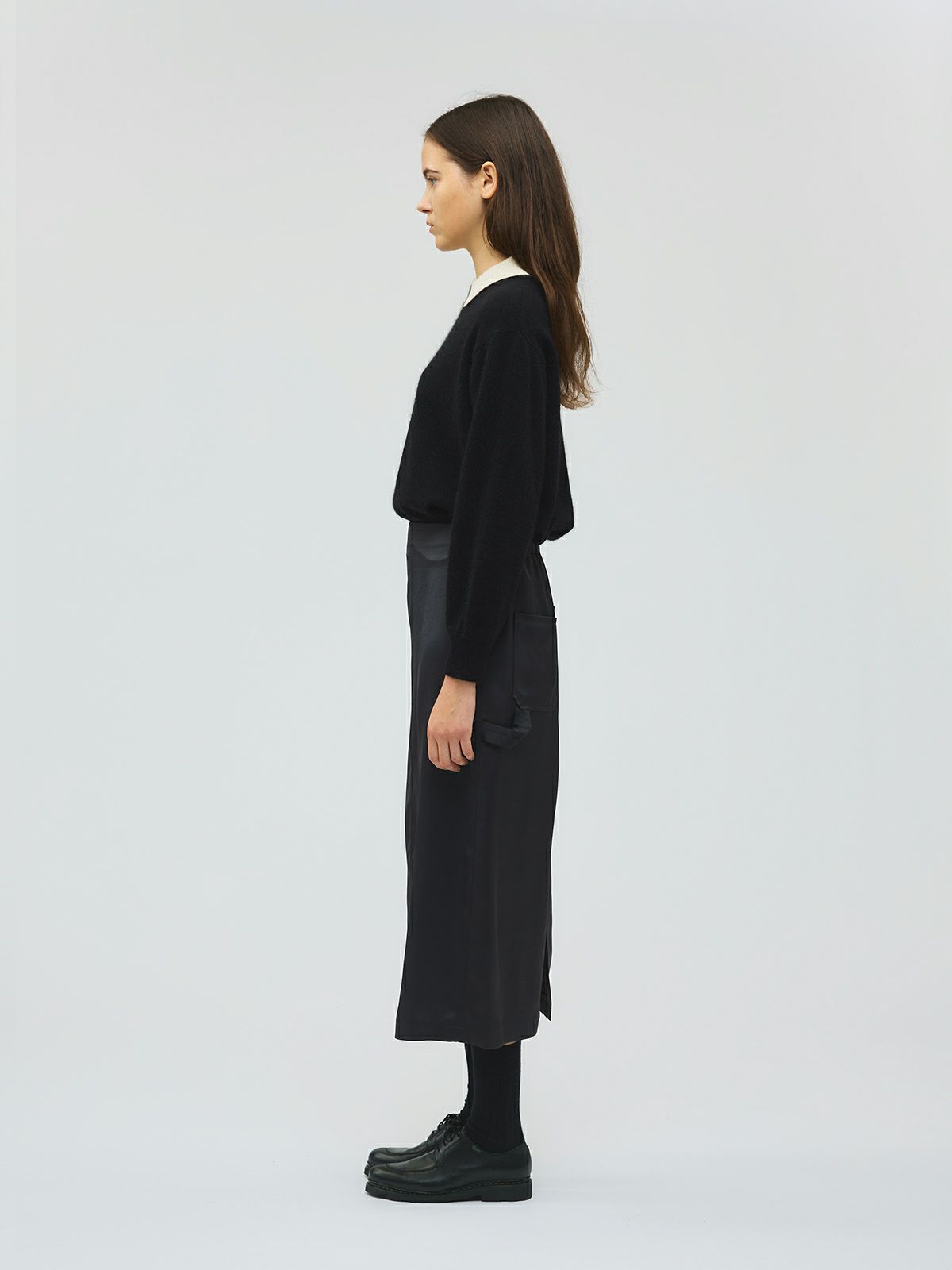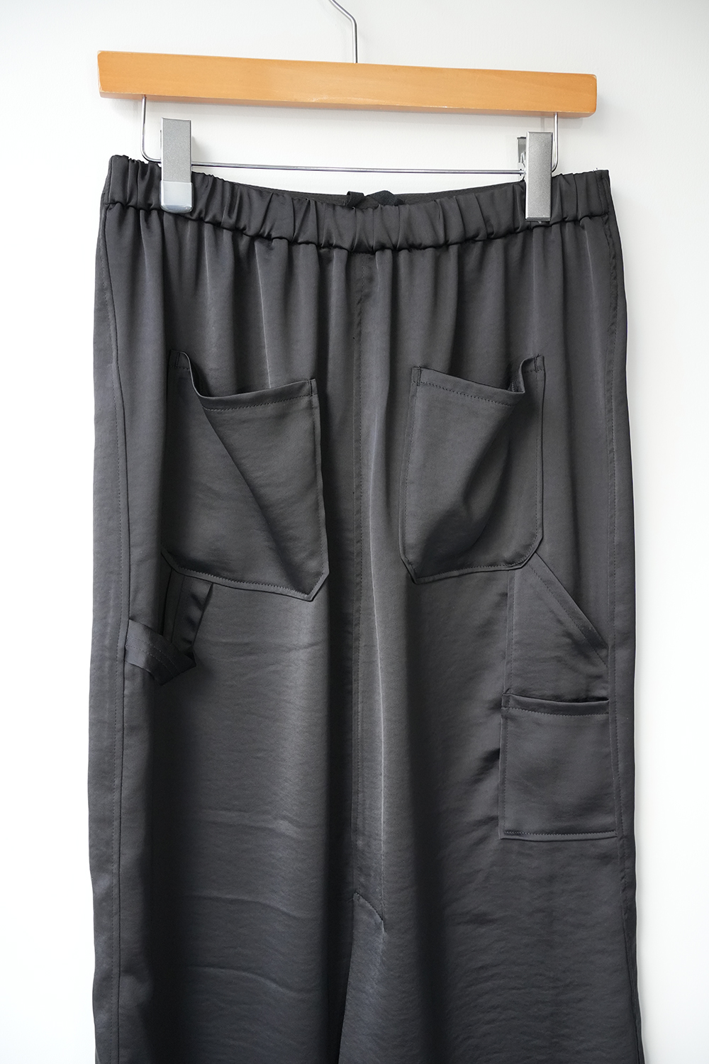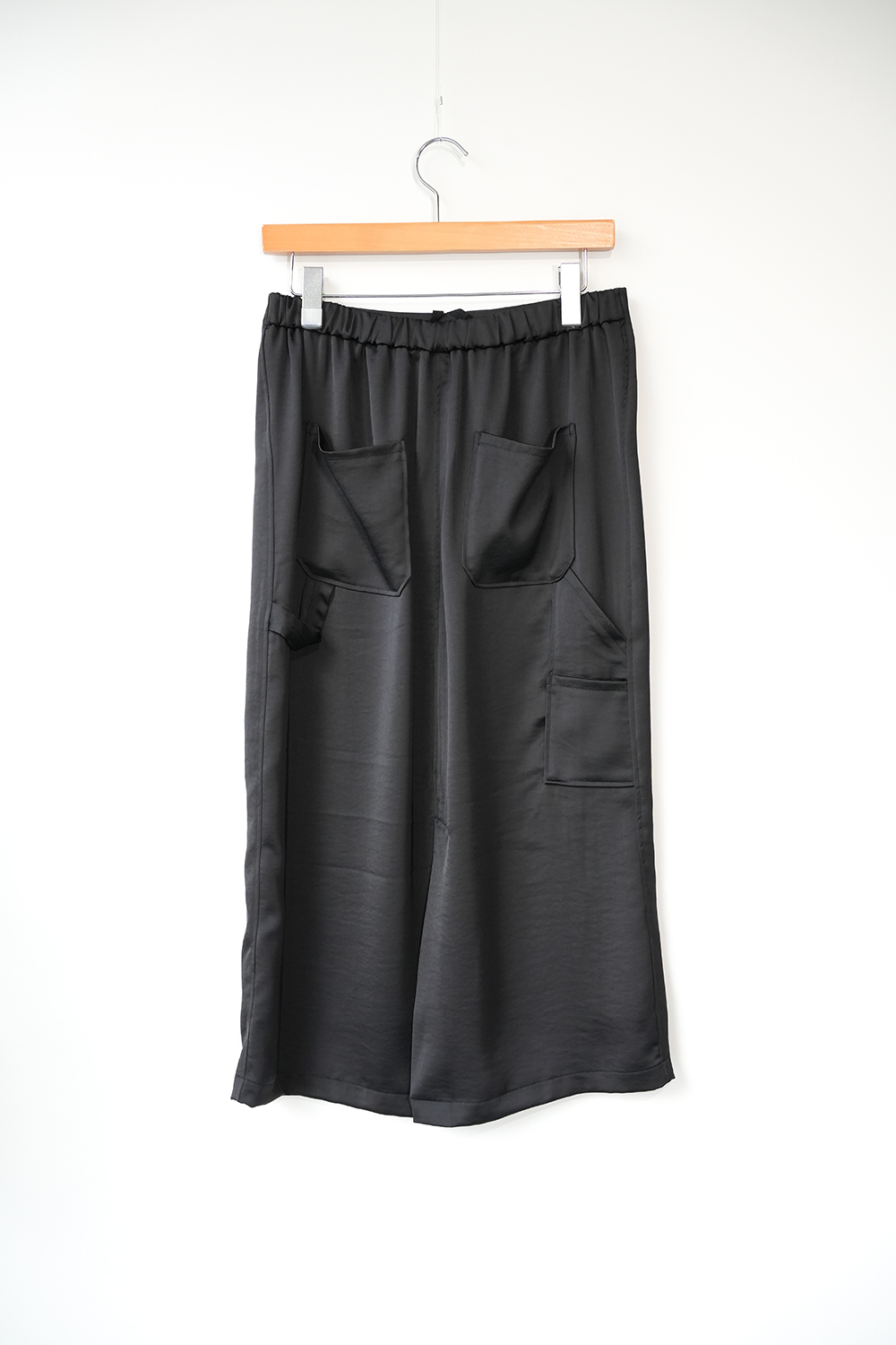 上品なサテン生地にペインターパンツのデザインをプラスしたペインタータイトスカートです。ポケットのデザインが特徴的。中紐が付いているのでウエストの調整が可能。バック部分のみゴム使用でシャツインにもお勧めです。タイト目なボックス型のシルエットはベーシックな中に女性らしい清楚な雰囲気が演出できる1枚。落ち着きのあるカラー展開なので着回しのきくスカートです。