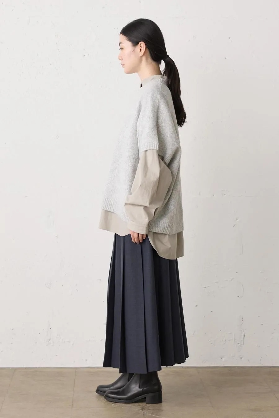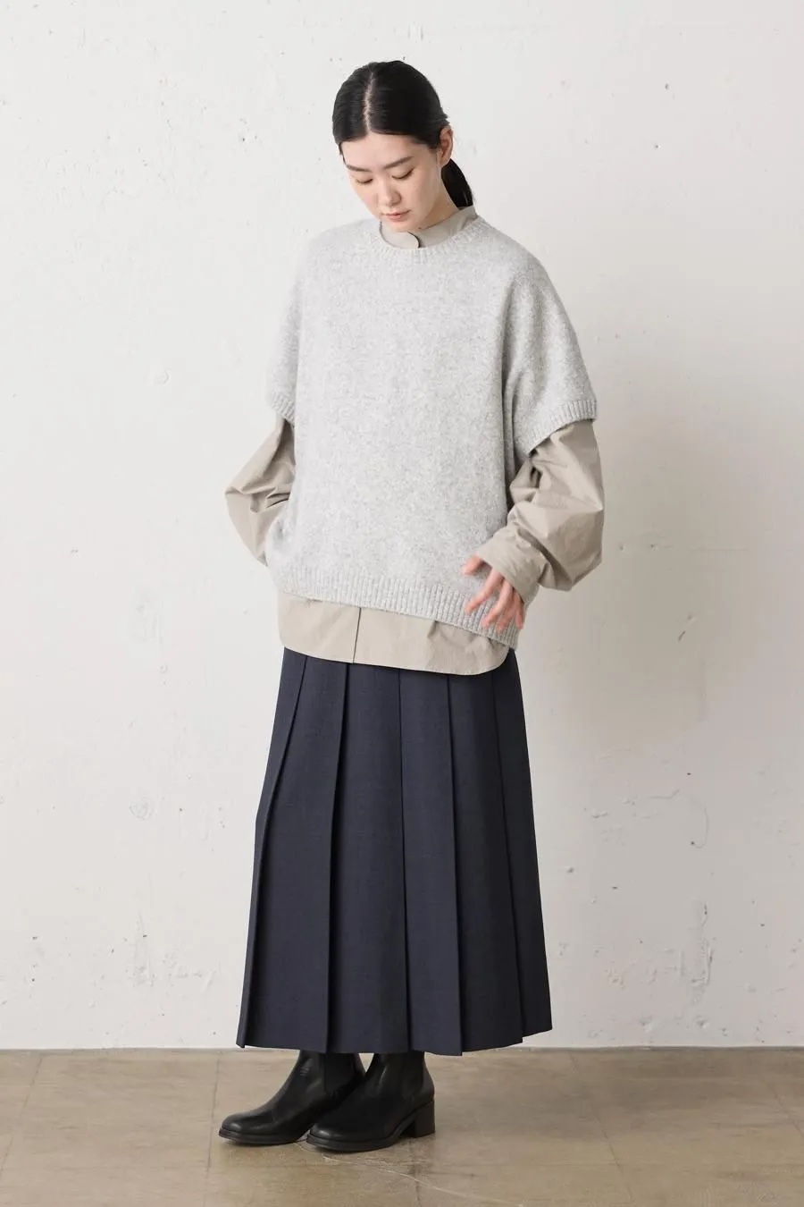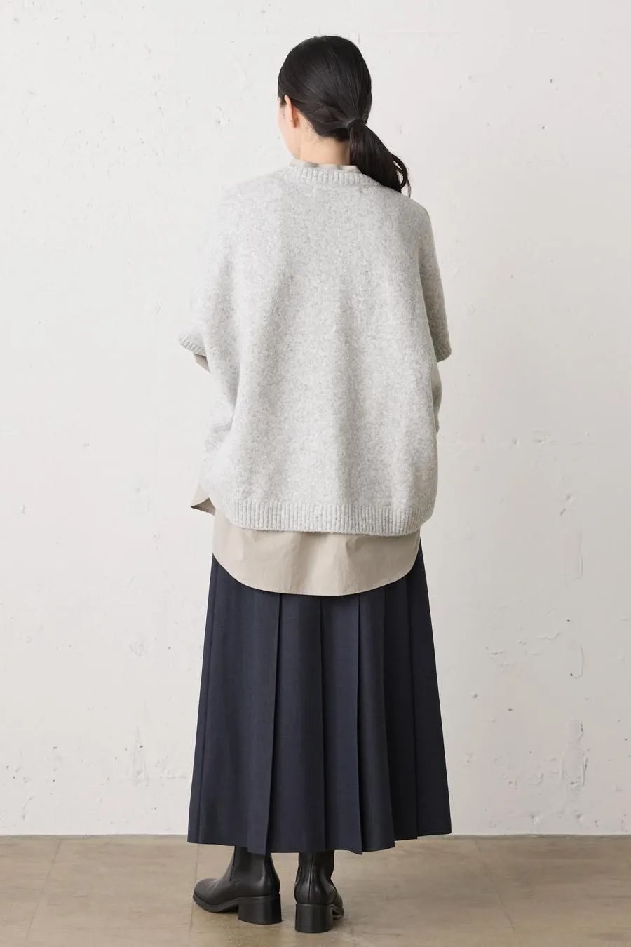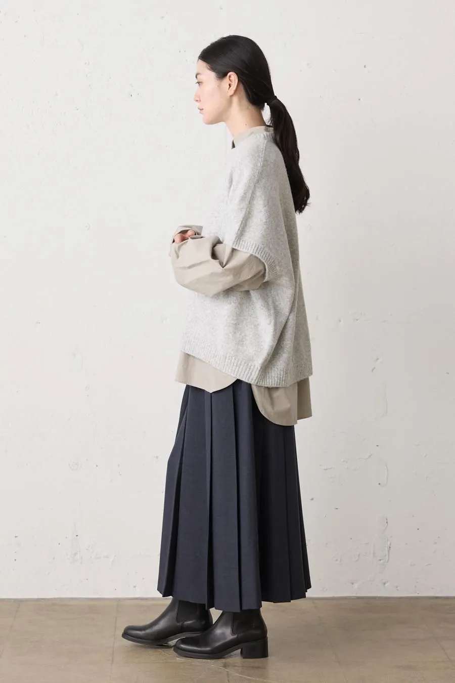 ウールツイードのような上質な表情を持つポリエステル素材を使用したプリーツスカート。程よい厚みとハリ感がありながらも、軽やかで美しい落ち感が特徴の素材です。動くたびに生まれる自然なドレープが女性らしさを引き立て、上品な印象に仕上げてくれます。デザインは片ひだのプリーツ仕様で、ほどよいボリューム感とすっきりとしたシルエットを両立。トップスをインしてもアウトしてもバランスよくまとまり、幅広いスタイリングに対応します。ウエスト後ろ部分はゴムの為、楽に着用いただけます。
