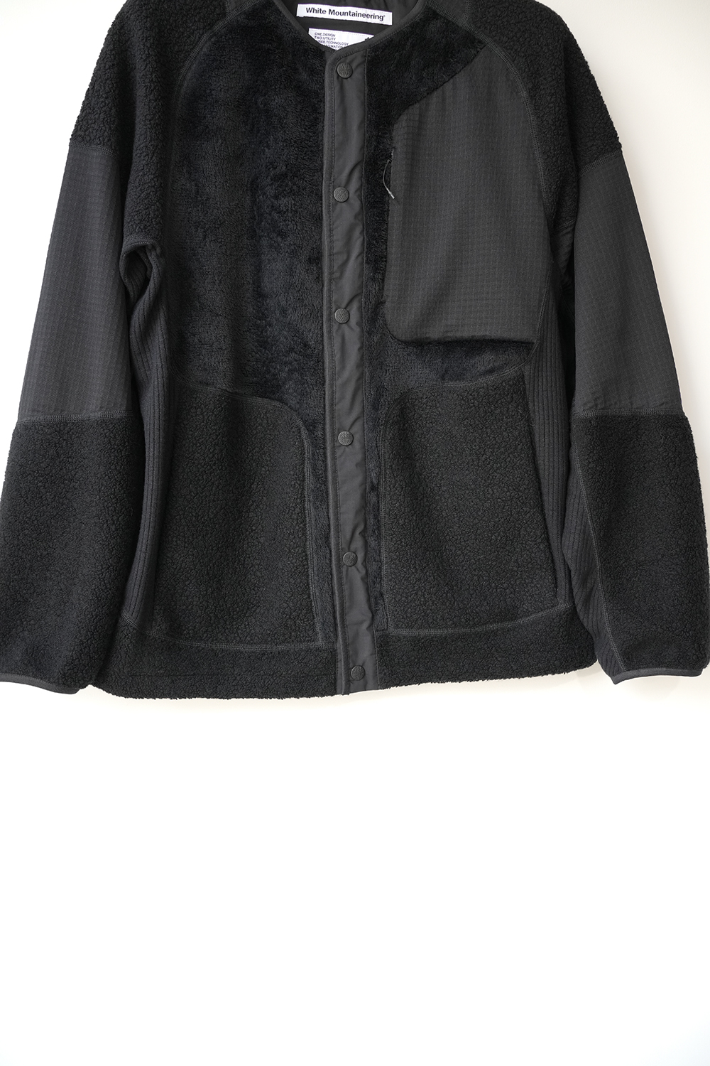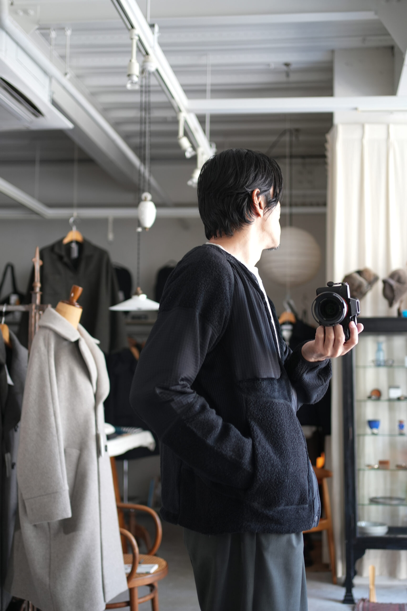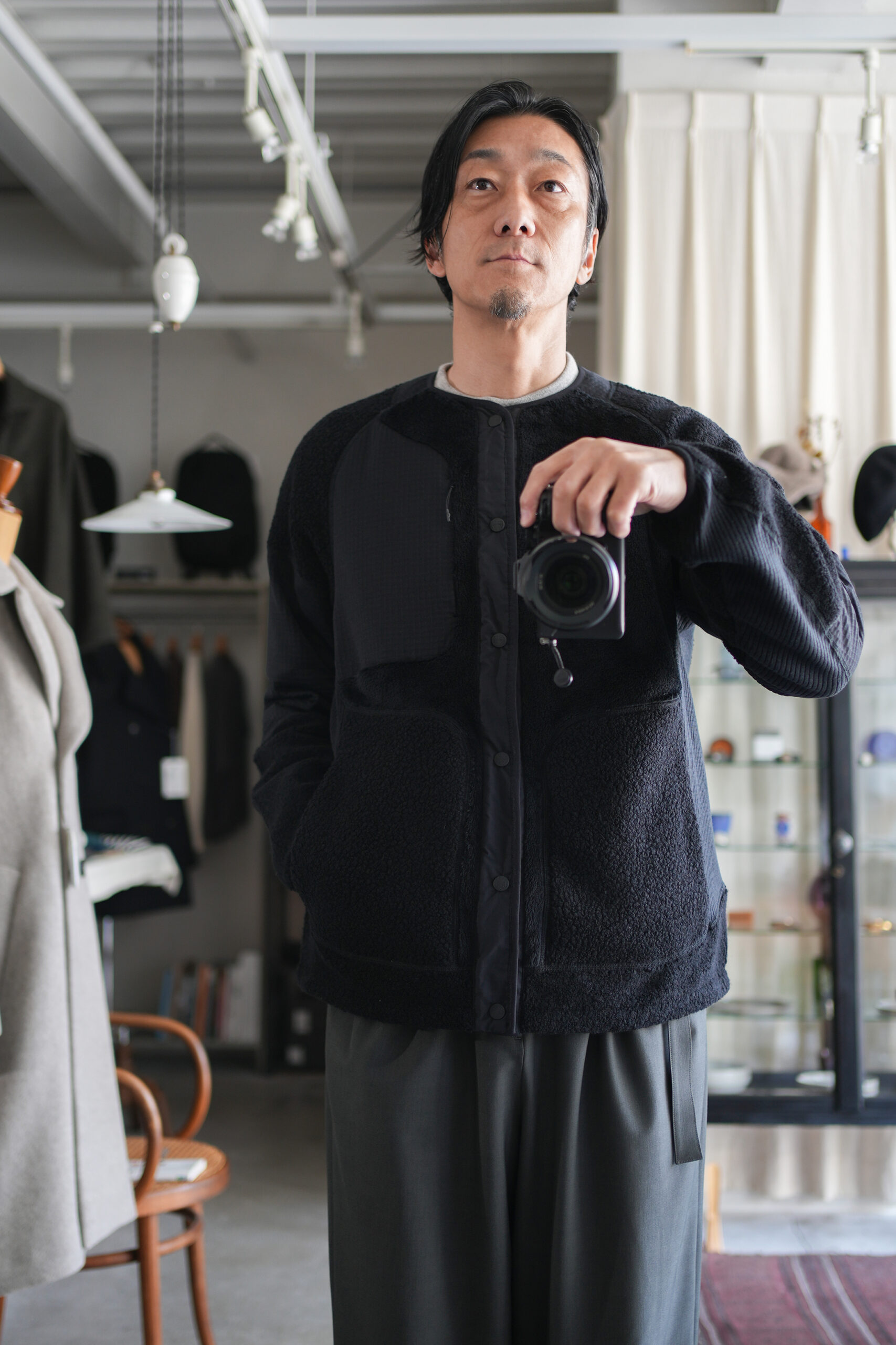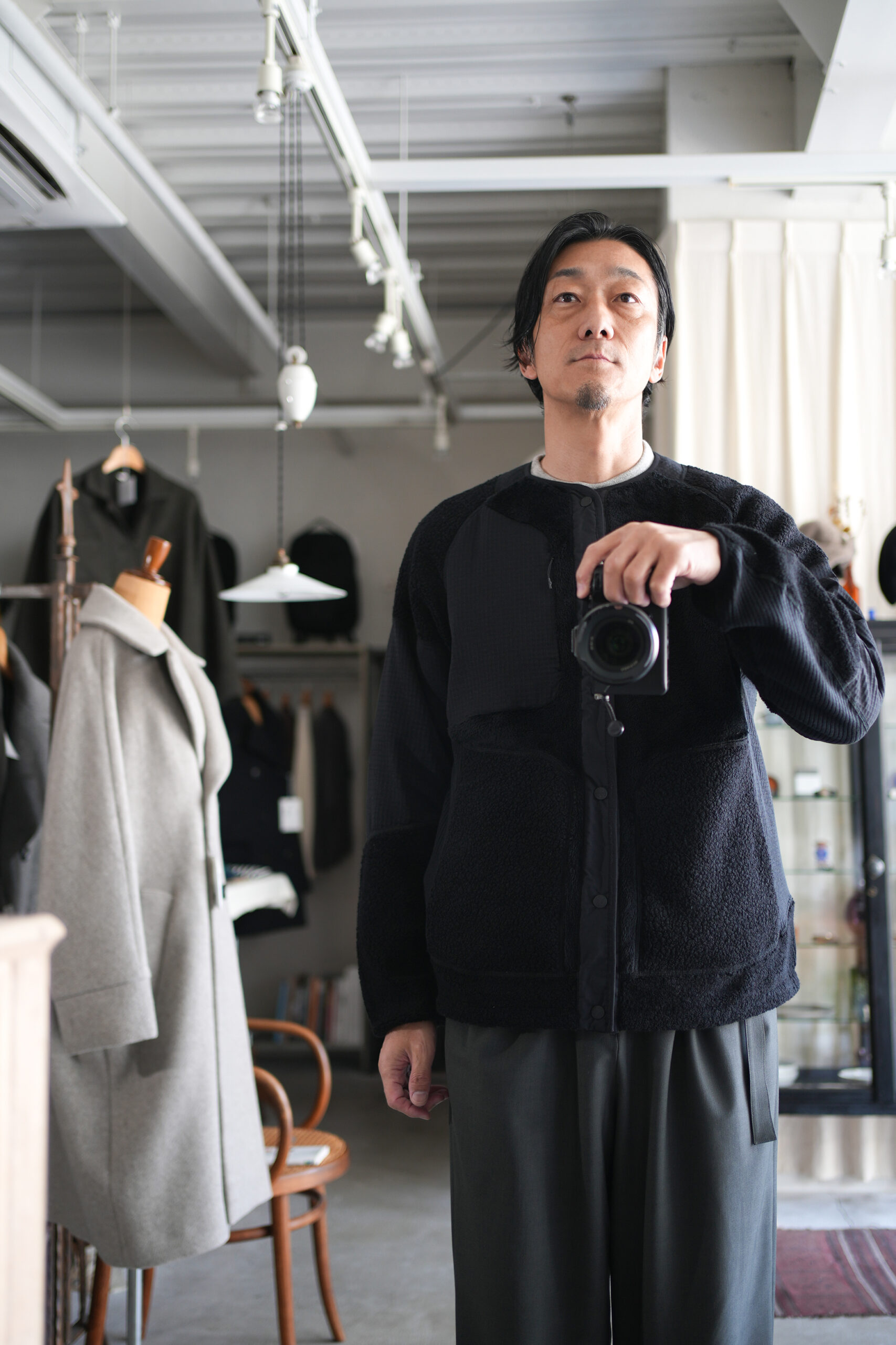フリース素材のノーカラーブルゾン、身頃、アームホールにゆとりあるリラックスシルエット、毛足と質感異なる2種のフリースをパッチワークデザインで切り替え。アウターとしても中間着としても活躍するアイテムです。