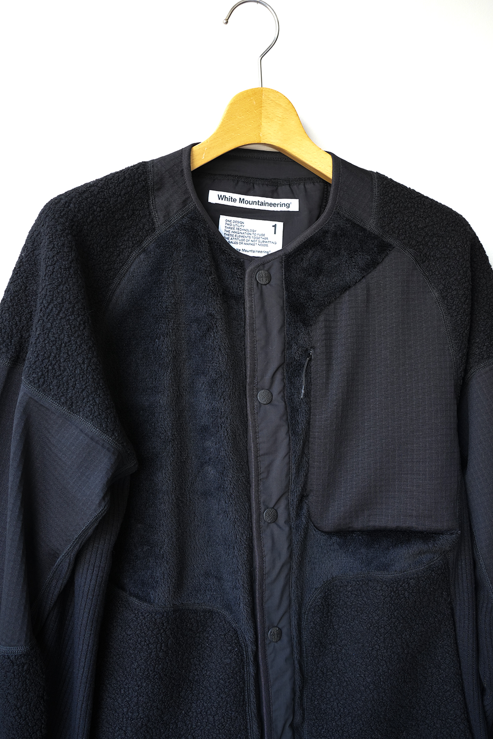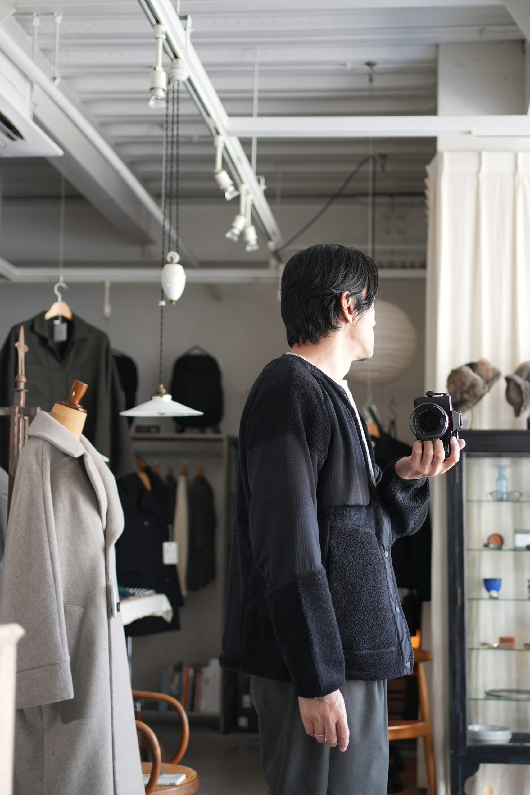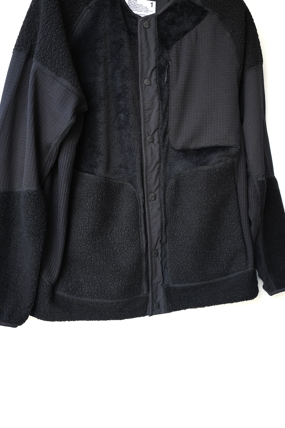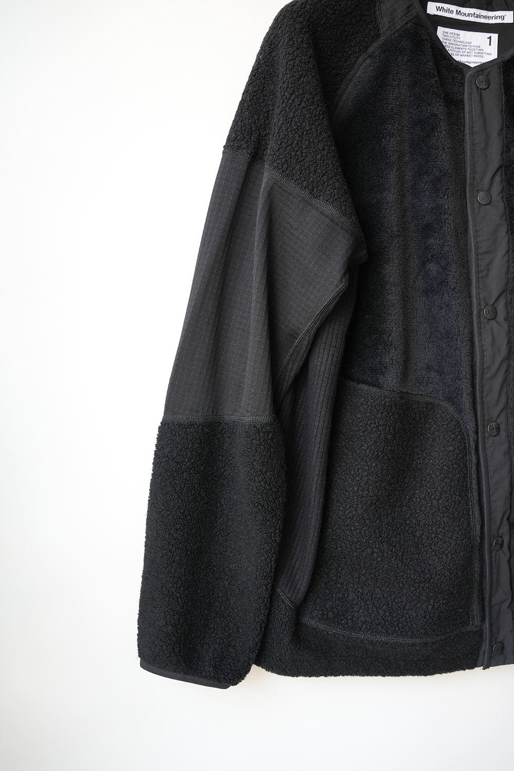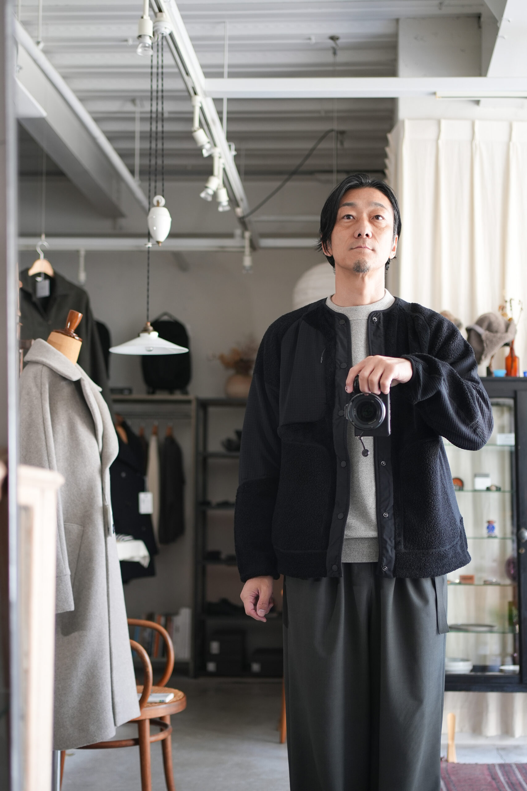 フリース素材のノーカラーブルゾン、身頃、アームホールにゆとりあるリラックスシルエット、毛足と質感異なる2種のフリースをパッチワークデザインで切り替え。アウターとしても中間着としても活躍するアイテムです。