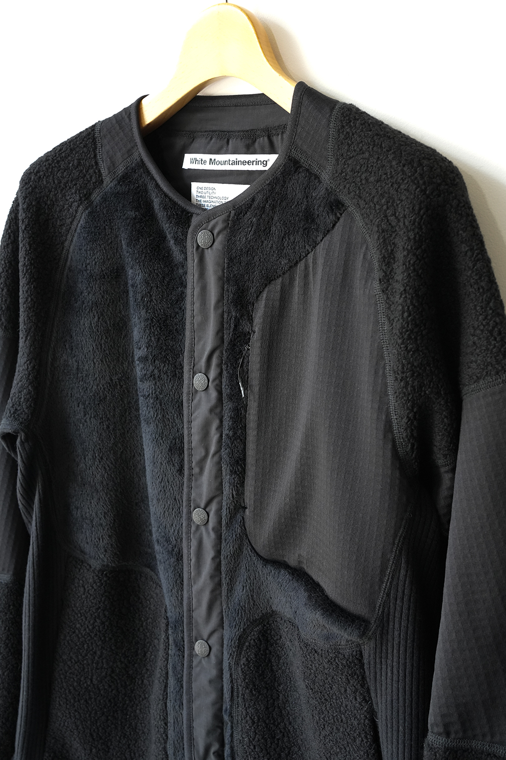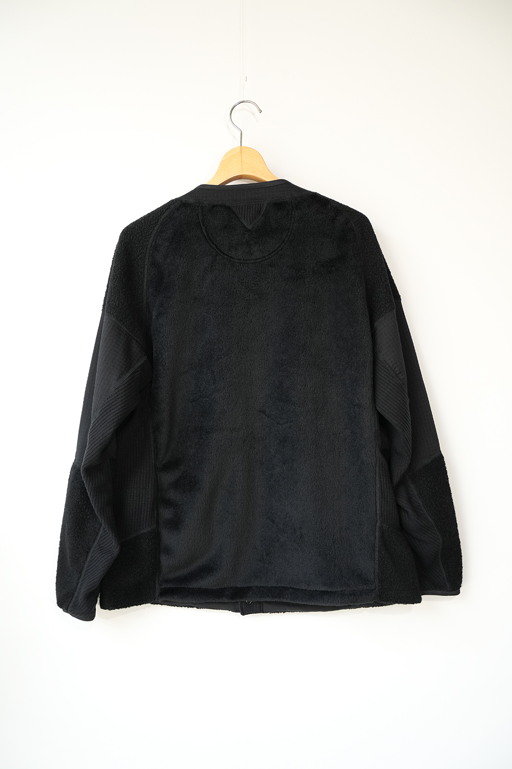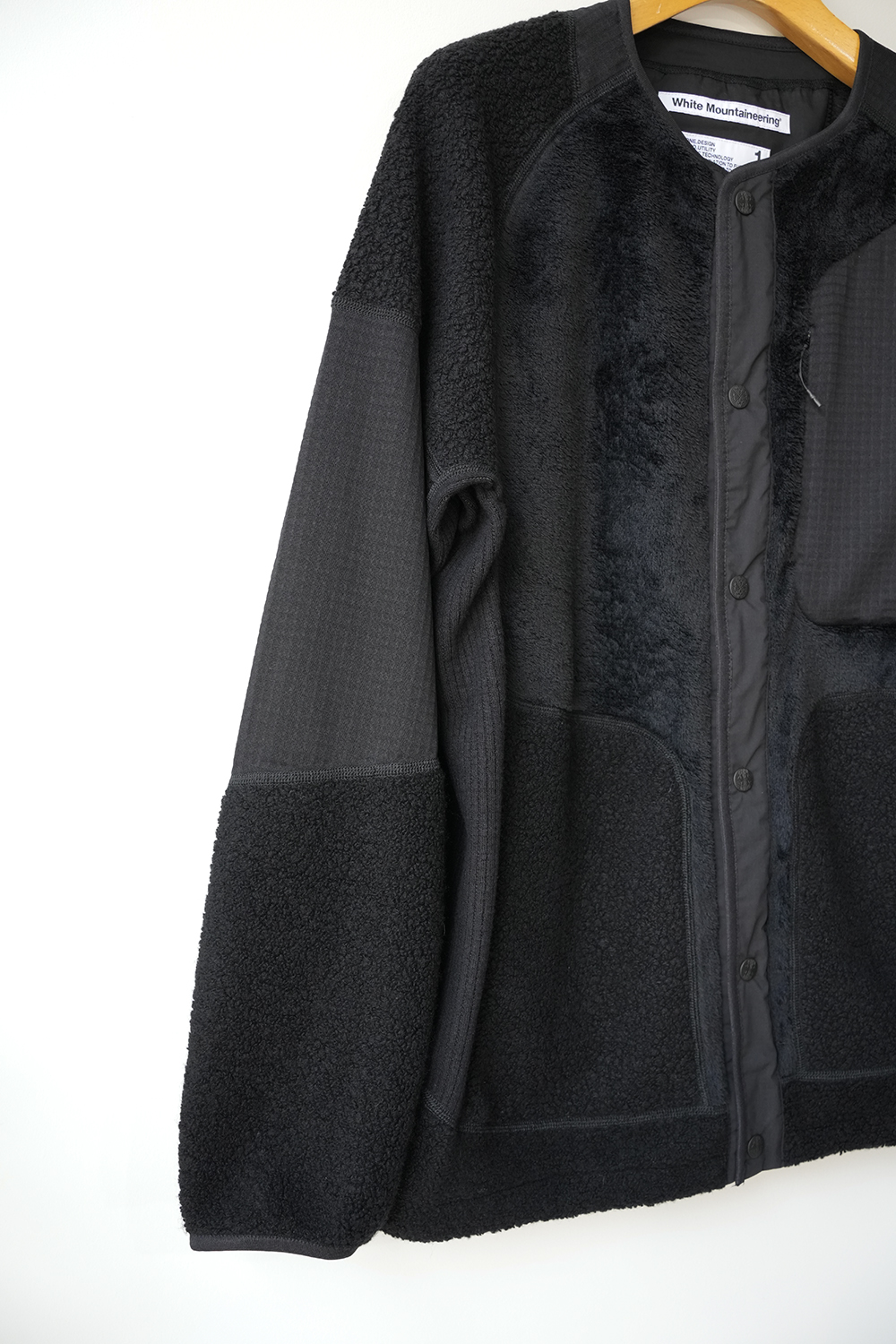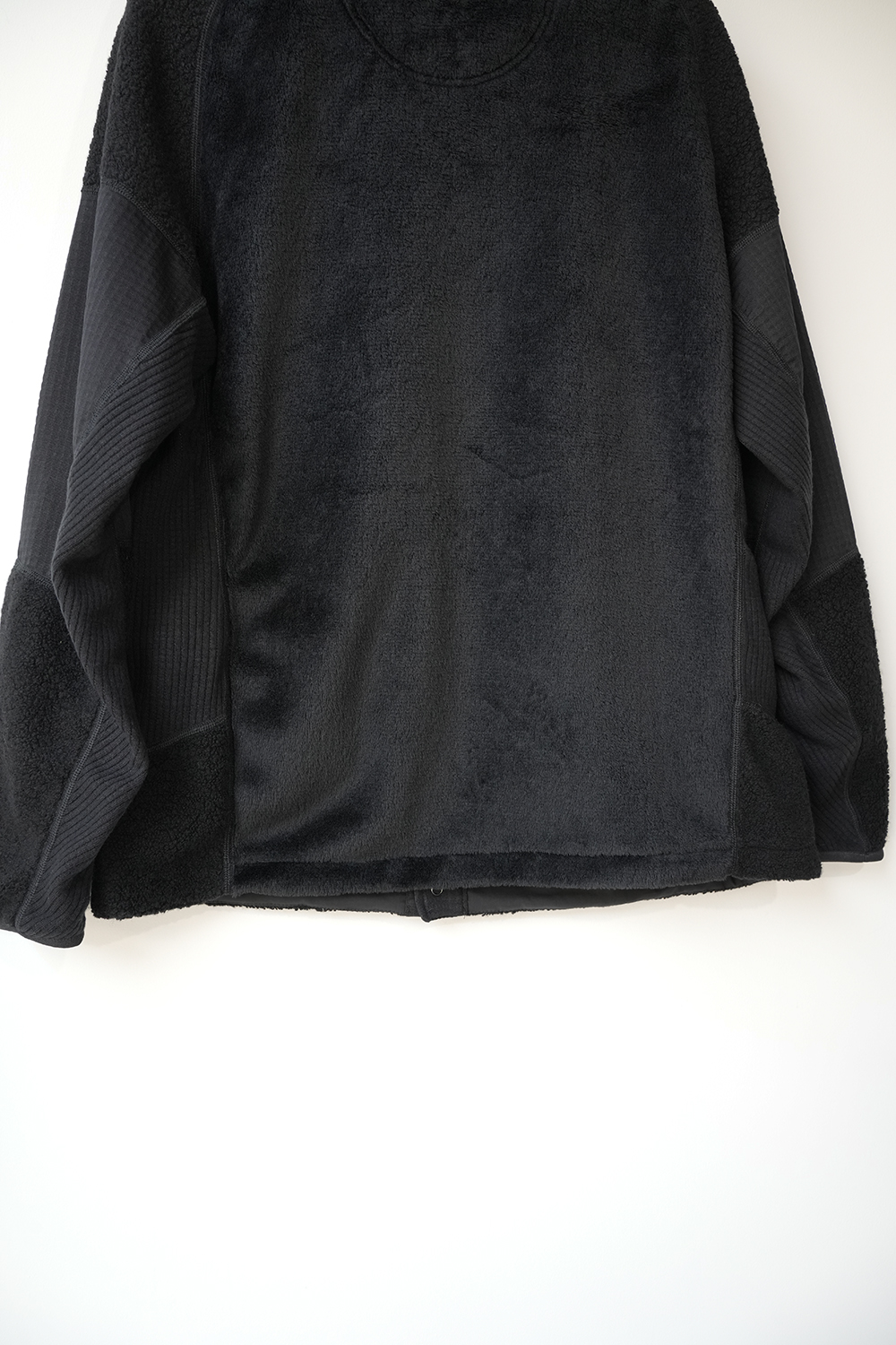 フリース素材のノーカラーブルゾン、身頃、アームホールにゆとりあるリラックスシルエット、毛足と質感異なる2種のフリースをパッチワークデザインで切り替え。アウターとしても中間着としても活躍するアイテムです。