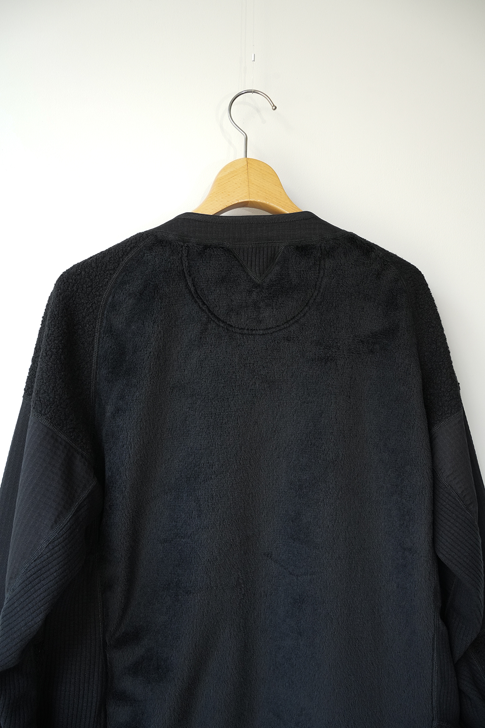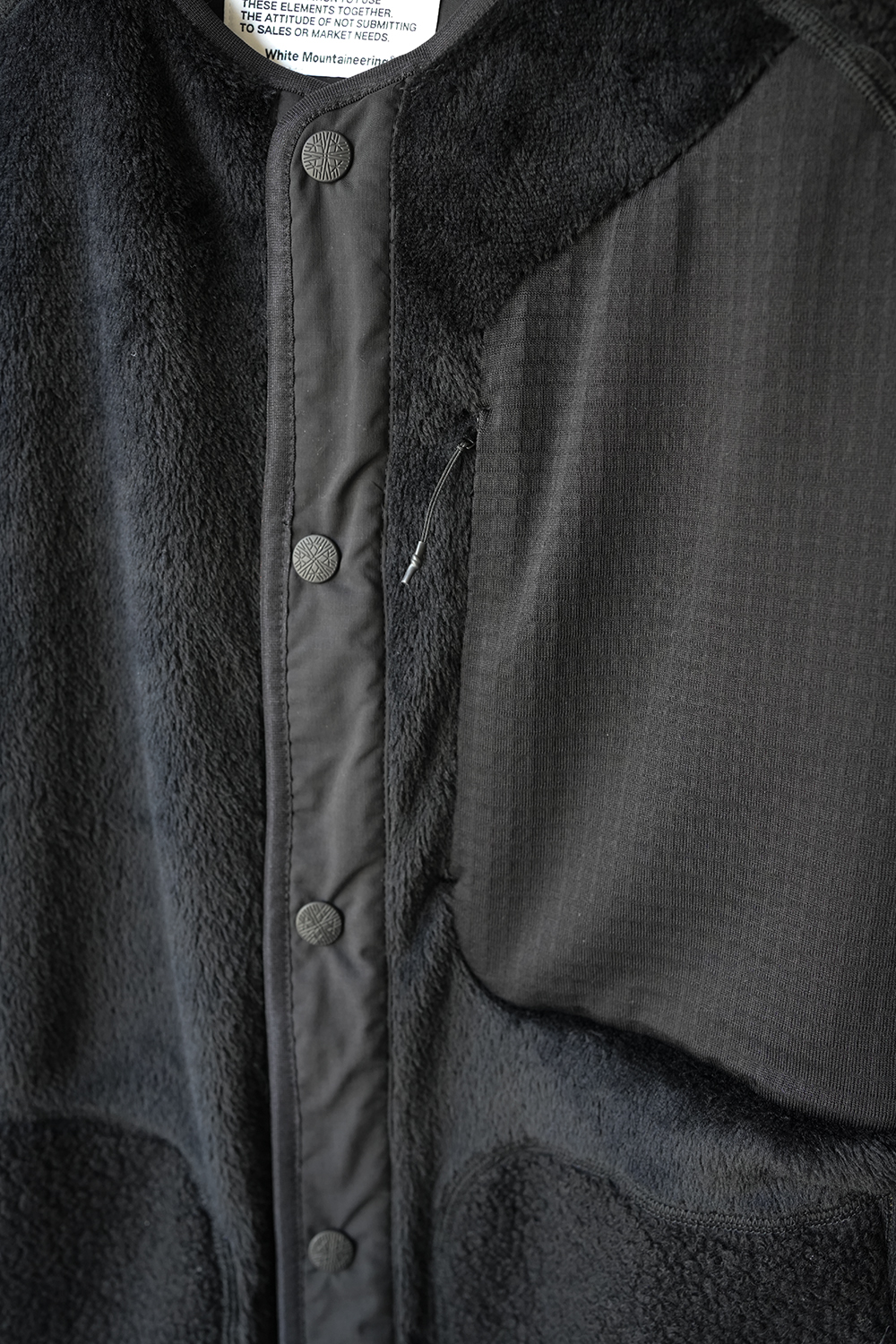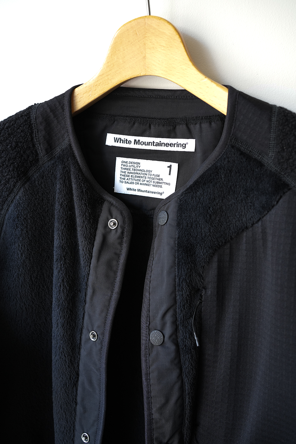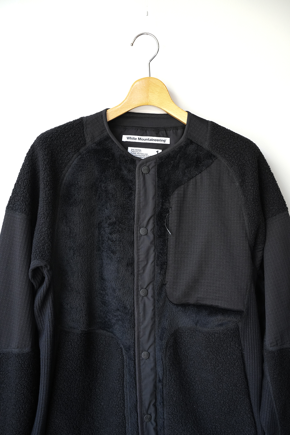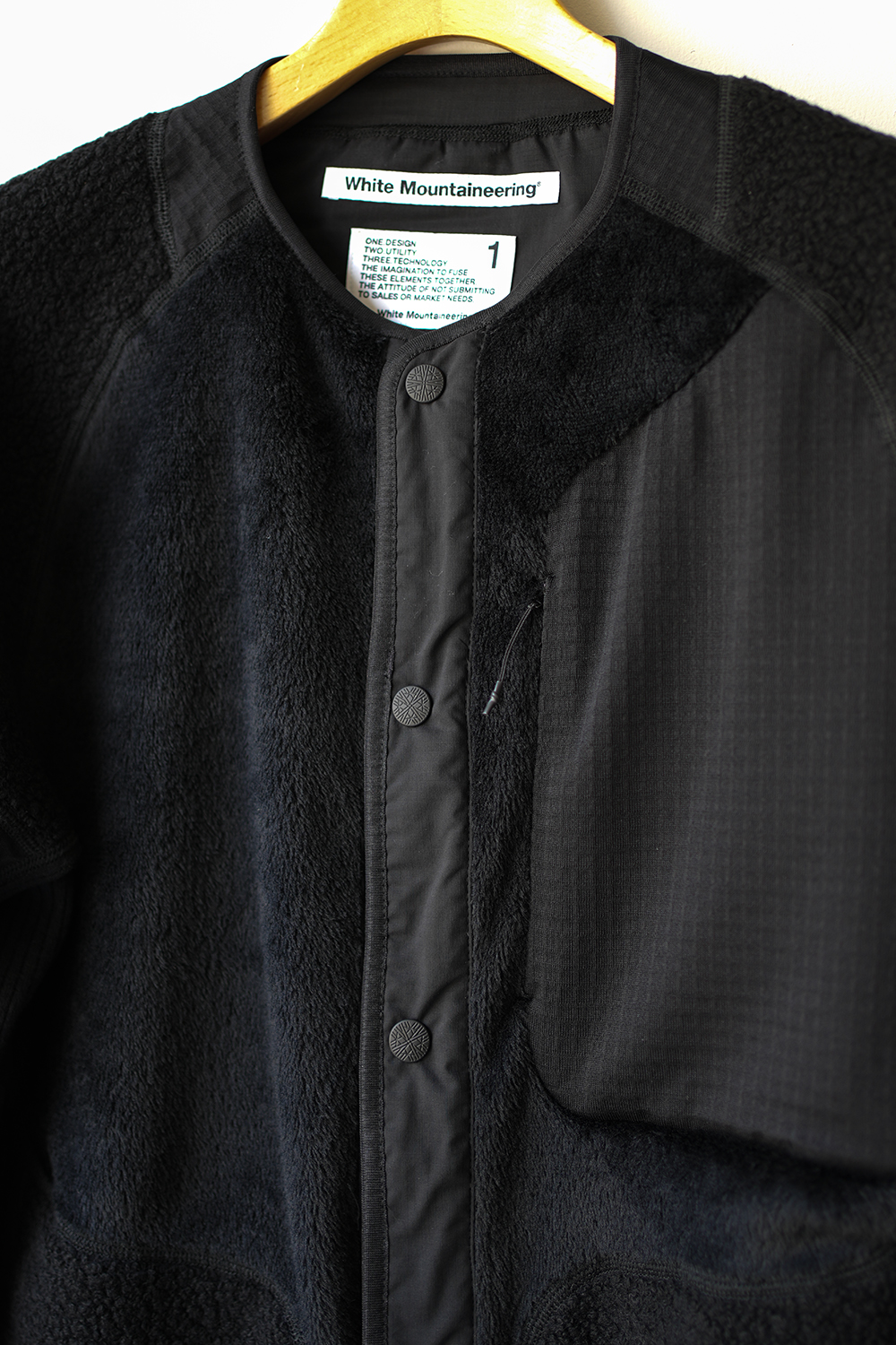 フリース素材のノーカラーブルゾン、身頃、アームホールにゆとりあるリラックスシルエット、毛足と質感異なる2種のフリースをパッチワークデザインで切り替え。アウターとしても中間着としても活躍するアイテムです。
