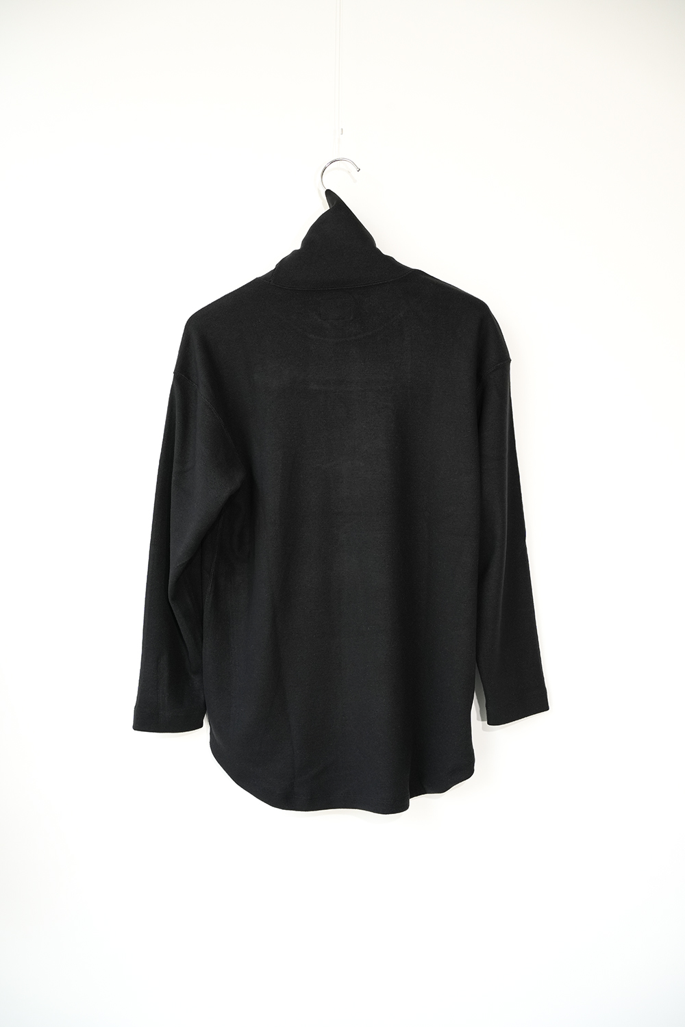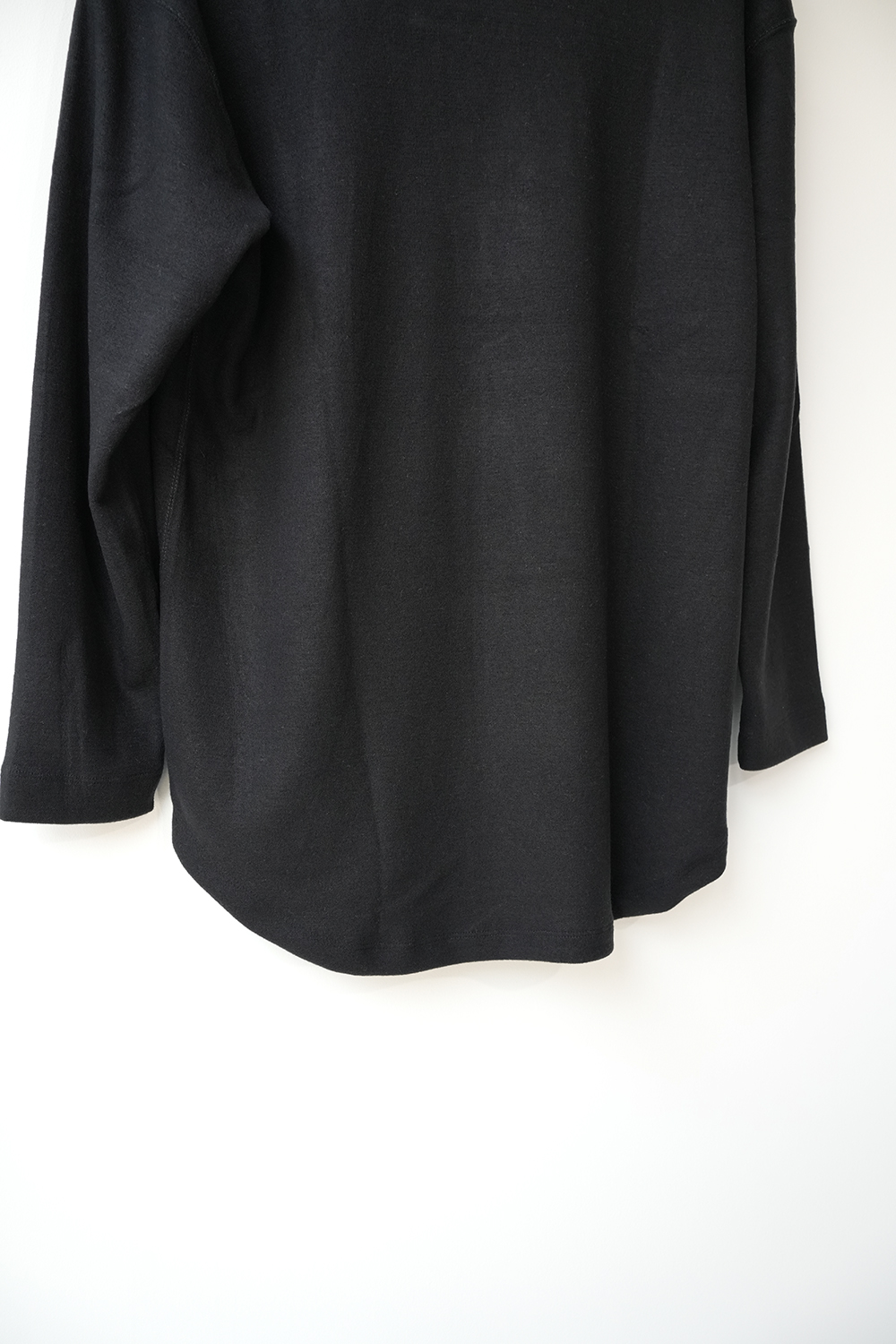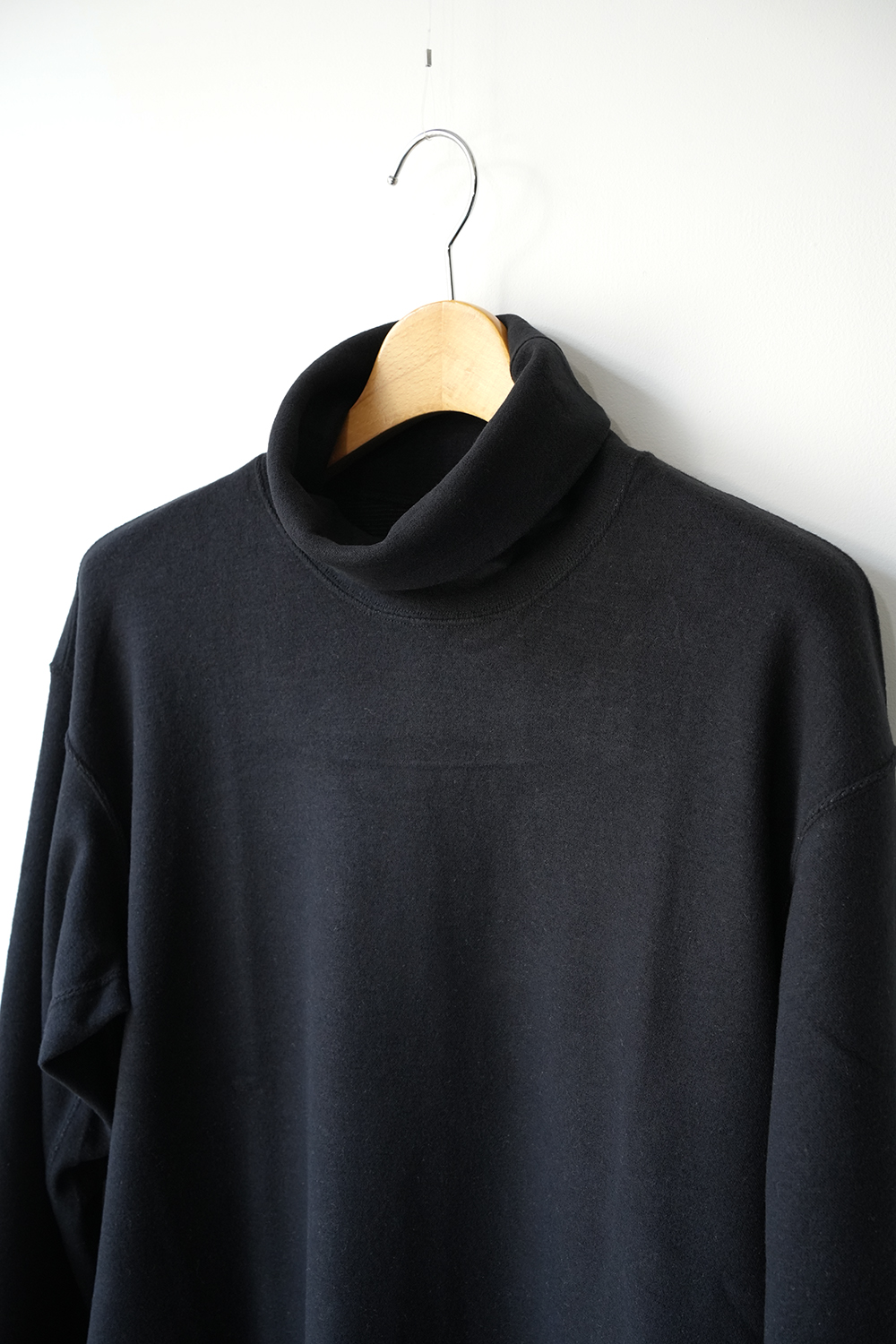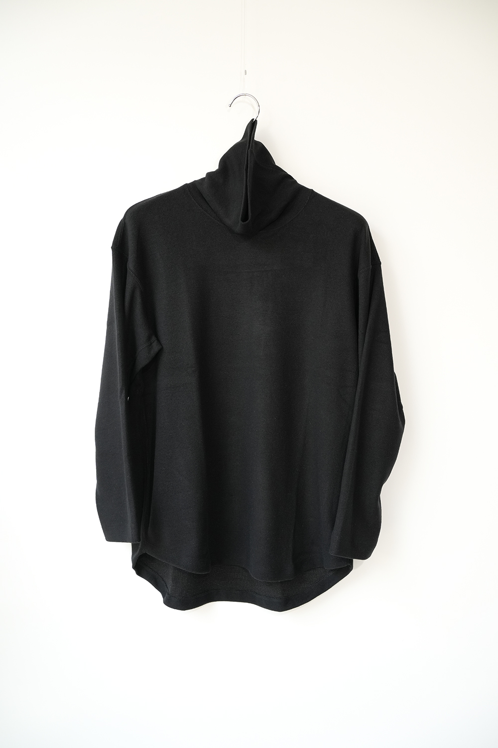 三菱レイヨン(株)の機能素材プレミアウォーム®︎を用いたタートルネックのロングスリーブTシャツ。肌触りの優れたマイクロ抗ピルアクリルを用いたストレッチジャージーは湿気や汗を熱に変えて保温する機能を持ち、温かさは保ちつつも余分な湿気は逃すので、サラッとした快適さが保たれます。また表面を起毛することで柔らかな肌触りに仕上げています。インナー用途がメインではありますが、タイトフィットにはしていないので一枚でも着用可能。数シーズンマイナーチェンジを繰り返しながらも継続展開されているCURLY&Co.の定番アイテム、タートルネックモデル。