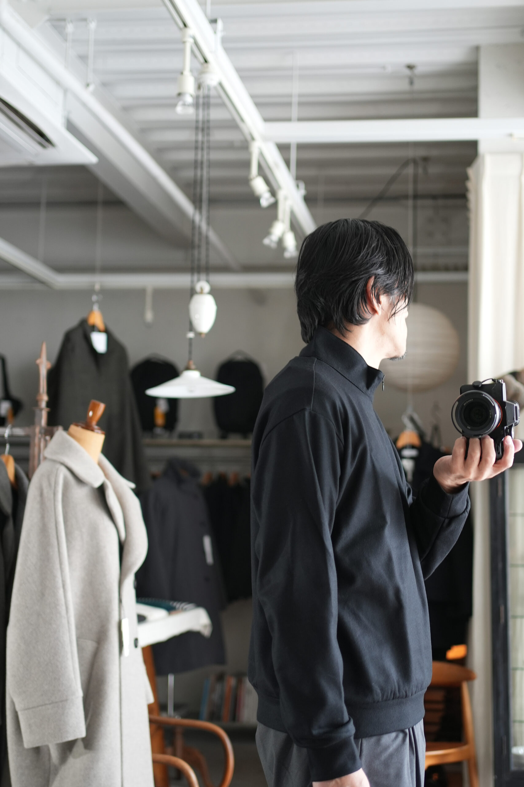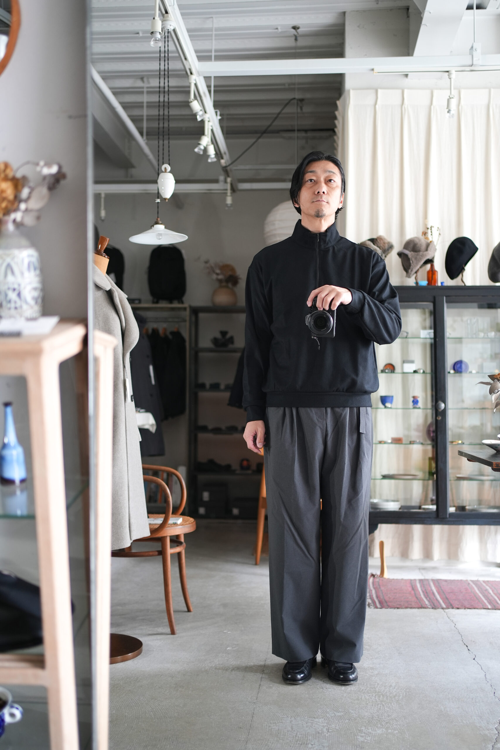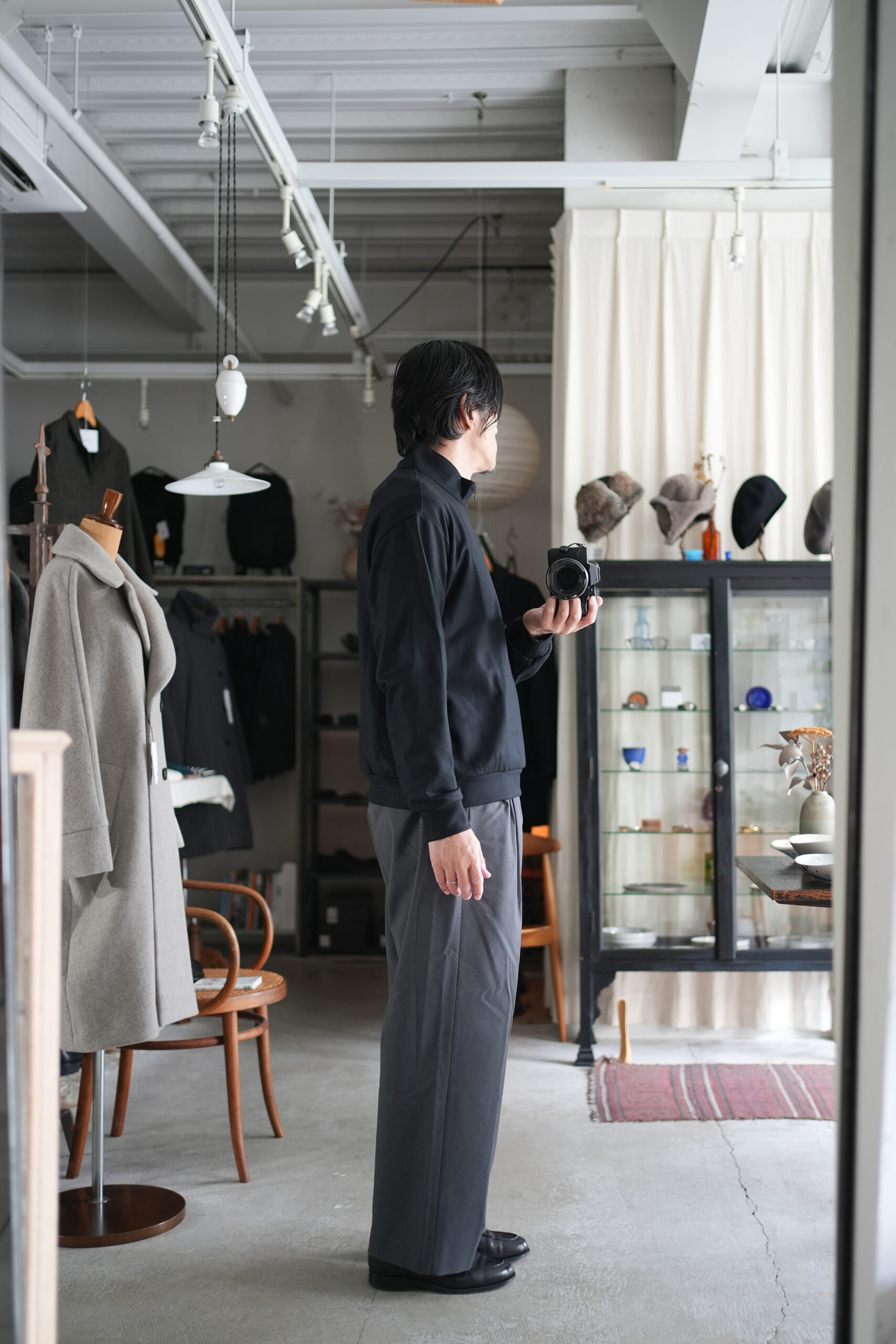 過去に展開していた型をブラッシュアップして復刻した、「Half Zip Stand Collar」。オーバーサイズではなく、肩をわずかに落としつつもすっきりと着られるバランスに仕上げています。襟は天幅と前下がりをやや狭めに設計し、首に沿うような上品なラインを形成。ファスナーには小ぶりなサイズを採用し、ミニマルで洗練された印象に仕上げています。カシミヤクラスの滑らかなタッチとぬめりのある肌触りを持つ、スーパー140ウール天竺を使用した高級カットソー。上質な原料が生む自然な艶感が際立ち、ハーフジップというカジュアルなデザインを上品に昇華しています。すっきりとしたスタンドカラーが素材の美しさを引き立て、ミルド(縮絨)加工によってフラットで上品な表情に仕上げられた、大人のための一着です。表地には、上質なスーパー140ウール天竺を採用。非常に細く柔らかな原料を使用しており、ぬめりのある滑らかな肌触りはカシミヤにも匹敵します。ミルド(縮絨)加工を施しながらも、表面をフラットに整えることでカジュアル感を抑え、上品な艶を実現。ウール本来の光沢としなやかさが際立つ、高級感のある素材です。