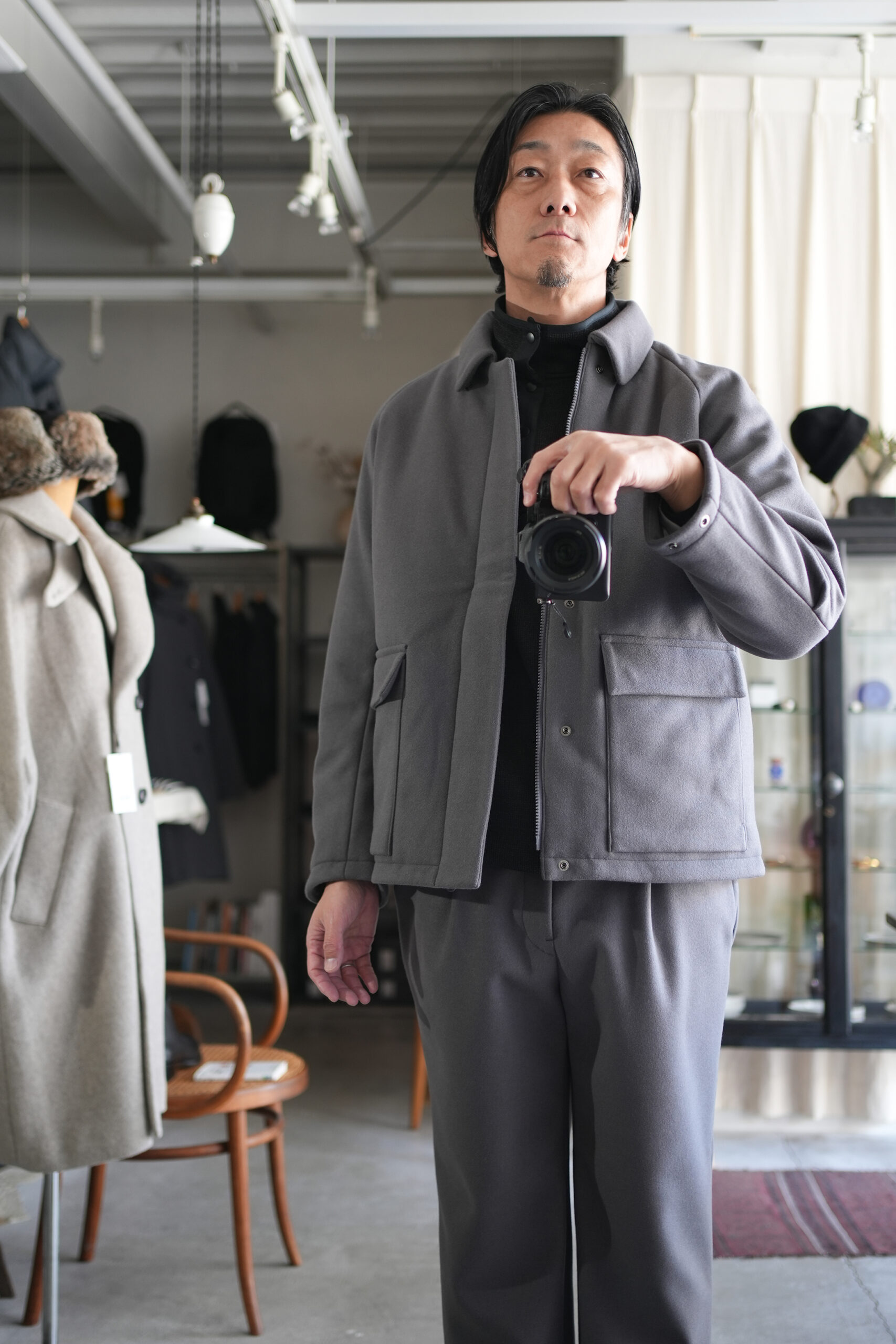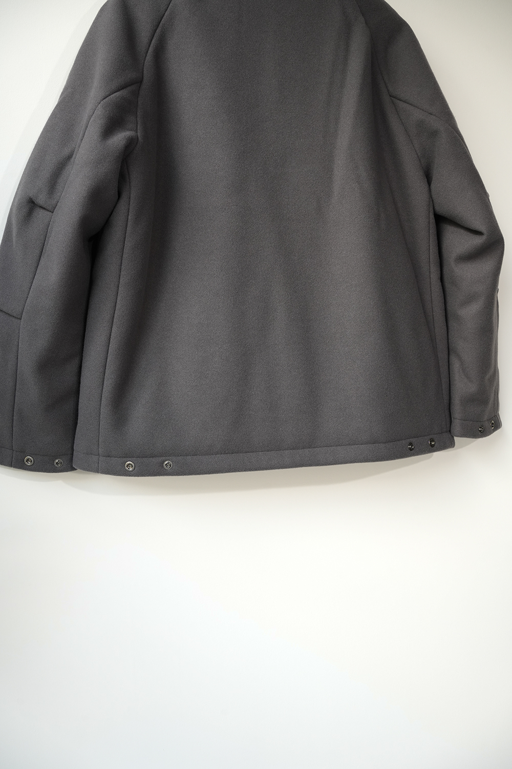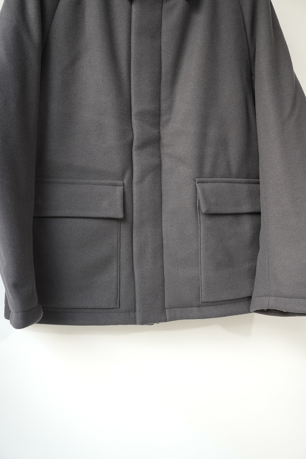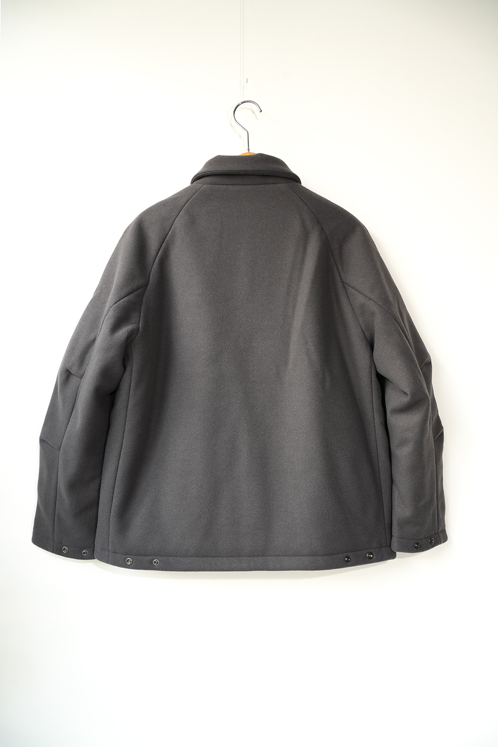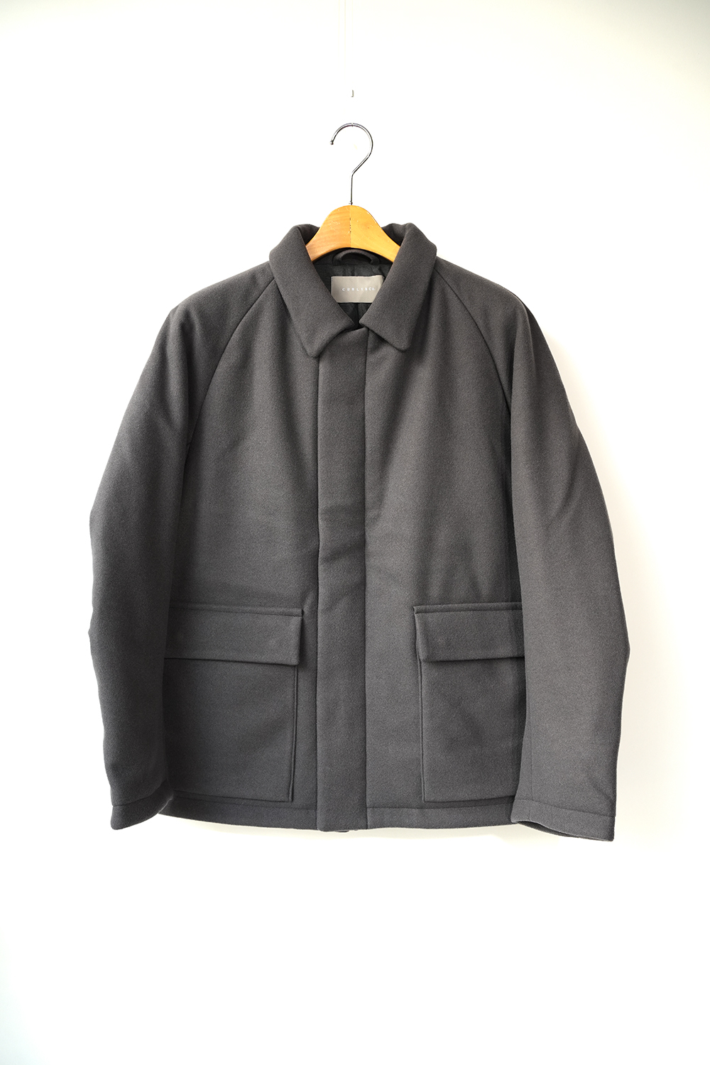 メルトンライクな中肉ジャージーを用いたジップアップパフジャケット。吸湿発熱機能のあるリサイクルポリエステルをベースに、レーヨンとアクリルをブレンドする事でソフトな仕上がりになっています。中綿には発熱、蓄熱性、静電気抑止性の高い機能性素材コアブリッド™️を使用。シンプルなショート〜ミドル丈のラグランスリーブ、フロントはジップ+ドットボタンでダブル防寒仕様、ジップは軽量化のため樹脂製を使用しています。ウエストのフラップ付きパッチポケットには上からも横からも手が入れられます。襟はスナップダウン仕様なので落ち着きも良く、ドットボタンを全て隠したミニマルな仕上がりは、どんなコーディネートにも馴染みます。身頃裾も袖口もストレートなラインに仕上げていますが風や冷気が強い時はドットボタンを閉じてご着用ください。左胸内側にはジップ付きのシーム内ポケット、右身頃裏の裾には大きめのパッチ内ポケット付き。