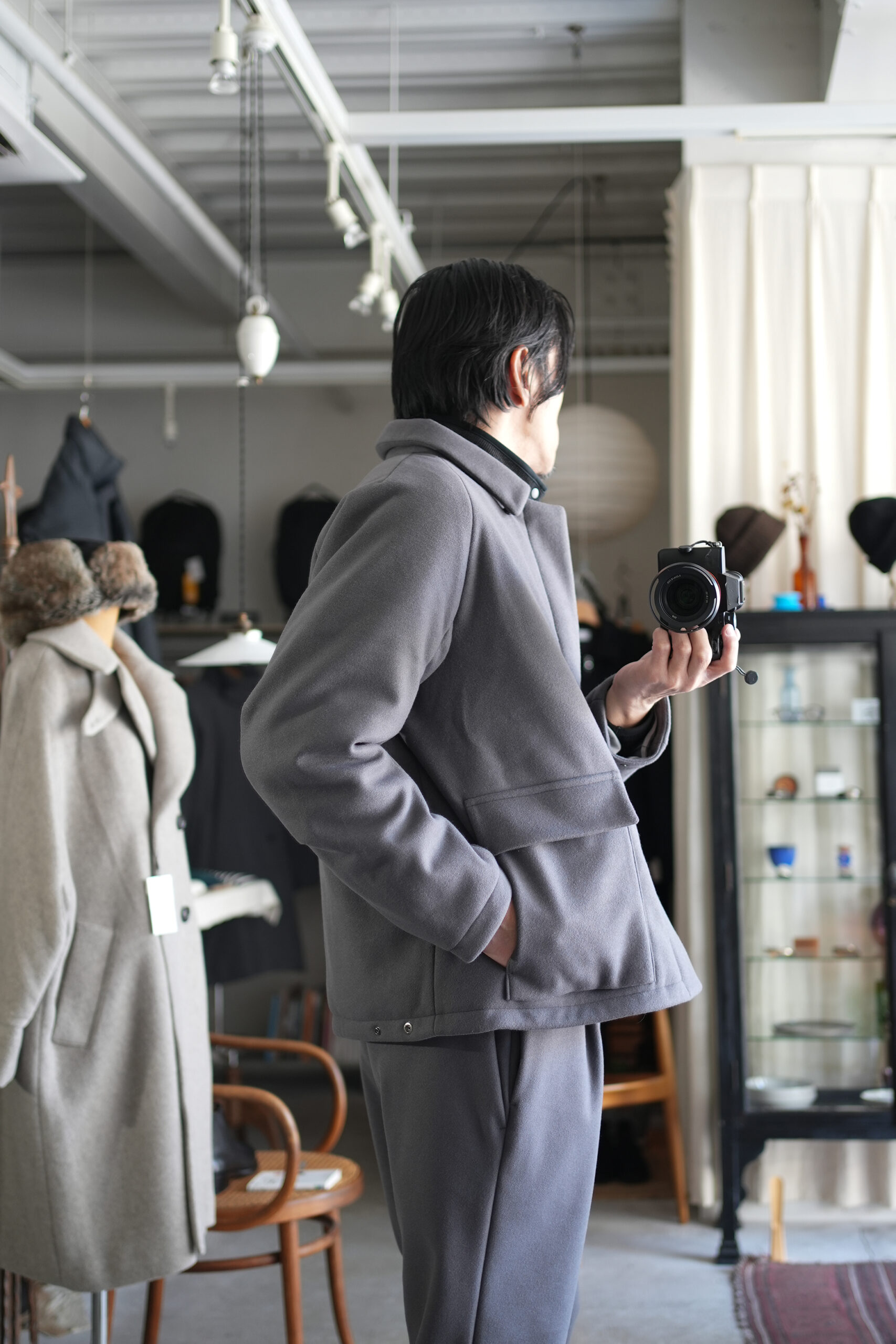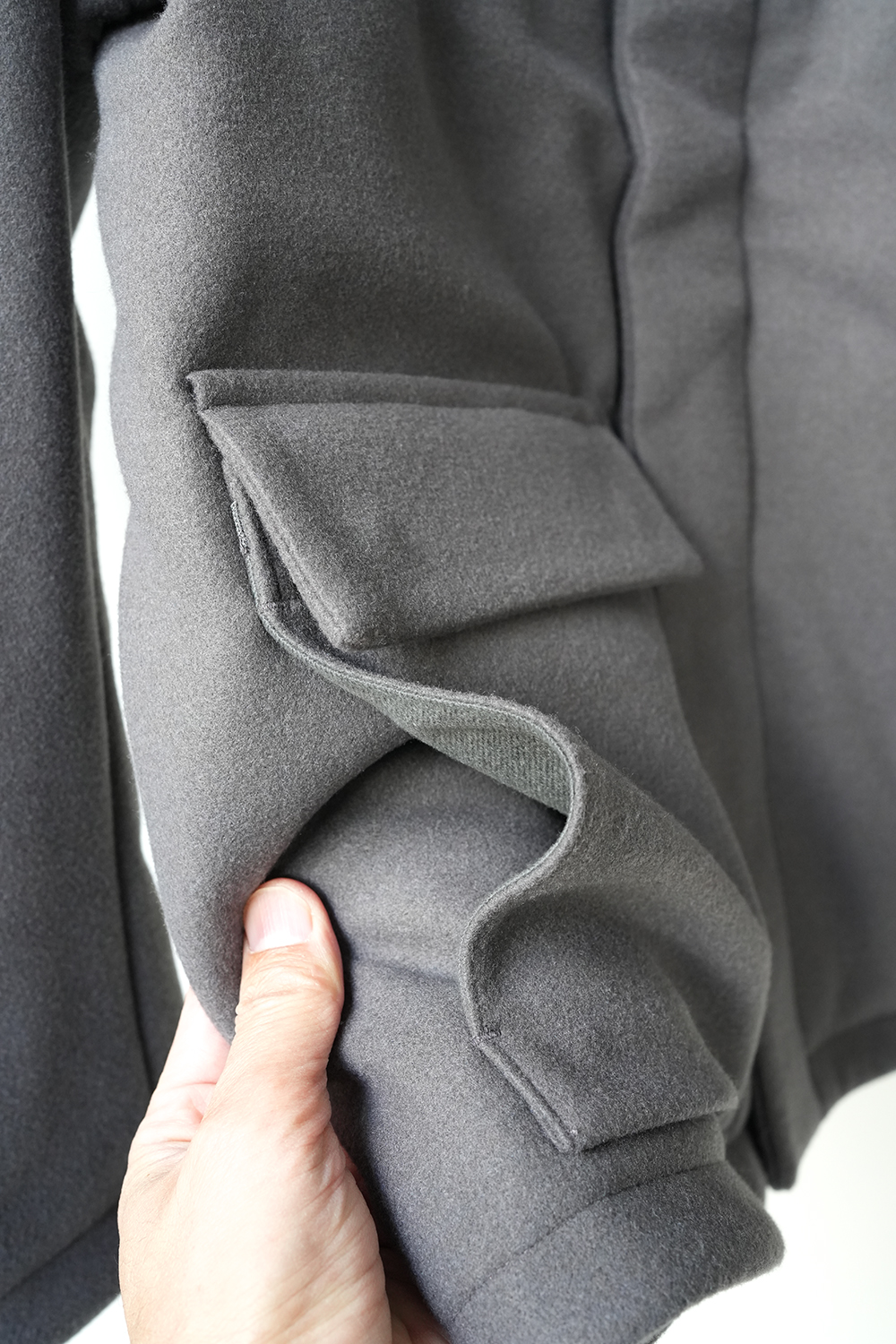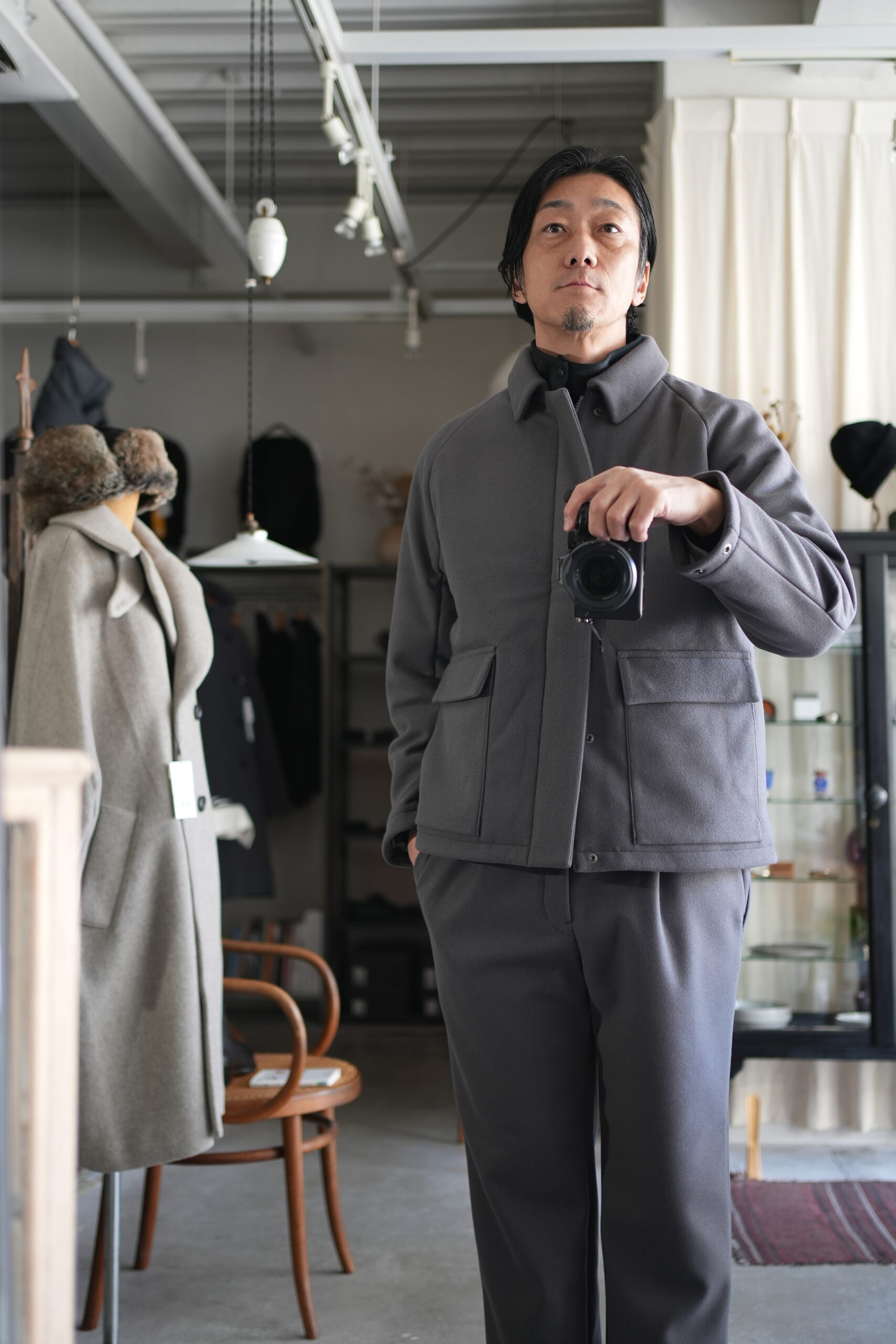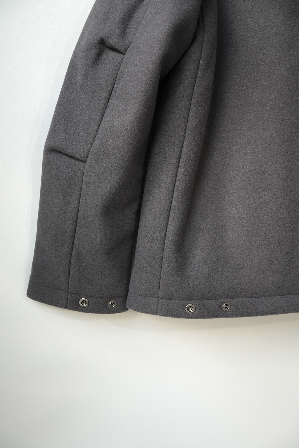 メルトンライクな中肉ジャージーを用いたジップアップパフジャケット。吸湿発熱機能のあるリサイクルポリエステルをベースに、レーヨンとアクリルをブレンドする事でソフトな仕上がりになっています。中綿には発熱、蓄熱性、静電気抑止性の高い機能性素材コアブリッド™️を使用。シンプルなショート〜ミドル丈のラグランスリーブ、フロントはジップ+ドットボタンでダブル防寒仕様、ジップは軽量化のため樹脂製を使用しています。ウエストのフラップ付きパッチポケットには上からも横からも手が入れられます。襟はスナップダウン仕様なので落ち着きも良く、ドットボタンを全て隠したミニマルな仕上がりは、どんなコーディネートにも馴染みます。身頃裾も袖口もストレートなラインに仕上げていますが風や冷気が強い時はドットボタンを閉じてご着用ください。左胸内側にはジップ付きのシーム内ポケット、右身頃裏の裾には大きめのパッチ内ポケット付き。