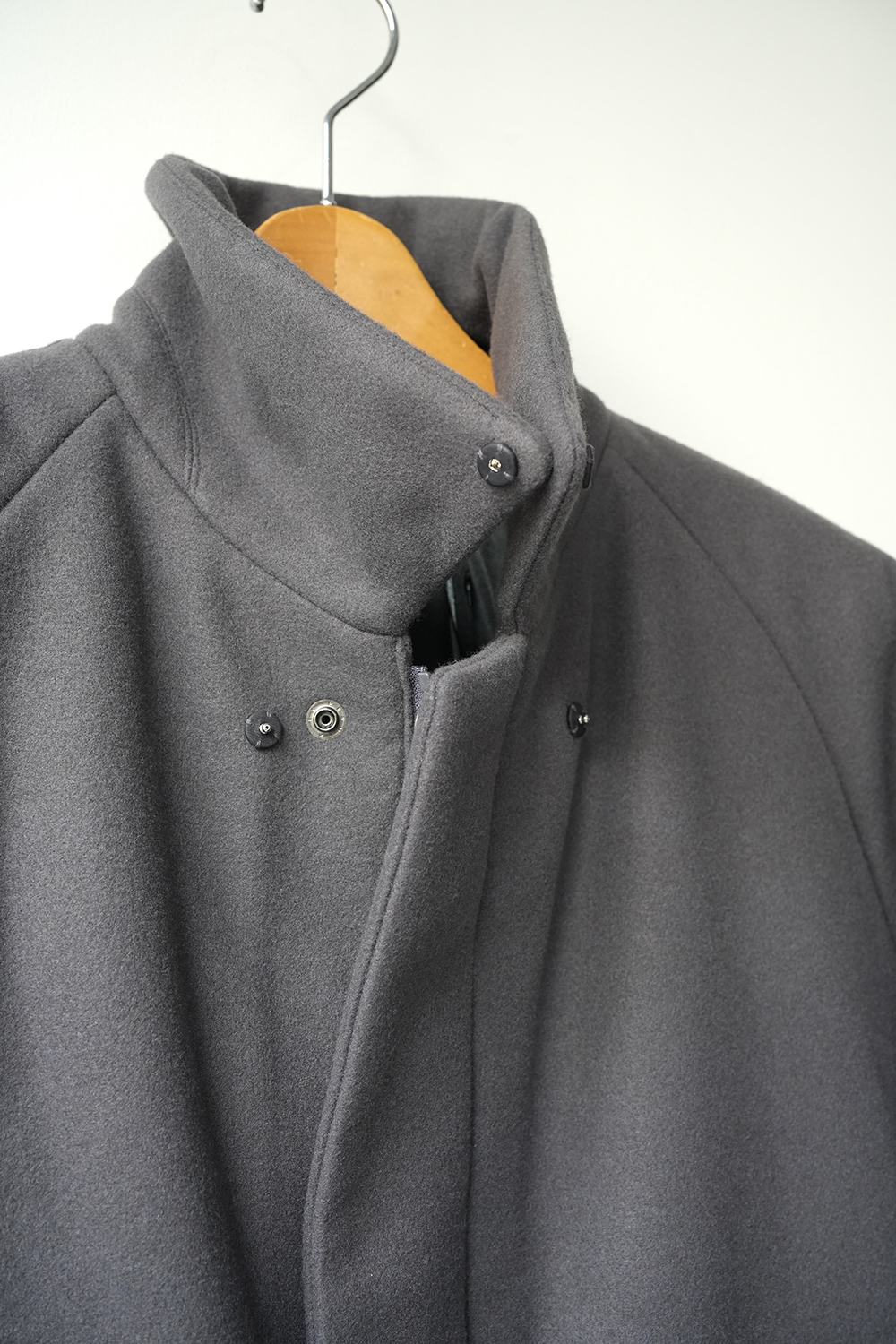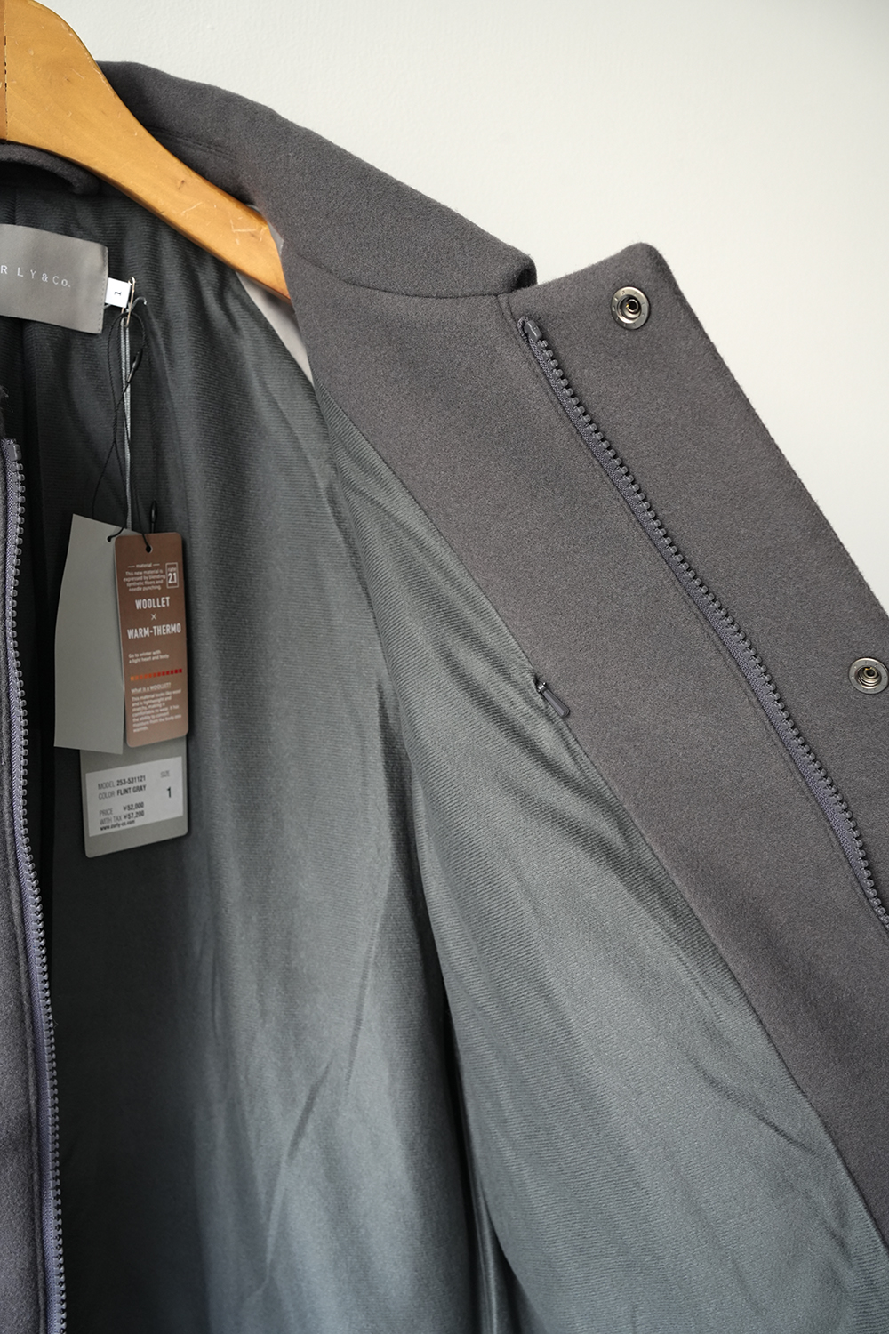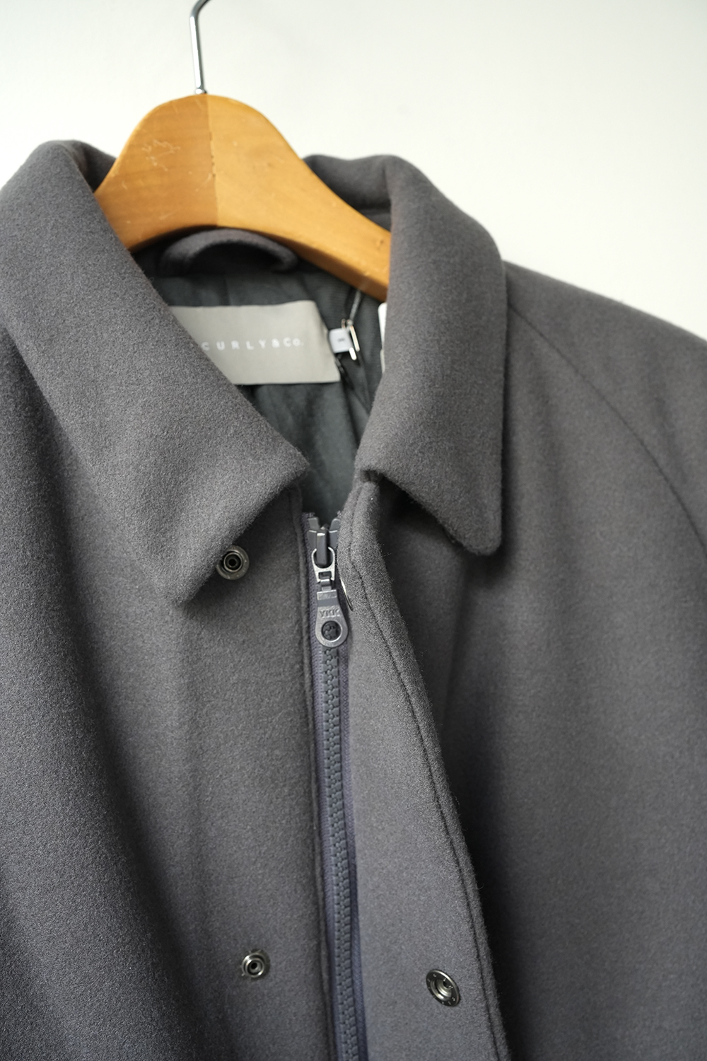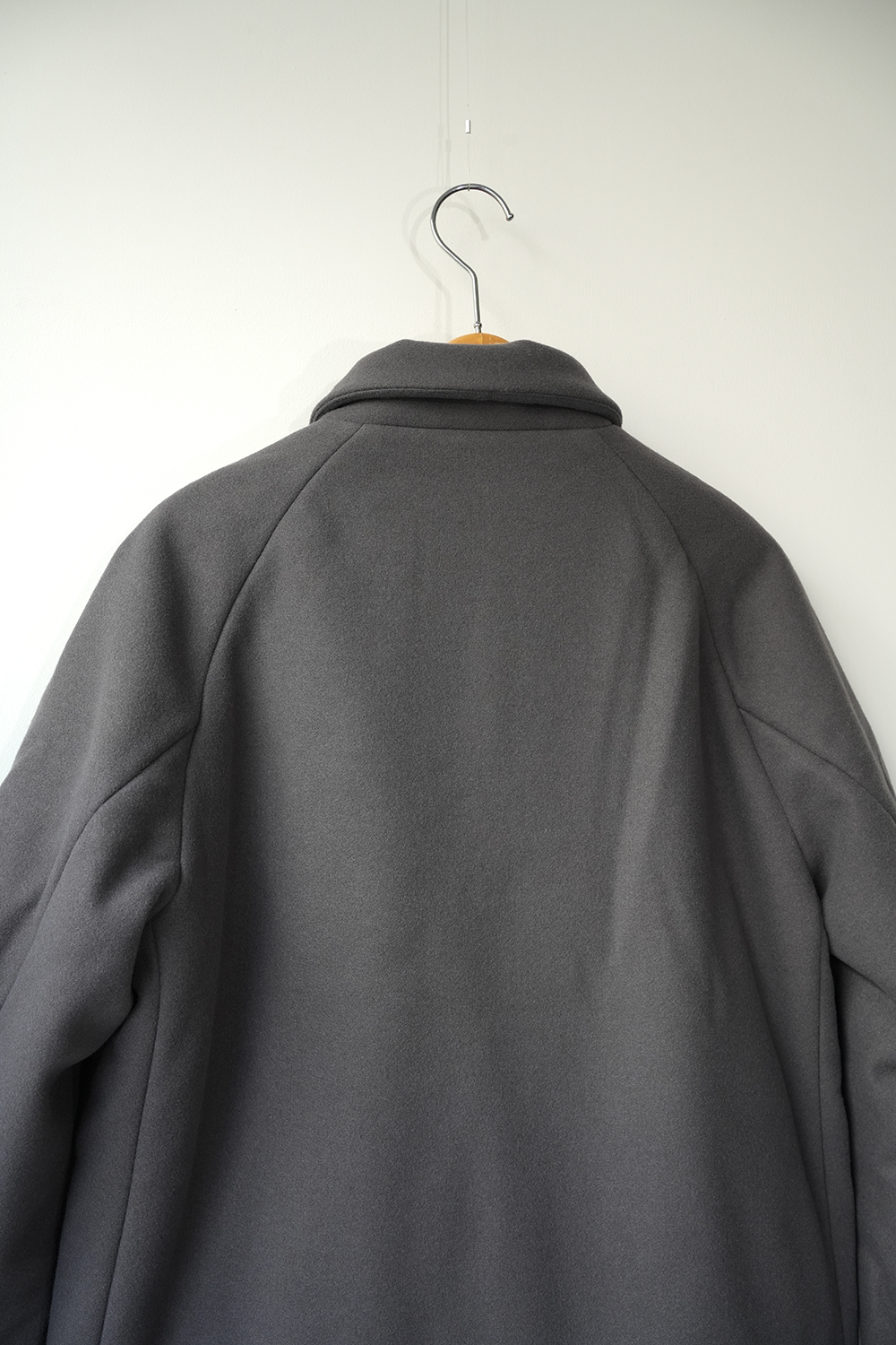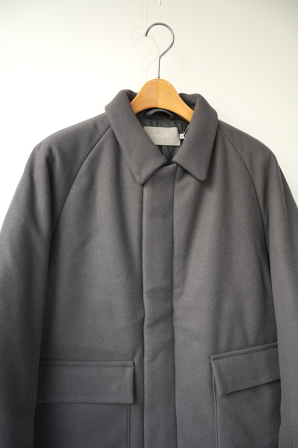 メルトンライクな中肉ジャージーを用いたジップアップパフジャケット。吸湿発熱機能のあるリサイクルポリエステルをベースに、レーヨンとアクリルをブレンドする事でソフトな仕上がりになっています。中綿には発熱、蓄熱性、静電気抑止性の高い機能性素材コアブリッド™️を使用。シンプルなショート〜ミドル丈のラグランスリーブ、フロントはジップ+ドットボタンでダブル防寒仕様、ジップは軽量化のため樹脂製を使用しています。ウエストのフラップ付きパッチポケットには上からも横からも手が入れられます。襟はスナップダウン仕様なので落ち着きも良く、ドットボタンを全て隠したミニマルな仕上がりは、どんなコーディネートにも馴染みます。身頃裾も袖口もストレートなラインに仕上げていますが風や冷気が強い時はドットボタンを閉じてご着用ください。左胸内側にはジップ付きのシーム内ポケット、右身頃裏の裾には大きめのパッチ内ポケット付き。