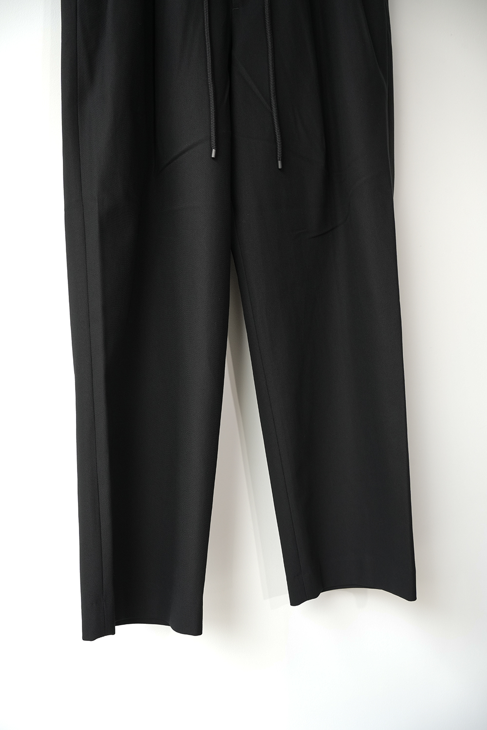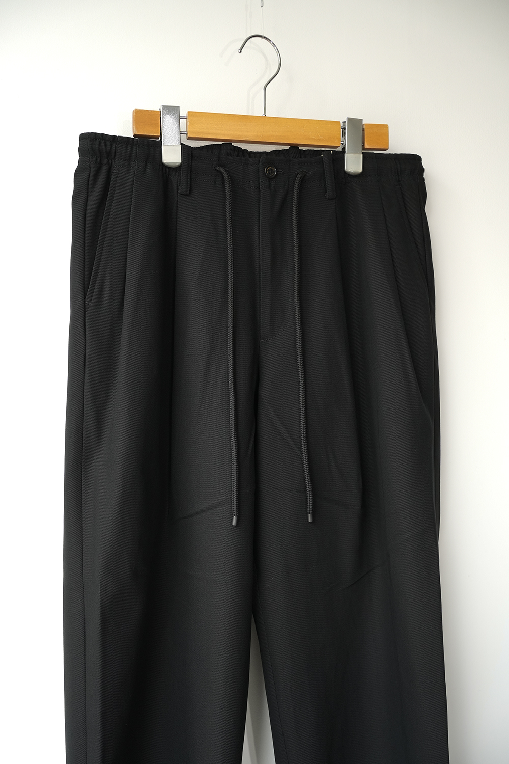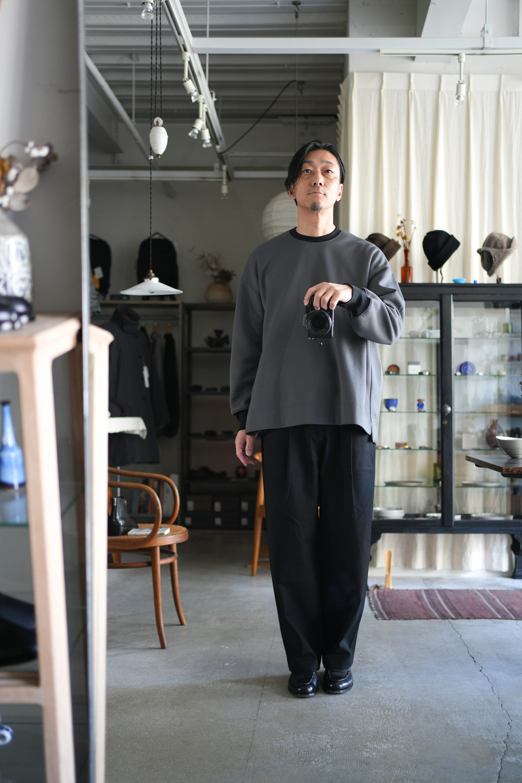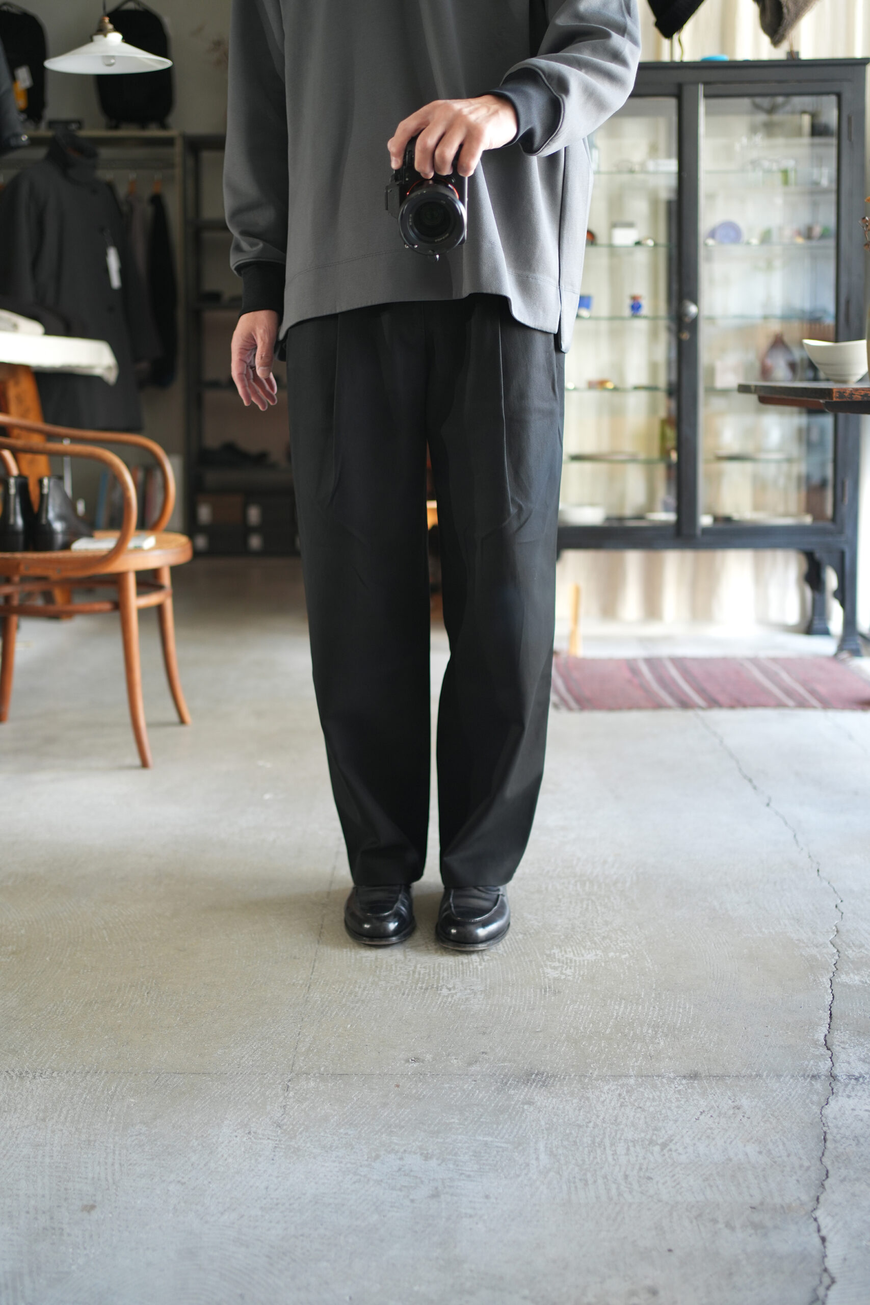ワイドでモダンなシルエットが魅力の「Double Pleated Easy Trousers」。フロントには2本のアウトタックを施し立体的なドレープが生まれます。裾にかけて緩やかにテーパードすることで、ワイドながらも洗練された大人のラインに仕上げました。正面とサイドで異なる印象を与える、視覚的なデザイン性もポイント。裾幅を広めに取ることで、しっかりとしたボリューム感も演出しています。ウエストはドローコード仕様のイージーパンツ型で、リラックスした穿き心地ながら、上品さを損なわない一本です。