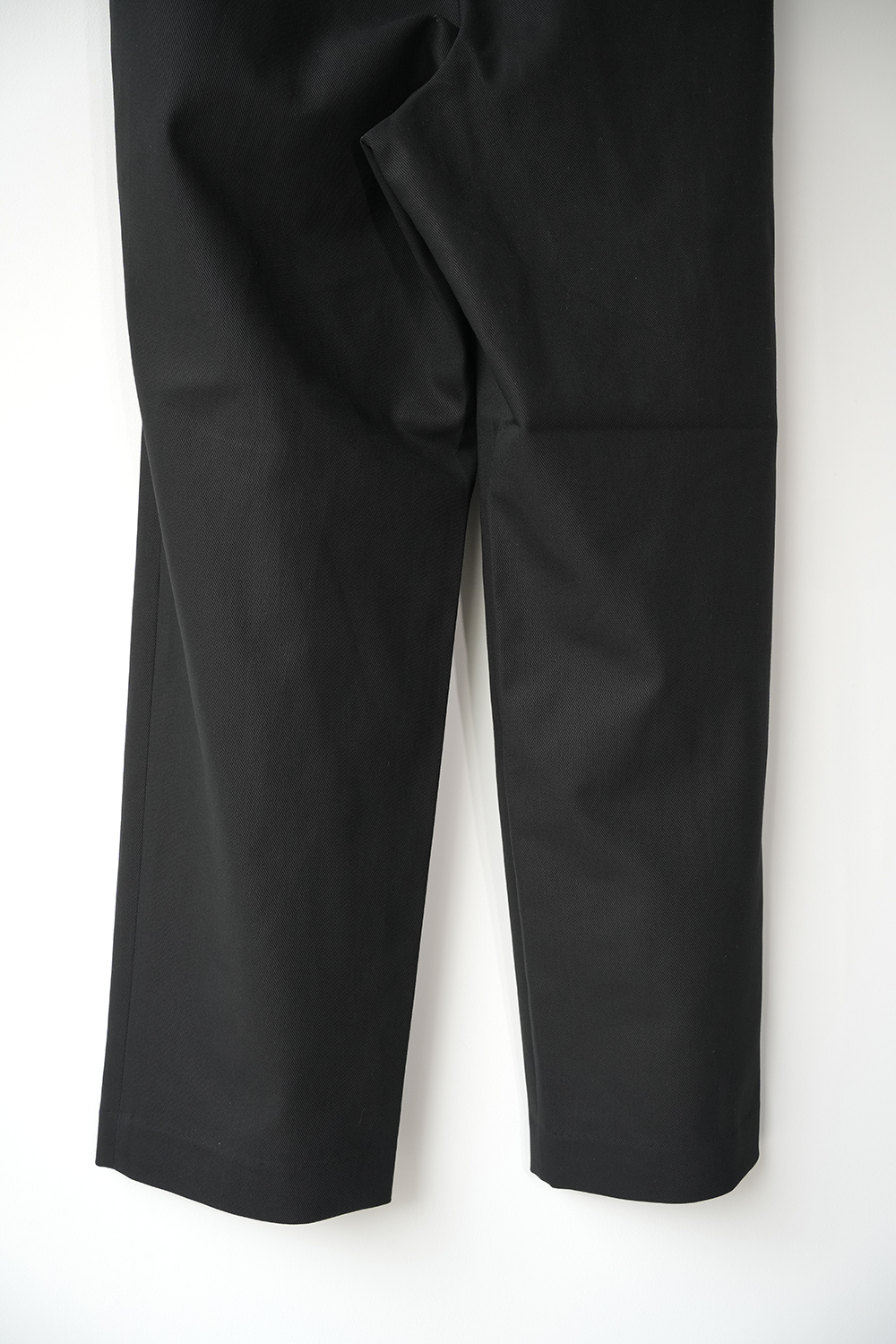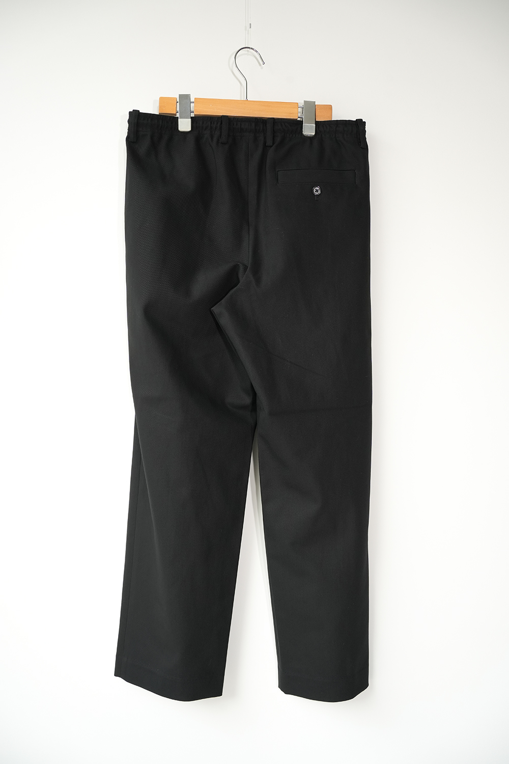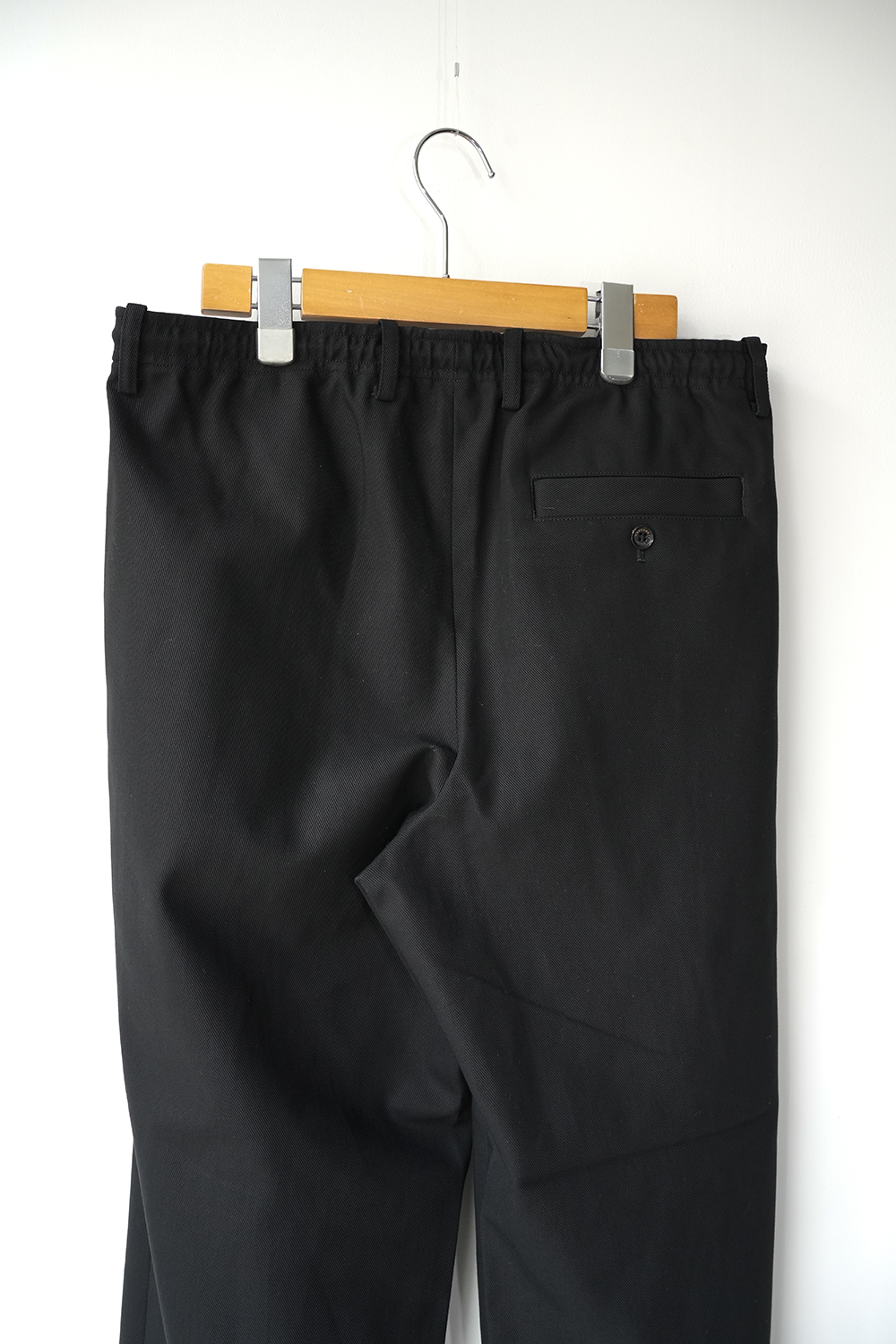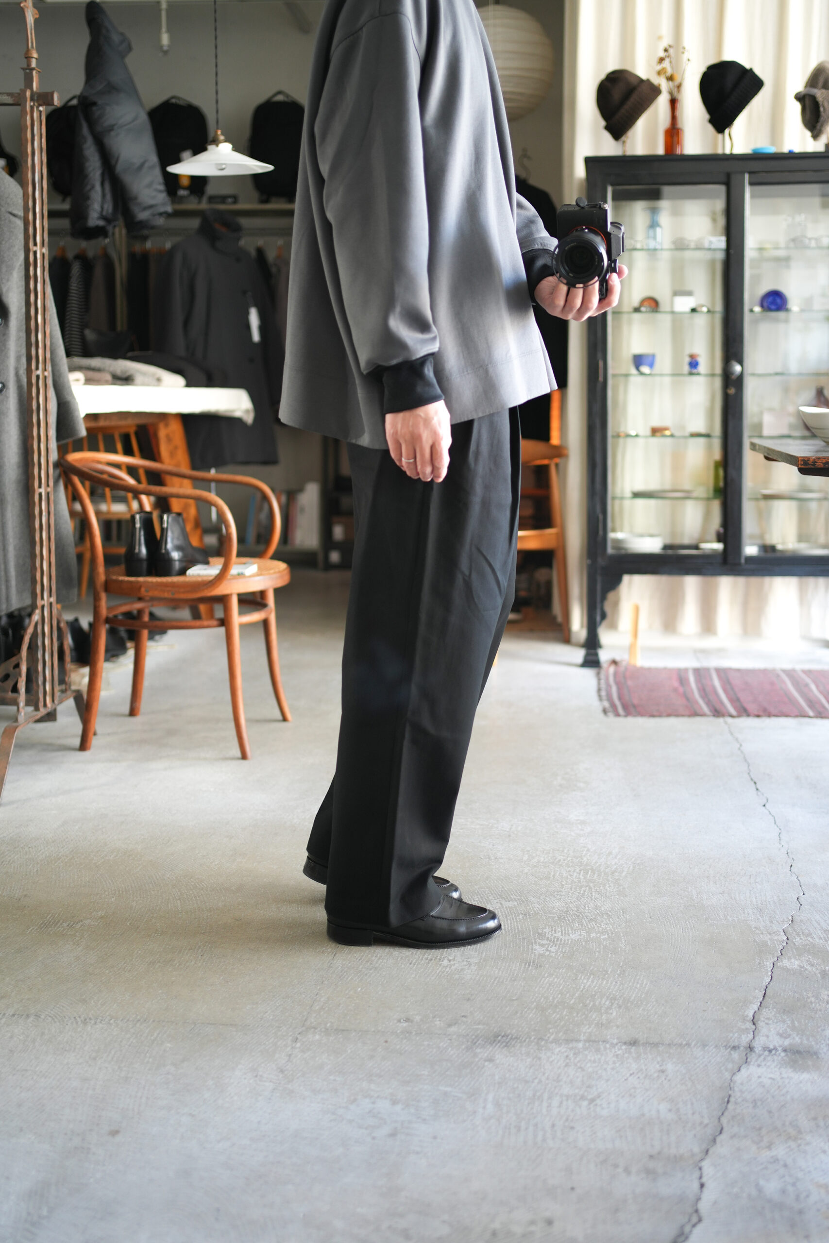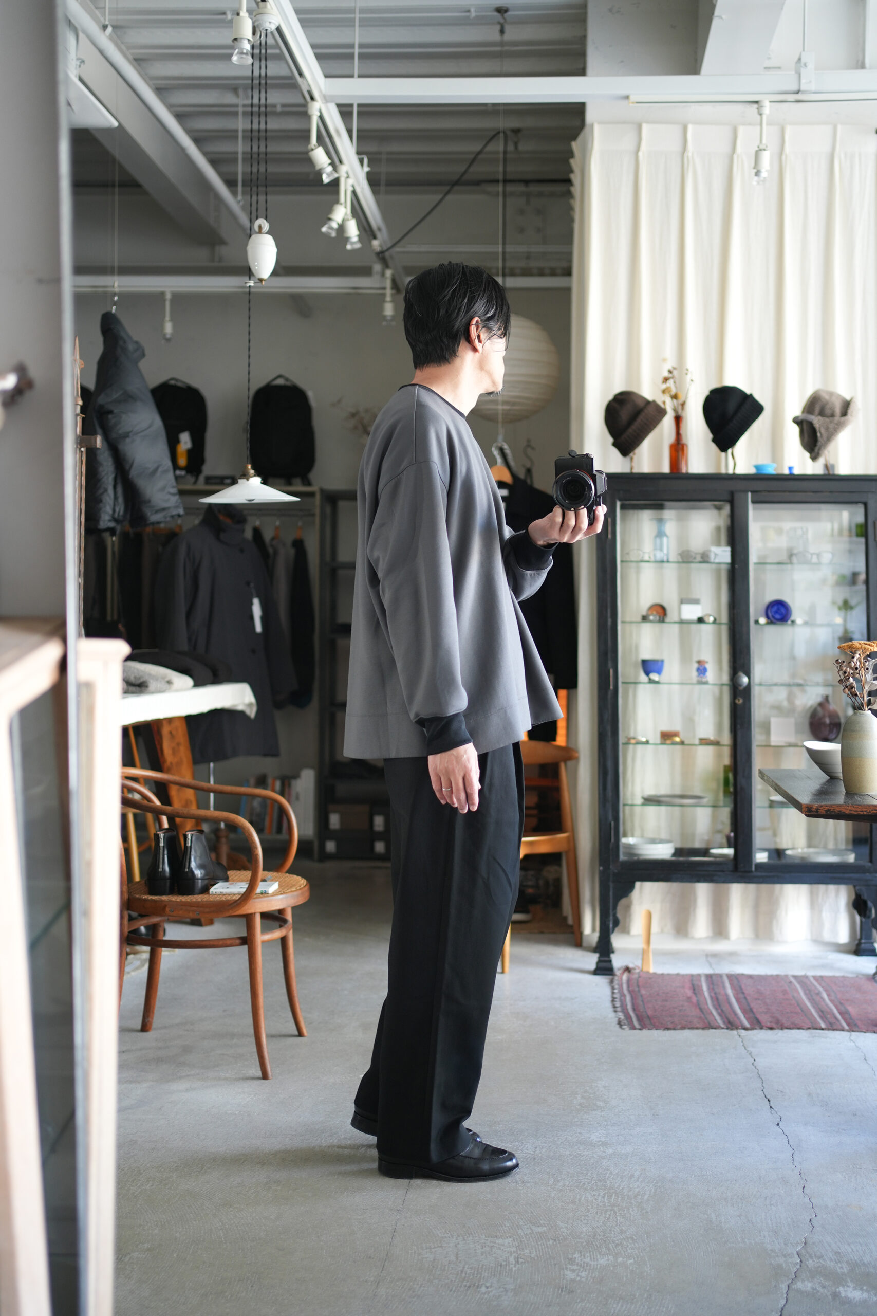ワイドでモダンなシルエットが魅力の「Double Pleated Easy Trousers」。フロントには2本のアウトタックを施し立体的なドレープが生まれます。裾にかけて緩やかにテーパードすることで、ワイドながらも洗練された大人のラインに仕上げました。正面とサイドで異なる印象を与える、視覚的なデザイン性もポイント。裾幅を広めに取ることで、しっかりとしたボリューム感も演出しています。ウエストはドローコード仕様のイージーパンツ型で、リラックスした穿き心地ながら、上品さを損なわない一本です。