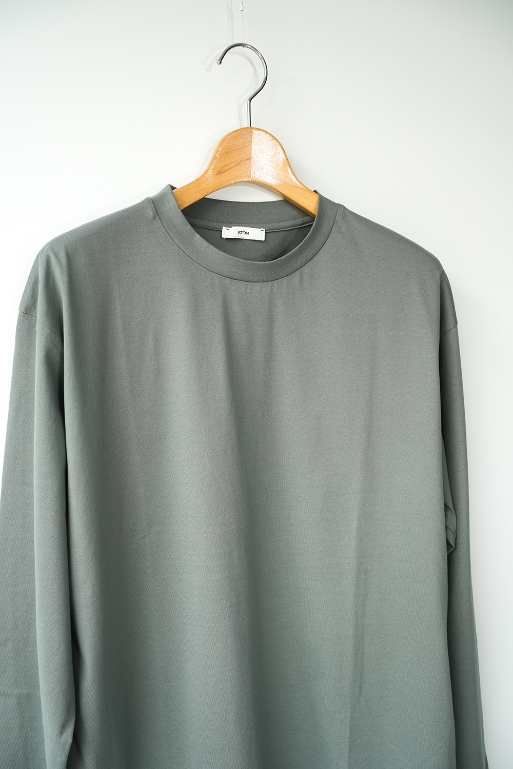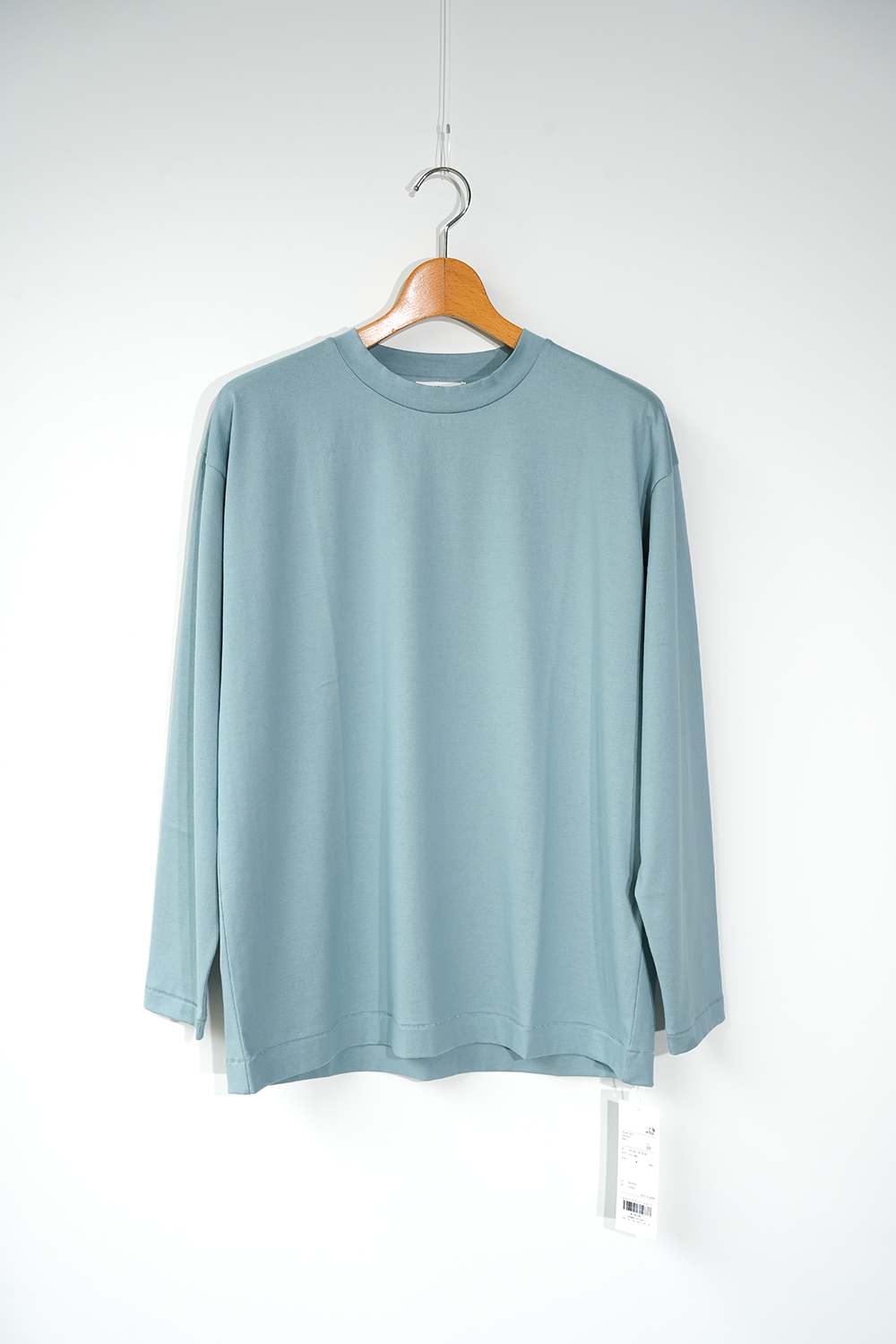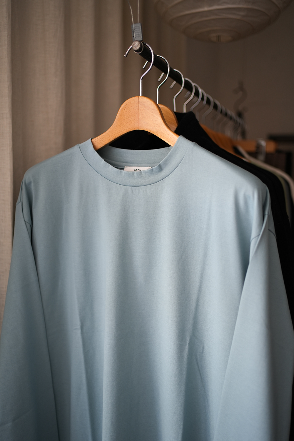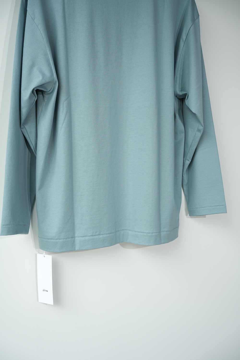 オーバーサイズが特徴のATON定番ロングスリーブTシャツ。ゆとりのあるシルエット、横幅に対し縦の比率が少し長く、モードな印象です。男性向けですが、素材に落ち感があり、女性がオーバーサイズで着用できる1着です。インドで手摘みされたSUVIN COTTONを、和歌山市のニッターの手で編まれており、双糸にすることで、光沢感としなやかさを備えたATONオリジナルのジャージー素材です。SUVIN COTTONは綿花を丁寧に手摘みしている為、油分が失われること無く、繊維に傷が付いていない為、薬剤など化学的な加工を一切せずに美しい光沢があります。