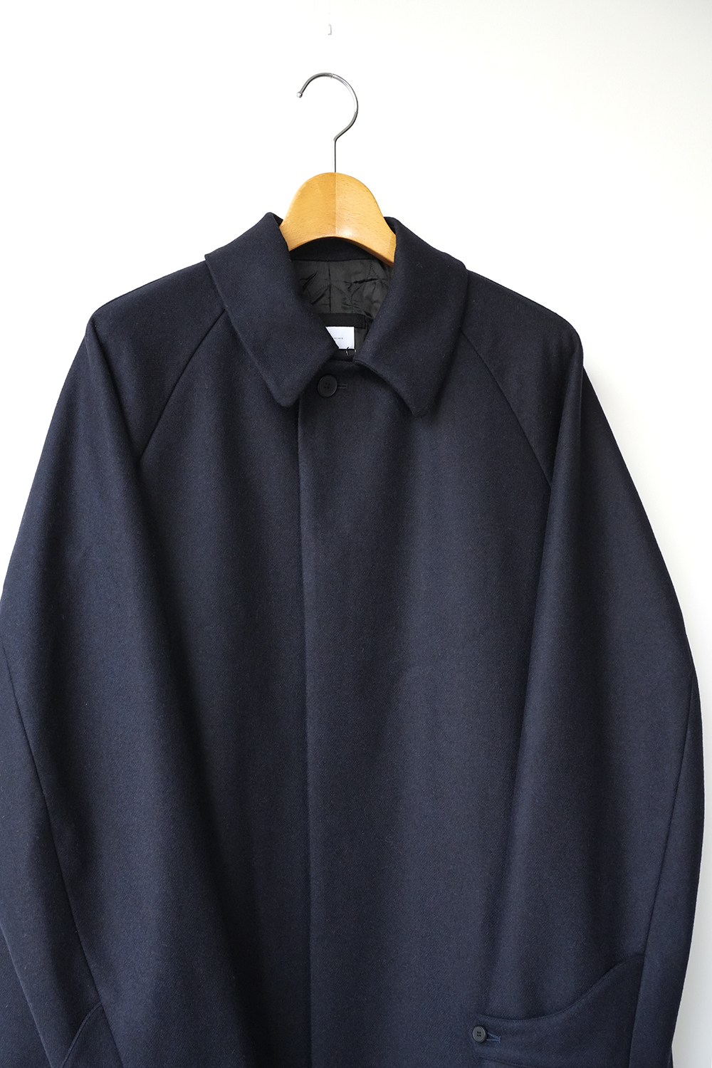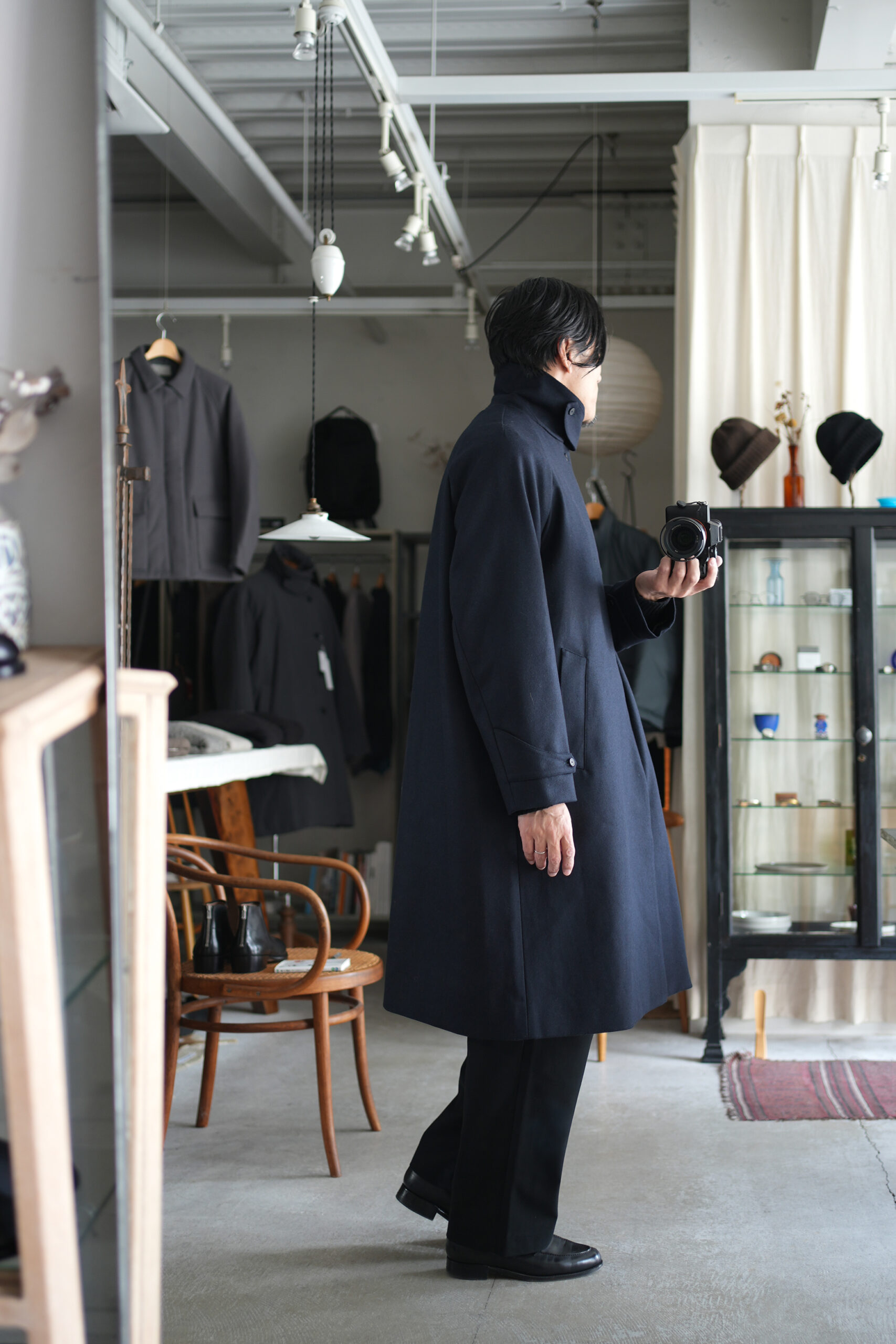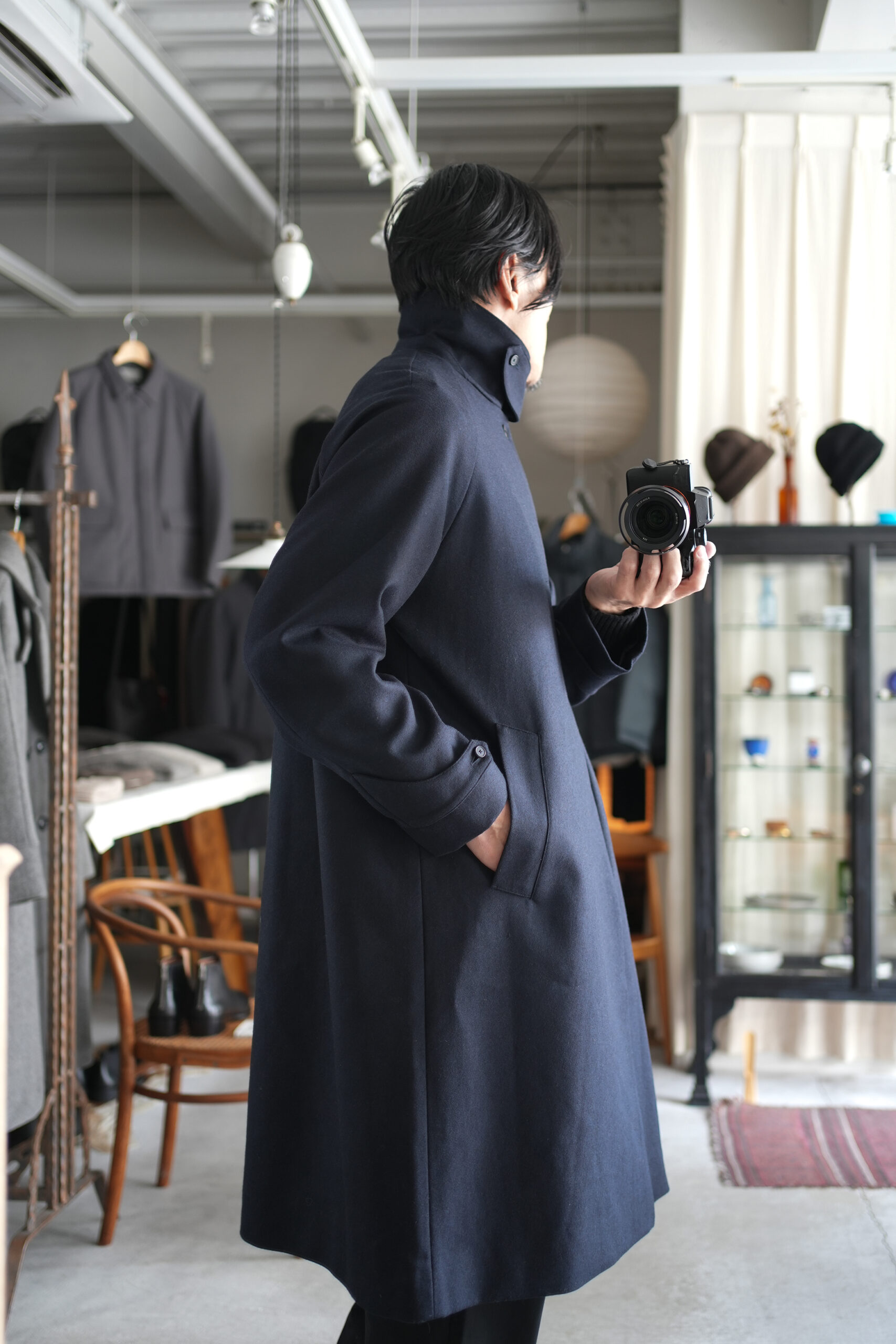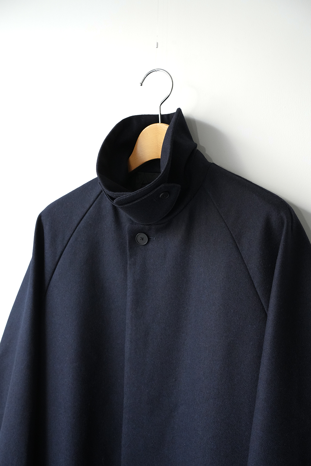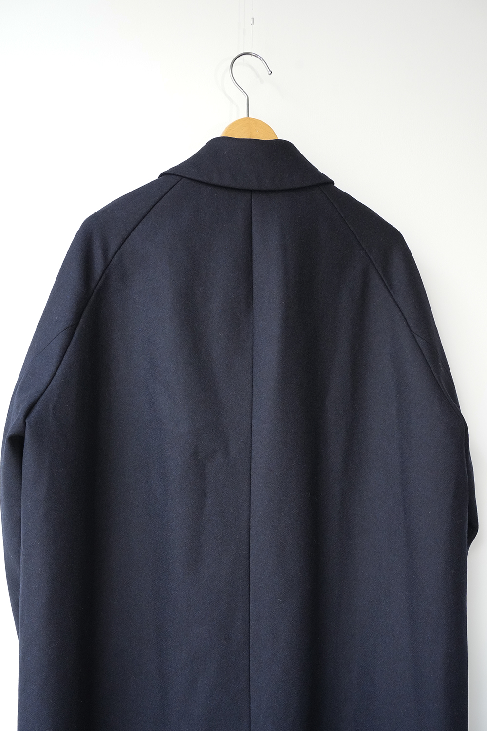 メルトンよりも軽量でアウター類には芯地をボンディングししっかりとしたハリと防風機能を高めた高密フラノ生地で仕立てたステンカラーコート。全面芯ボンディング、総裏仕立て(身頃キルティング裏地)で中綿には高機能生地KOMATHERMO(コマサーモ)を配した軽量で暖かなコートです。