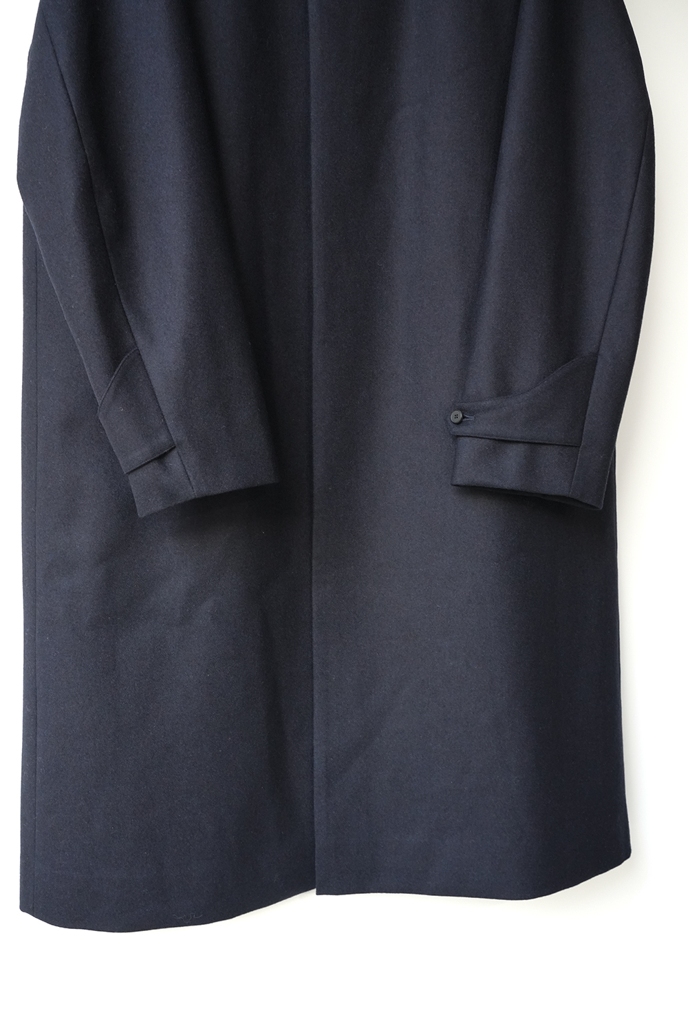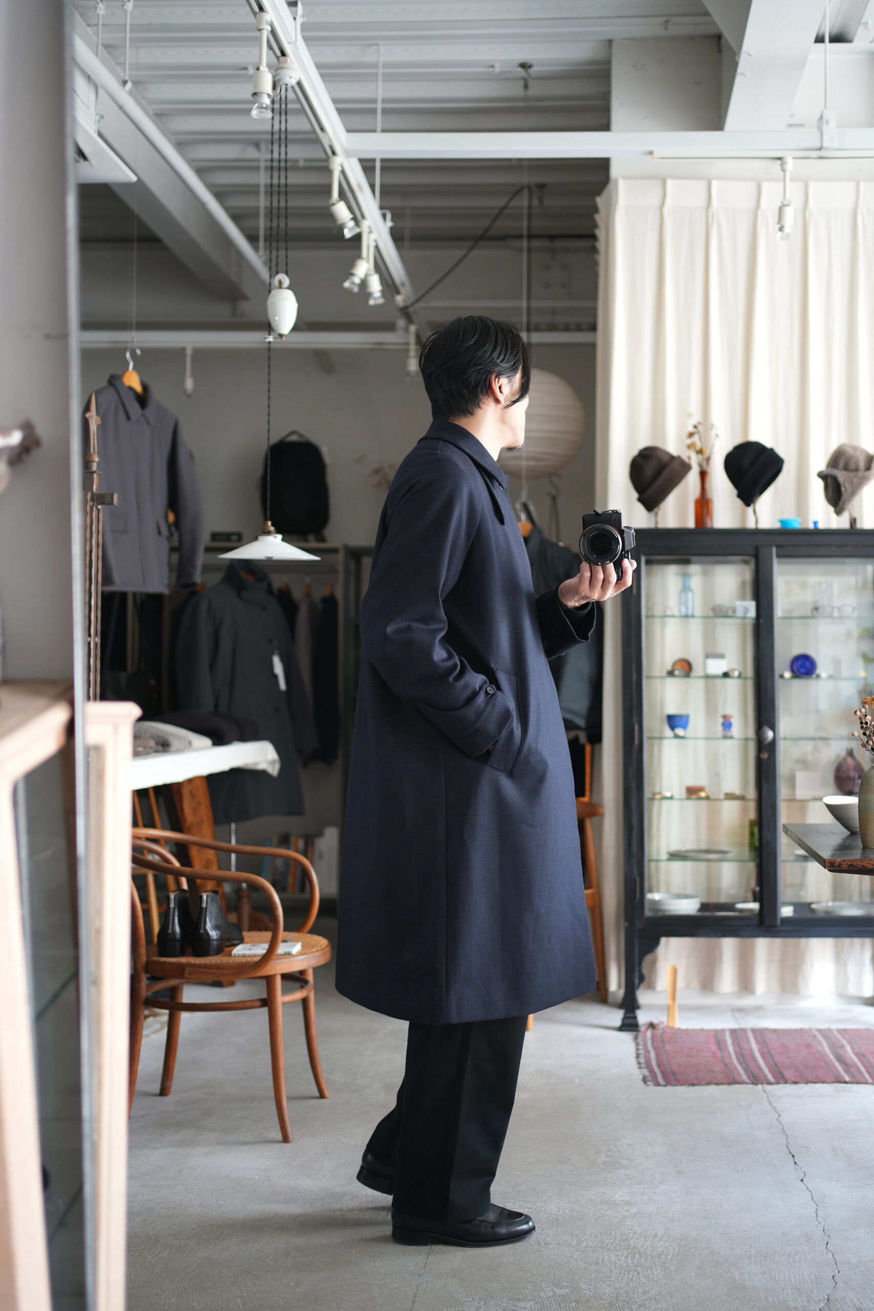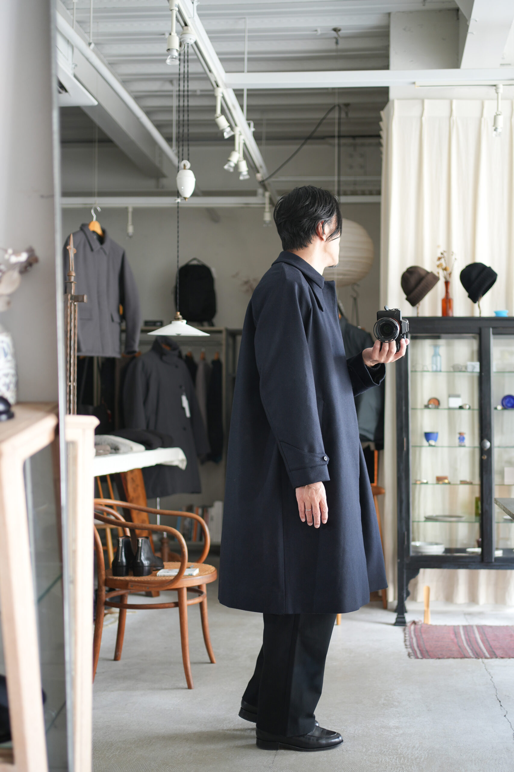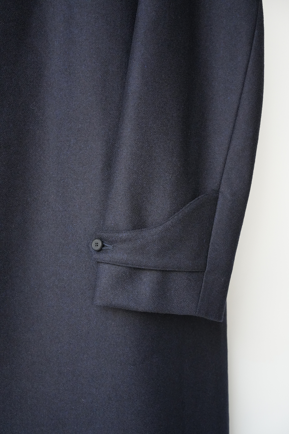 メルトンよりも軽量でアウター類には芯地をボンディングししっかりとしたハリと防風機能を高めた高密フラノ生地で仕立てたステンカラーコート。全面芯ボンディング、総裏仕立て(身頃キルティング裏地)で中綿には高機能生地KOMATHERMO(コマサーモ)を配した軽量で暖かなコートです。